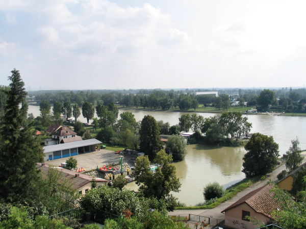 Blick vom Hotel auf den Rheinhafen vom Breisach. Hier bildet der Rhein die Grenze zum Elsass und dem Städtchen Neuf-Brisach. |