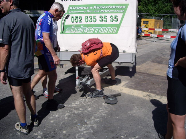 In der engen Weihergasse, wo die Jugendherberge liegt, konnte der Anhänger nur von Hand umgedreht werden, was, wie man sieht prompt zu einer technischen Panne führte. Aber für unseren "Äschineur Stefan" war das nur ein kleines Problem. |