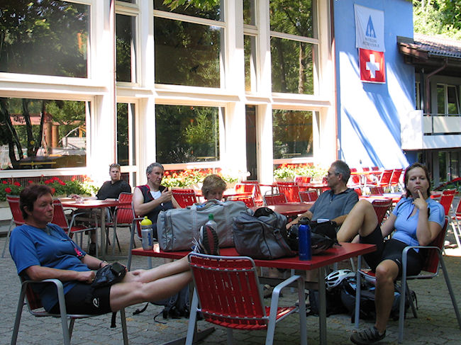 Während sich unser Reiseleiter Peter um die Anmeldung kümmerte, wartete der Rest der Gruppe im Schatten der grossen Ahornbäume. |