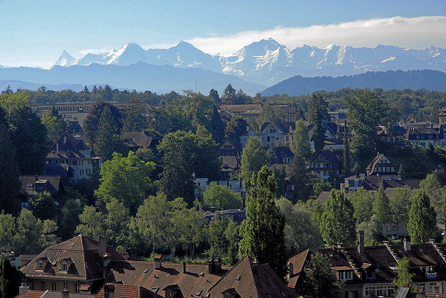 Blick von der Terasse des Bundeshauses auf die Berner Alpen. |