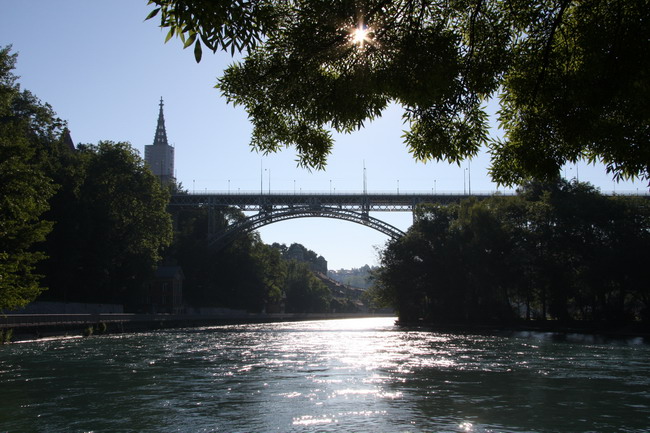 Schon stand die Sonne über der Kirchenfeldbrücke und selbst durch das dichte Laub spürte man, dass es wieder einen warmen Tag geben wird. |