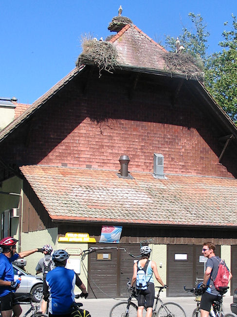 Der Veloweg führt direkt in der Storchen-Station Altreu vorbei, wo uns einige Störche bestaunen. Oder war's umgekehrt ? |