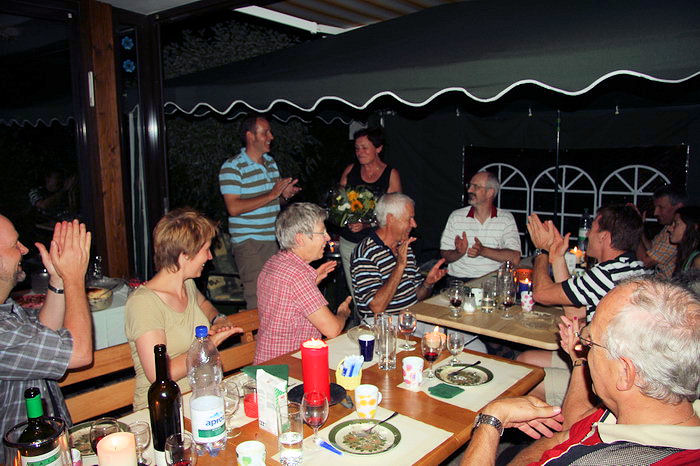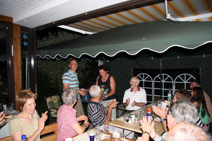 Zu fortgeschrittener Stunde dankte unser Präsi Peter der Gastgeberin mit einem schönen Blumenstrauss und feinem Gebäck |