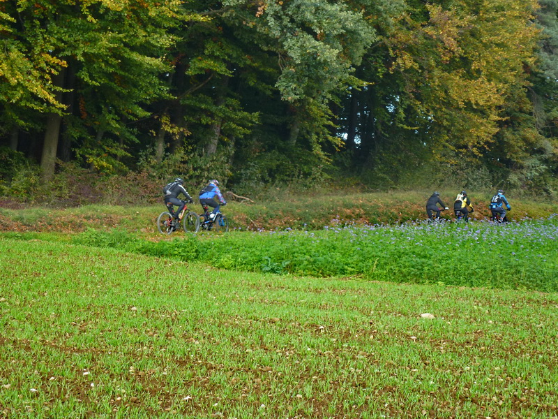 Bei Sonnenschein dem herbstlich gefärbten Waldrand entlang |