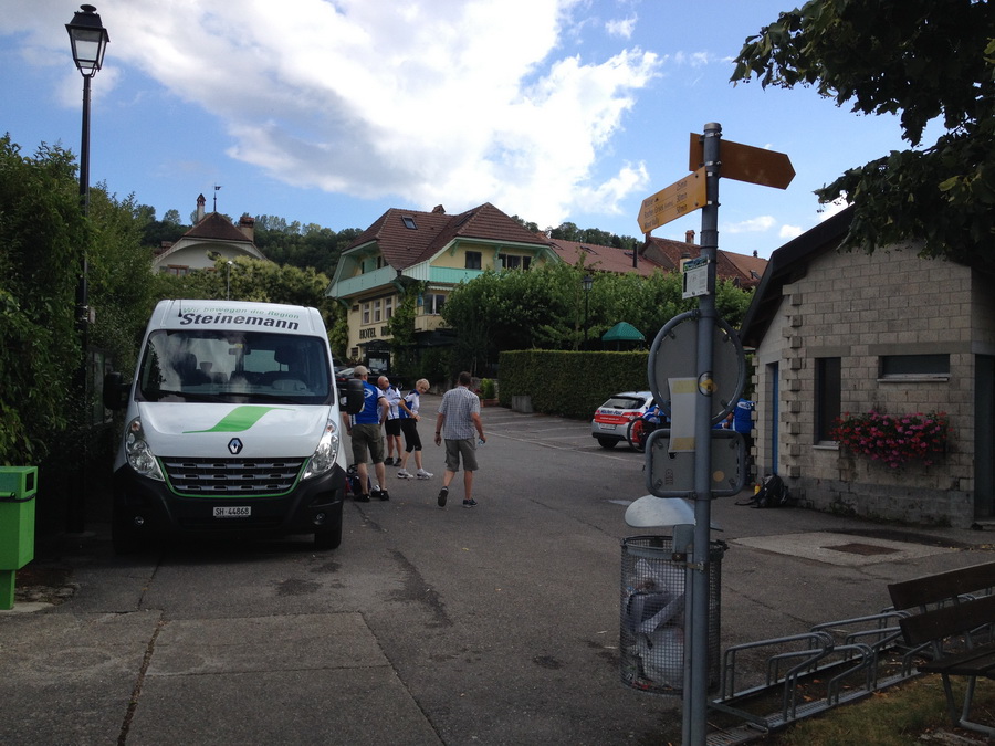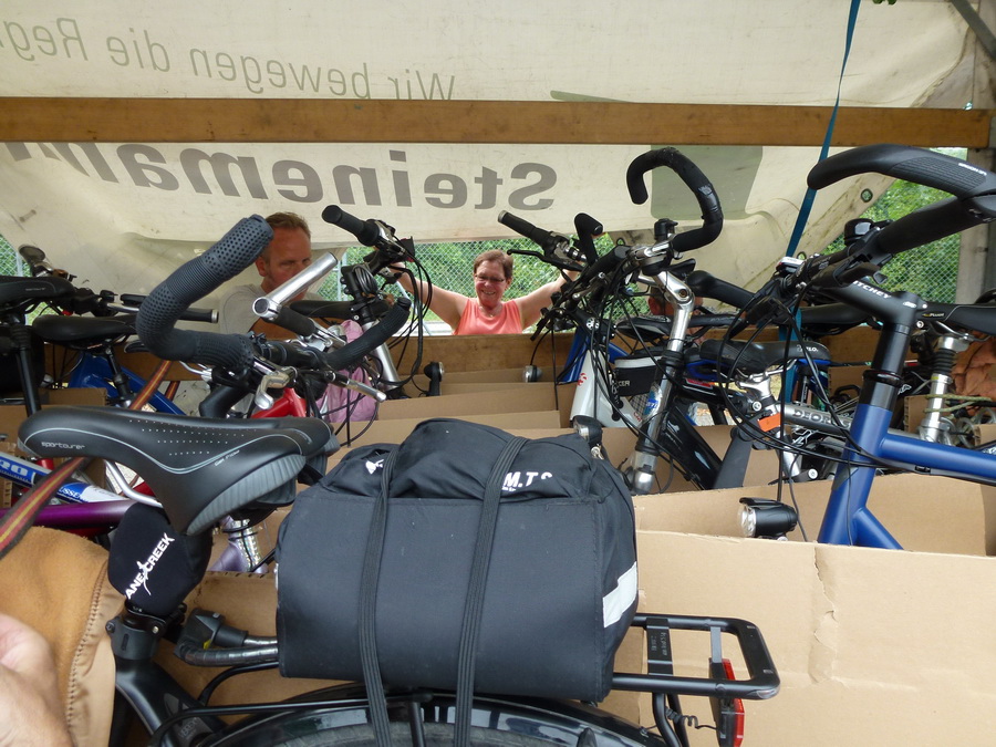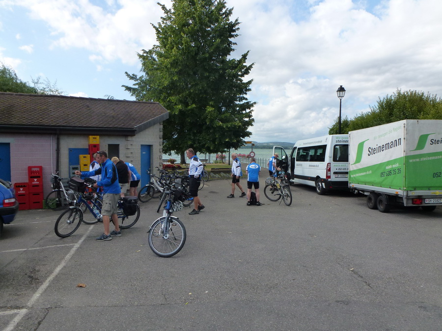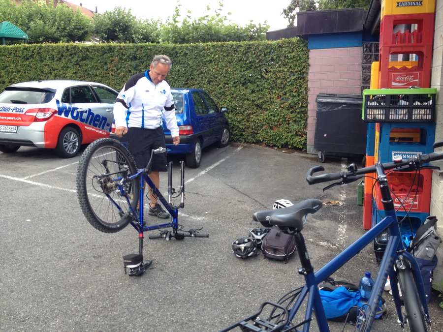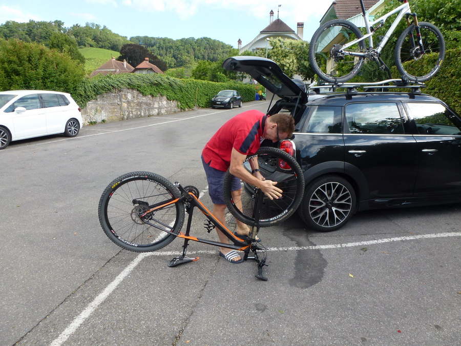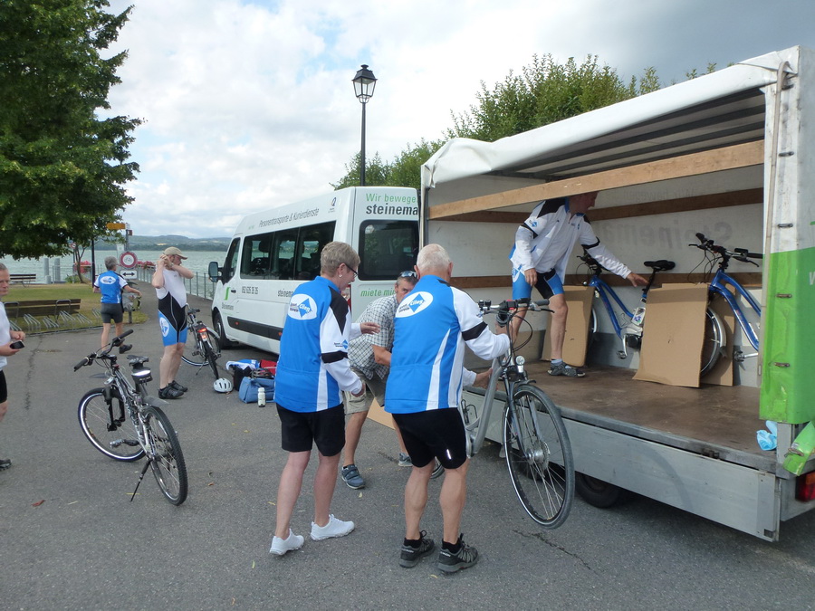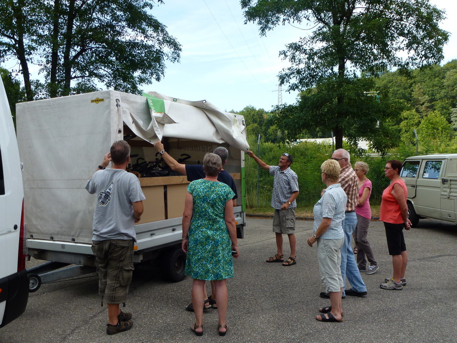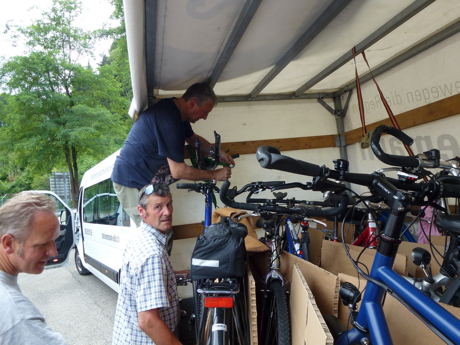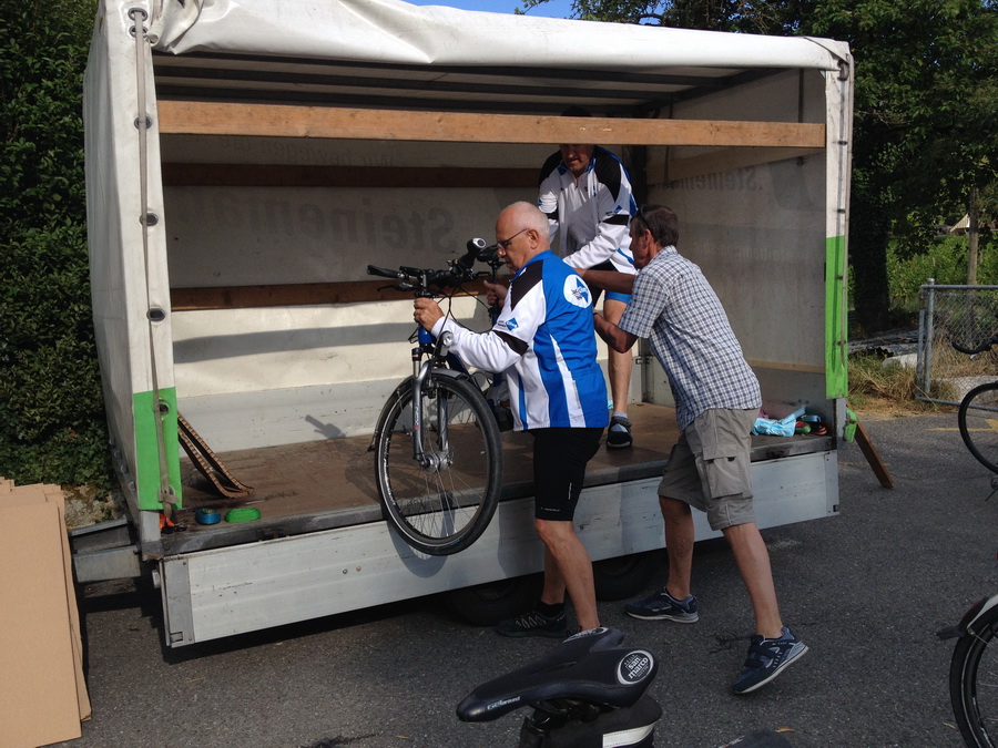 Freitagabend 18:00 Uhr die Velos werden verladen Überraschung ! Der Anhänger ist zu schmal. Das Verladeteam war gefordert, eine neue Anordnung musste ausprobiert werden und es hat geklappt. |