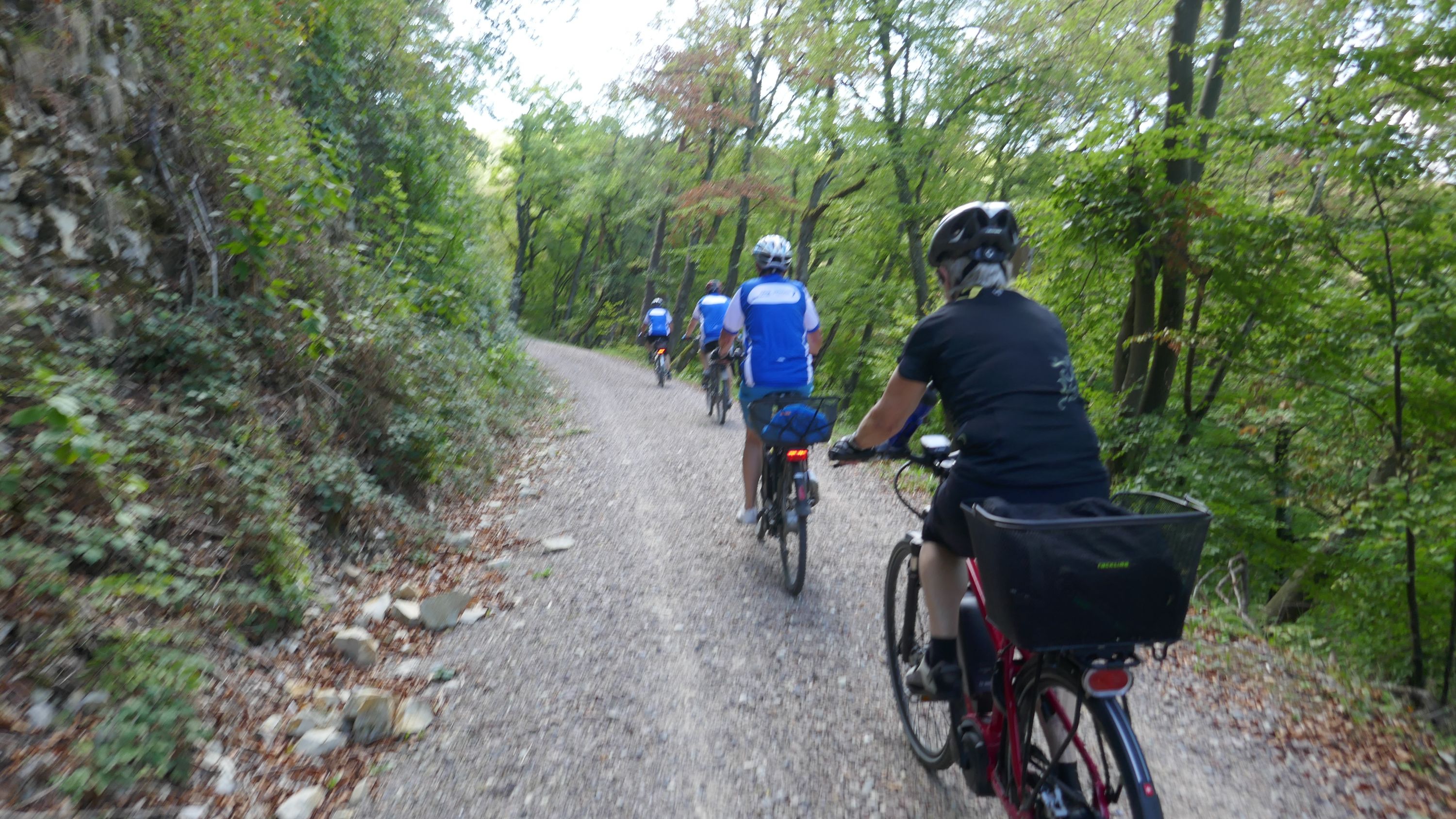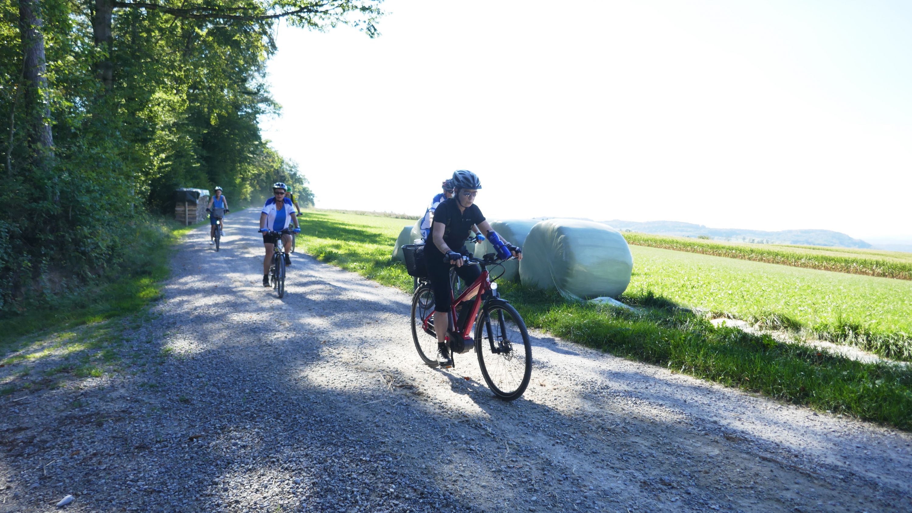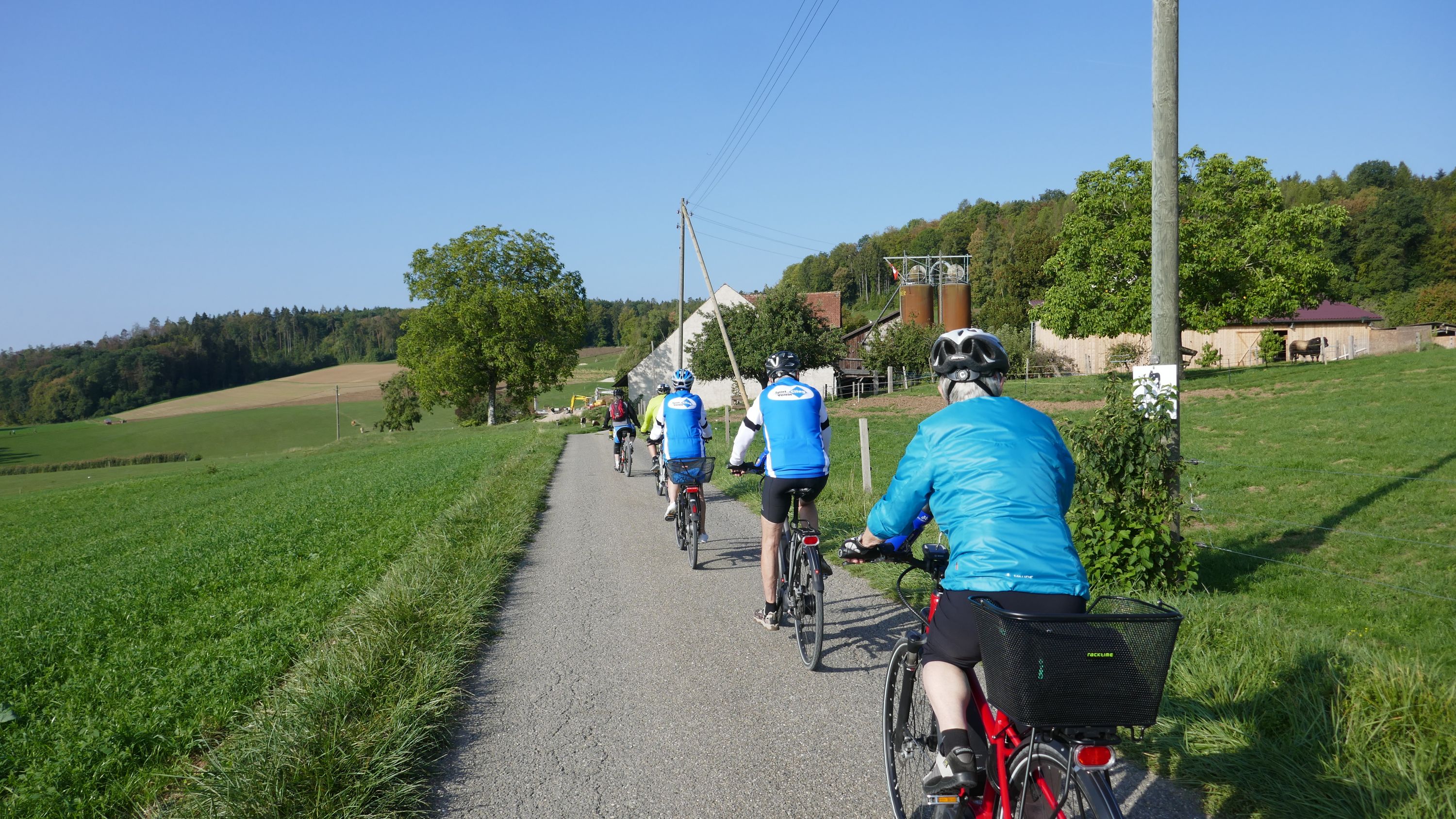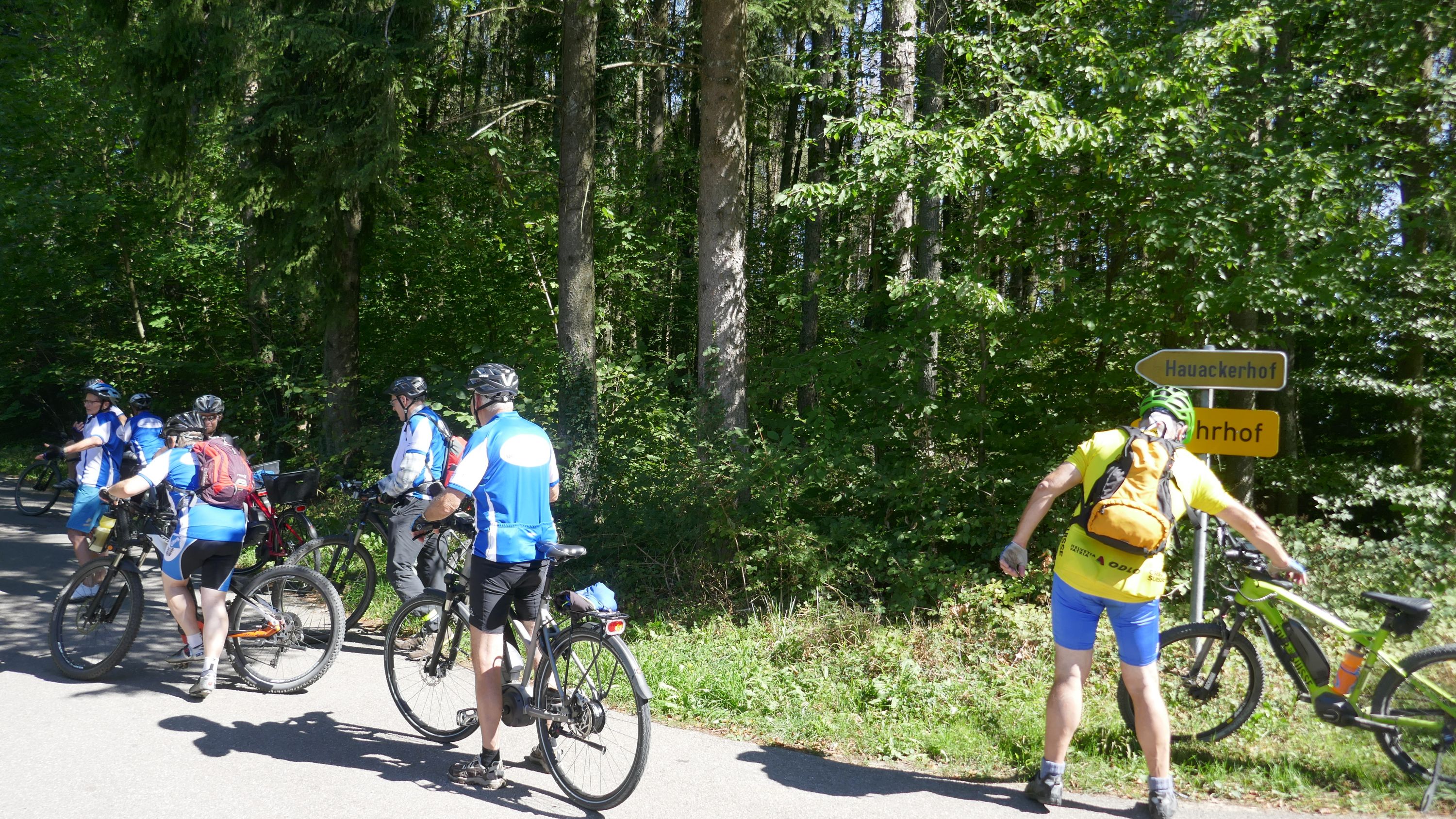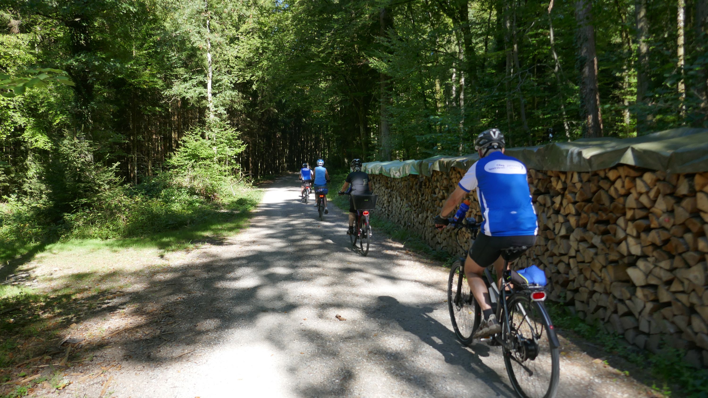 Nach Guntmadingen wechselten wir auf den Klettgauer Veloweg, welcher über Neunkirch nach Trasadingen führt, wo wir nach der Grenze Erzingen erreichten. Von hier führte die Route nach Geisslingen, dort verliessen wir die Hauptstrasse und bogen in einen Waldweg ein. Auf diesem 5 km langen, steil ansteigenden Forstweg (Eckweg) waren alle gefordert, doch die E-Biker einiges weniger.