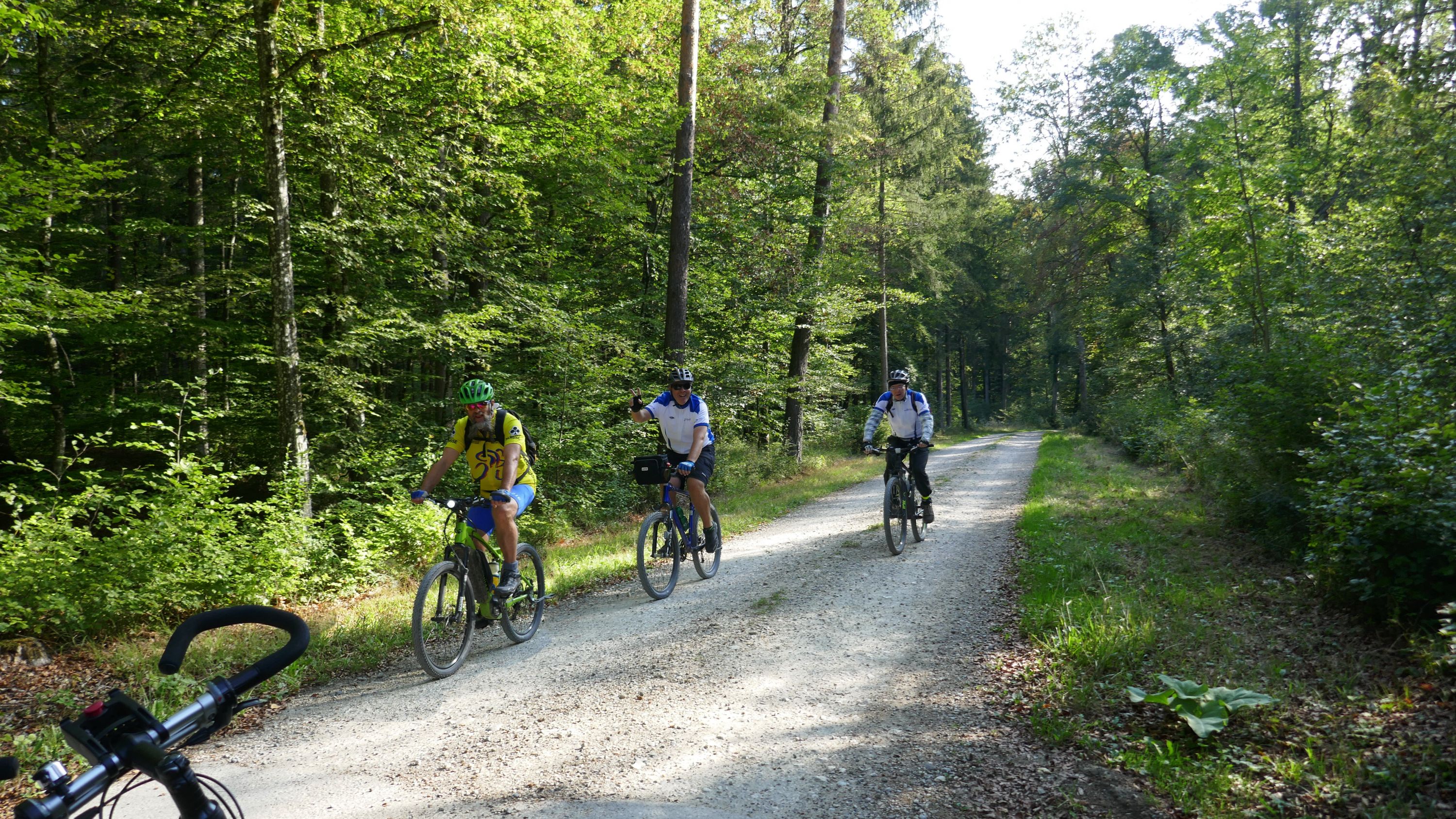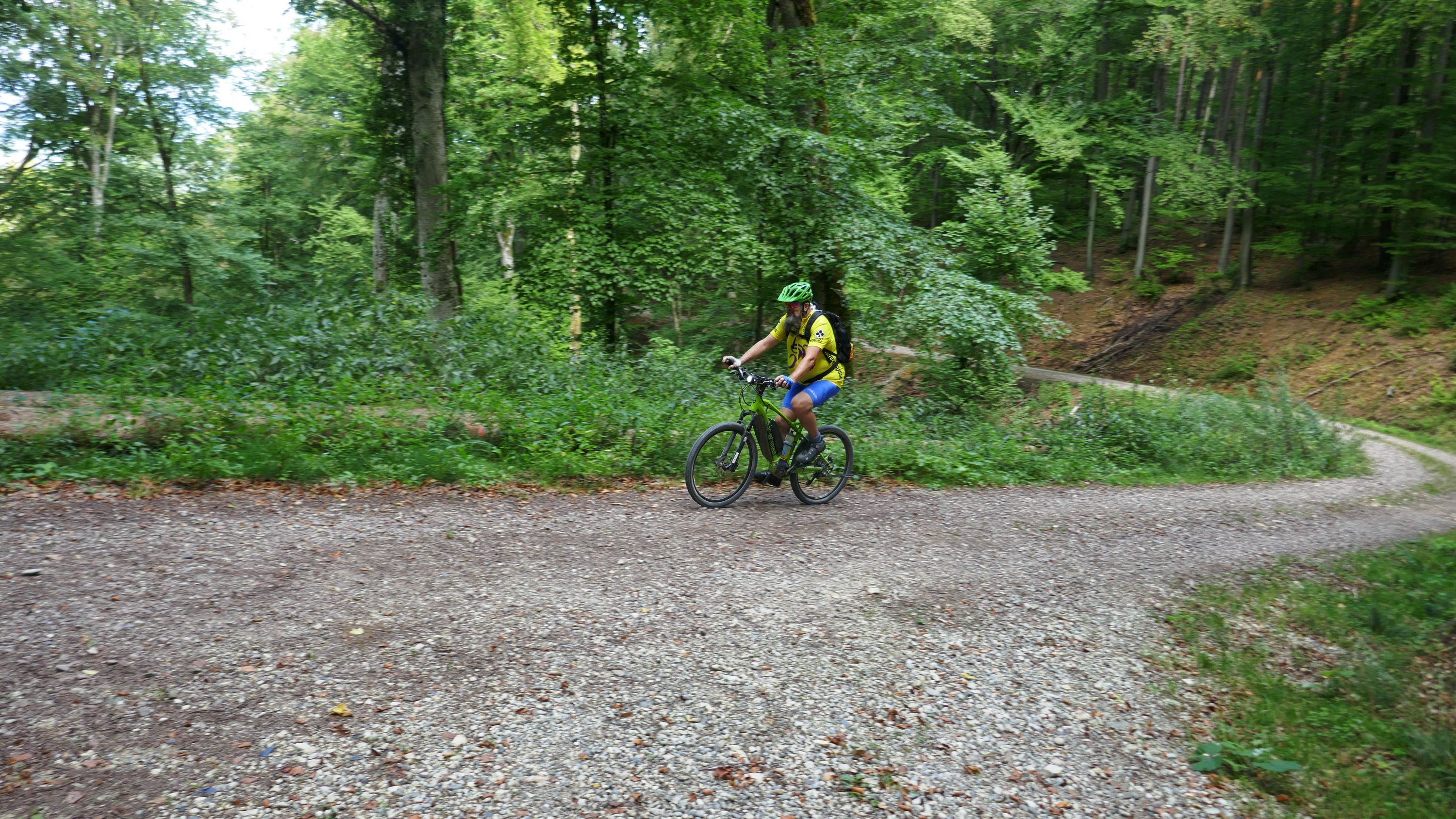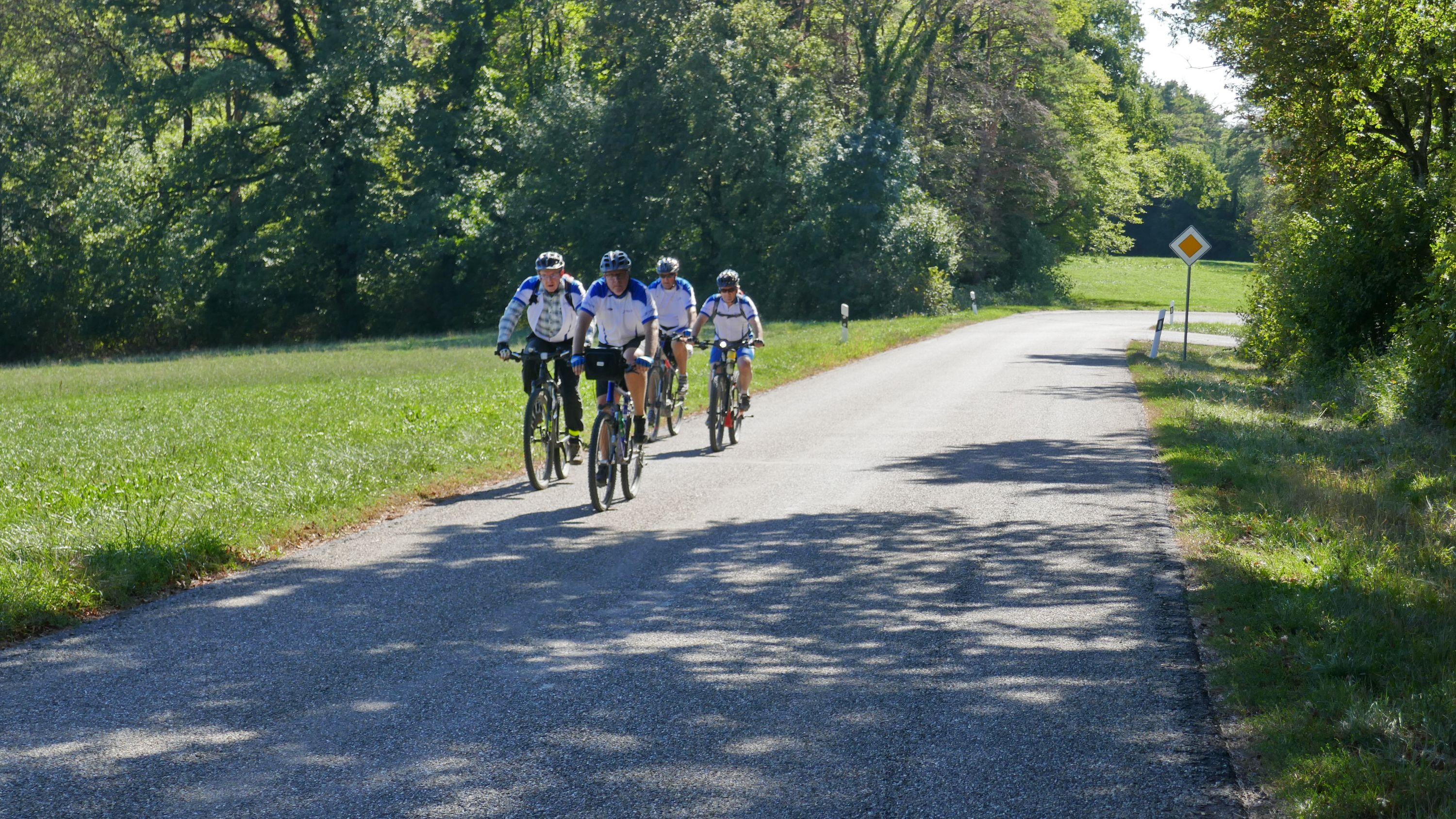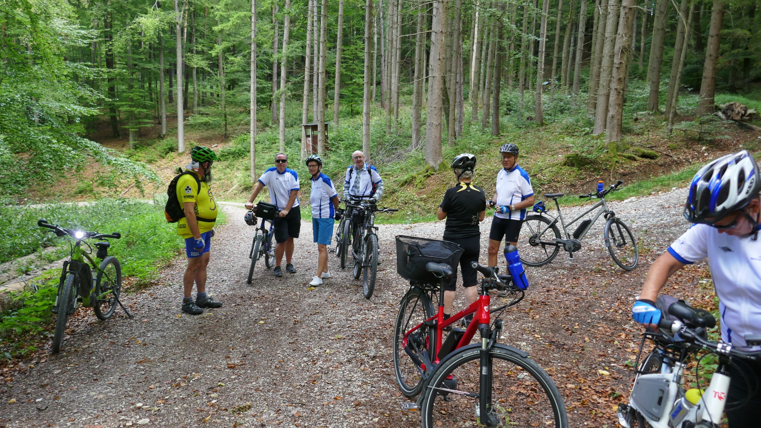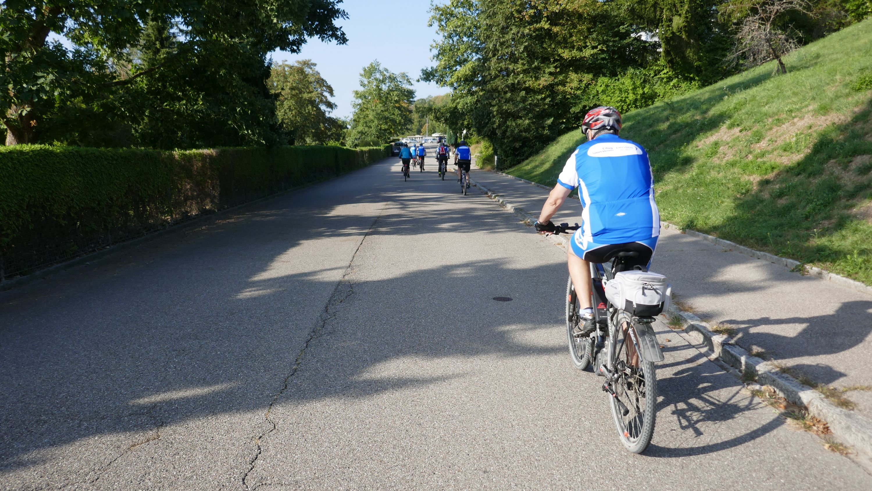 Nach Guntmadingen wechselten wir auf den Klettgauer Veloweg, welcher über Neunkirch nach Trasadingen führt, wo wir nach der Grenze Erzingen erreichten. Von hier führte die Route nach Geisslingen, dort verliessen wir die Hauptstrasse und bogen in einen Waldweg ein. Auf diesem 5 km langen, steil ansteigenden Forstweg (Eckweg) waren alle gefordert, doch die E-Biker einiges weniger.