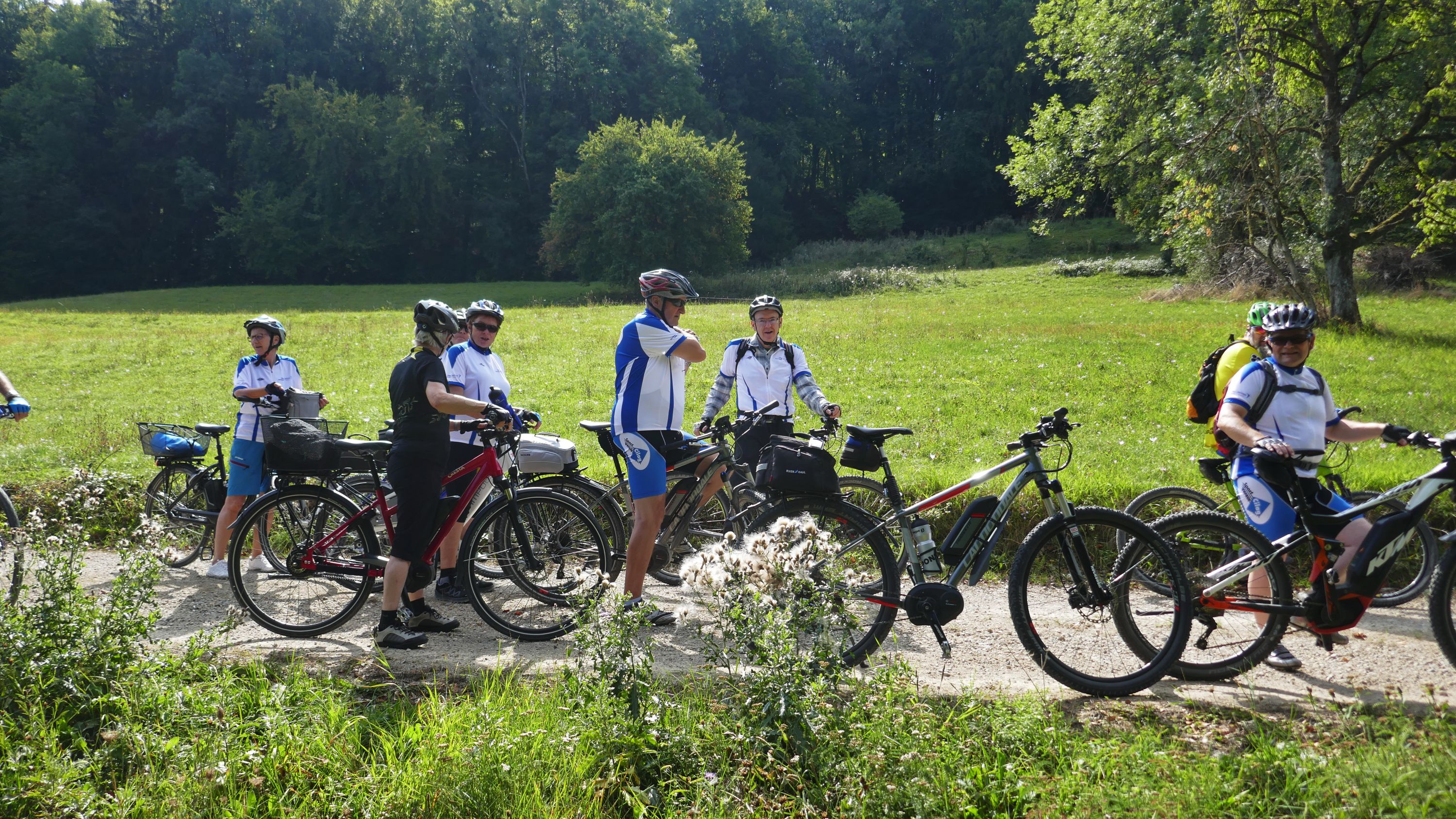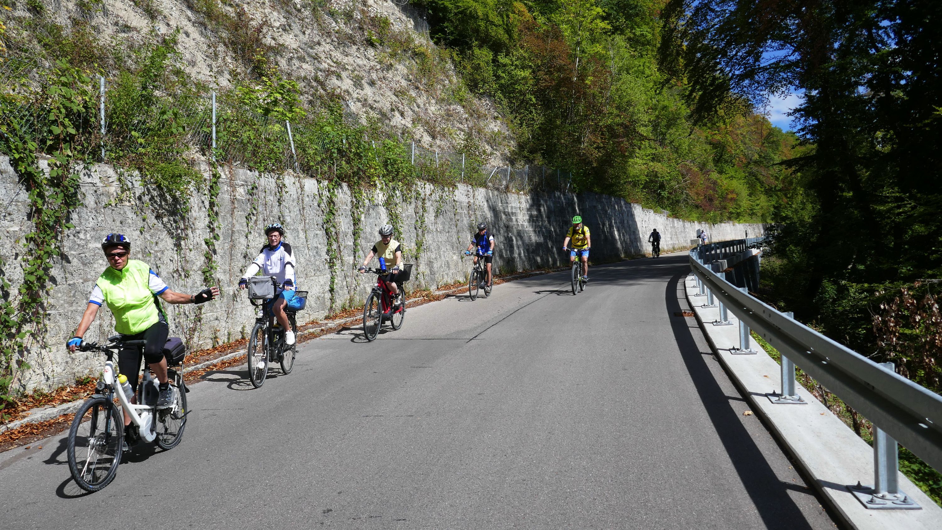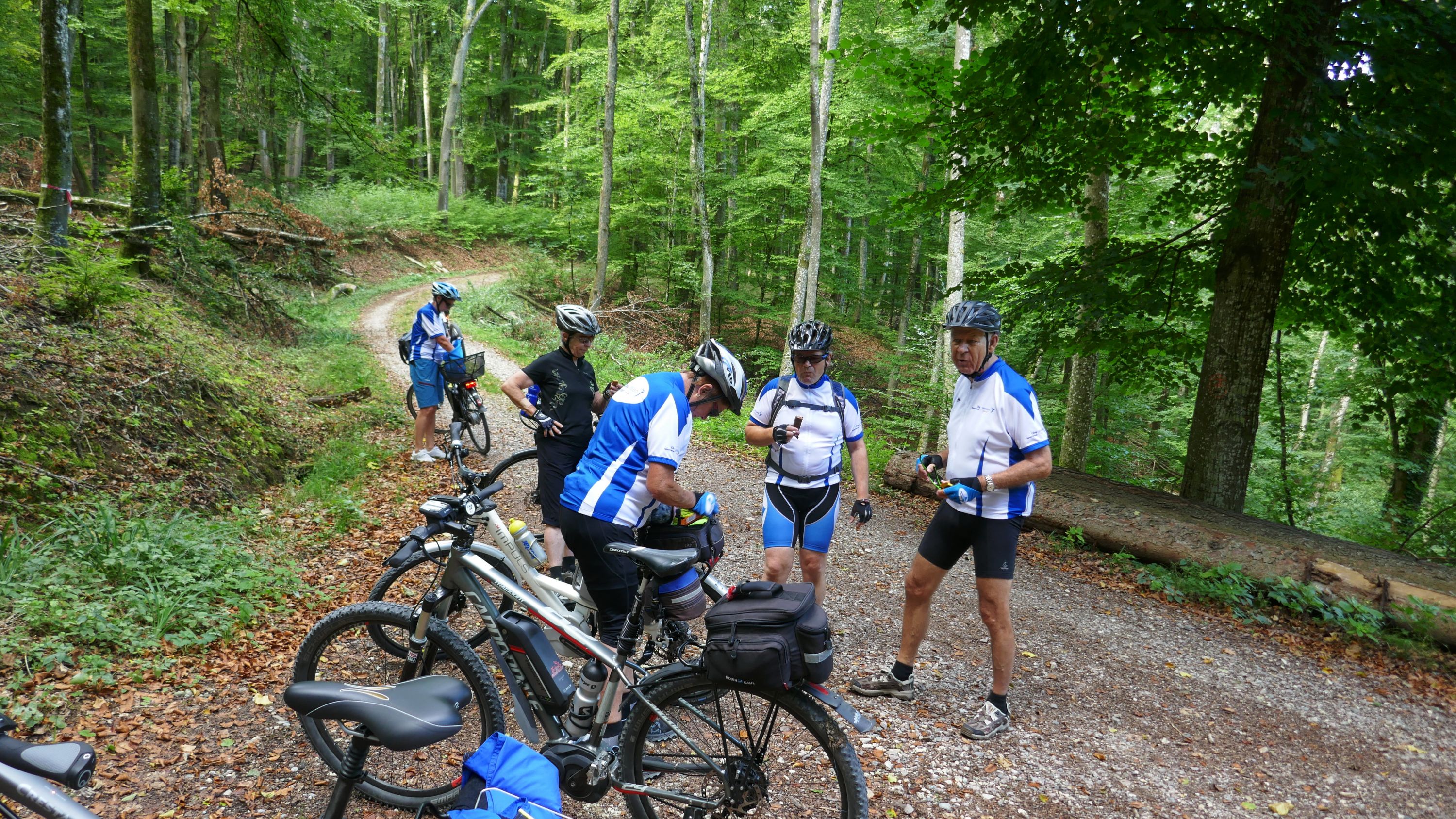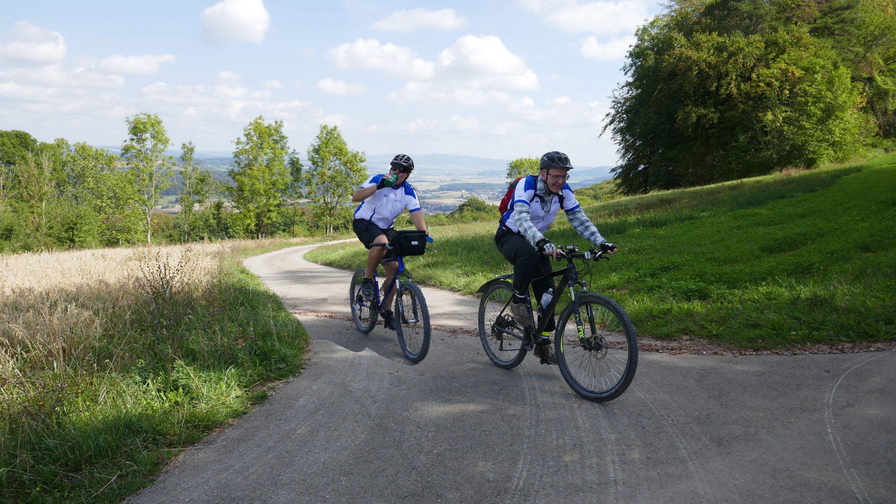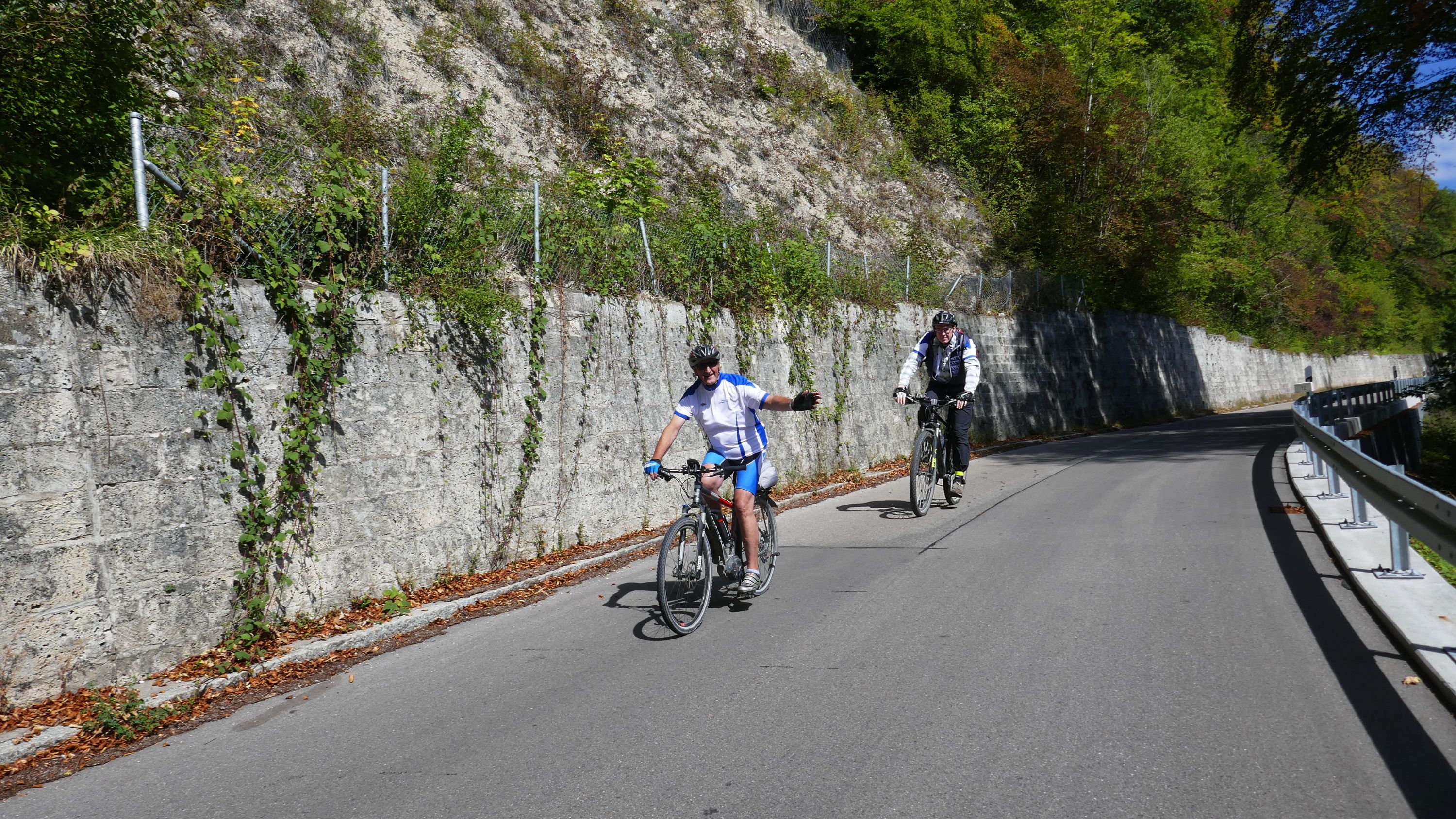 Nach Guntmadingen wechselten wir auf den Klettgauer Veloweg, welcher über Neunkirch nach Trasadingen führt, wo wir nach der Grenze Erzingen erreichten. Von hier führte die Route nach Geisslingen, dort verliessen wir die Hauptstrasse und bogen in einen Waldweg ein. Auf diesem 5 km langen, steil ansteigenden Forstweg (Eckweg) waren alle gefordert, doch die E-Biker einiges weniger.