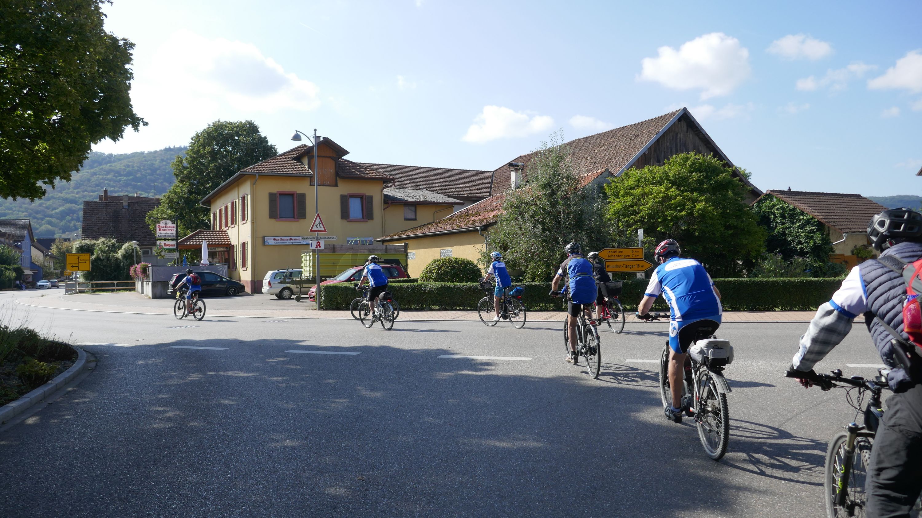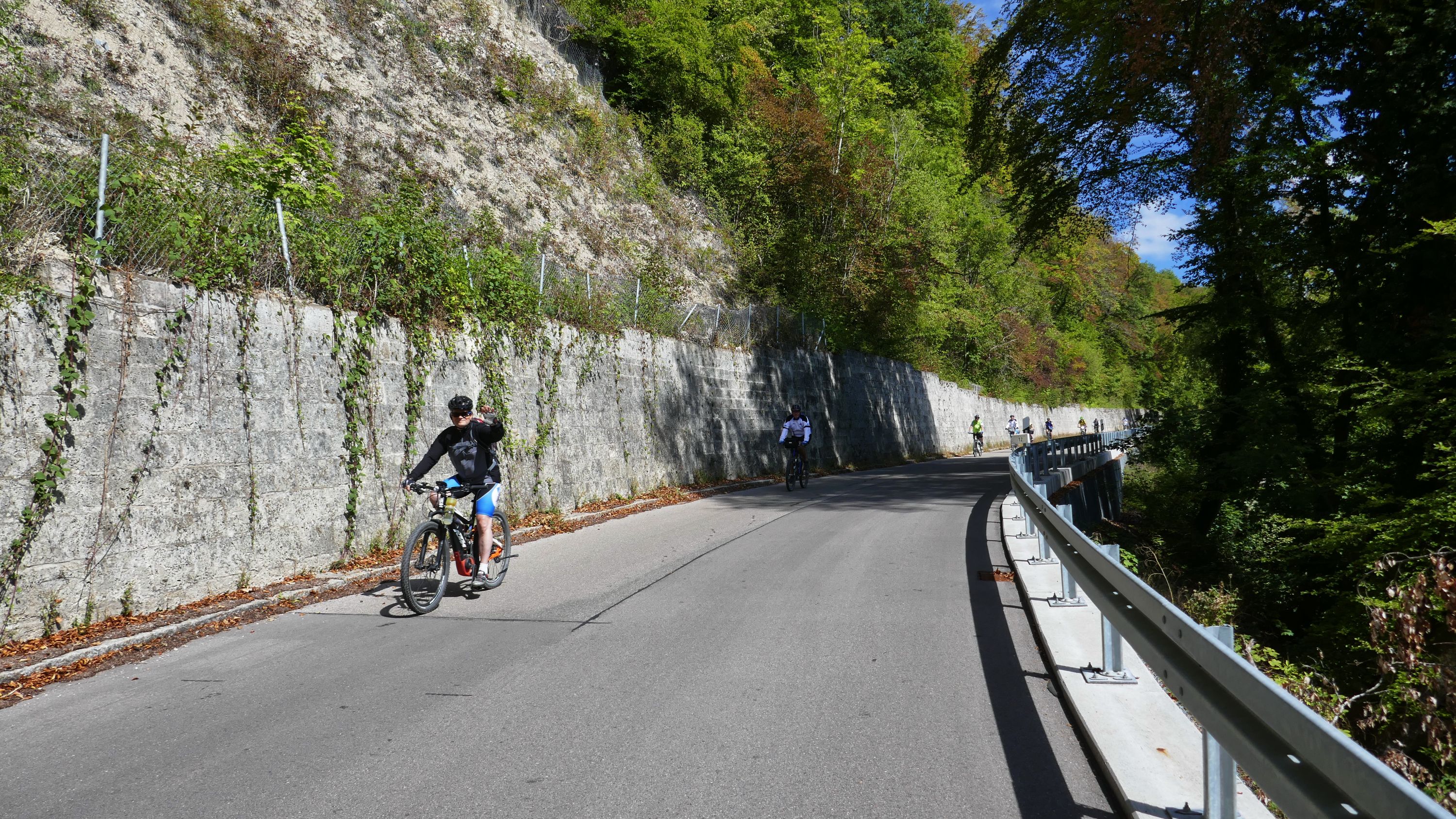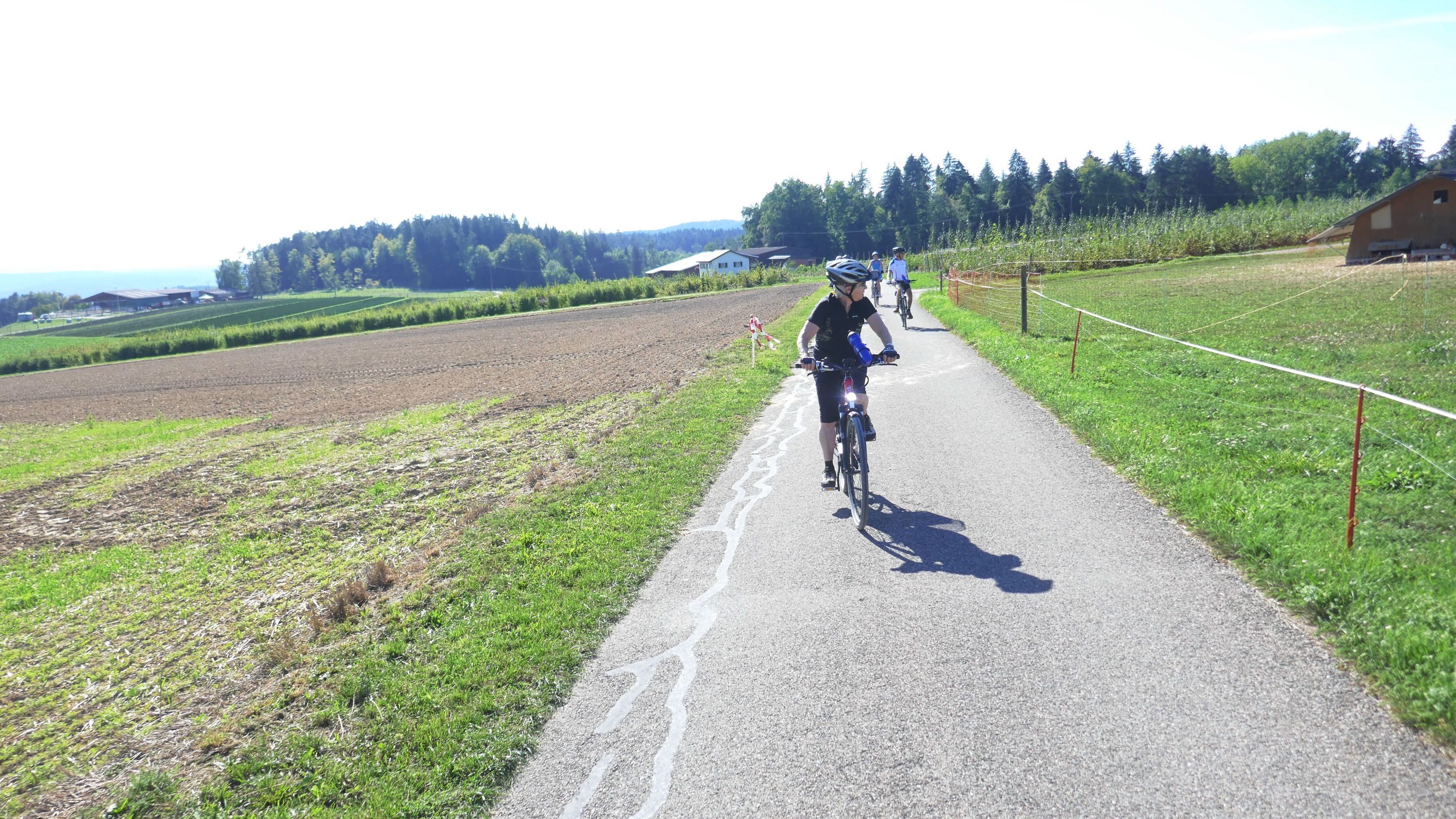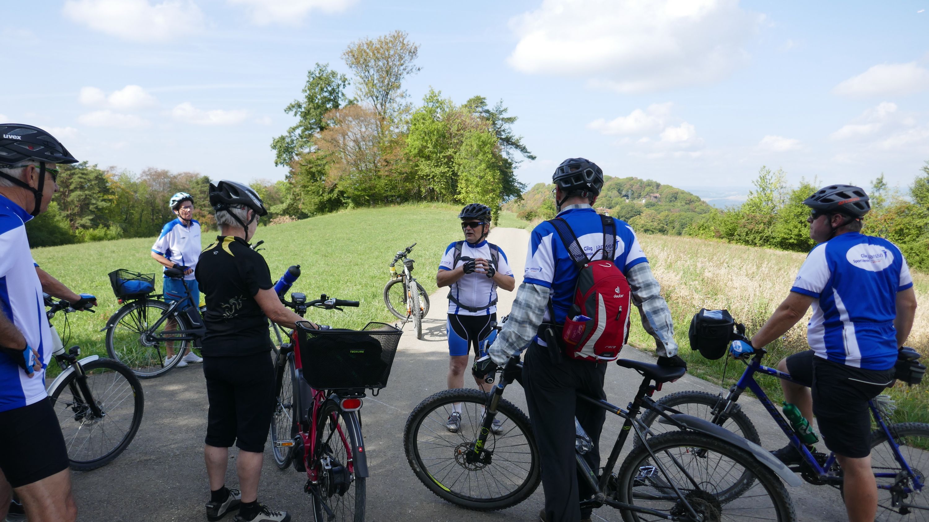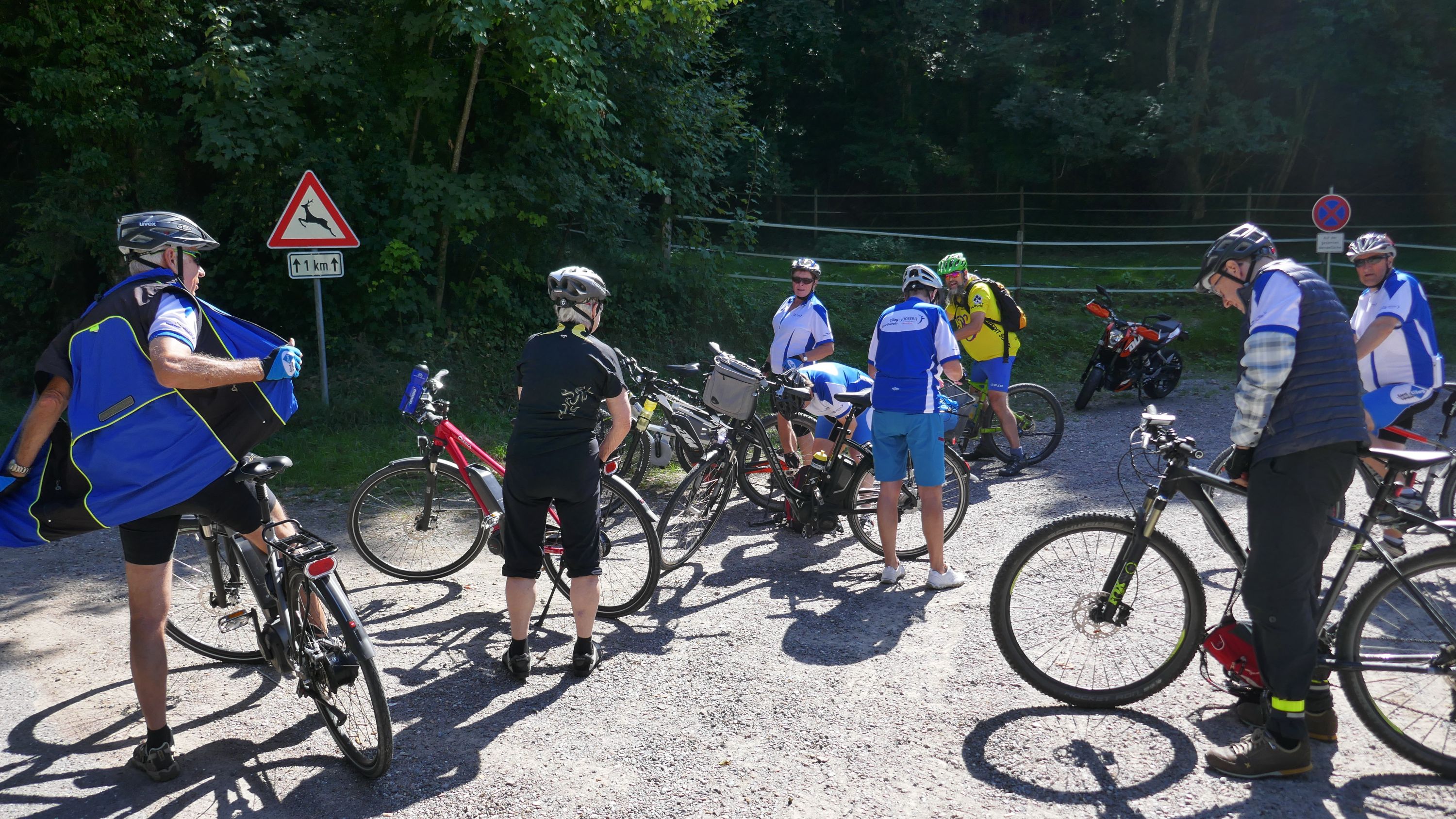 Nach Guntmadingen wechselten wir auf den Klettgauer Veloweg, welcher über Neunkirch nach Trasadingen führt, wo wir nach der Grenze Erzingen erreichten. Von hier führte die Route nach Geisslingen, dort verliessen wir die Hauptstrasse und bogen in einen Waldweg ein. Auf diesem 5 km langen, steil ansteigenden Forstweg (Eckweg) waren alle gefordert, doch die E-Biker einiges weniger.