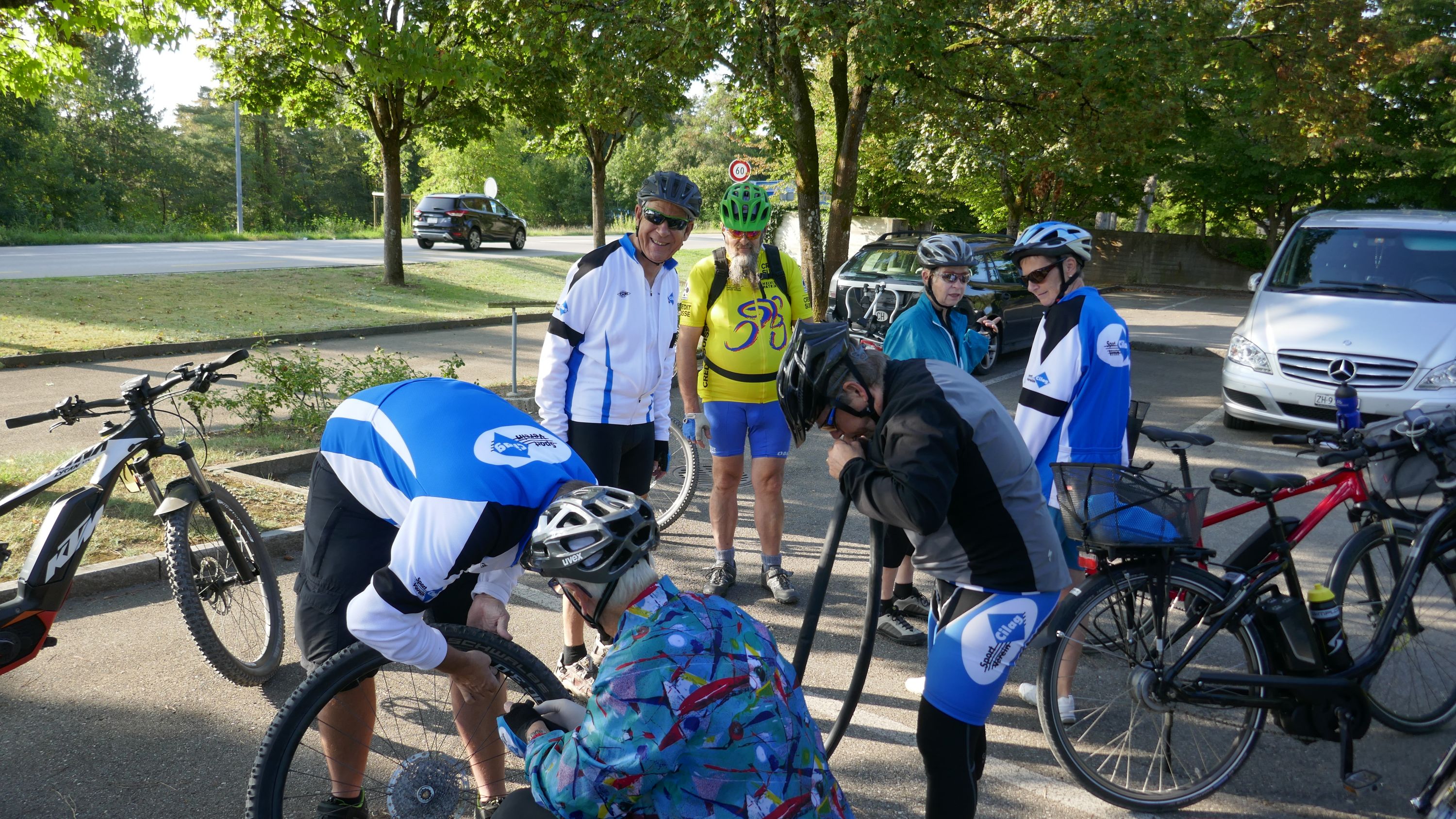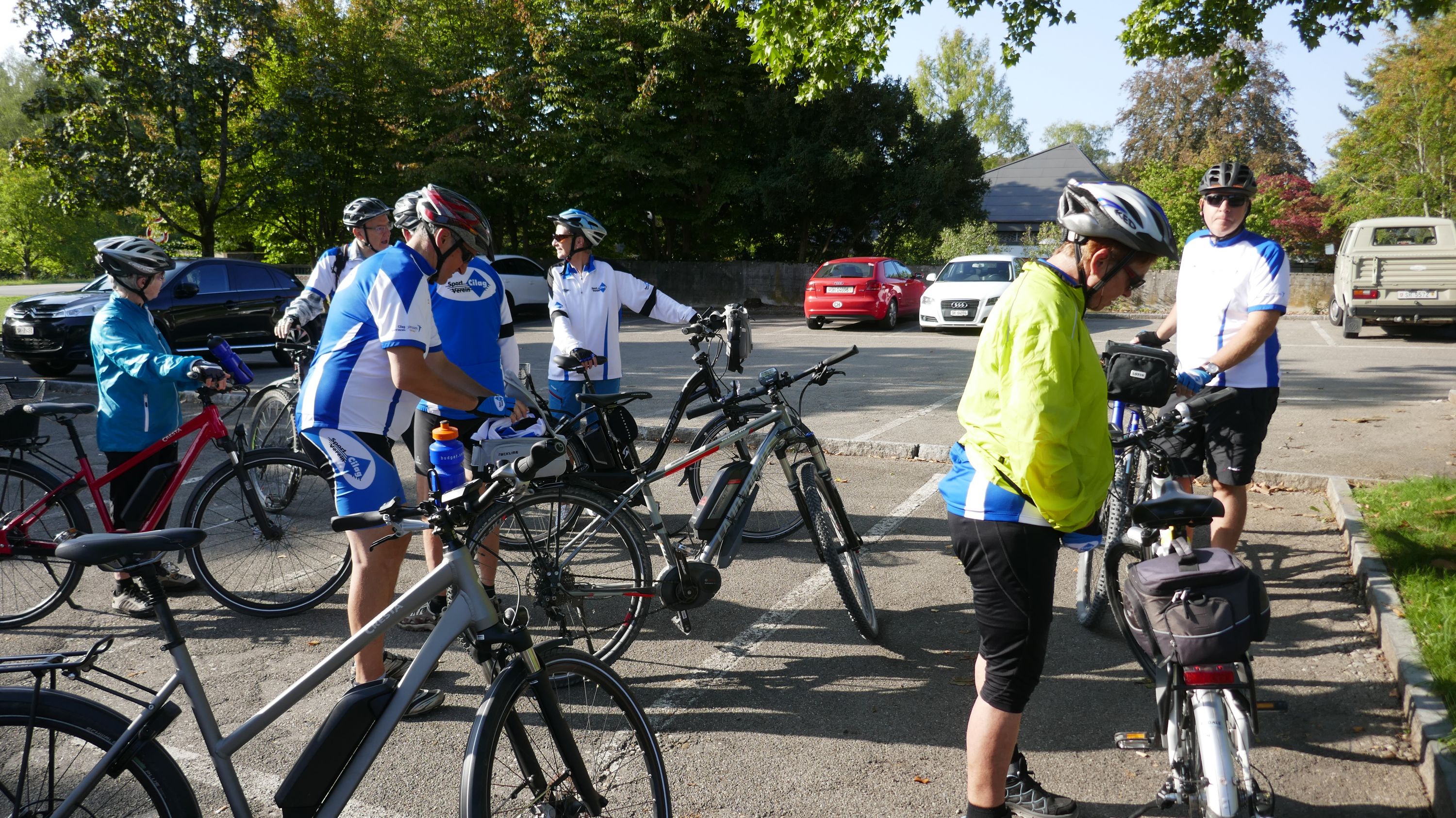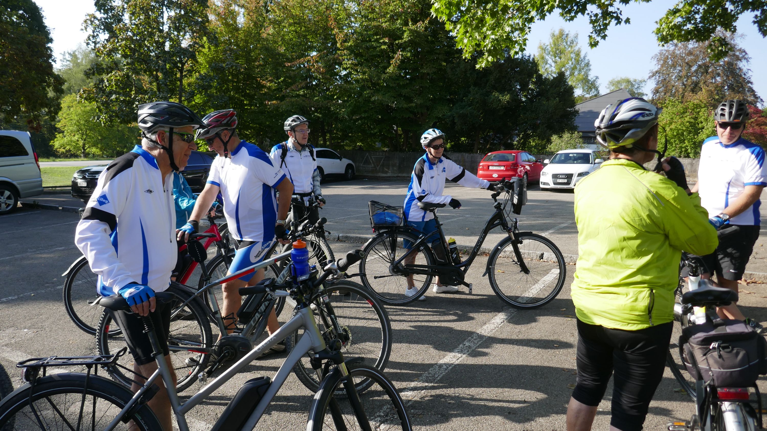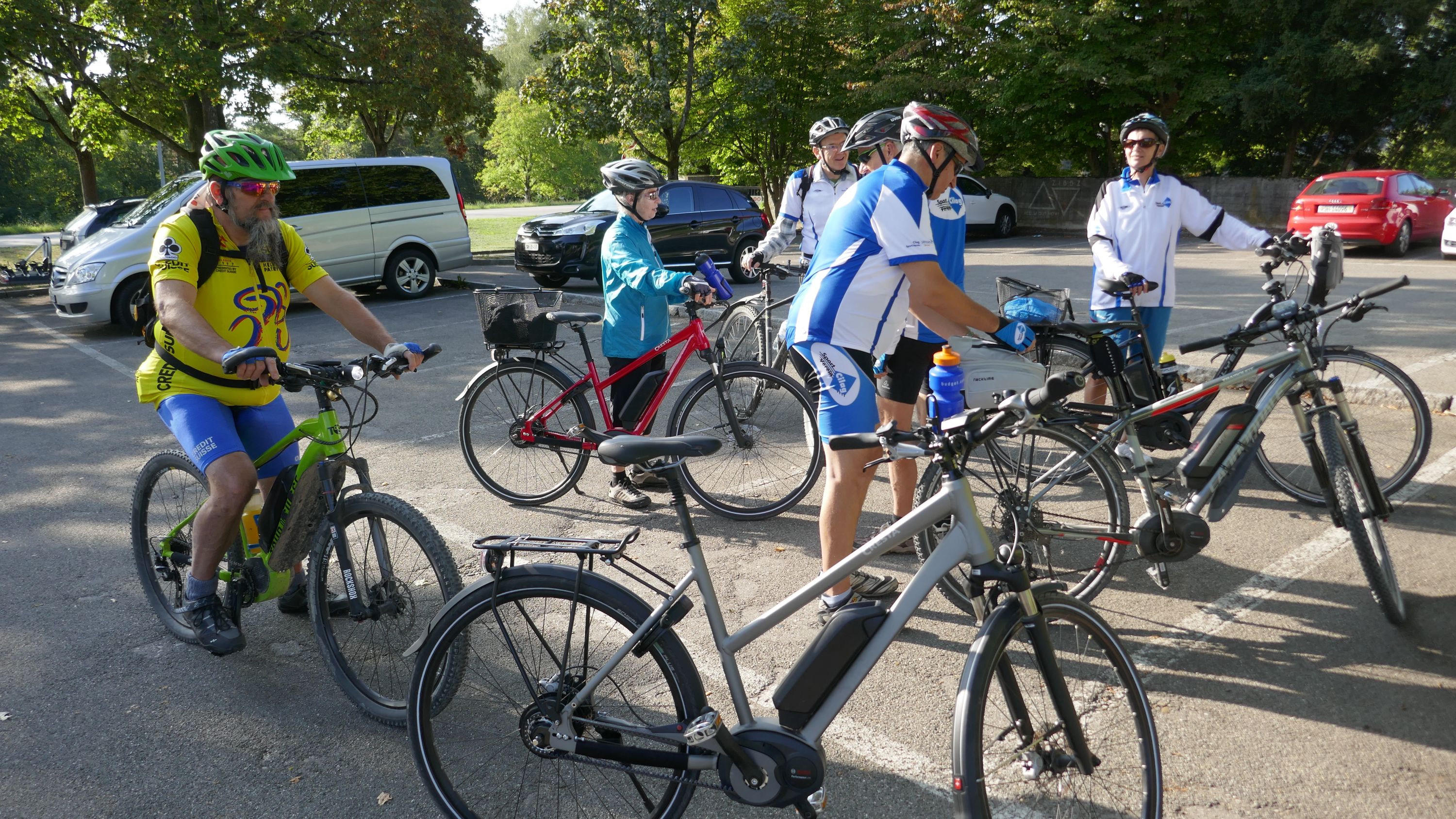 Alle 10 angemeldeten Teilnehmer trafen zur abgemachten Zeit am Parkplatz Zollstrasse in Neuhausen ein und hätten auch pünktlich starten können. Wäre da nicht die Luft unseres Fotografen dh. seines Hinterrades mit lautem Zischen entwichen. Schnell waren helfende Hände bereit, bauten das defekte Rad aus und setzten einen neuen Schlauch ein. Etwas Mühe machte dann die Montage des Hinterrades was den Start um ca. eine halbe Stunde verzögerte. Doch dann schwangen sich alle in den Sattel und folgten Markus unserem Guide. Vorbei am Aazheimerhof ging es rechts ab Richtung Guntalingen, wo uns gleich die erste Steigung hinauf zum Hexenplatz erwartete. Für die 8 E-Biker kein Problem, doch Peter und Christof kamen schon das erste Mal leicht ins Schnaufen.