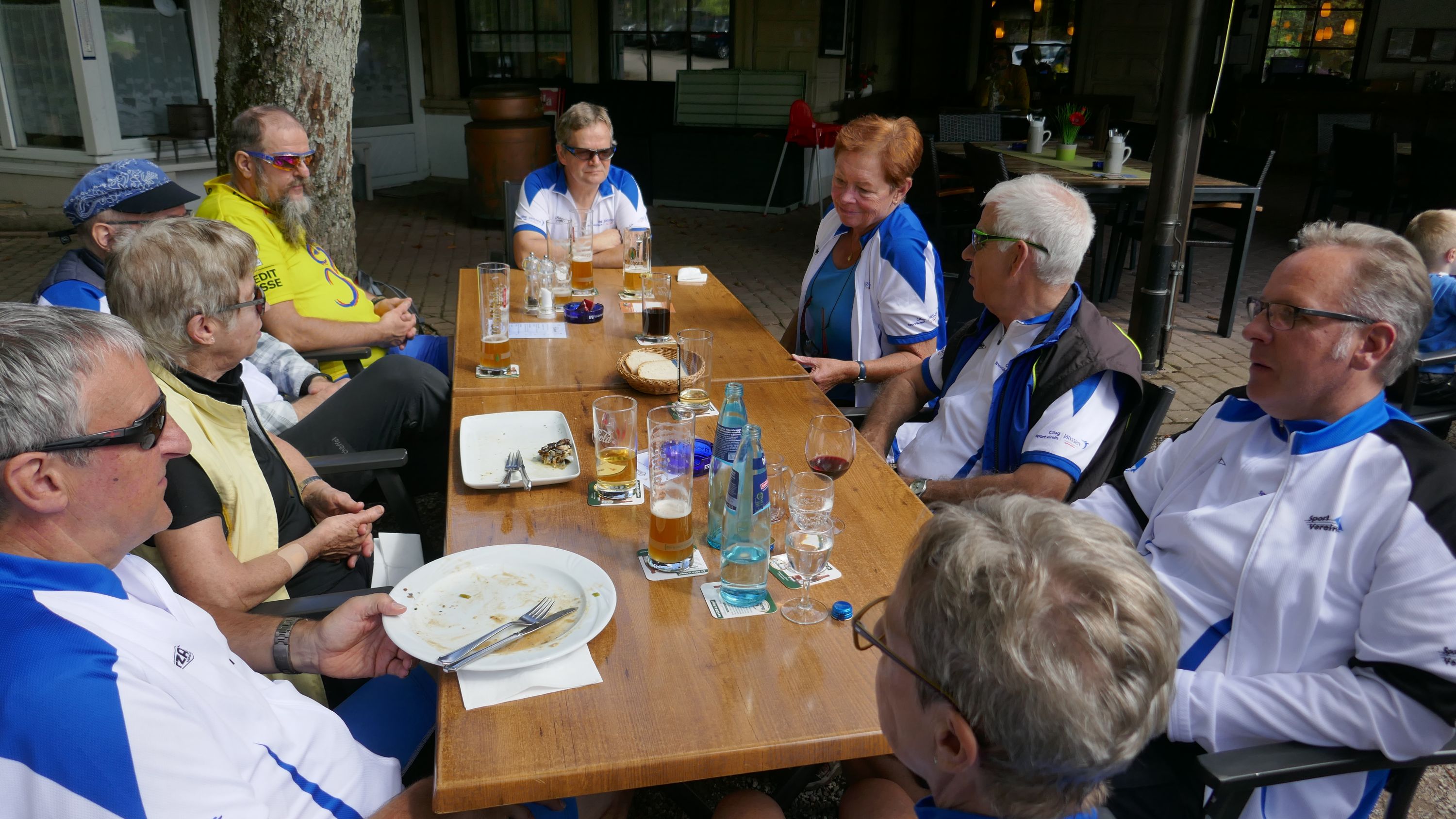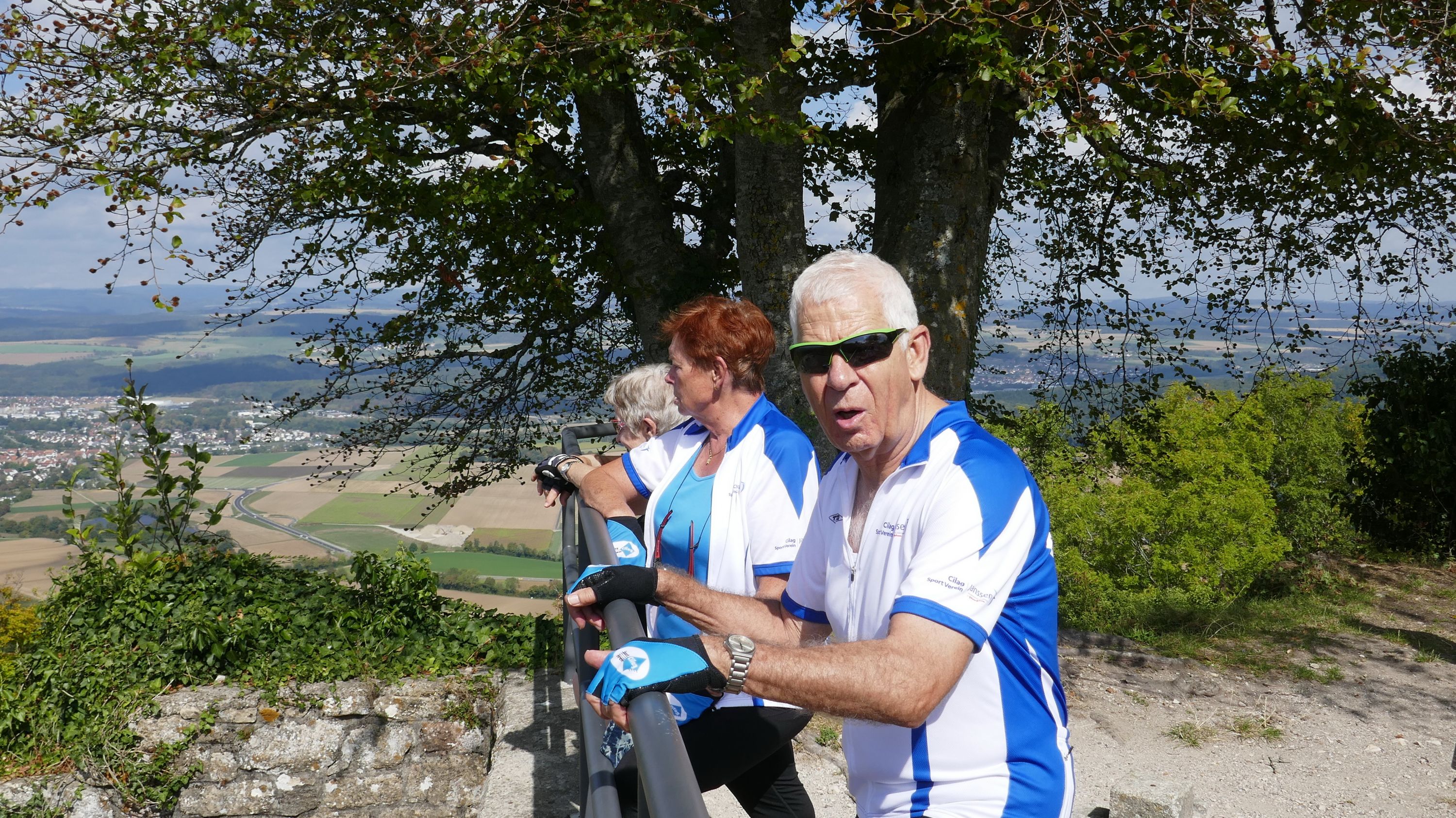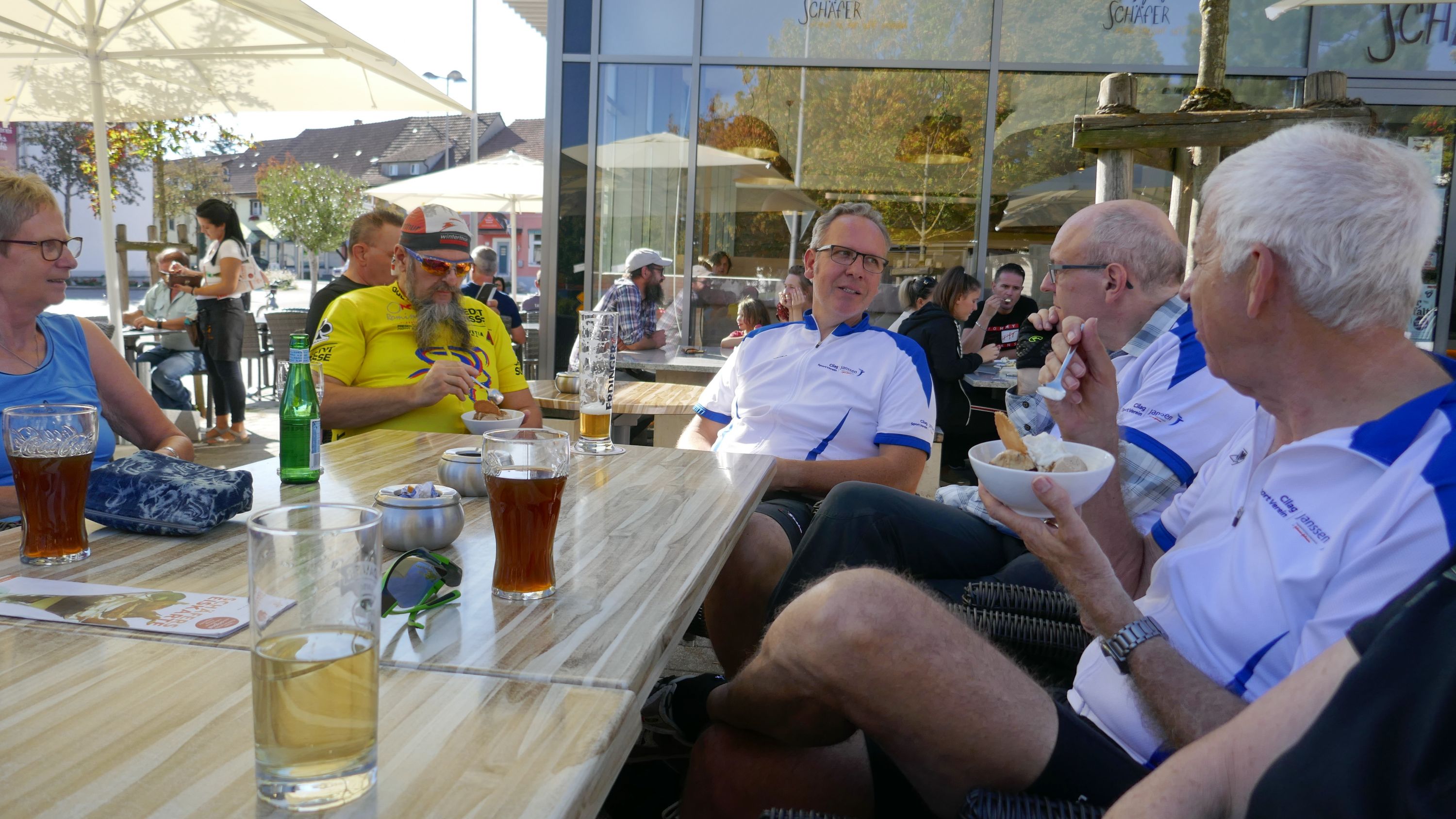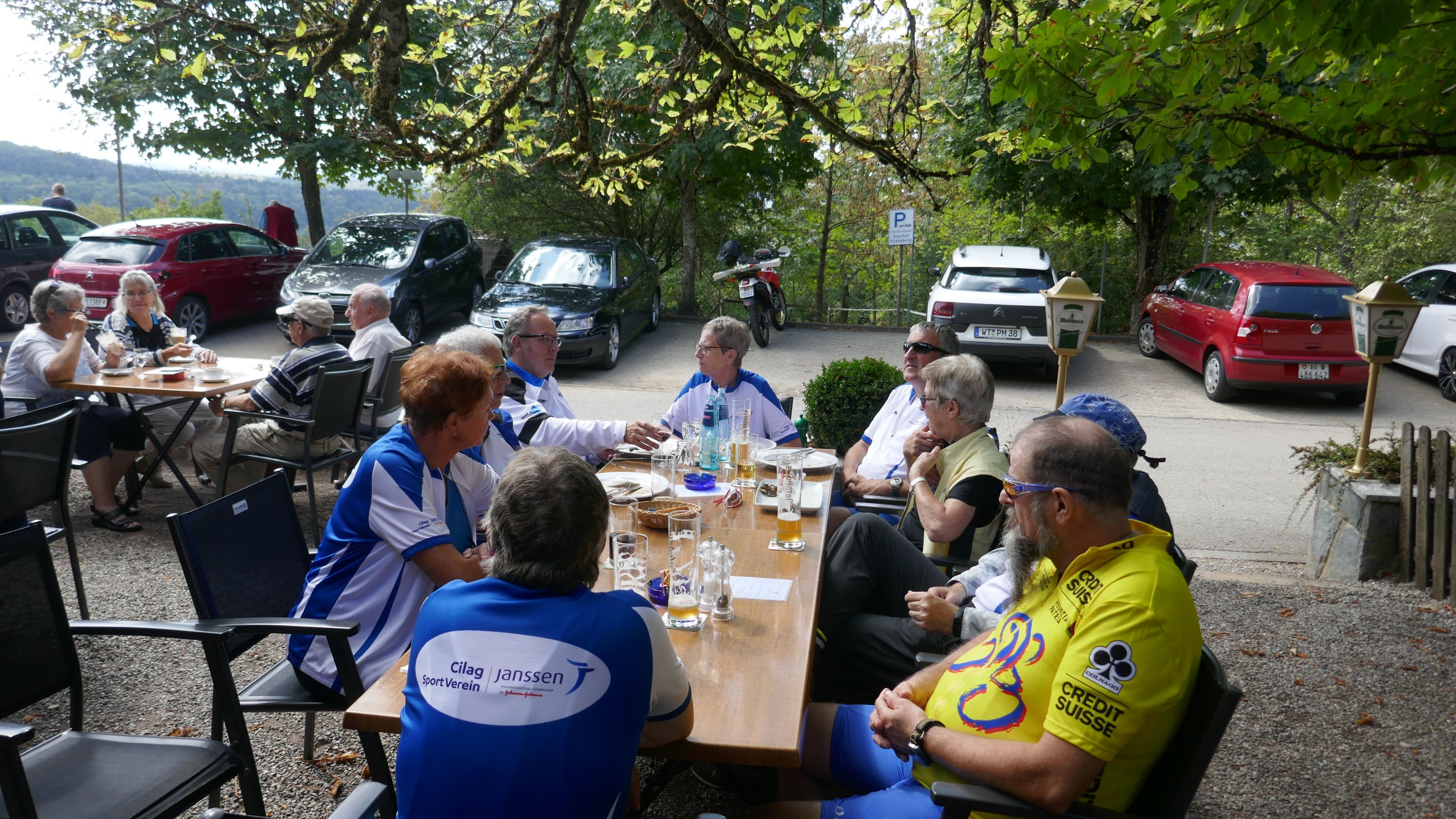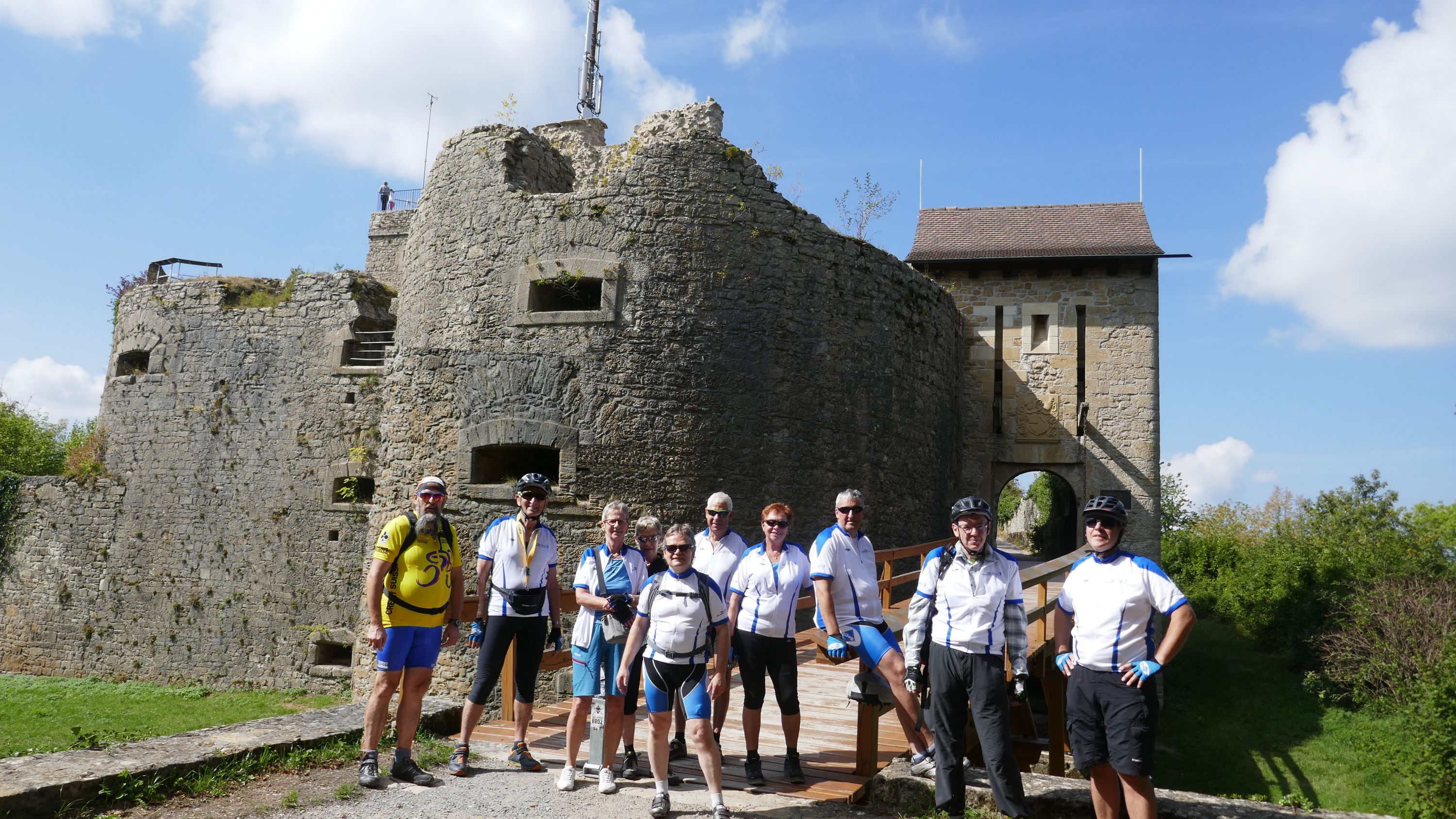Vor dem geplanten Mittagshalt besuchten wir die Burg, von deren Zinne wir den 360° Ausblick genossen. Nach dem obligaten Gruppenfoto ging es zurück zum Gasthof Küssaburg, wo für uns reserviert war. Bei einem reichhaltig Essen konnten wir unseren Energiespeicher wieder auffüllen. Auch die halb leeren Akkus von Heidi wurden bei der Bike Tankstelle wieder aufgeladen. Ein vorbildlicher Service den wir auch anderen Restaurants empfehlen können.