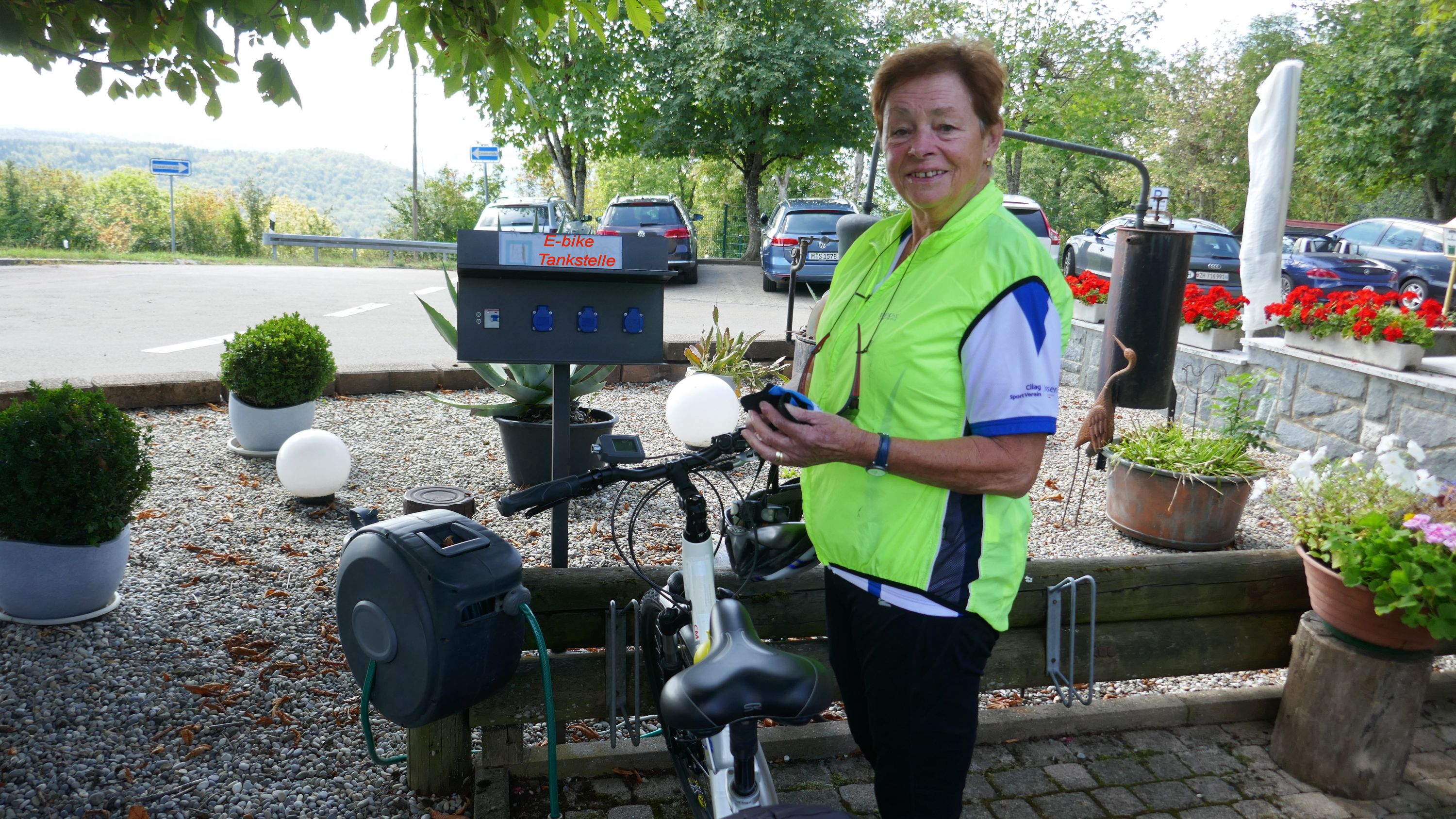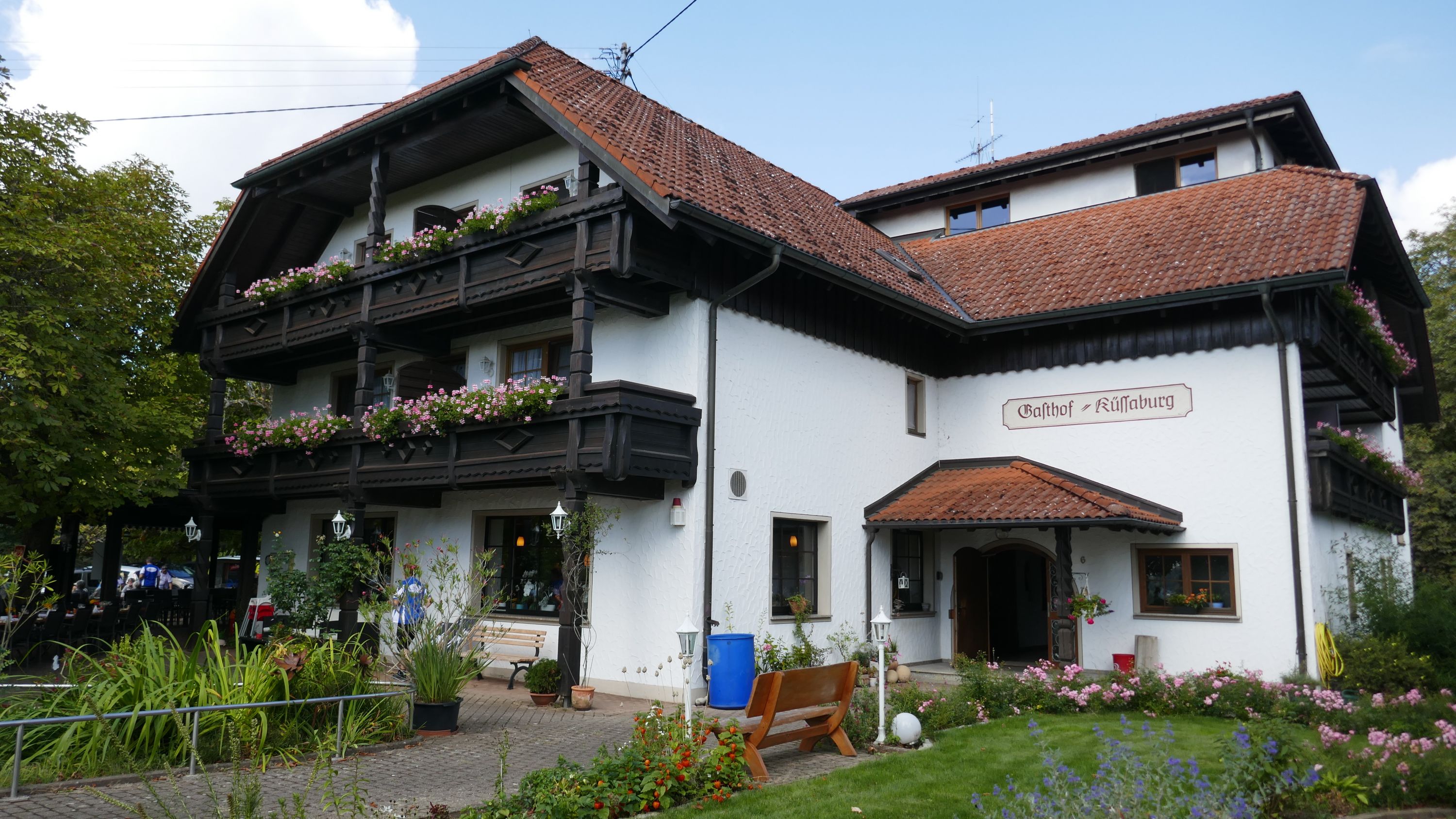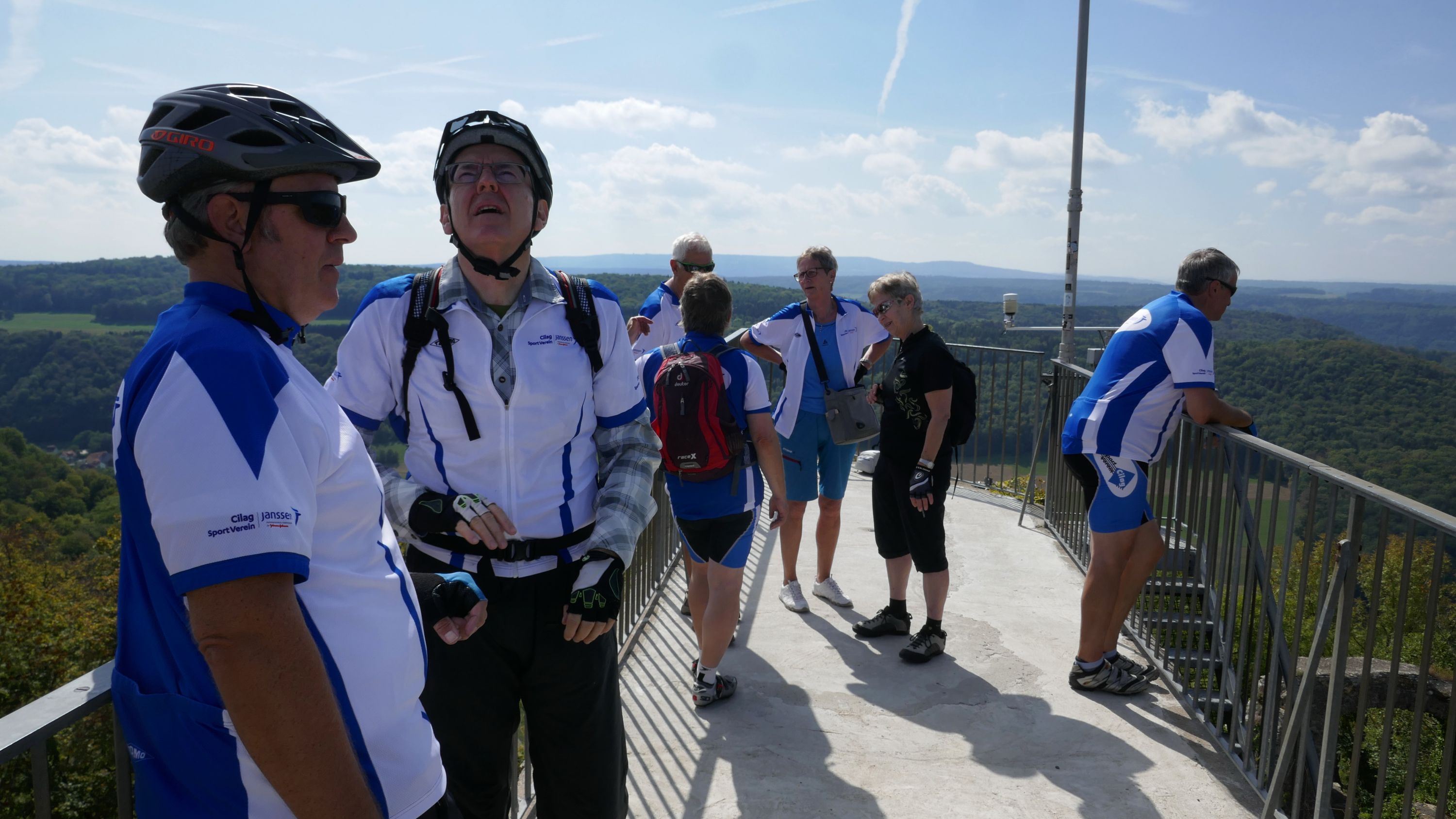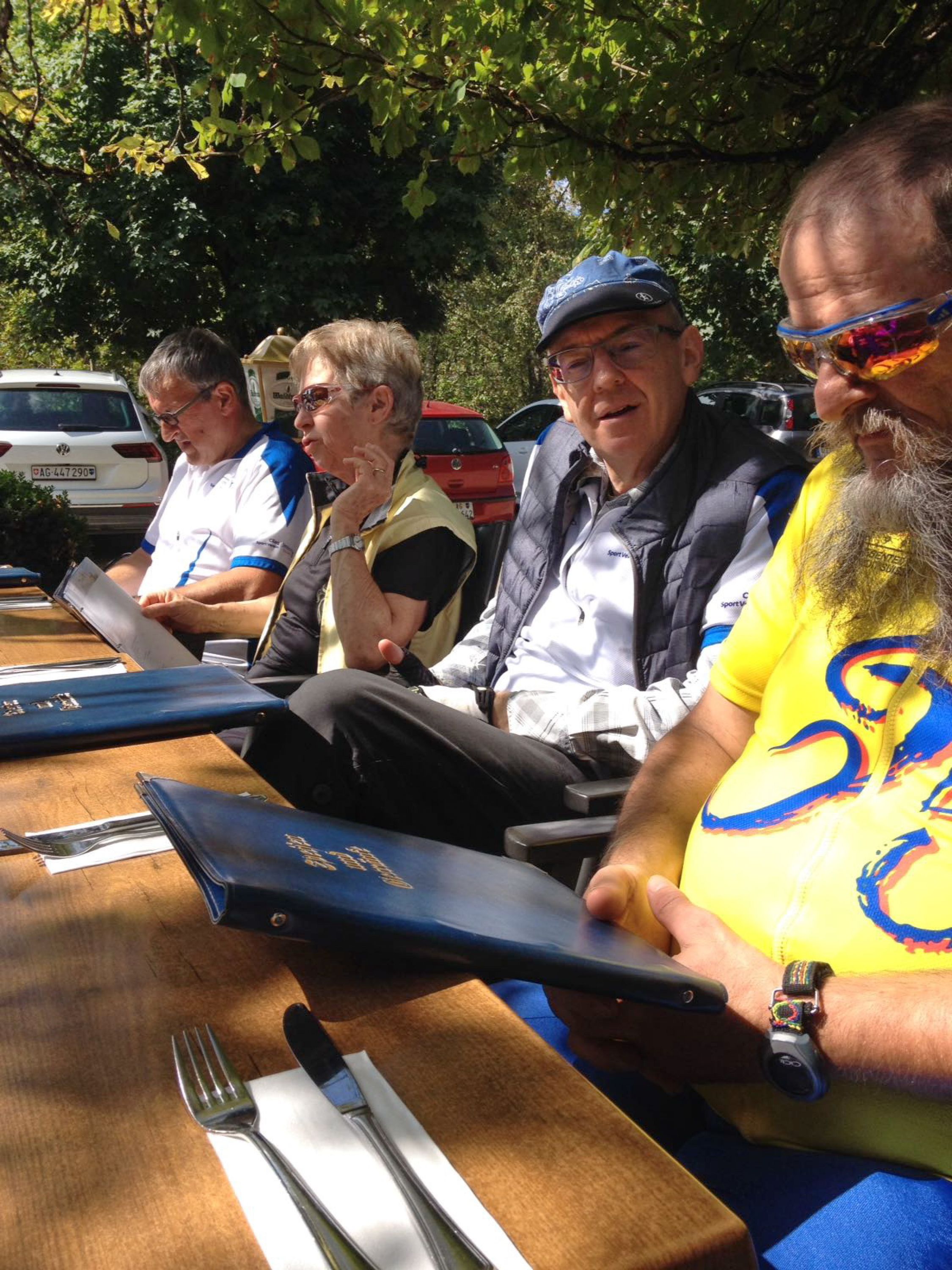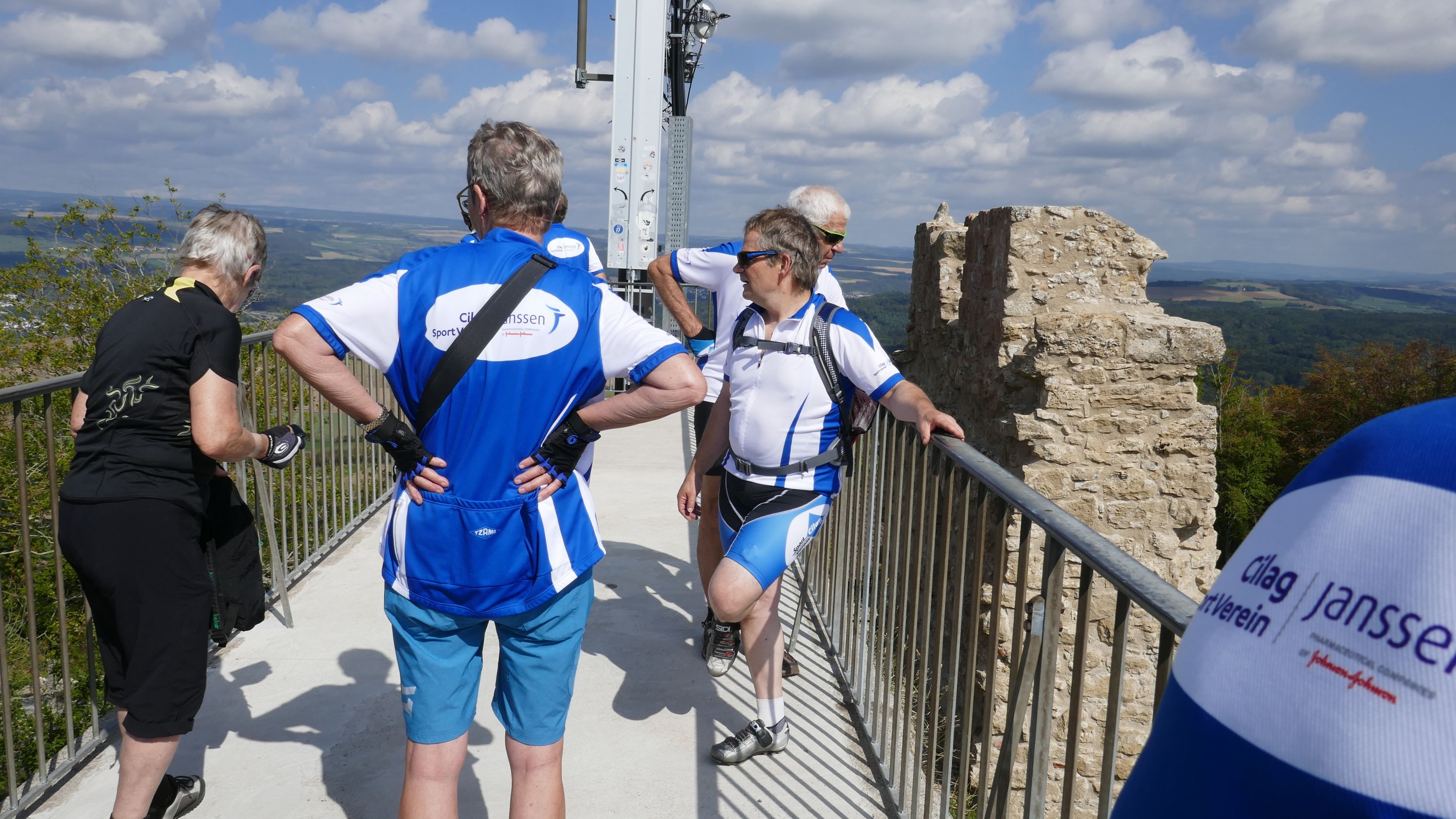 Vor dem geplanten Mittagshalt besuchten wir die Burg, von deren Zinne wir den 360° Ausblick genossen. Nach dem obligaten Gruppenfoto ging es zurück zum Gasthof Küssaburg, wo für uns reserviert war. Bei einem reichhaltig Essen konnten wir unseren Energiespeicher wieder auffüllen. Auch die halb leeren Akkus von Heidi wurden bei der Bike Tankstelle wieder aufgeladen. Ein vorbildlicher Service den wir auch anderen Restaurants empfehlen können.