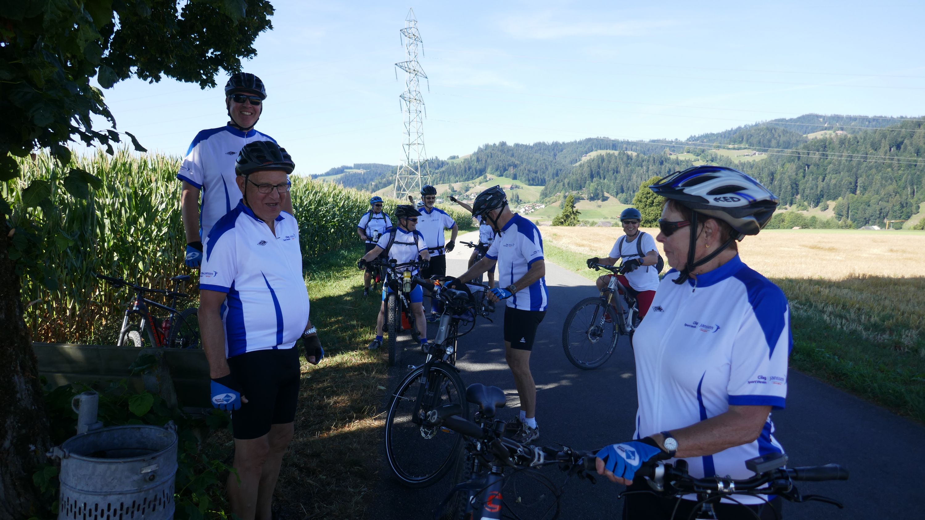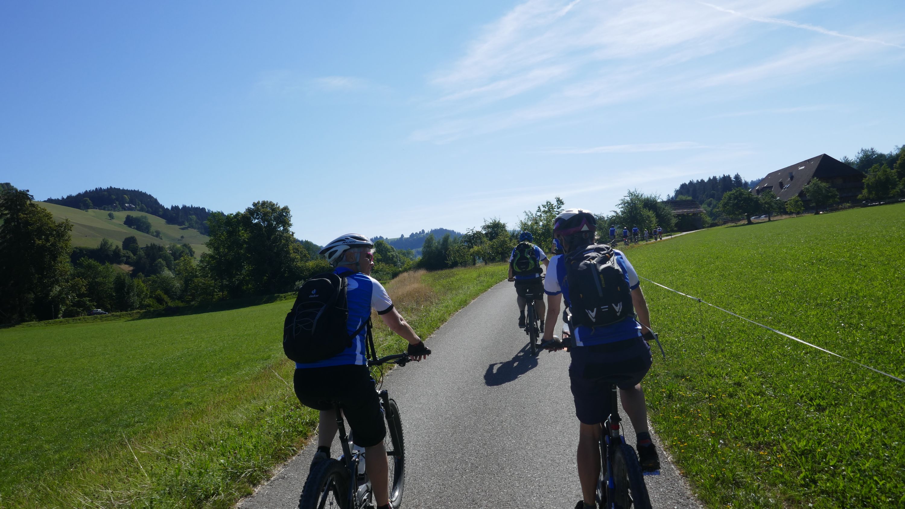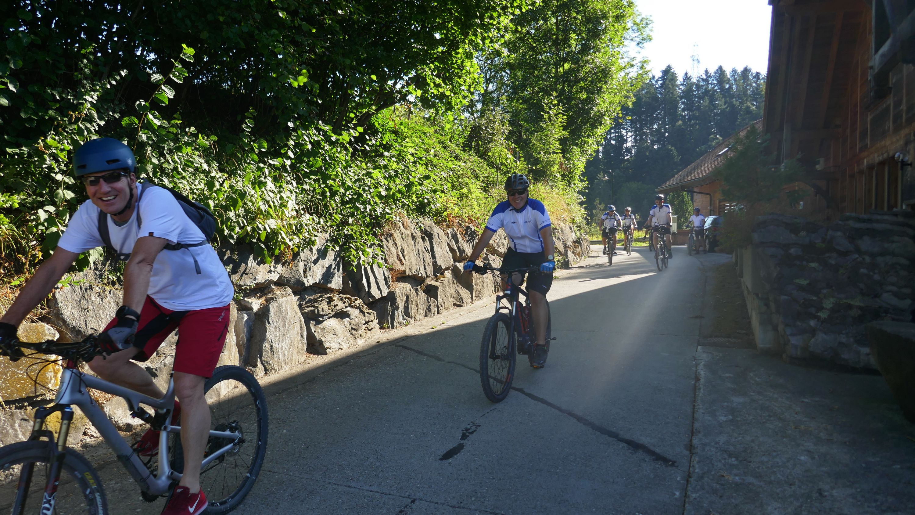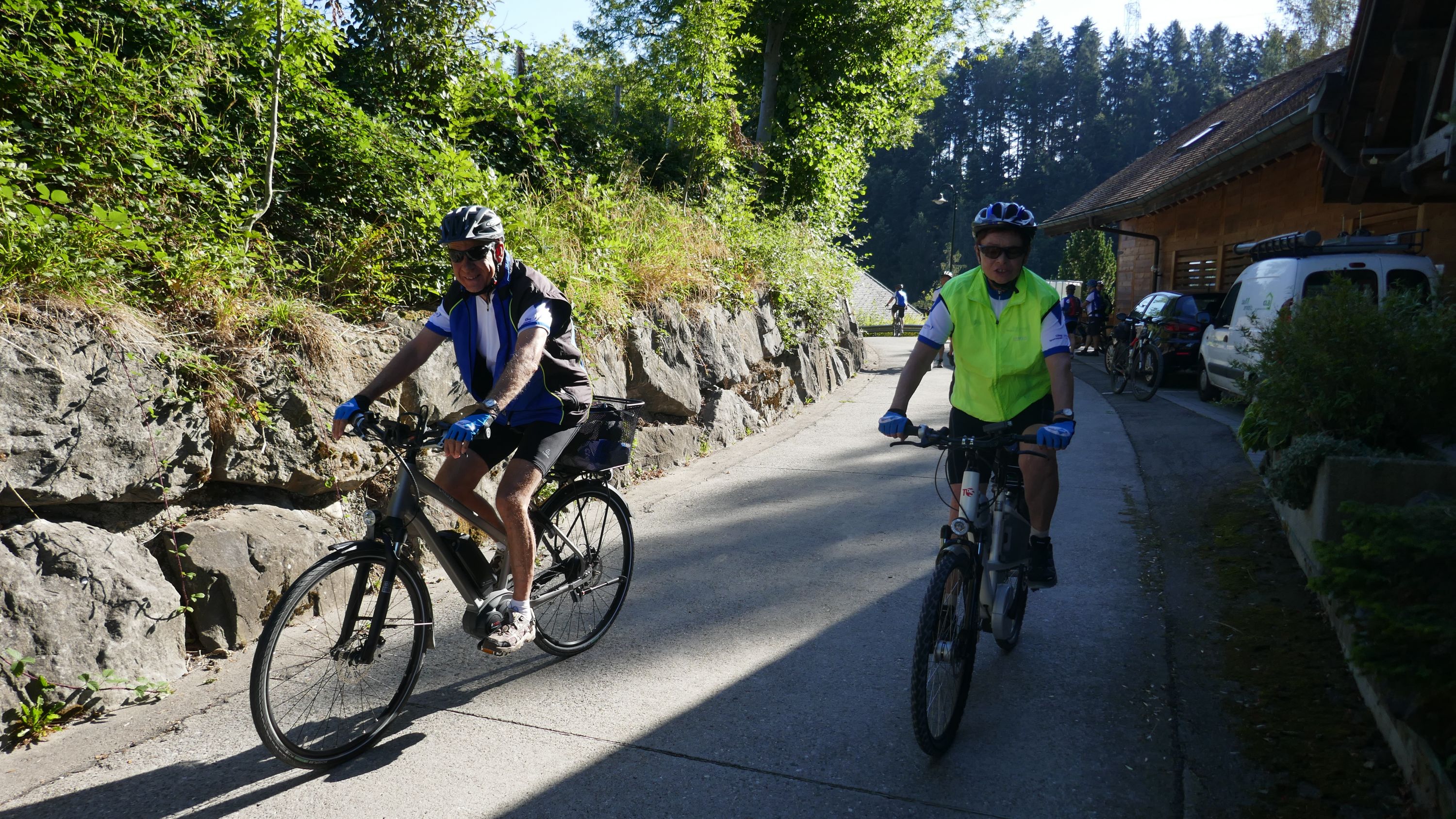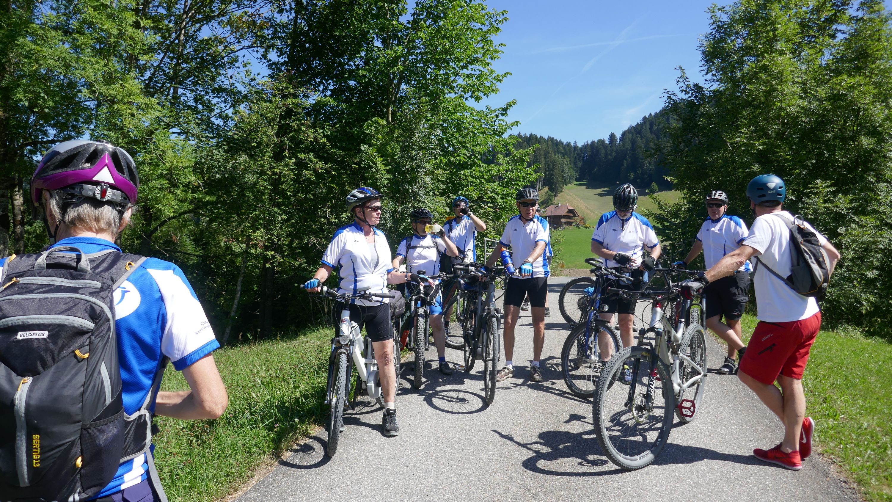 Am Samstagmorgen um 07:30 starteten wir mit dem Kleinbus mit Anhänger, gelenkt von Peter Frigerio, zum Ausgangspunkt unserer Velotour. Beim Sportzentrum in Huttwil warteten unser Guide Stefan und seine Frau Angelika bereits auf uns. Nach einer kurzen Information zur ersten Tagesetappe, verteilte Peter Bananen und Powerriegel bevor es los ging. Die Strecke war sportlich anspruchsvoll und hatte viele Steigungen. Entschädigt wurden wir dafür immer wieder mit traumhaften Aussichten. Bei der ersten Pause im Garten der Emmentaler Schaukäserei in Affoltern i. E. konnten wir uns von den ersten Anstrengungen ausruhen. Kurze Zeit später, jedoch erst nach einem steilen Anstieg mit Velo oder zu Fuss auf die Lueg - einem Aussichtspunkt oberhalb Affoltern i.E. - hatten wir eine prächtige Sicht ins Berner Mittelland und gegenüber ins Emmental und Richtung Berner Alpen. Stefan hatte für die ganz Wilden immer noch eine «Challenge» anzubieten. So auch von der Lueg zum Parkplatz, wo Peter auf uns wartete. Allerdings war diese Abfahrt so stotzig, dass wir aus Vernunft teilweise zu Fuss gingen und nicht schon zu Beginn der Tour einen unnötigen Sturz provozieren wollten.