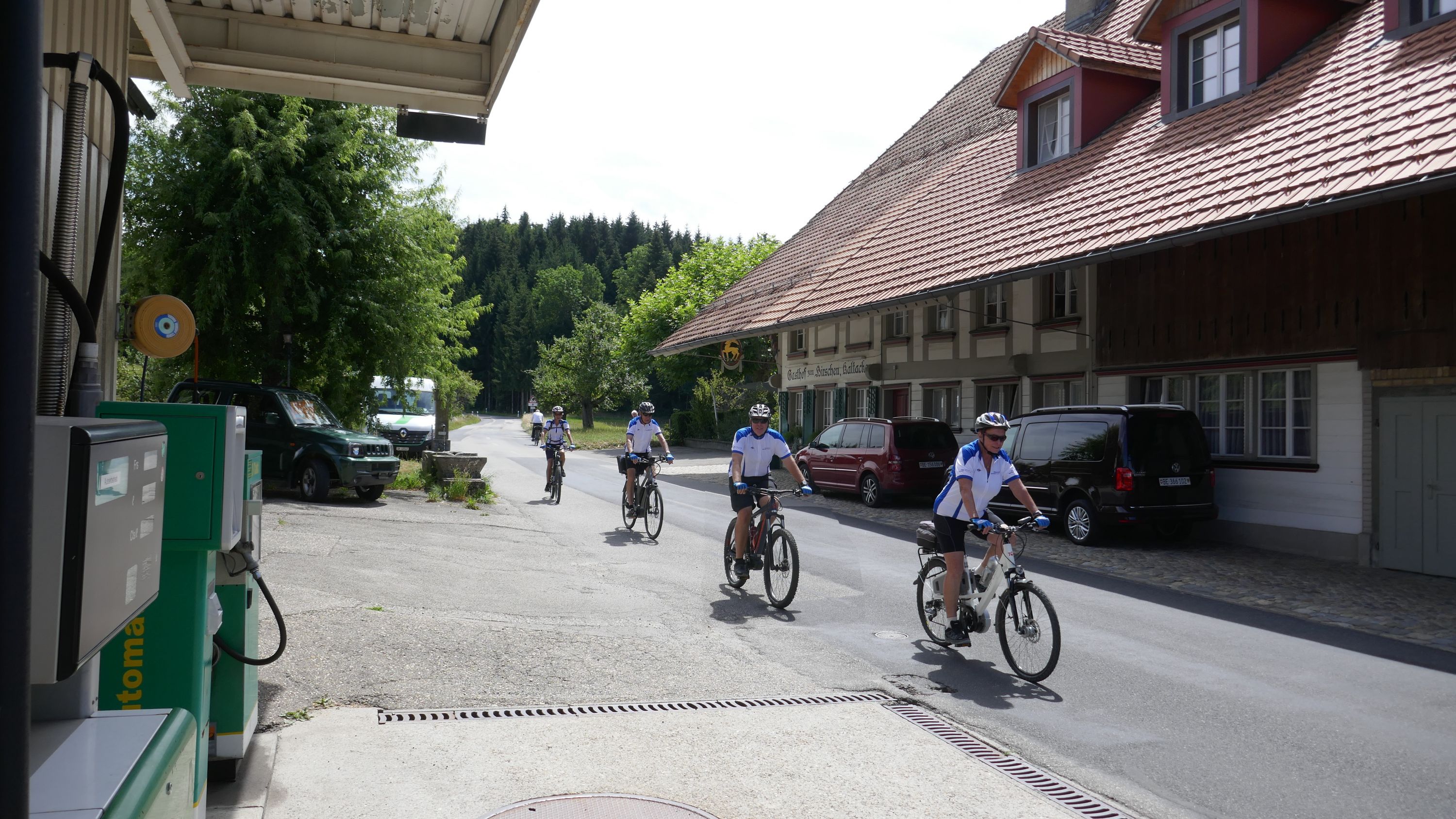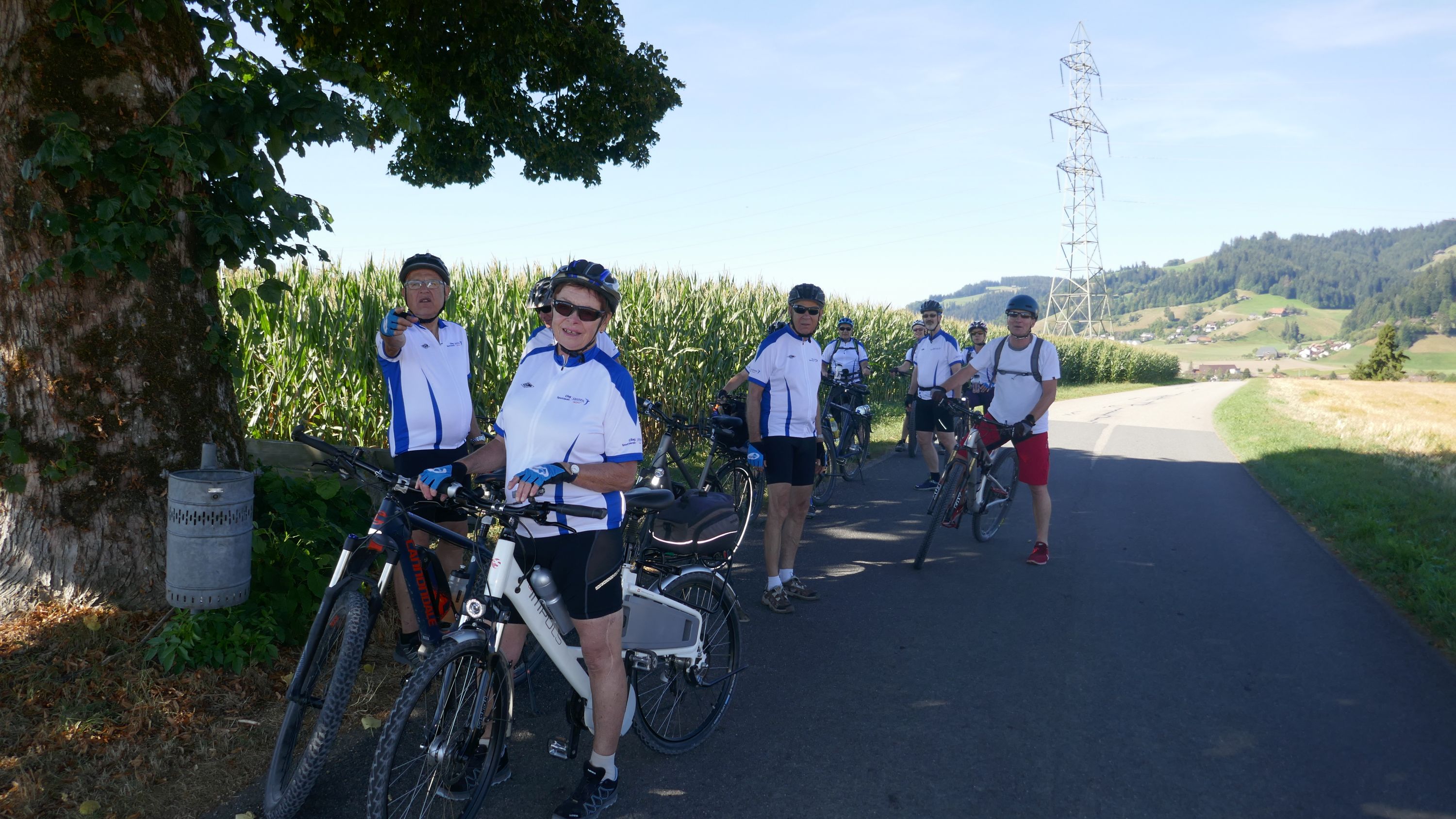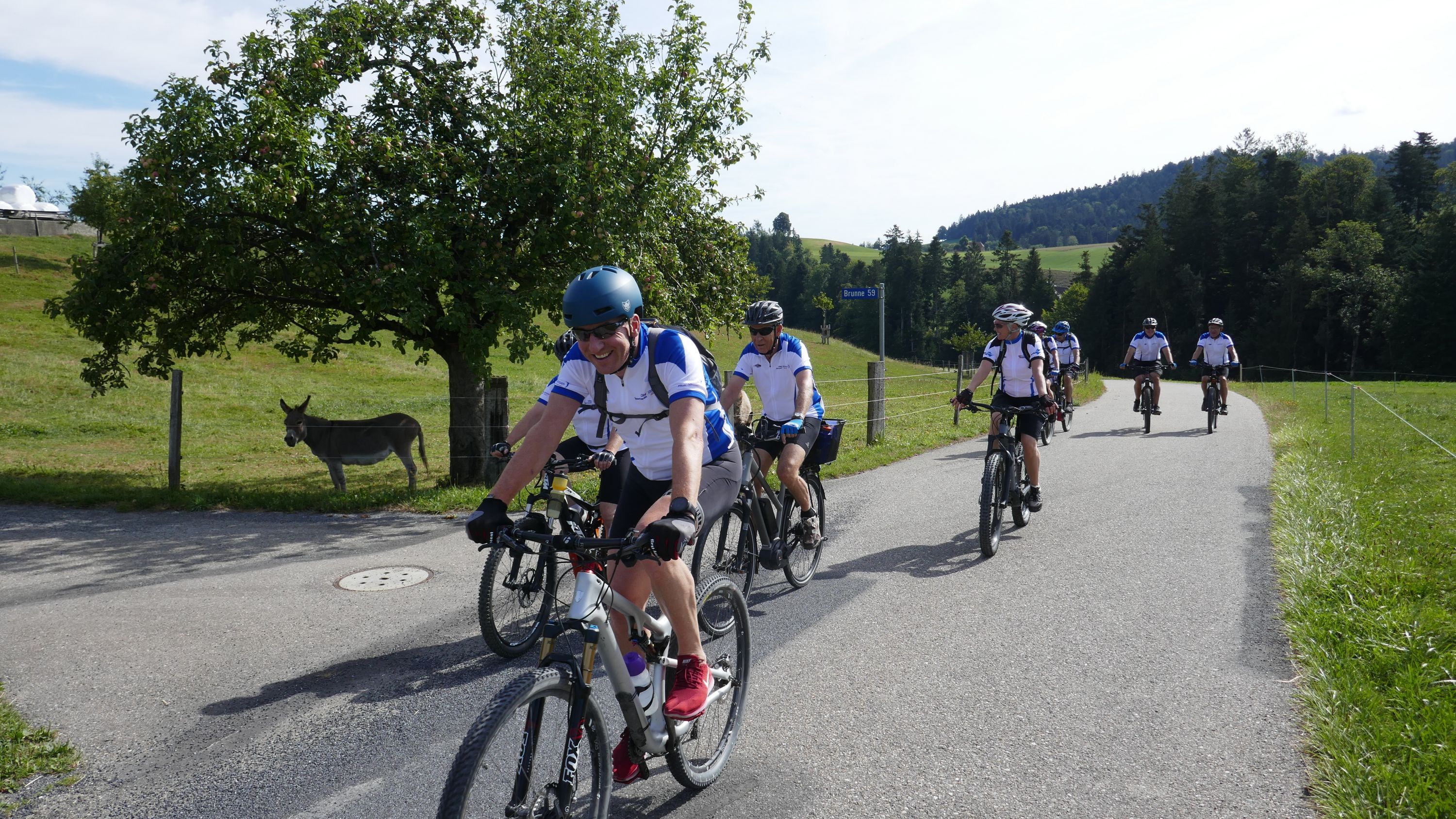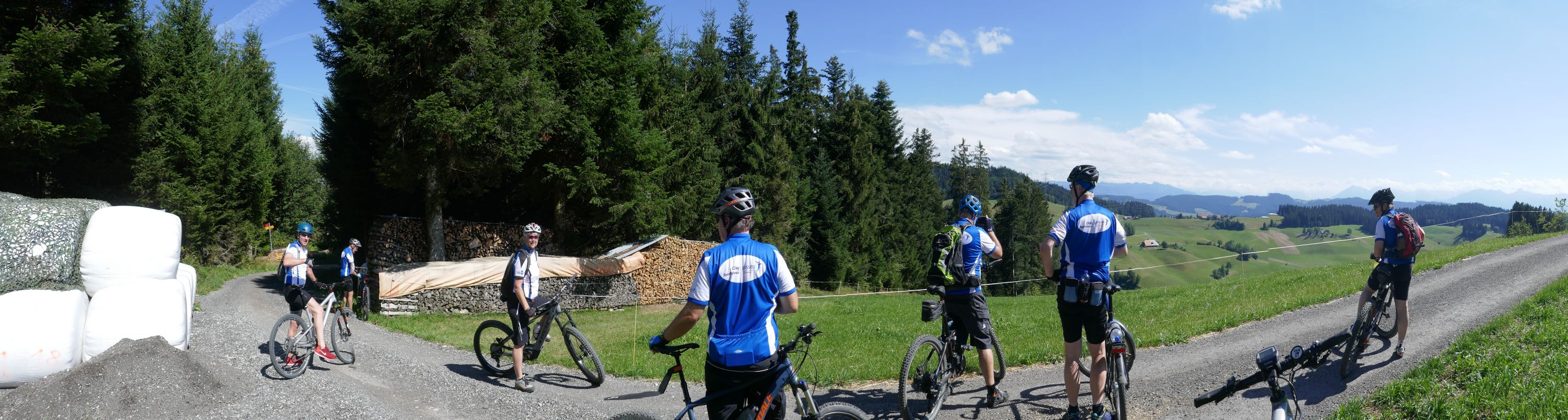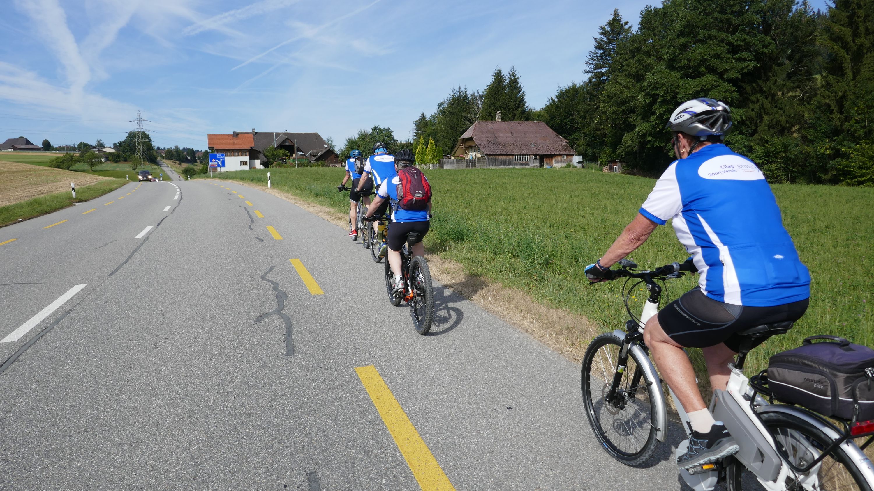 Am Samstagmorgen um 07:30 starteten wir mit dem Kleinbus mit Anhänger, gelenkt von Peter Frigerio, zum Ausgangspunkt unserer Velotour. Beim Sportzentrum in Huttwil warteten unser Guide Stefan und seine Frau Angelika bereits auf uns. Nach einer kurzen Information zur ersten Tagesetappe, verteilte Peter Bananen und Powerriegel bevor es los ging. Die Strecke war sportlich anspruchsvoll und hatte viele Steigungen. Entschädigt wurden wir dafür immer wieder mit traumhaften Aussichten. Bei der ersten Pause im Garten der Emmentaler Schaukäserei in Affoltern i. E. konnten wir uns von den ersten Anstrengungen ausruhen. Kurze Zeit später, jedoch erst nach einem steilen Anstieg mit Velo oder zu Fuss auf die Lueg - einem Aussichtspunkt oberhalb Affoltern i.E. - hatten wir eine prächtige Sicht ins Berner Mittelland und gegenüber ins Emmental und Richtung Berner Alpen. Stefan hatte für die ganz Wilden immer noch eine «Challenge» anzubieten. So auch von der Lueg zum Parkplatz, wo Peter auf uns wartete. Allerdings war diese Abfahrt so stotzig, dass wir aus Vernunft teilweise zu Fuss gingen und nicht schon zu Beginn der Tour einen unnötigen Sturz provozieren wollten.