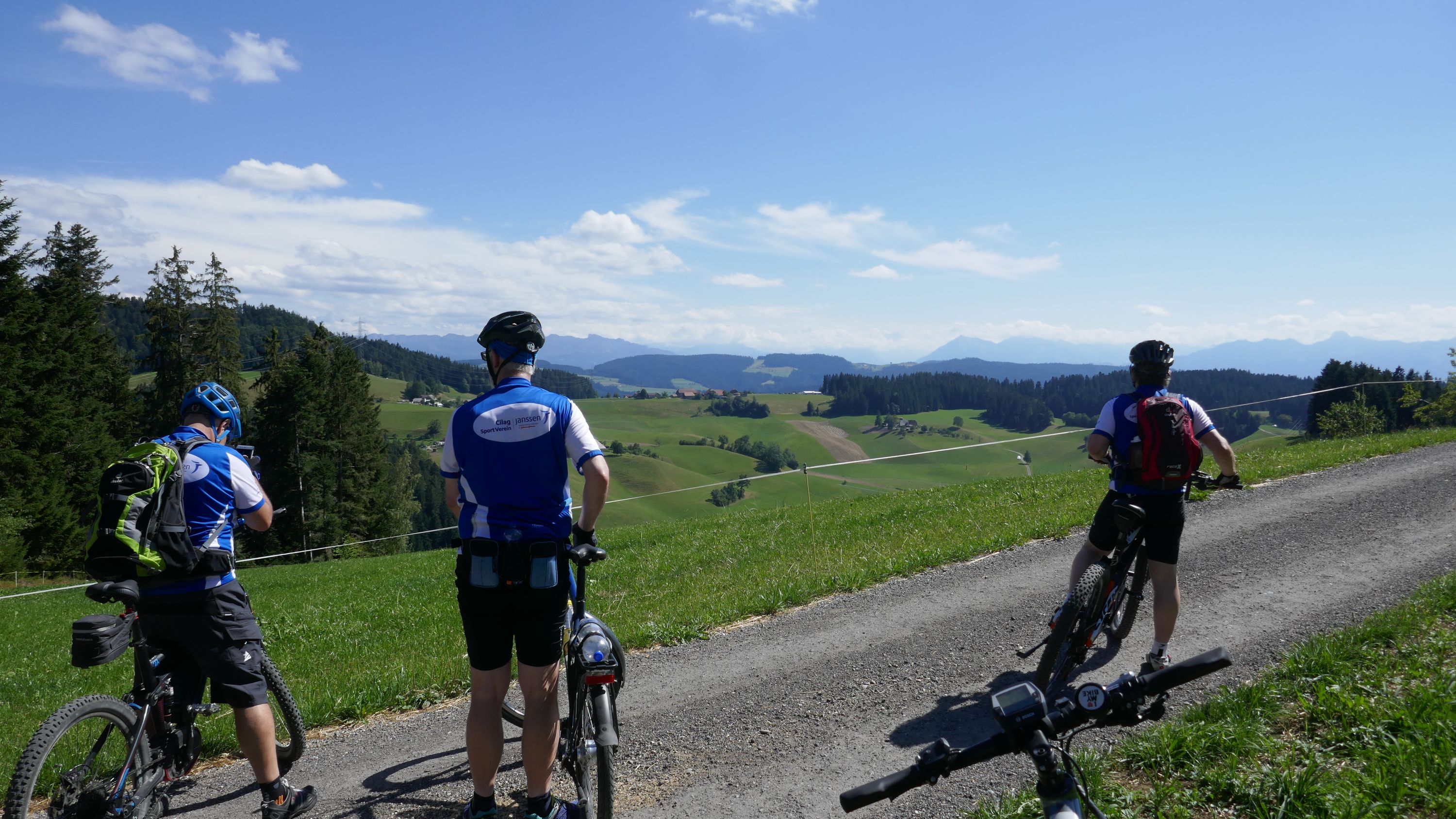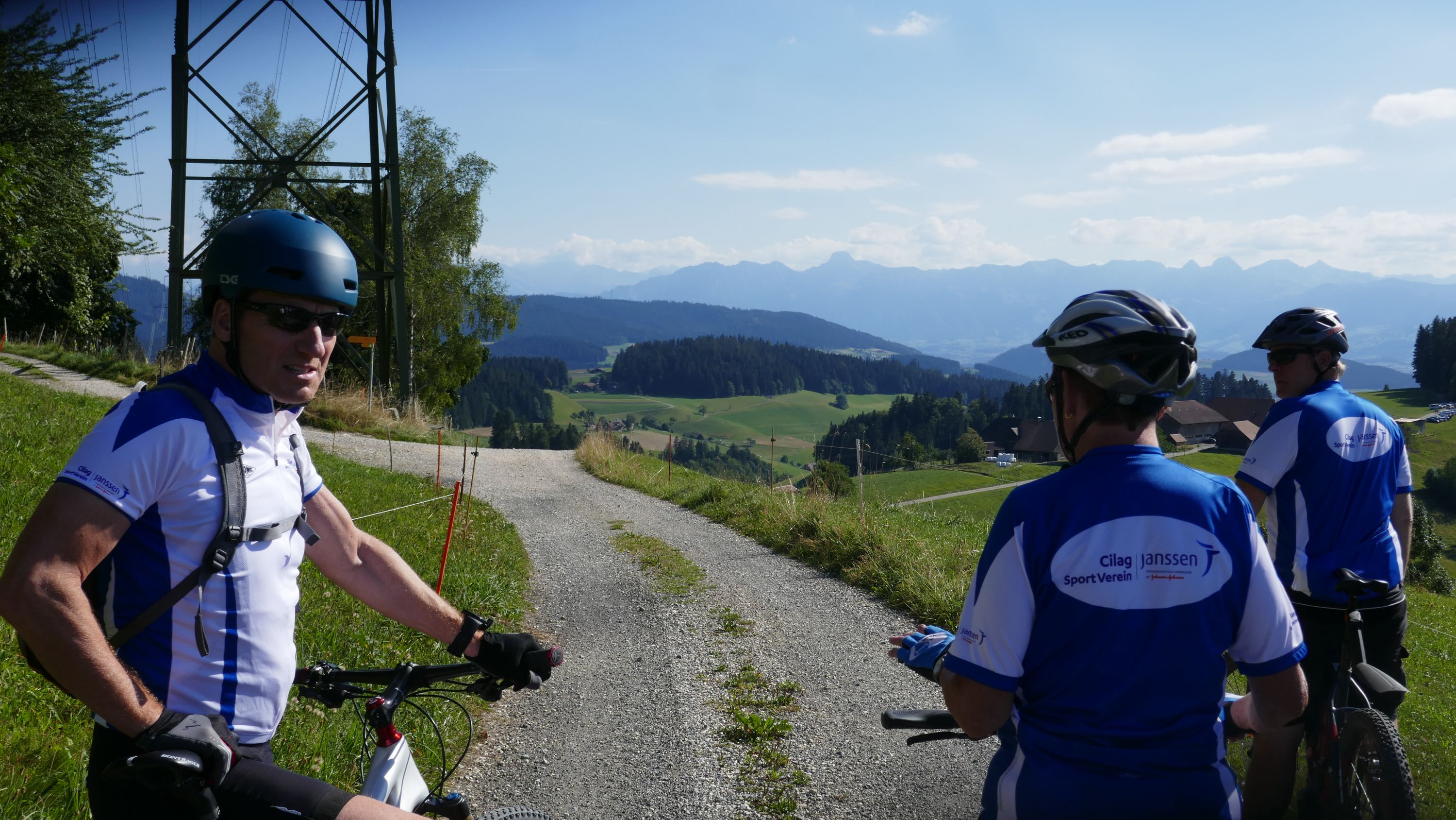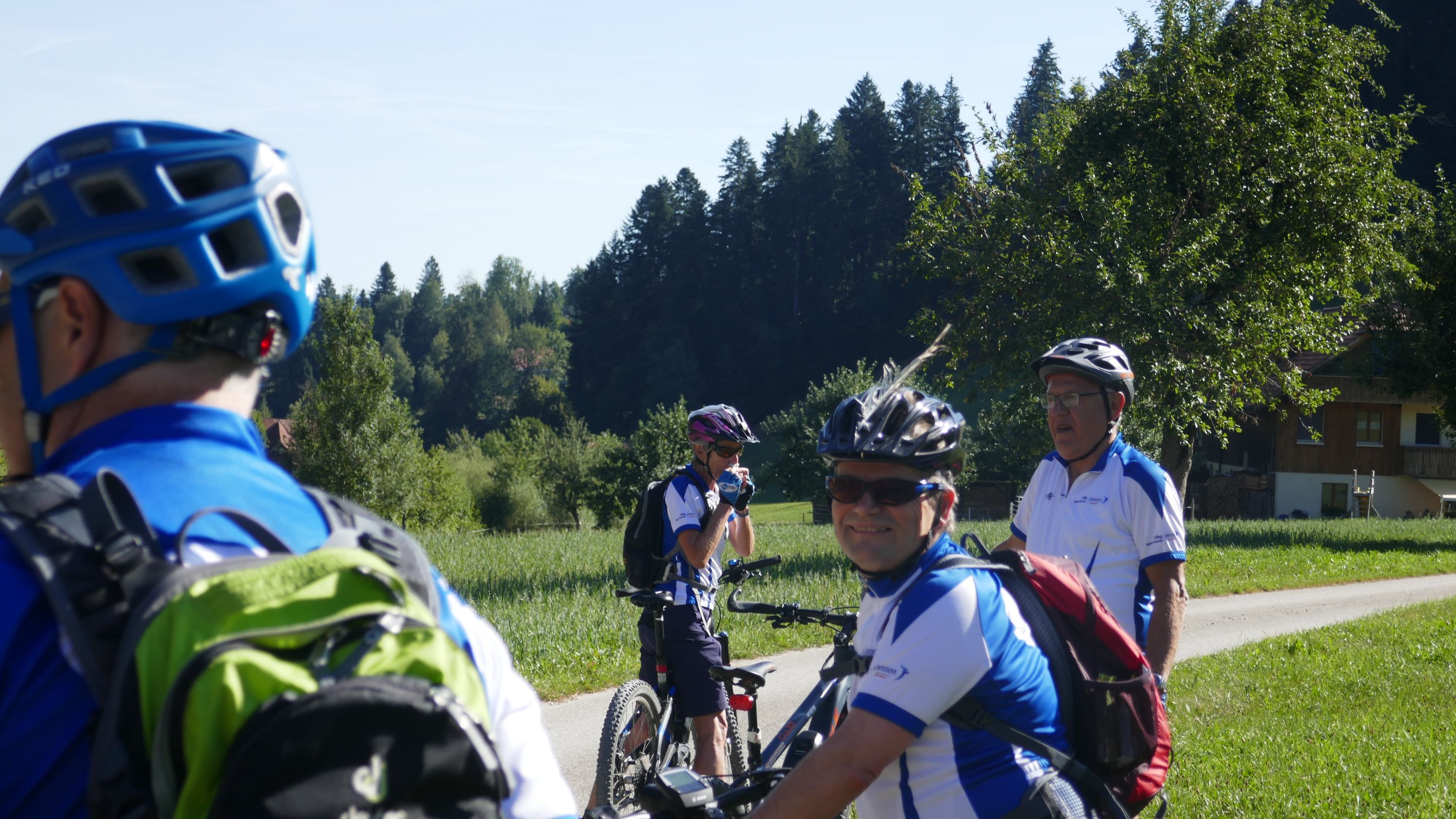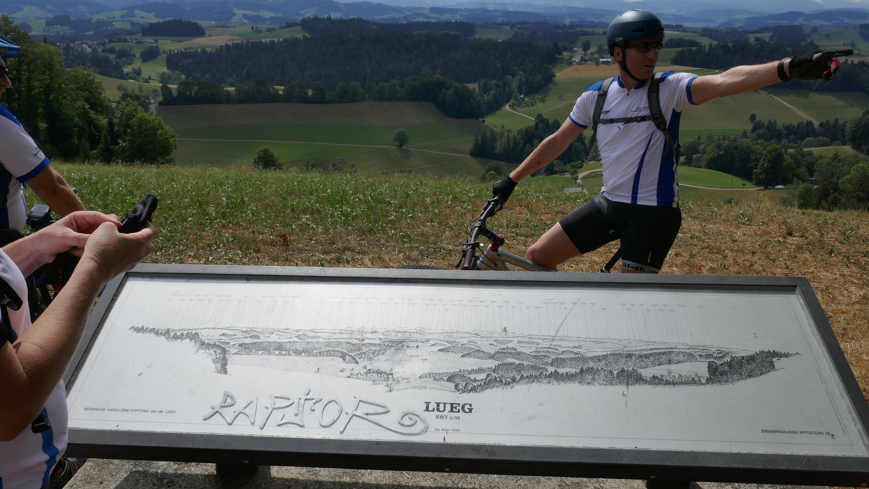 Am Samstagmorgen um 07:30 starteten wir mit dem Kleinbus mit Anhänger, gelenkt von Peter Frigerio, zum Ausgangspunkt unserer Velotour. Beim Sportzentrum in Huttwil warteten unser Guide Stefan und seine Frau Angelika bereits auf uns. Nach einer kurzen Information zur ersten Tagesetappe, verteilte Peter Bananen und Powerriegel bevor es los ging. Die Strecke war sportlich anspruchsvoll und hatte viele Steigungen. Entschädigt wurden wir dafür immer wieder mit traumhaften Aussichten. Bei der ersten Pause im Garten der Emmentaler Schaukäserei in Affoltern i. E. konnten wir uns von den ersten Anstrengungen ausruhen. Kurze Zeit später, jedoch erst nach einem steilen Anstieg mit Velo oder zu Fuss auf die Lueg - einem Aussichtspunkt oberhalb Affoltern i.E. - hatten wir eine prächtige Sicht ins Berner Mittelland und gegenüber ins Emmental und Richtung Berner Alpen. Stefan hatte für die ganz Wilden immer noch eine «Challenge» anzubieten. So auch von der Lueg zum Parkplatz, wo Peter auf uns wartete. Allerdings war diese Abfahrt so stotzig, dass wir aus Vernunft teilweise zu Fuss gingen und nicht schon zu Beginn der Tour einen unnötigen Sturz provozieren wollten.
