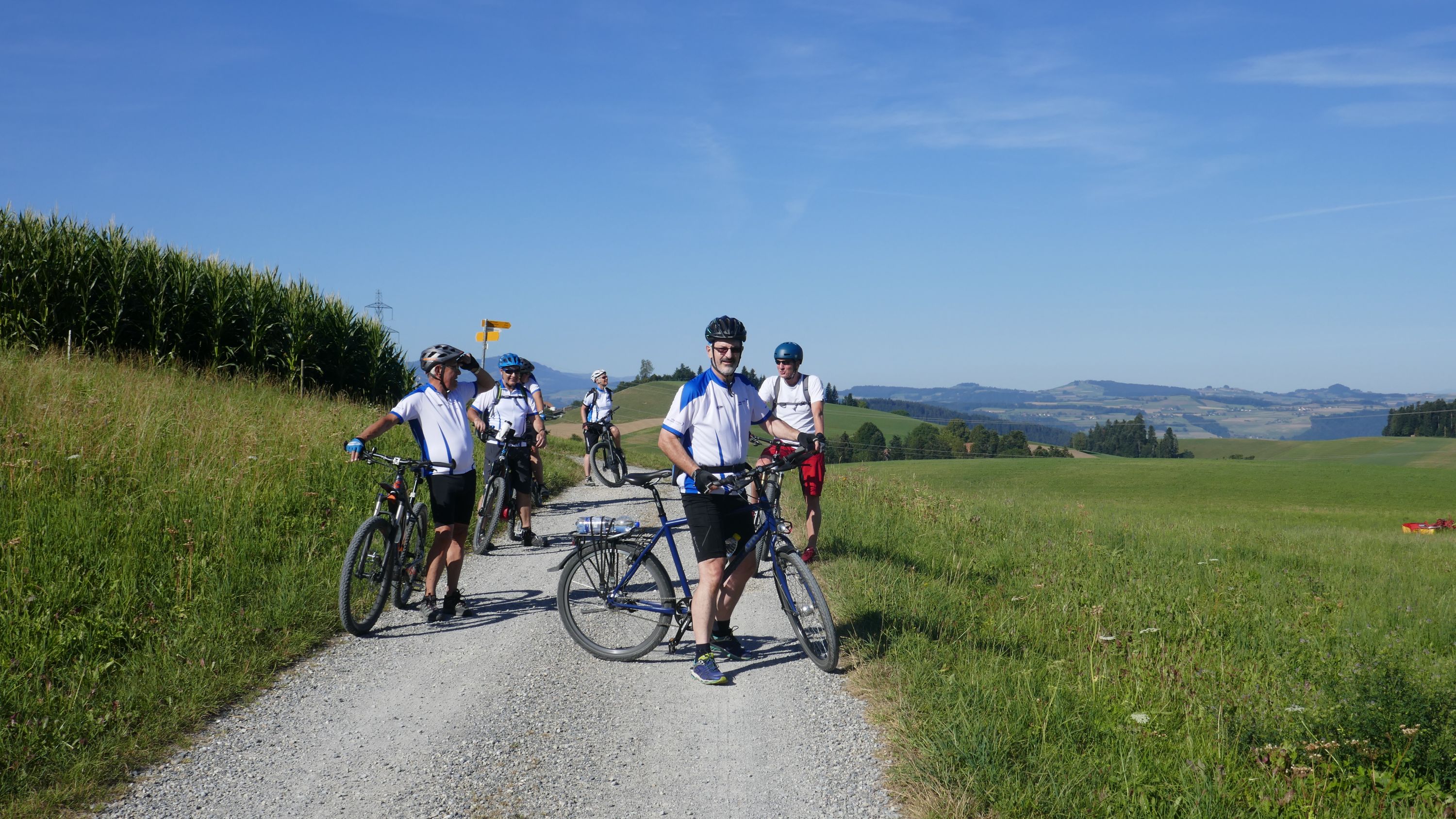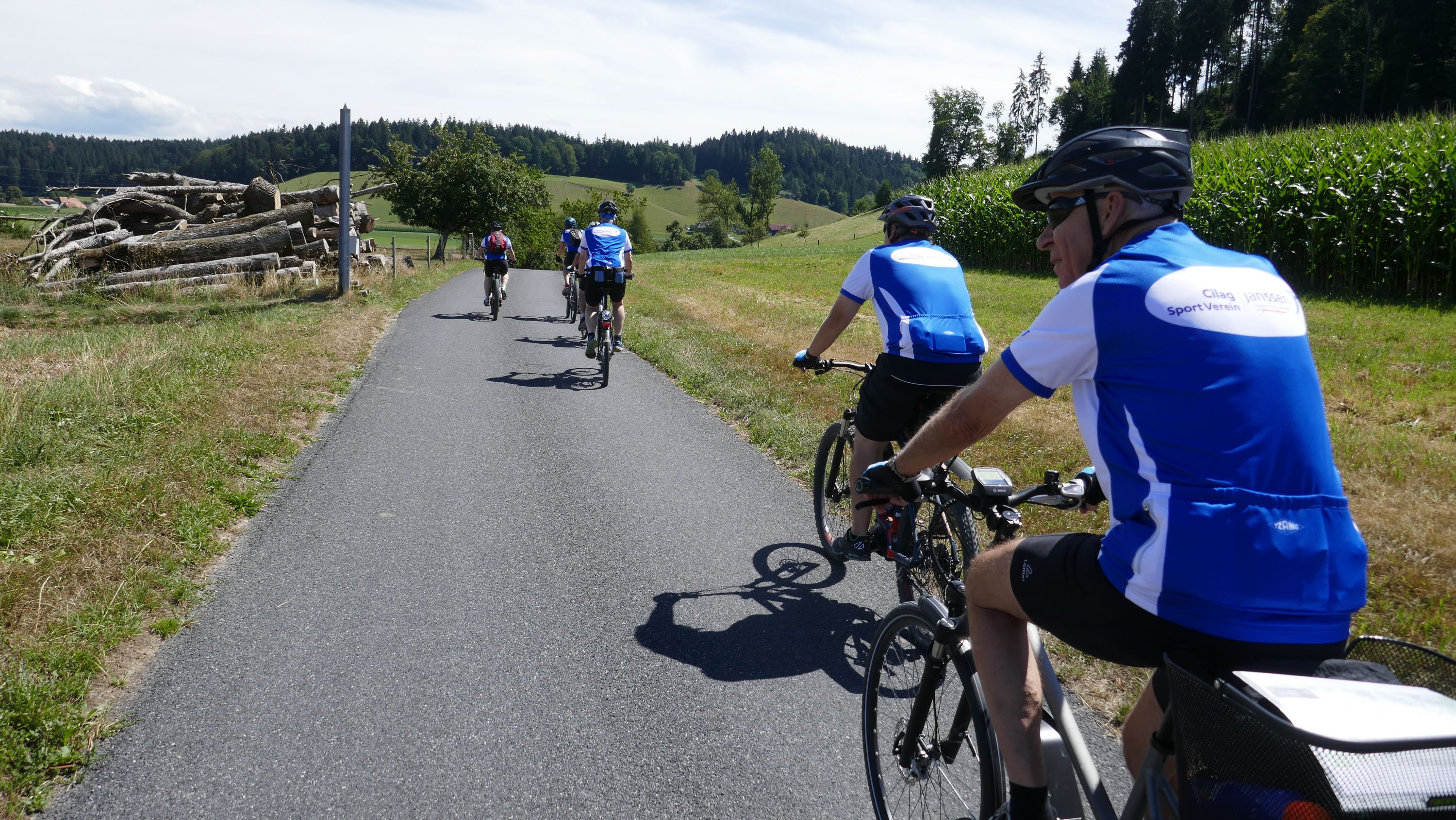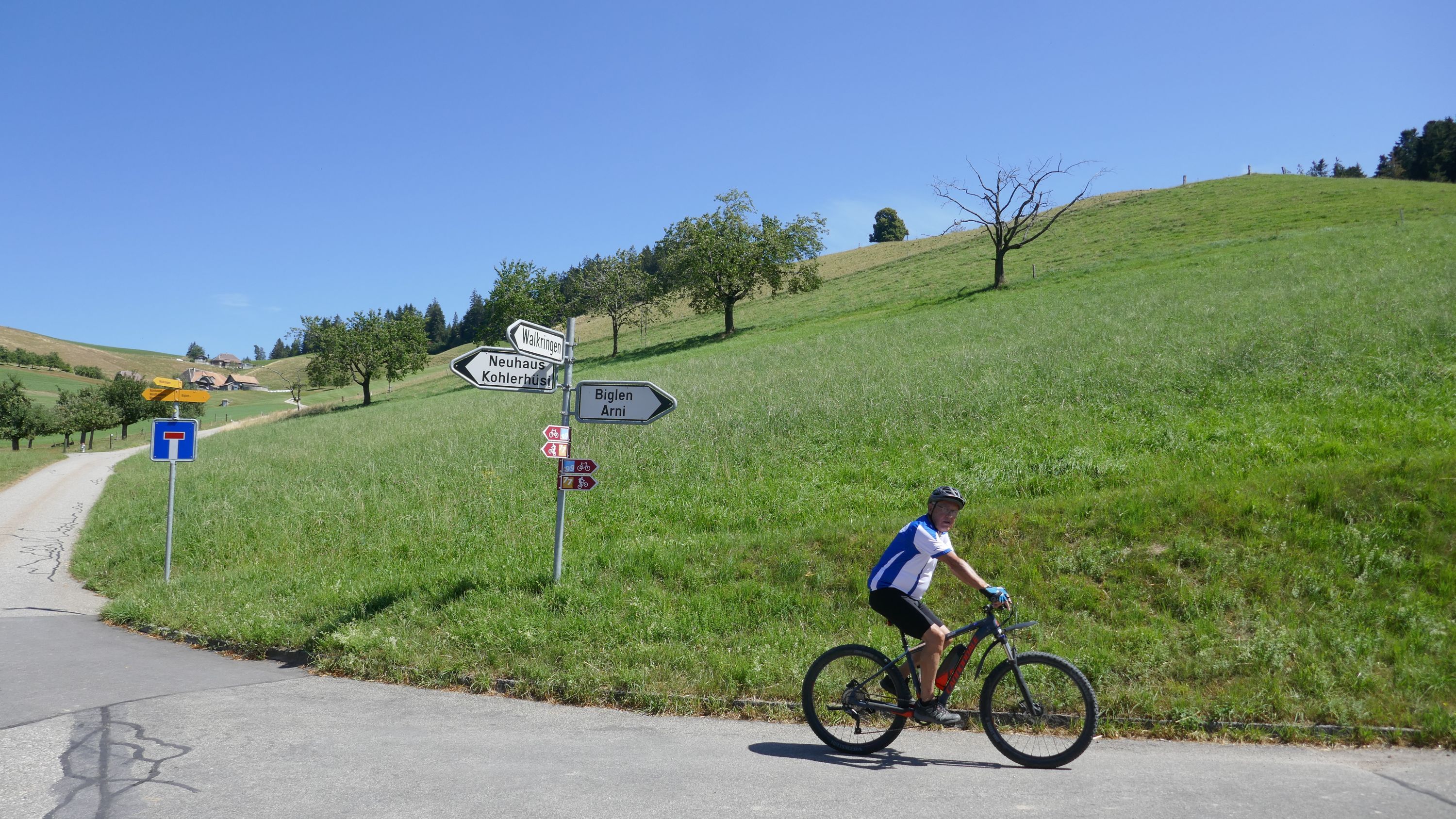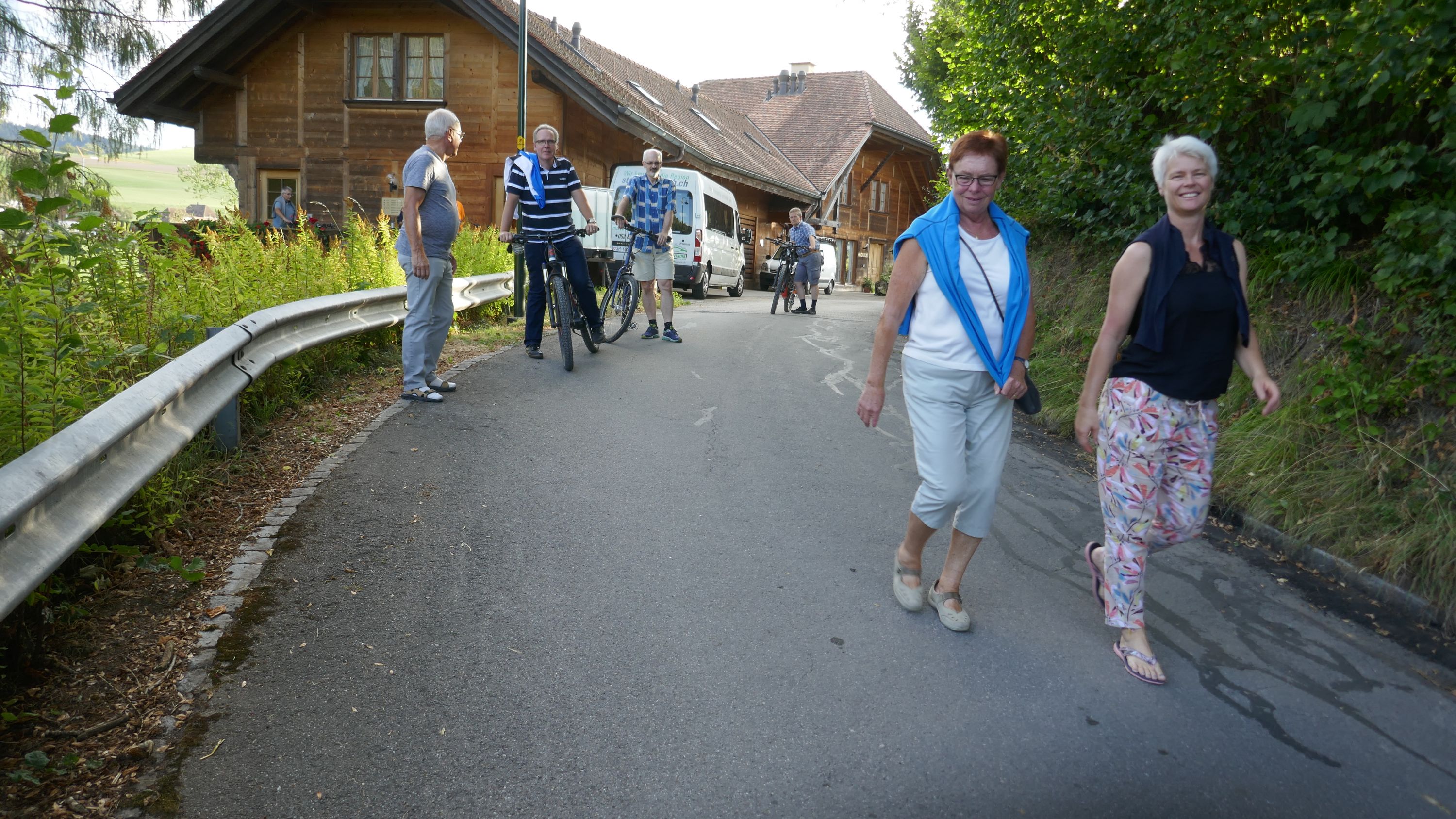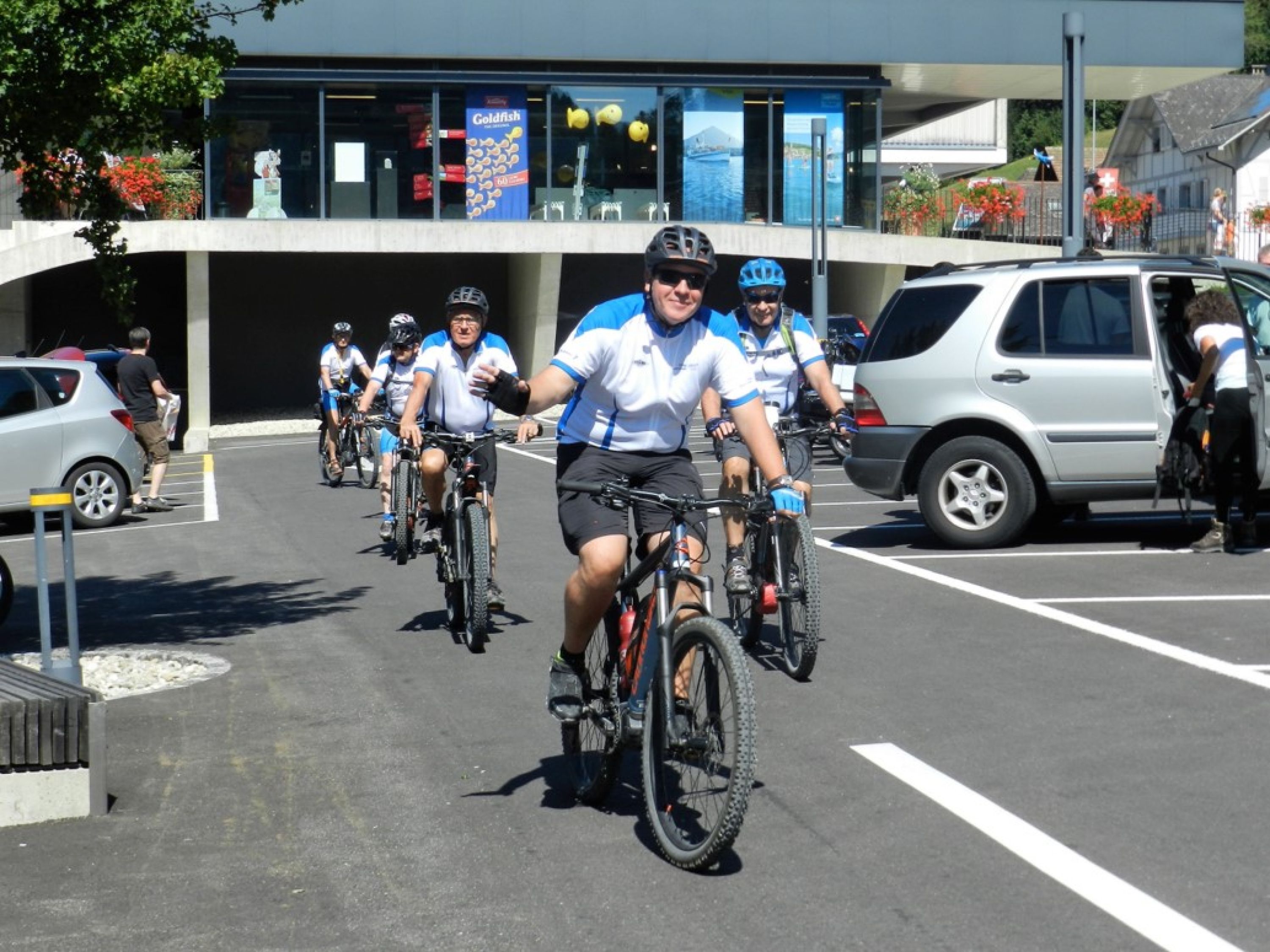 Am Samstagmorgen um 07:30 starteten wir mit dem Kleinbus mit Anhänger, gelenkt von Peter Frigerio, zum Ausgangspunkt unserer Velotour. Beim Sportzentrum in Huttwil warteten unser Guide Stefan und seine Frau Angelika bereits auf uns. Nach einer kurzen Information zur ersten Tagesetappe, verteilte Peter Bananen und Powerriegel bevor es los ging. Die Strecke war sportlich anspruchsvoll und hatte viele Steigungen. Entschädigt wurden wir dafür immer wieder mit traumhaften Aussichten. Bei der ersten Pause im Garten der Emmentaler Schaukäserei in Affoltern i. E. konnten wir uns von den ersten Anstrengungen ausruhen. Kurze Zeit später, jedoch erst nach einem steilen Anstieg mit Velo oder zu Fuss auf die Lueg - einem Aussichtspunkt oberhalb Affoltern i.E. - hatten wir eine prächtige Sicht ins Berner Mittelland und gegenüber ins Emmental und Richtung Berner Alpen. Stefan hatte für die ganz Wilden immer noch eine «Challenge» anzubieten. So auch von der Lueg zum Parkplatz, wo Peter auf uns wartete. Allerdings war diese Abfahrt so stotzig, dass wir aus Vernunft teilweise zu Fuss gingen und nicht schon zu Beginn der Tour einen unnötigen Sturz provozieren wollten.