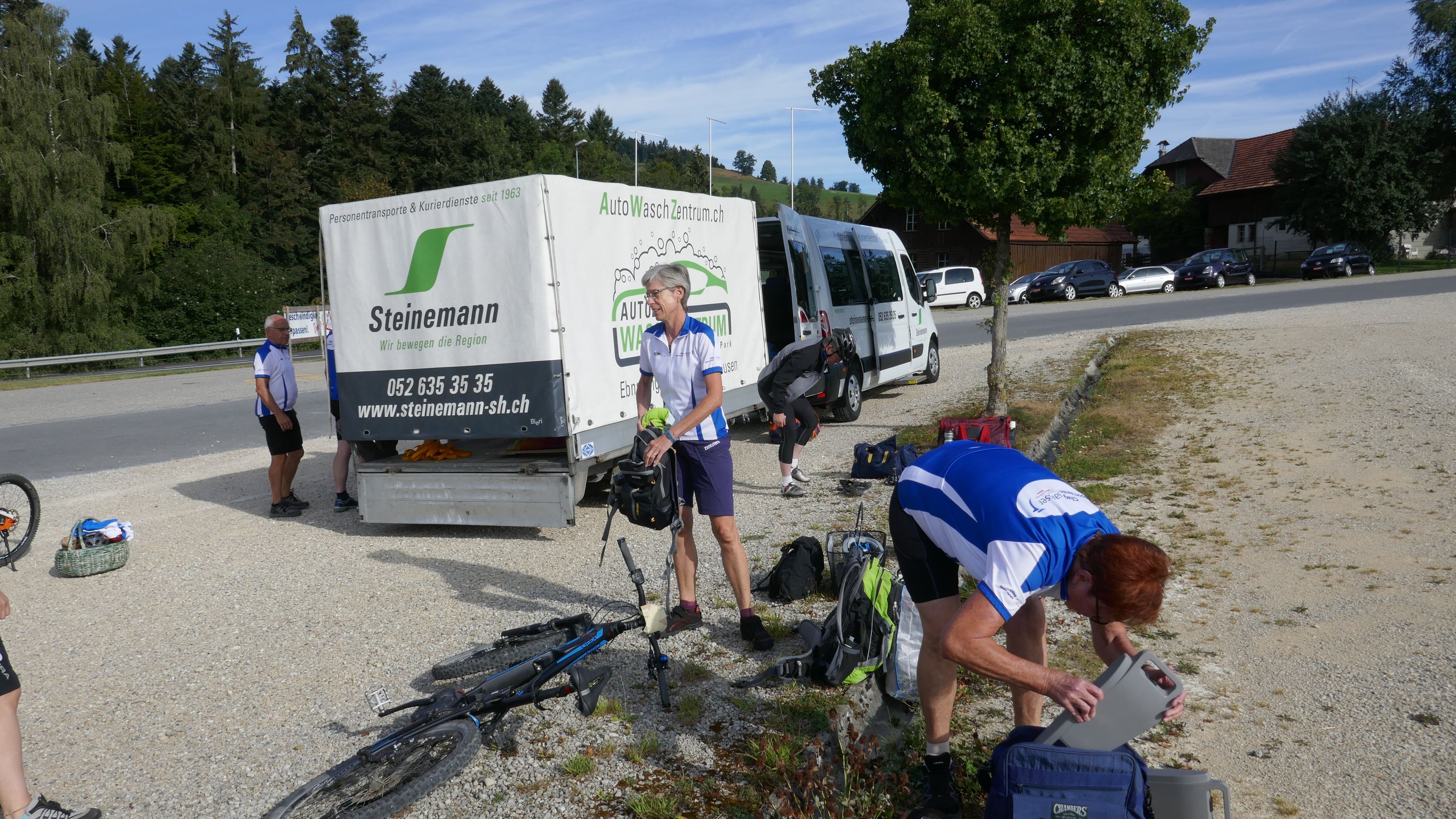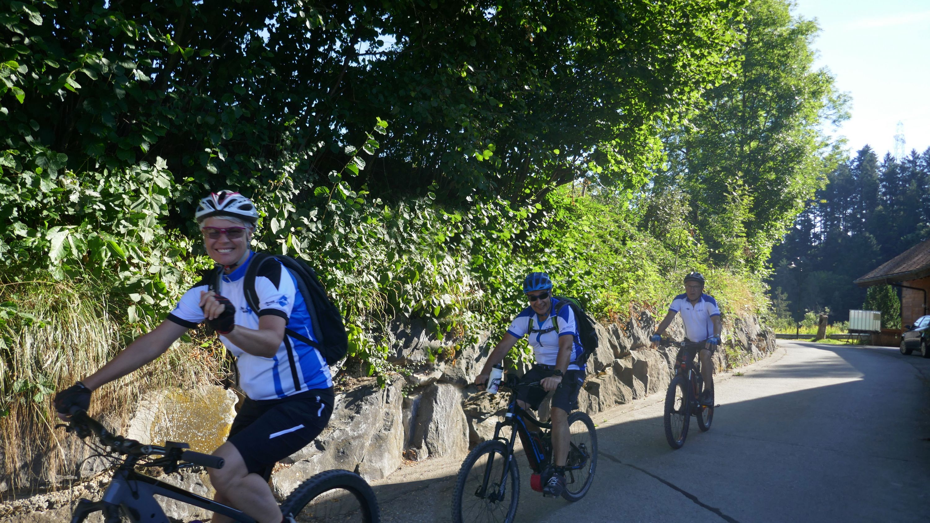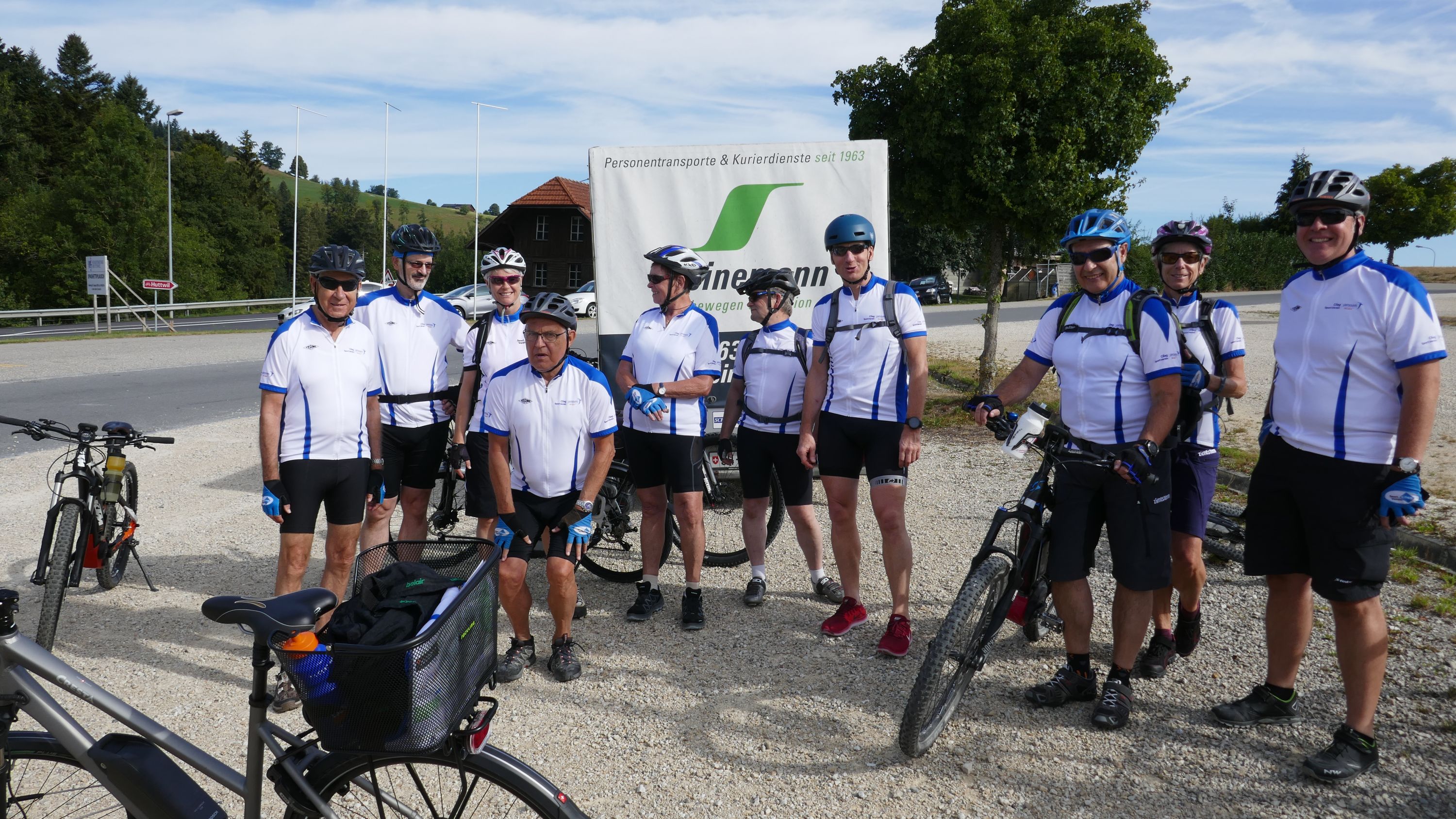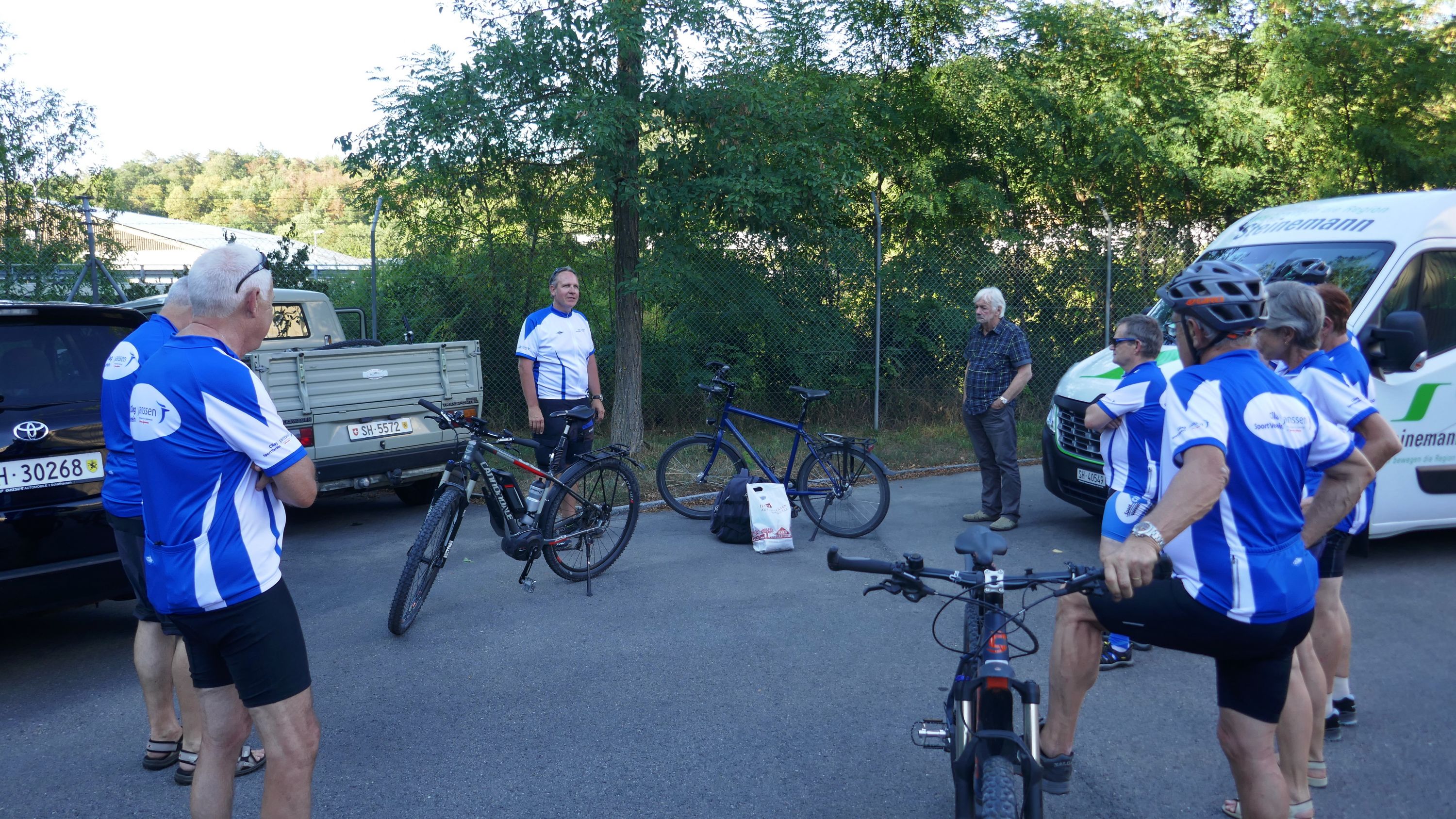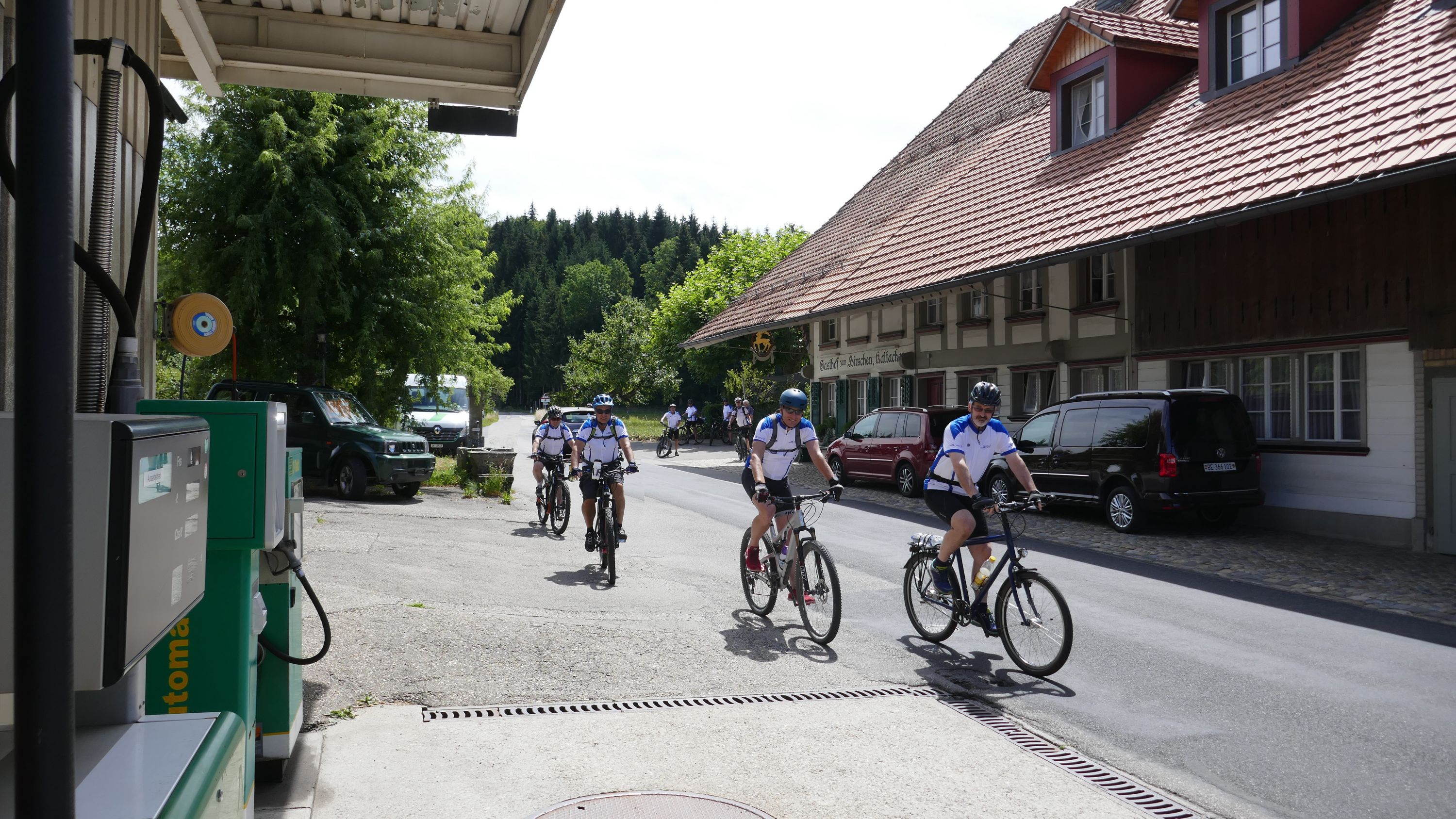 Am Samstagmorgen um 07:30 starteten wir mit dem Kleinbus mit Anhänger, gelenkt von Peter Frigerio, zum Ausgangspunkt unserer Velotour. Beim Sportzentrum in Huttwil warteten unser Guide Stefan und seine Frau Angelika bereits auf uns. Nach einer kurzen Information zur ersten Tagesetappe, verteilte Peter Bananen und Powerriegel bevor es los ging. Die Strecke war sportlich anspruchsvoll und hatte viele Steigungen. Entschädigt wurden wir dafür immer wieder mit traumhaften Aussichten. Bei der ersten Pause im Garten der Emmentaler Schaukäserei in Affoltern i. E. konnten wir uns von den ersten Anstrengungen ausruhen. Kurze Zeit später, jedoch erst nach einem steilen Anstieg mit Velo oder zu Fuss auf die Lueg - einem Aussichtspunkt oberhalb Affoltern i.E. - hatten wir eine prächtige Sicht ins Berner Mittelland und gegenüber ins Emmental und Richtung Berner Alpen. Stefan hatte für die ganz Wilden immer noch eine «Challenge» anzubieten. So auch von der Lueg zum Parkplatz, wo Peter auf uns wartete. Allerdings war diese Abfahrt so stotzig, dass wir aus Vernunft teilweise zu Fuss gingen und nicht schon zu Beginn der Tour einen unnötigen Sturz provozieren wollten.