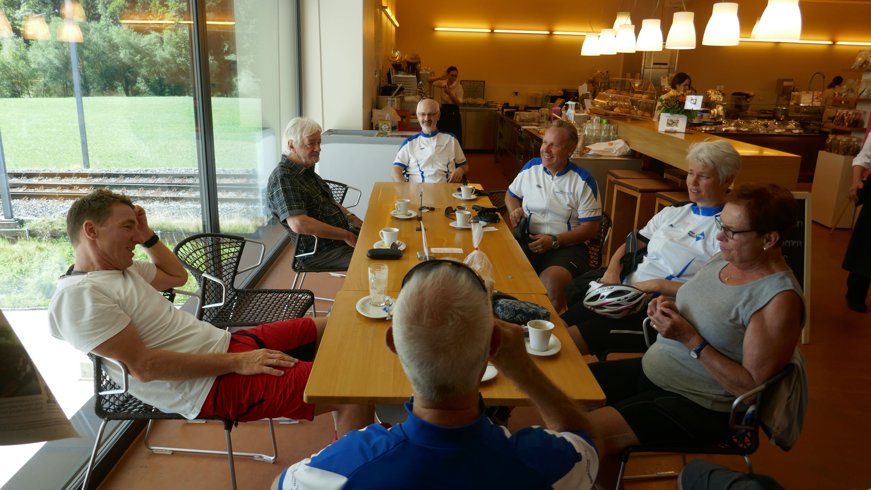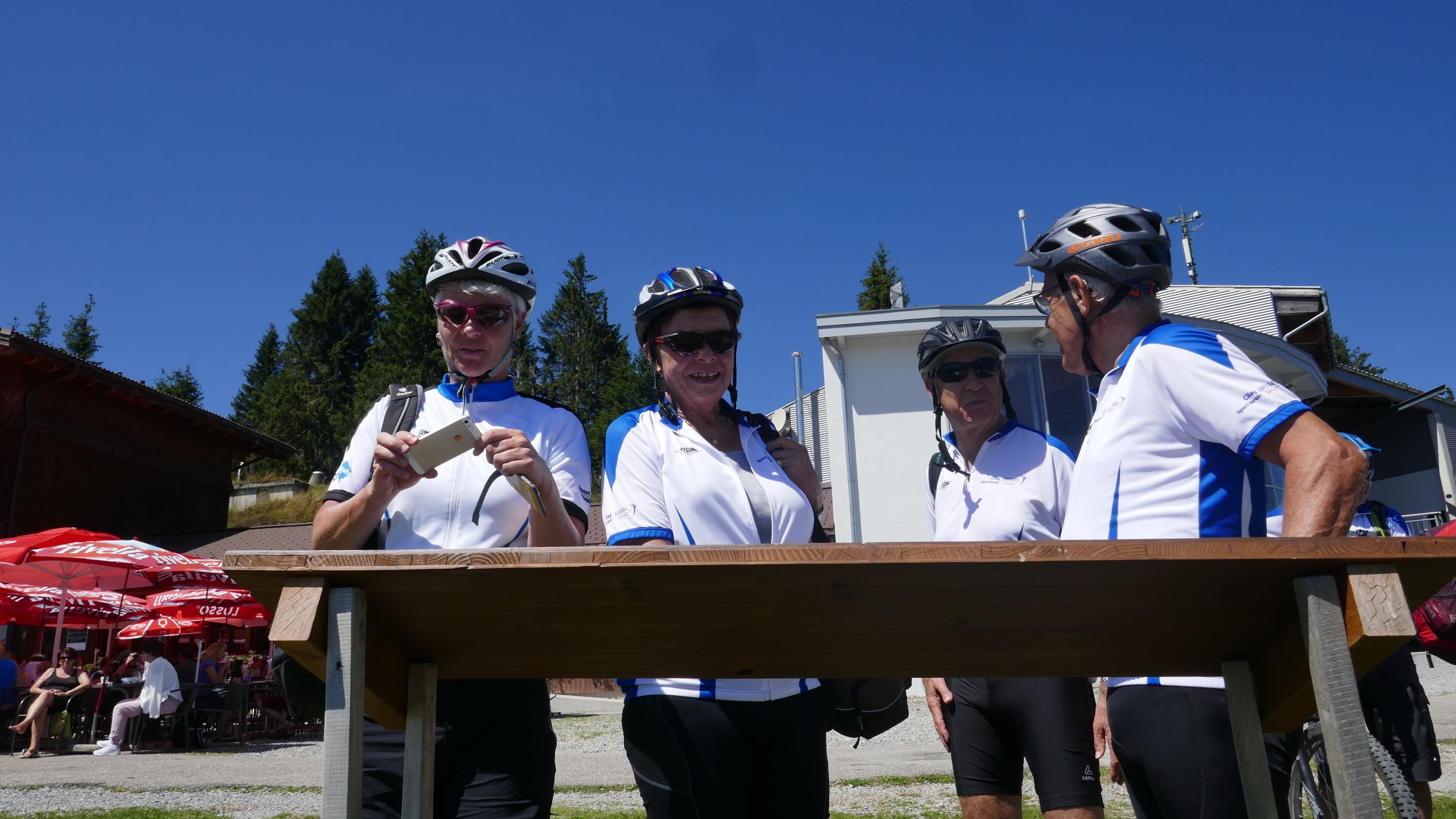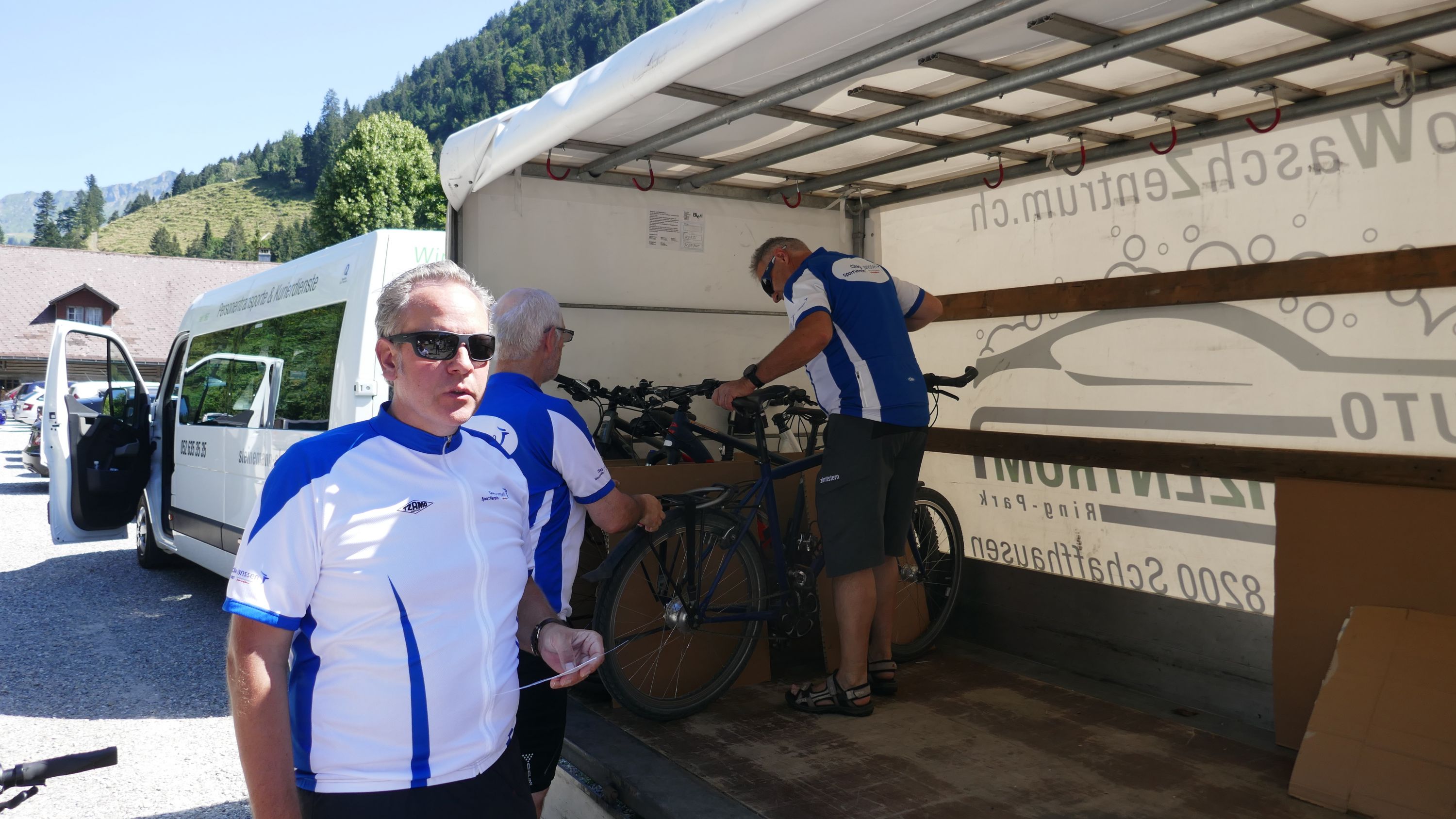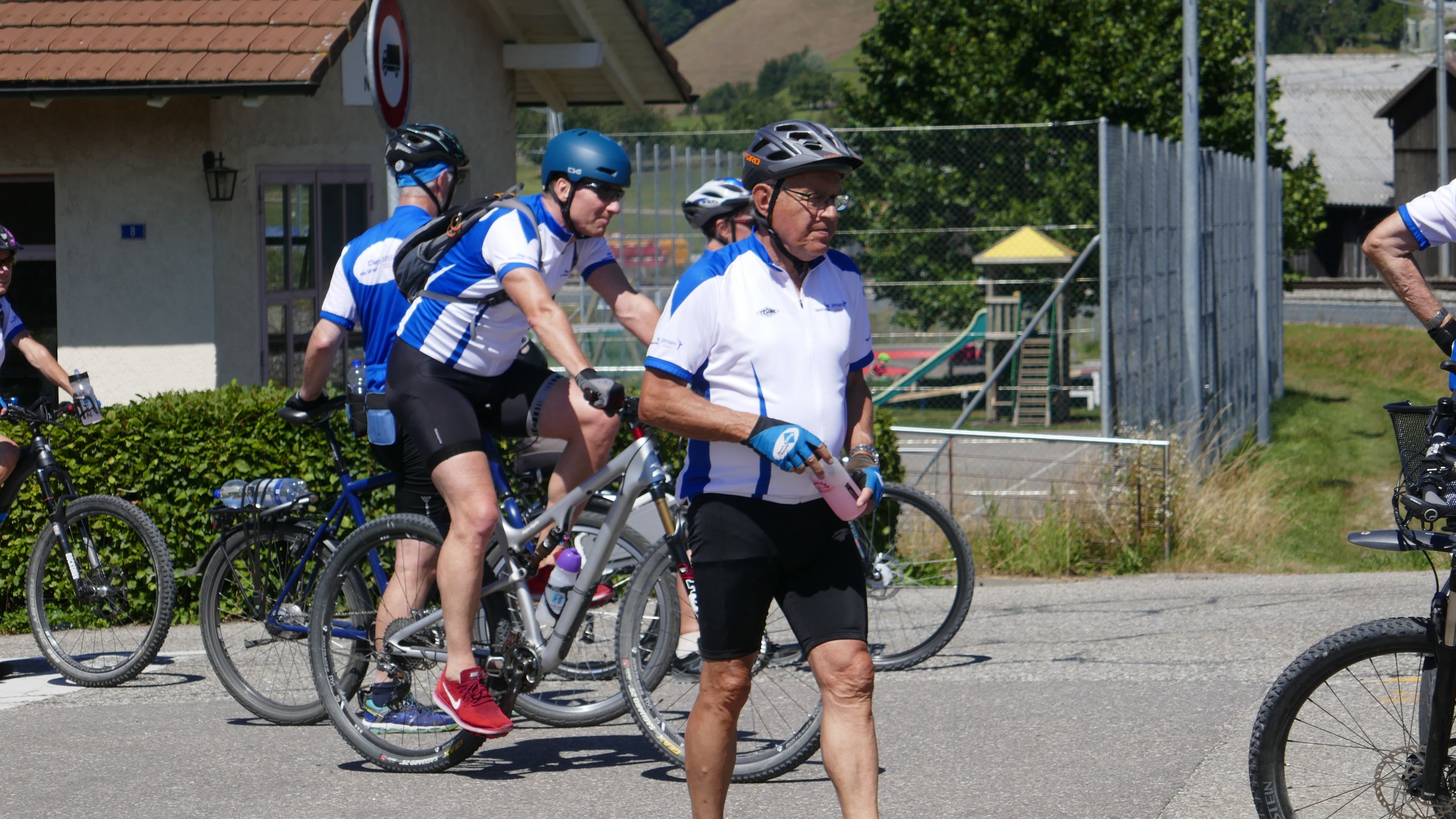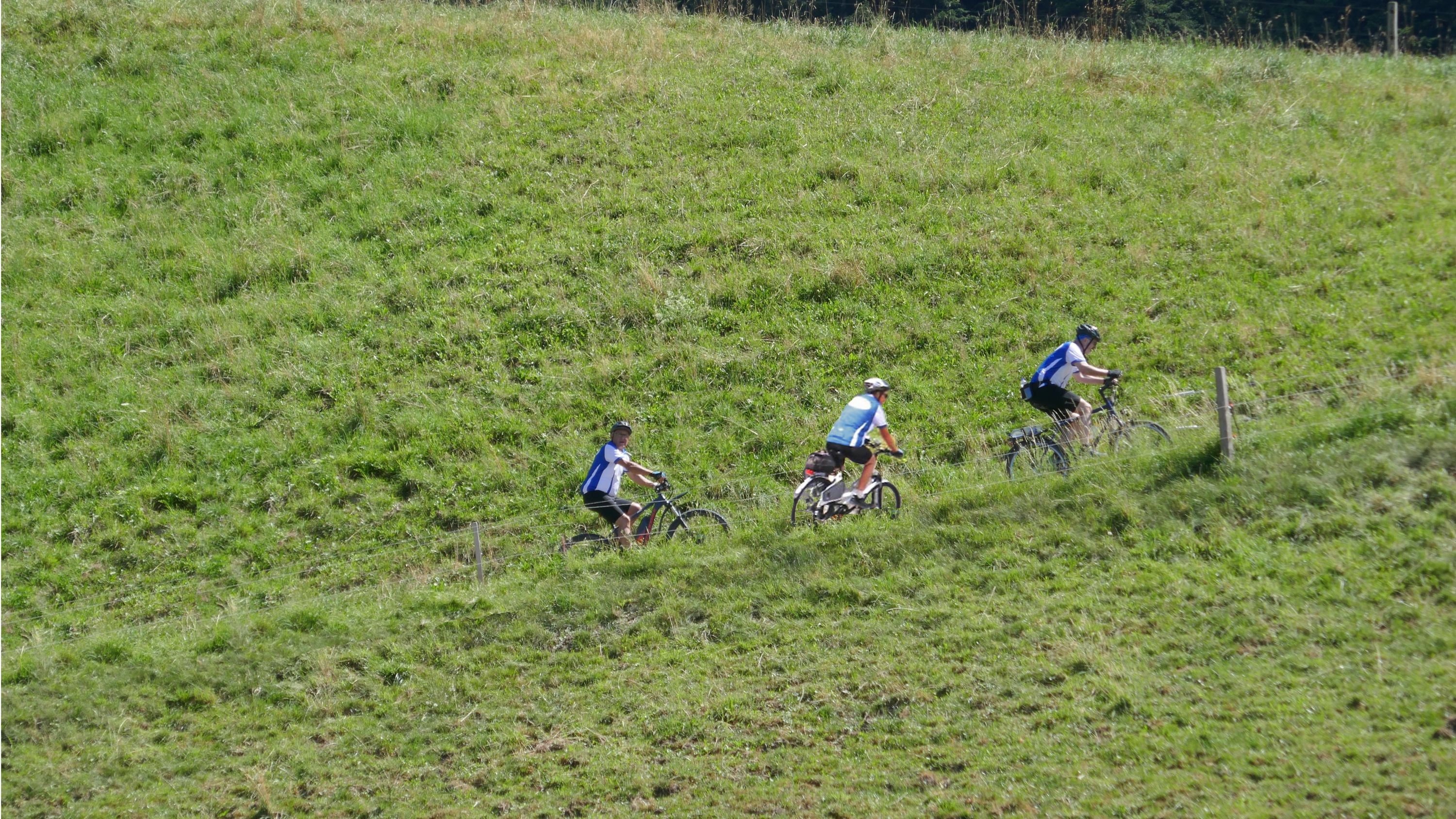 Am Samstagmorgen um 07:30 starteten wir mit dem Kleinbus mit Anhänger, gelenkt von Peter Frigerio, zum Ausgangspunkt unserer Velotour. Beim Sportzentrum in Huttwil warteten unser Guide Stefan und seine Frau Angelika bereits auf uns. Nach einer kurzen Information zur ersten Tagesetappe, verteilte Peter Bananen und Powerriegel bevor es los ging. Die Strecke war sportlich anspruchsvoll und hatte viele Steigungen. Entschädigt wurden wir dafür immer wieder mit traumhaften Aussichten. Bei der ersten Pause im Garten der Emmentaler Schaukäserei in Affoltern i. E. konnten wir uns von den ersten Anstrengungen ausruhen. Kurze Zeit später, jedoch erst nach einem steilen Anstieg mit Velo oder zu Fuss auf die Lueg - einem Aussichtspunkt oberhalb Affoltern i.E. - hatten wir eine prächtige Sicht ins Berner Mittelland und gegenüber ins Emmental und Richtung Berner Alpen. Stefan hatte für die ganz Wilden immer noch eine «Challenge» anzubieten. So auch von der Lueg zum Parkplatz, wo Peter auf uns wartete. Allerdings war diese Abfahrt so stotzig, dass wir aus Vernunft teilweise zu Fuss gingen und nicht schon zu Beginn der Tour einen unnötigen Sturz provozieren wollten.