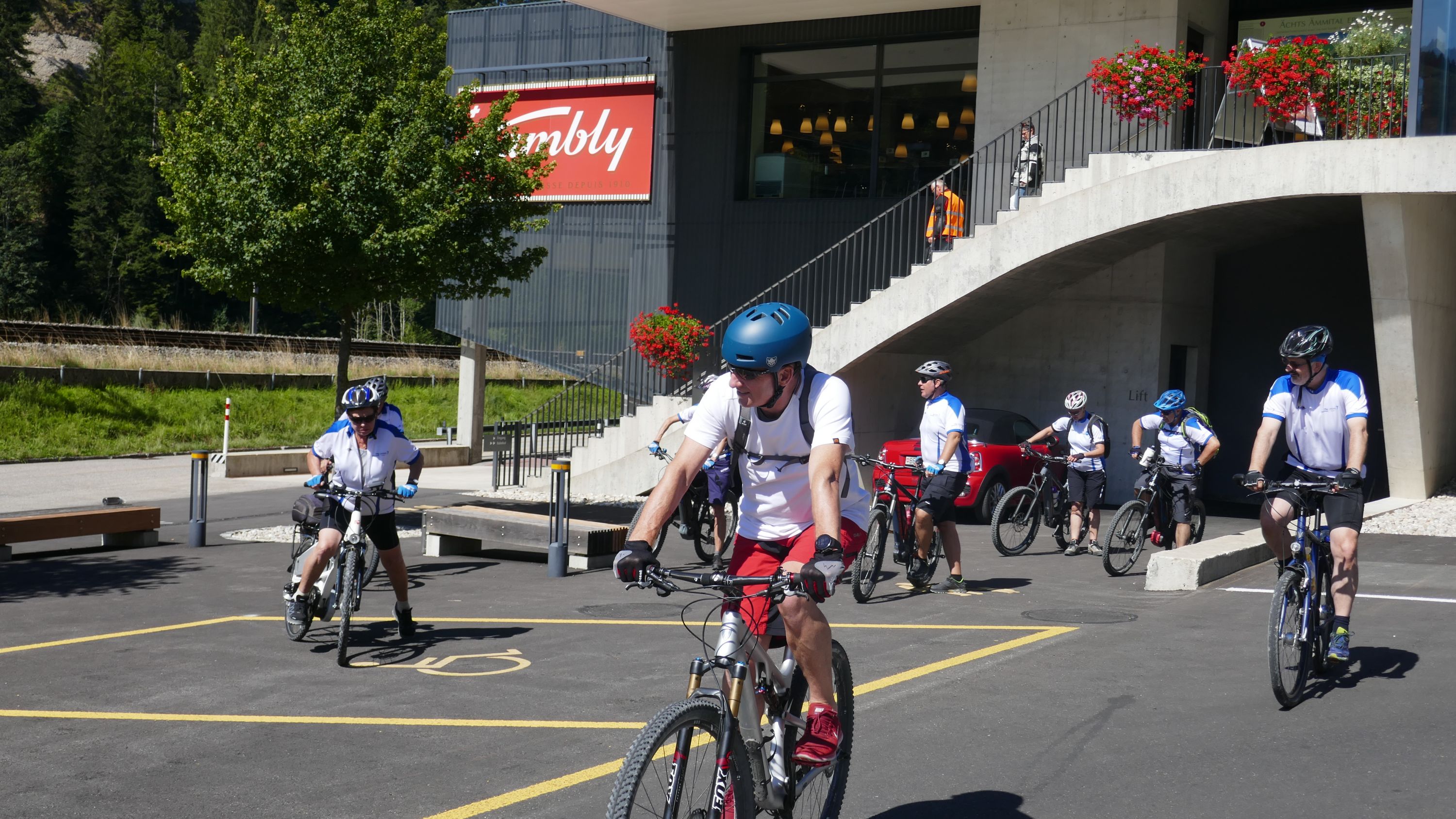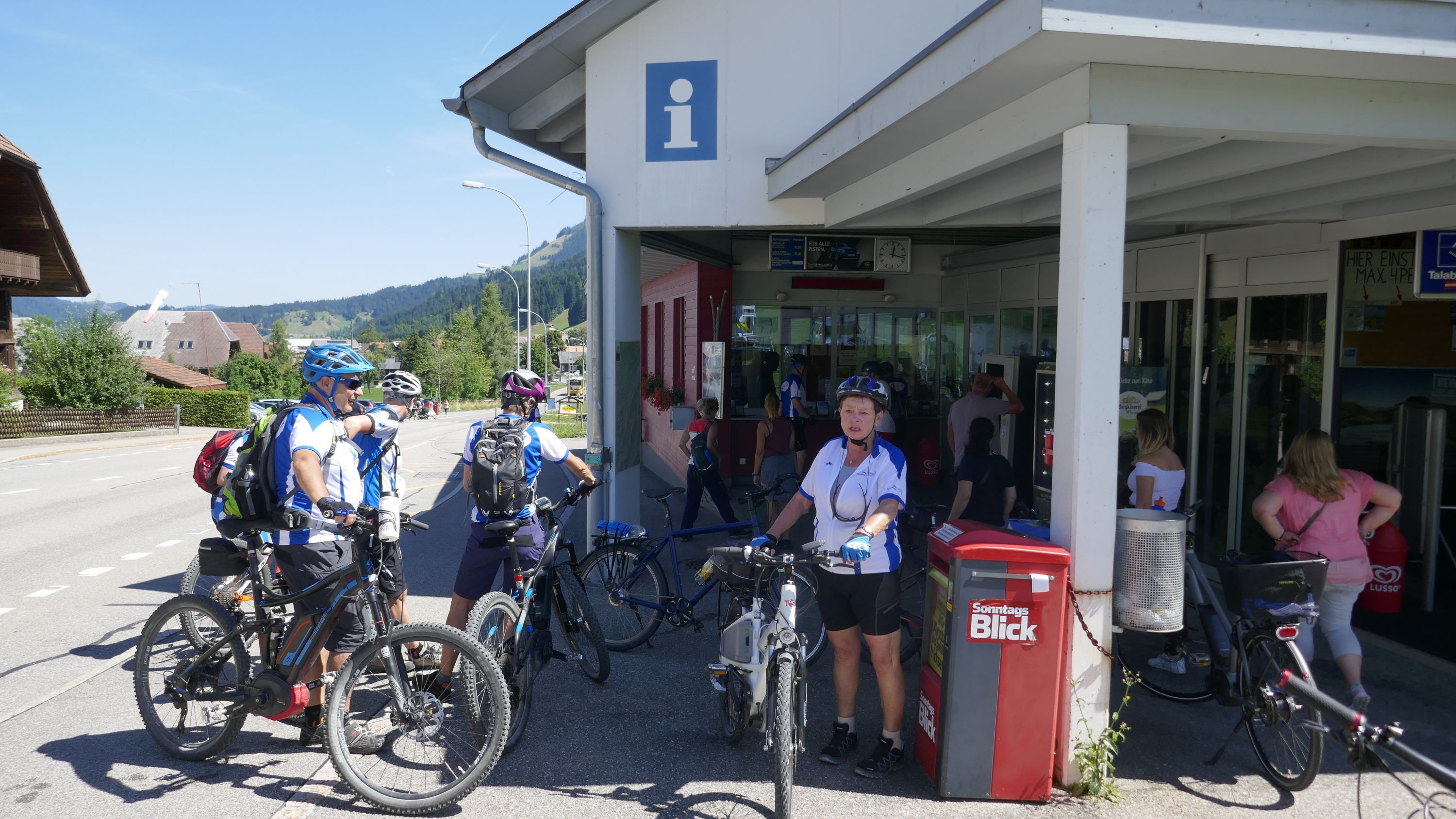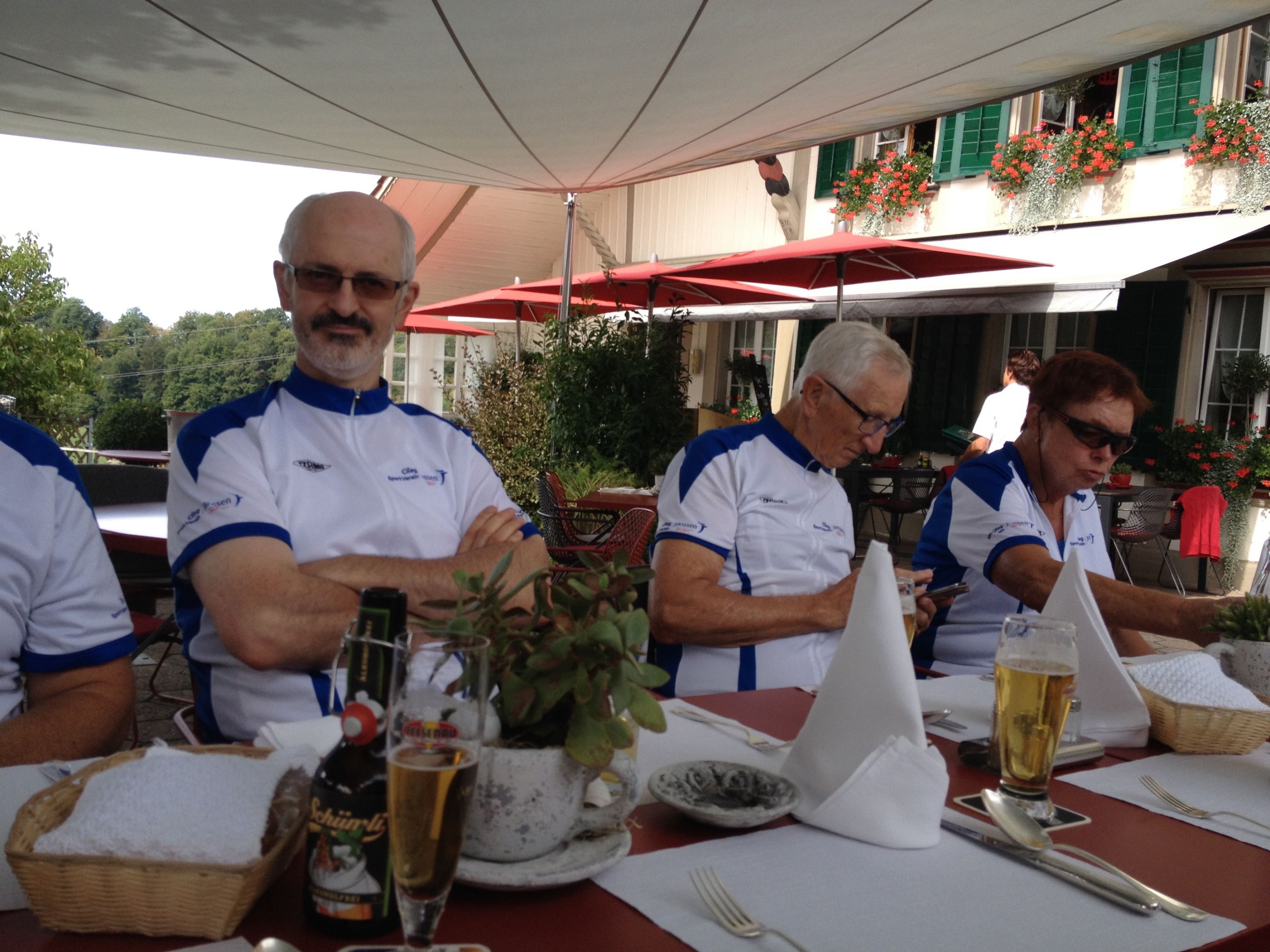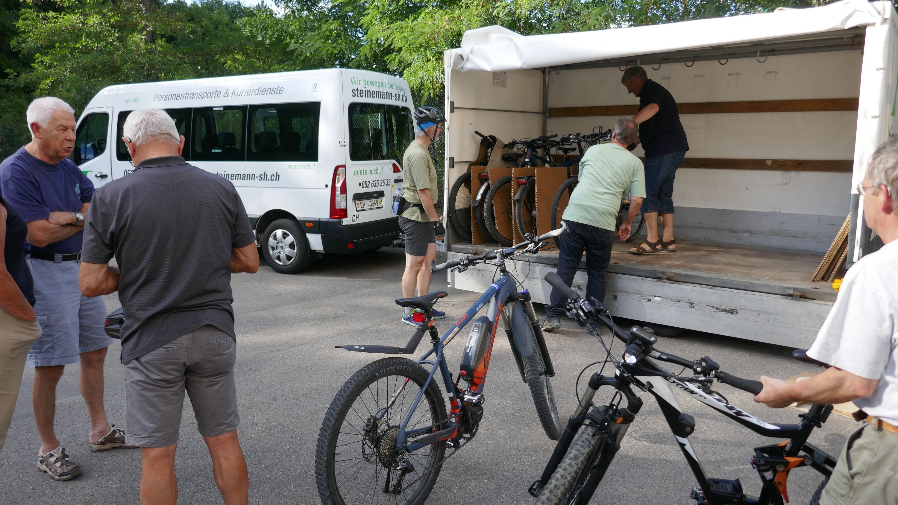 Am Samstagmorgen um 07:30 starteten wir mit dem Kleinbus mit Anhänger, gelenkt von Peter Frigerio, zum Ausgangspunkt unserer Velotour. Beim Sportzentrum in Huttwil warteten unser Guide Stefan und seine Frau Angelika bereits auf uns. Nach einer kurzen Information zur ersten Tagesetappe, verteilte Peter Bananen und Powerriegel bevor es los ging. Die Strecke war sportlich anspruchsvoll und hatte viele Steigungen. Entschädigt wurden wir dafür immer wieder mit traumhaften Aussichten. Bei der ersten Pause im Garten der Emmentaler Schaukäserei in Affoltern i. E. konnten wir uns von den ersten Anstrengungen ausruhen. Kurze Zeit später, jedoch erst nach einem steilen Anstieg mit Velo oder zu Fuss auf die Lueg - einem Aussichtspunkt oberhalb Affoltern i.E. - hatten wir eine prächtige Sicht ins Berner Mittelland und gegenüber ins Emmental und Richtung Berner Alpen. Stefan hatte für die ganz Wilden immer noch eine «Challenge» anzubieten. So auch von der Lueg zum Parkplatz, wo Peter auf uns wartete. Allerdings war diese Abfahrt so stotzig, dass wir aus Vernunft teilweise zu Fuss gingen und nicht schon zu Beginn der Tour einen unnötigen Sturz provozieren wollten.