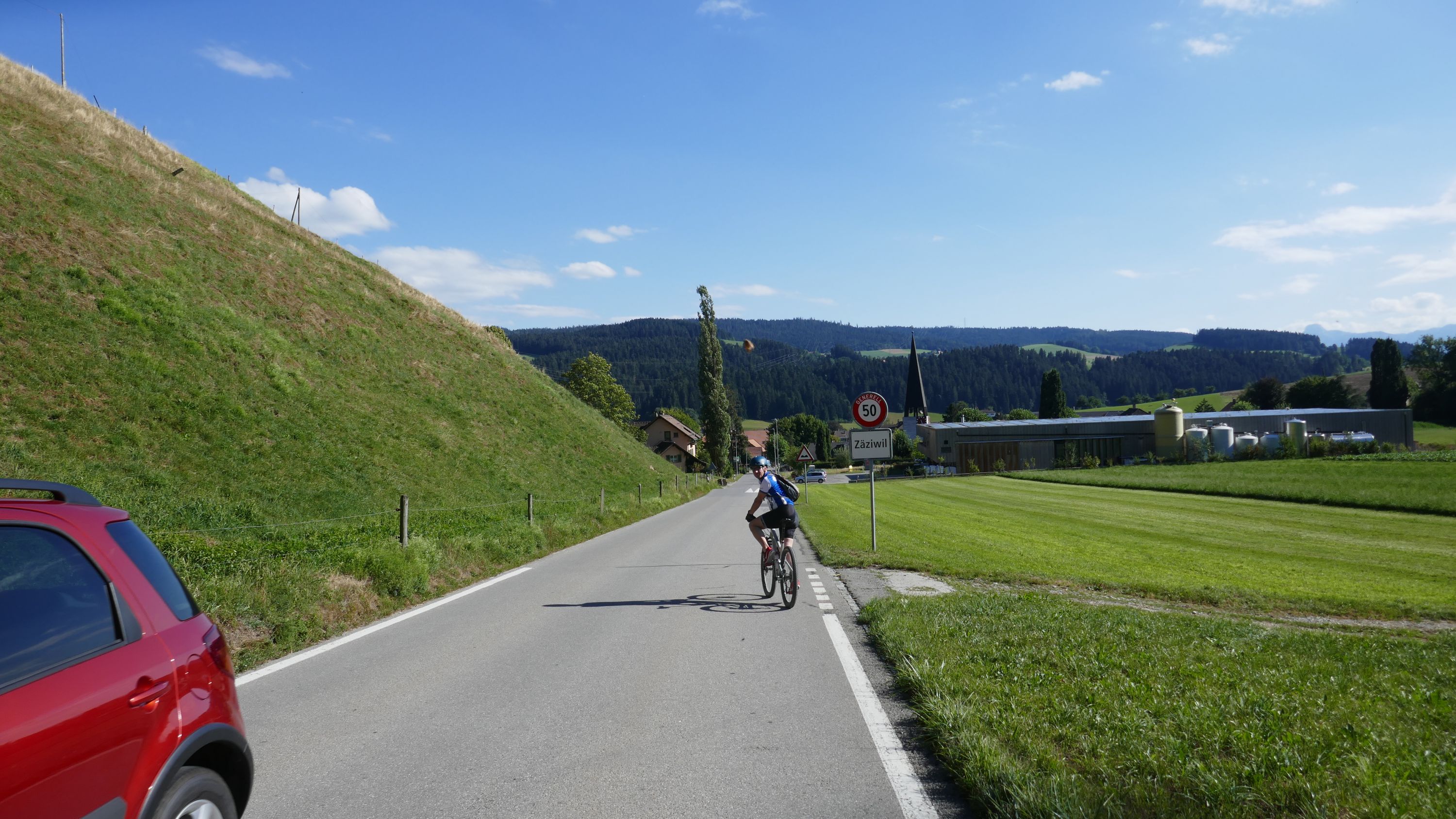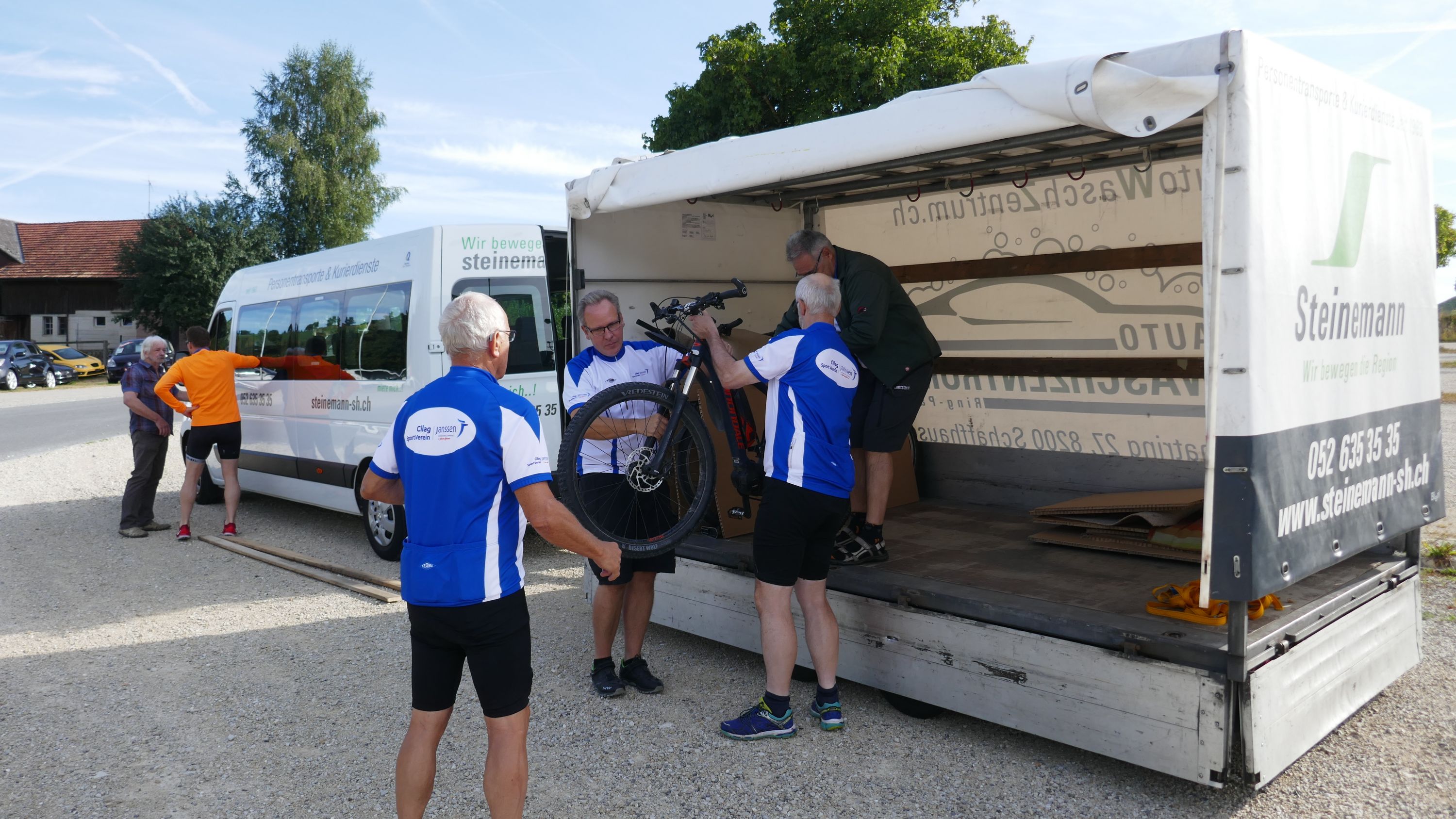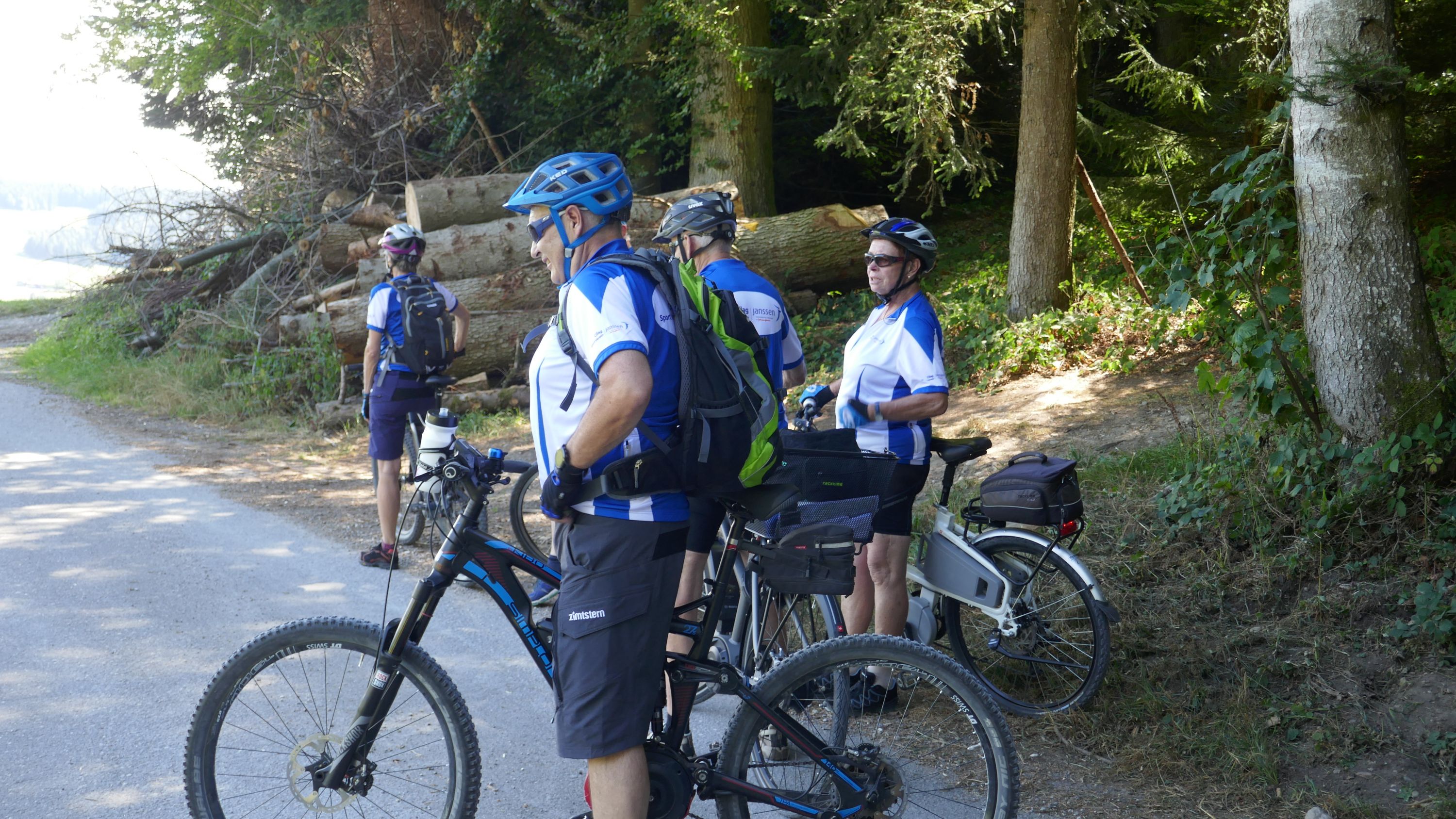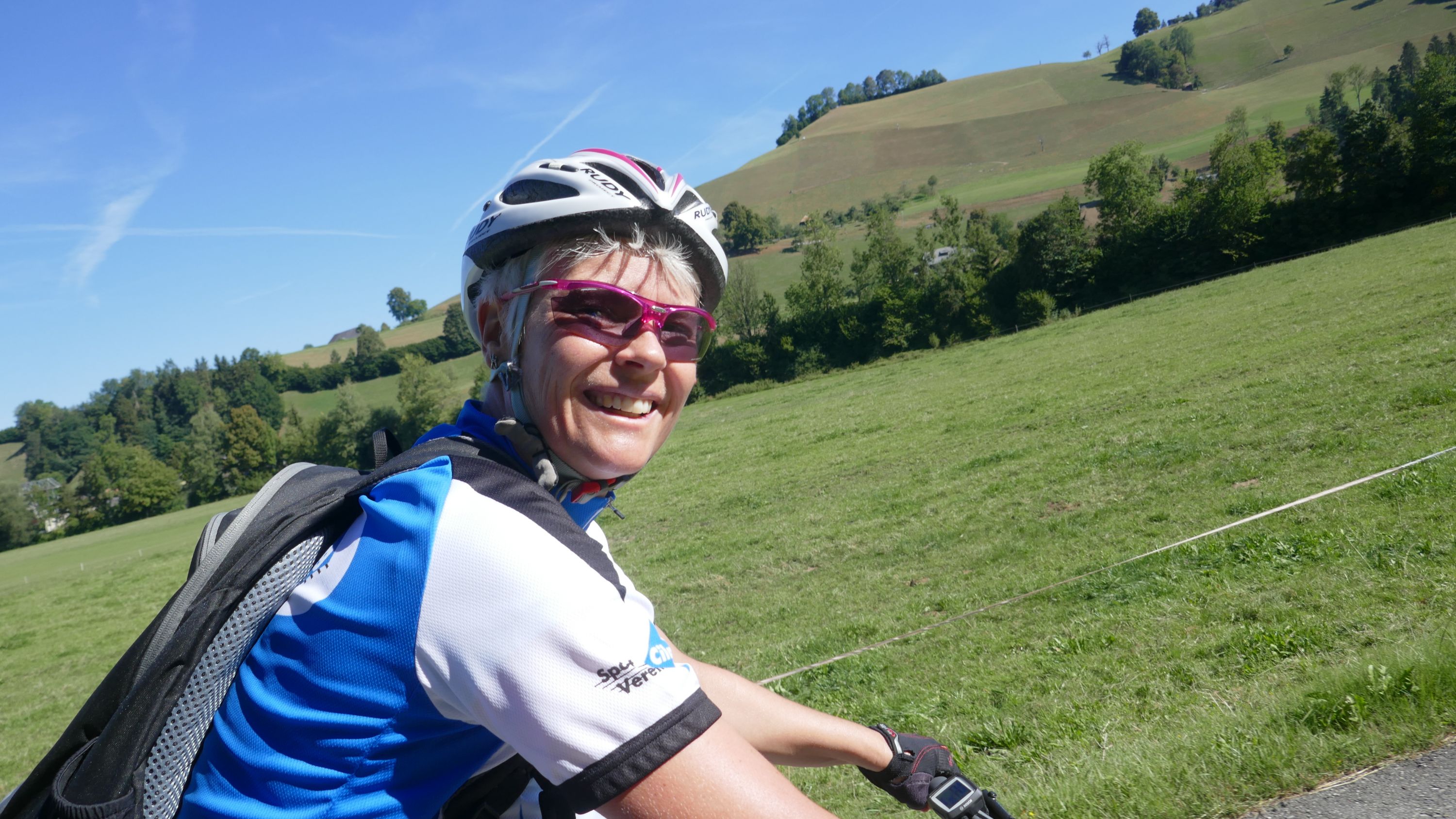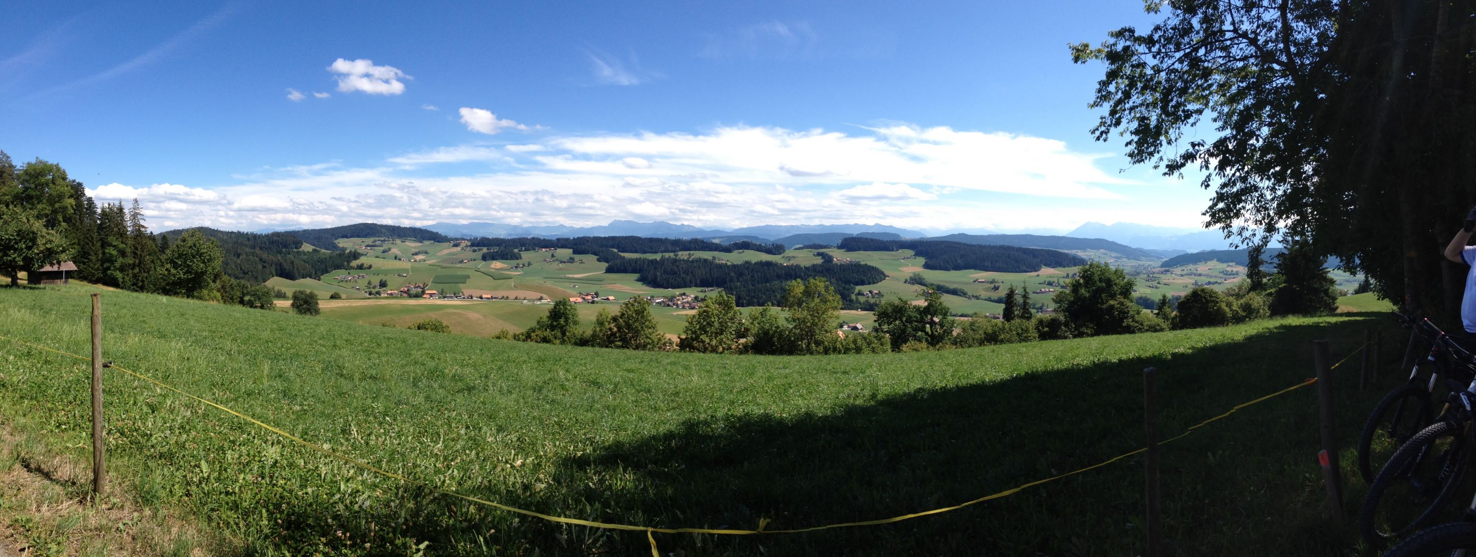 Am Samstagmorgen um 07:30 starteten wir mit dem Kleinbus mit Anhänger, gelenkt von Peter Frigerio, zum Ausgangspunkt unserer Velotour. Beim Sportzentrum in Huttwil warteten unser Guide Stefan und seine Frau Angelika bereits auf uns. Nach einer kurzen Information zur ersten Tagesetappe, verteilte Peter Bananen und Powerriegel bevor es los ging. Die Strecke war sportlich anspruchsvoll und hatte viele Steigungen. Entschädigt wurden wir dafür immer wieder mit traumhaften Aussichten. Bei der ersten Pause im Garten der Emmentaler Schaukäserei in Affoltern i. E. konnten wir uns von den ersten Anstrengungen ausruhen. Kurze Zeit später, jedoch erst nach einem steilen Anstieg mit Velo oder zu Fuss auf die Lueg - einem Aussichtspunkt oberhalb Affoltern i.E. - hatten wir eine prächtige Sicht ins Berner Mittelland und gegenüber ins Emmental und Richtung Berner Alpen. Stefan hatte für die ganz Wilden immer noch eine «Challenge» anzubieten. So auch von der Lueg zum Parkplatz, wo Peter auf uns wartete. Allerdings war diese Abfahrt so stotzig, dass wir aus Vernunft teilweise zu Fuss gingen und nicht schon zu Beginn der Tour einen unnötigen Sturz provozieren wollten.