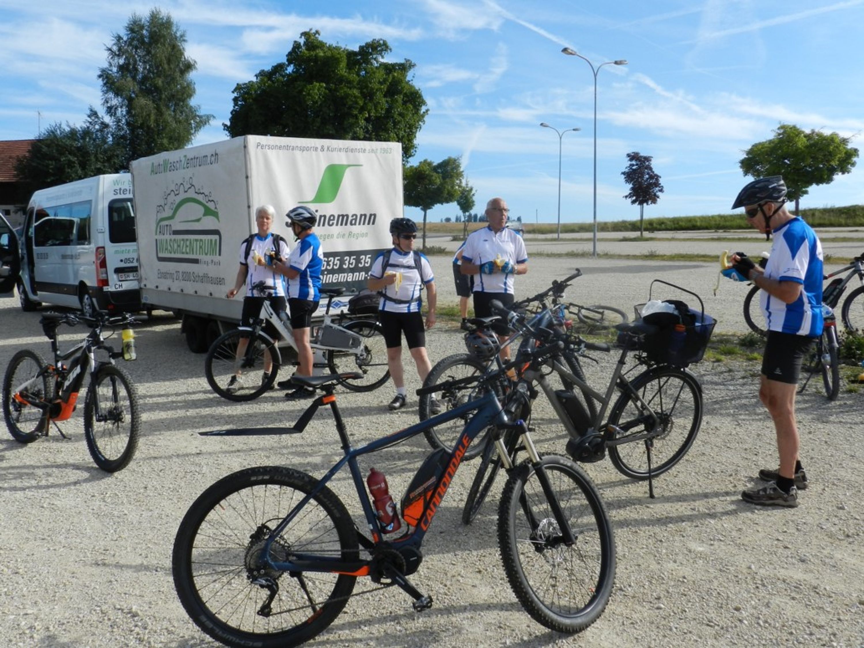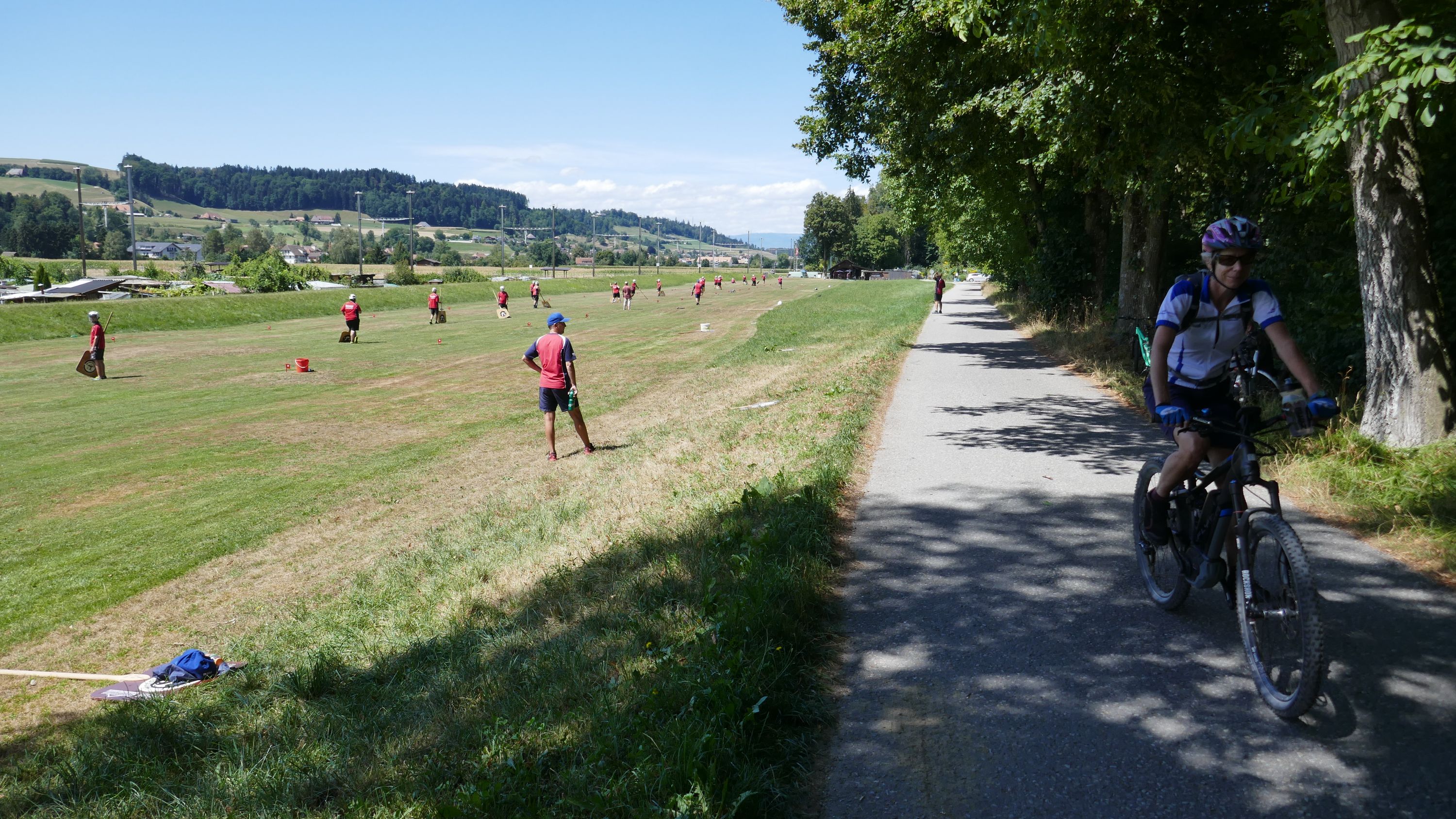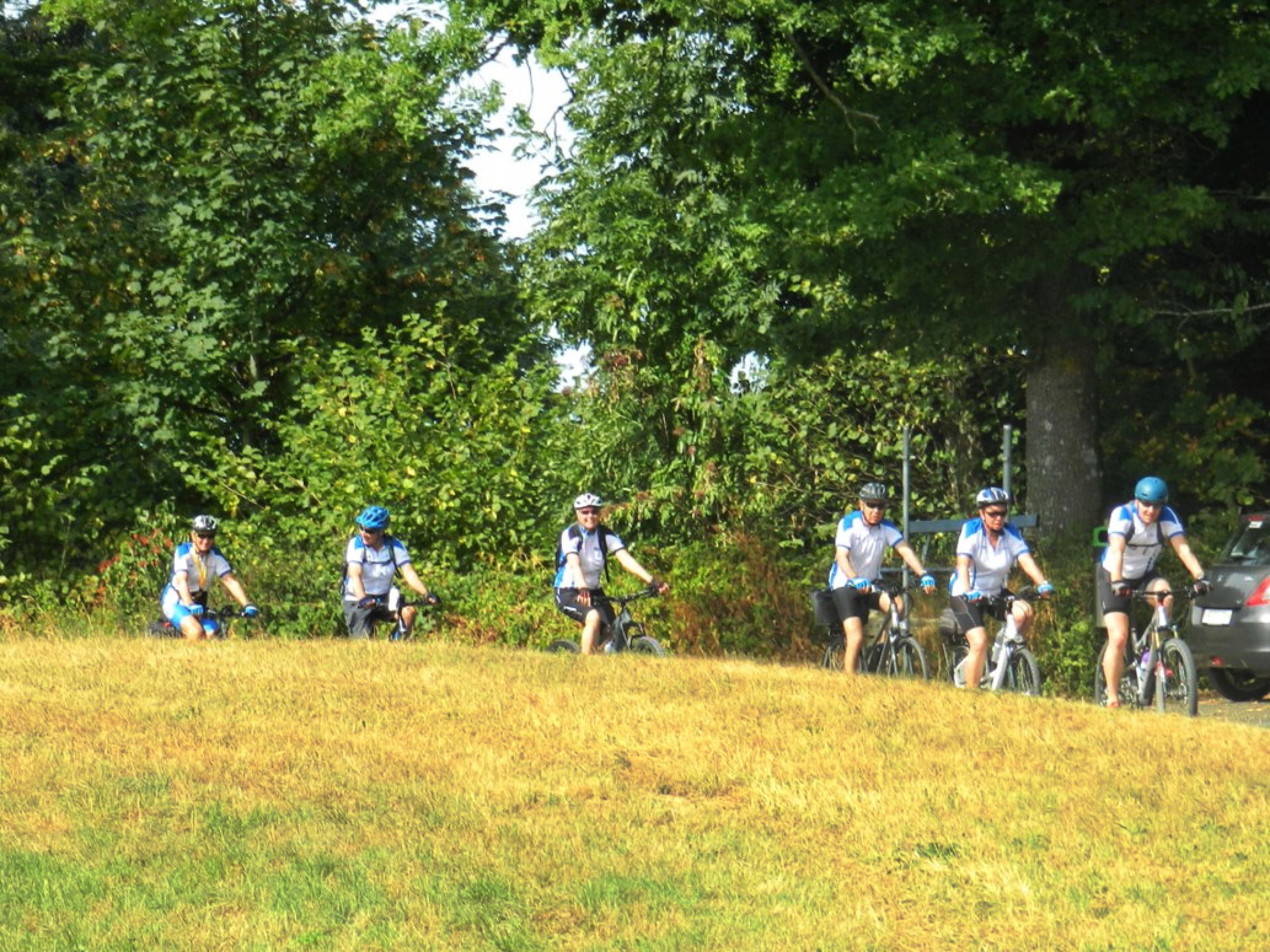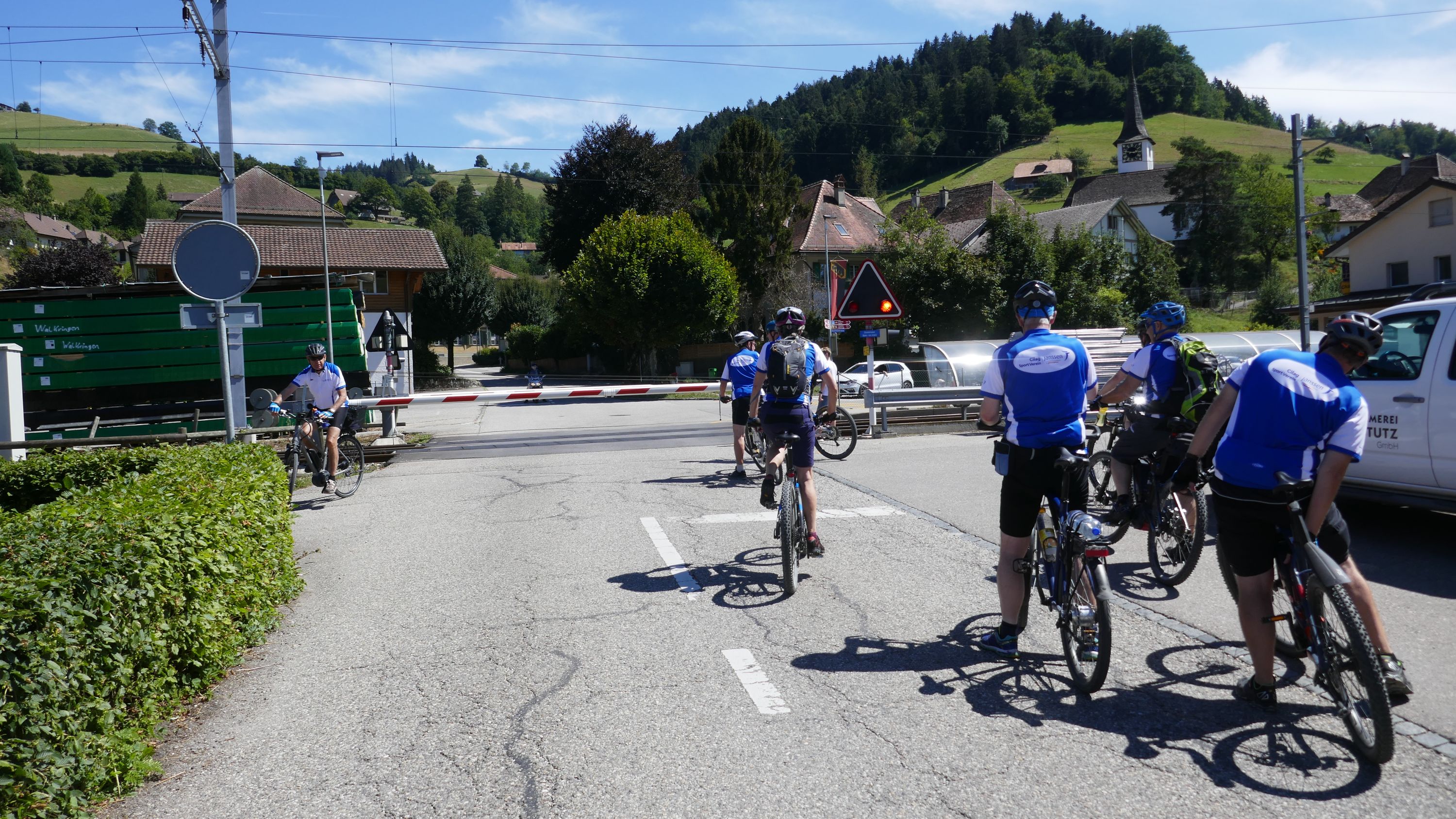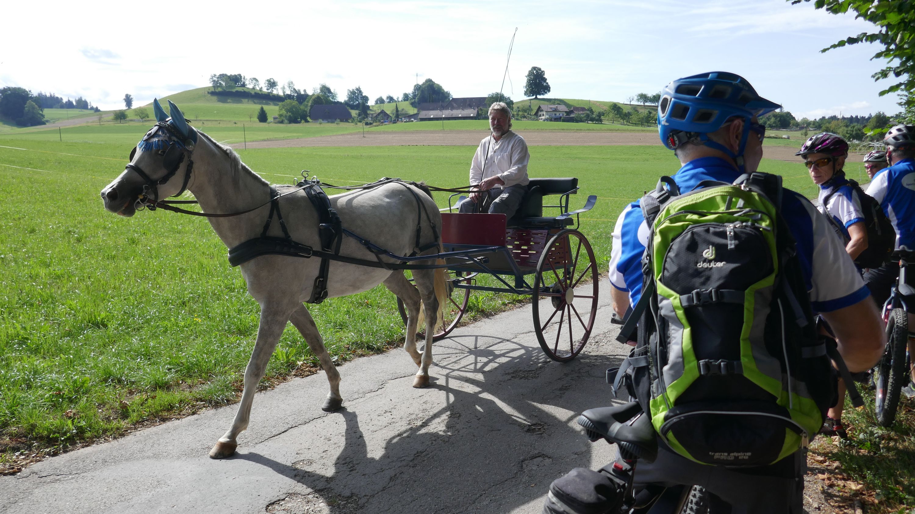 Am Samstagmorgen um 07:30 starteten wir mit dem Kleinbus mit Anhänger, gelenkt von Peter Frigerio, zum Ausgangspunkt unserer Velotour. Beim Sportzentrum in Huttwil warteten unser Guide Stefan und seine Frau Angelika bereits auf uns. Nach einer kurzen Information zur ersten Tagesetappe, verteilte Peter Bananen und Powerriegel bevor es los ging. Die Strecke war sportlich anspruchsvoll und hatte viele Steigungen. Entschädigt wurden wir dafür immer wieder mit traumhaften Aussichten. Bei der ersten Pause im Garten der Emmentaler Schaukäserei in Affoltern i. E. konnten wir uns von den ersten Anstrengungen ausruhen. Kurze Zeit später, jedoch erst nach einem steilen Anstieg mit Velo oder zu Fuss auf die Lueg - einem Aussichtspunkt oberhalb Affoltern i.E. - hatten wir eine prächtige Sicht ins Berner Mittelland und gegenüber ins Emmental und Richtung Berner Alpen. Stefan hatte für die ganz Wilden immer noch eine «Challenge» anzubieten. So auch von der Lueg zum Parkplatz, wo Peter auf uns wartete. Allerdings war diese Abfahrt so stotzig, dass wir aus Vernunft teilweise zu Fuss gingen und nicht schon zu Beginn der Tour einen unnötigen Sturz provozieren wollten.