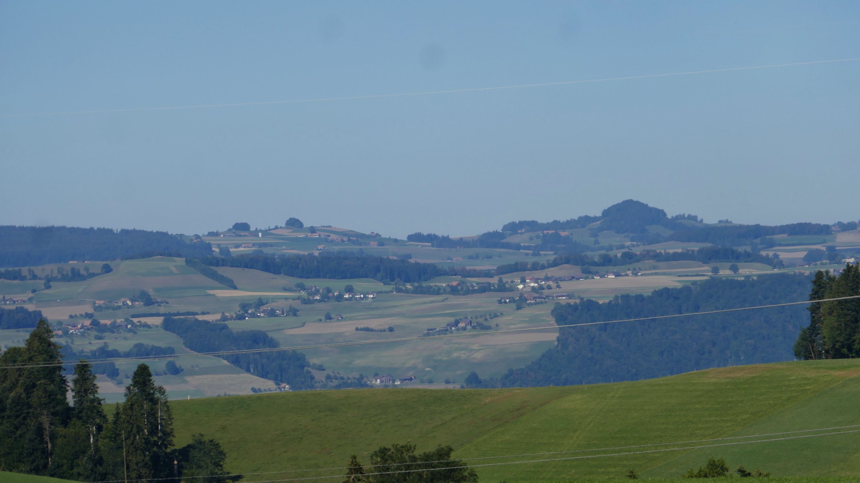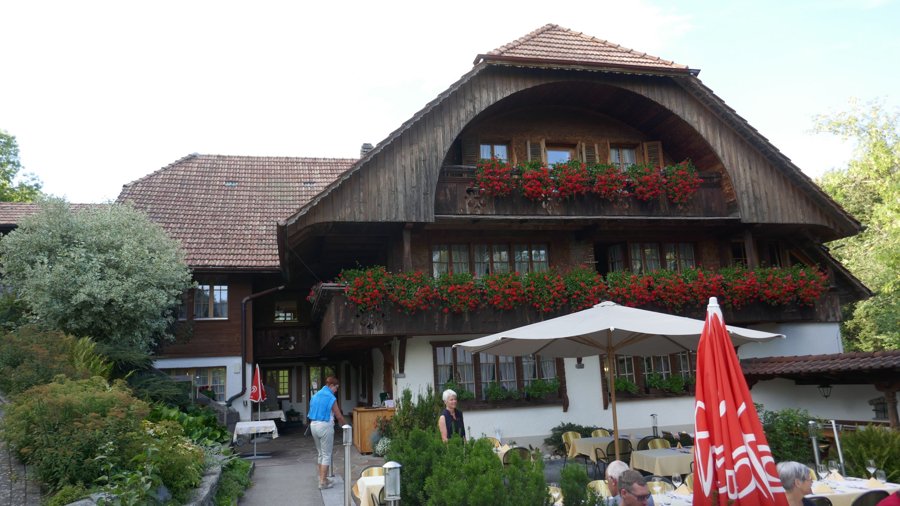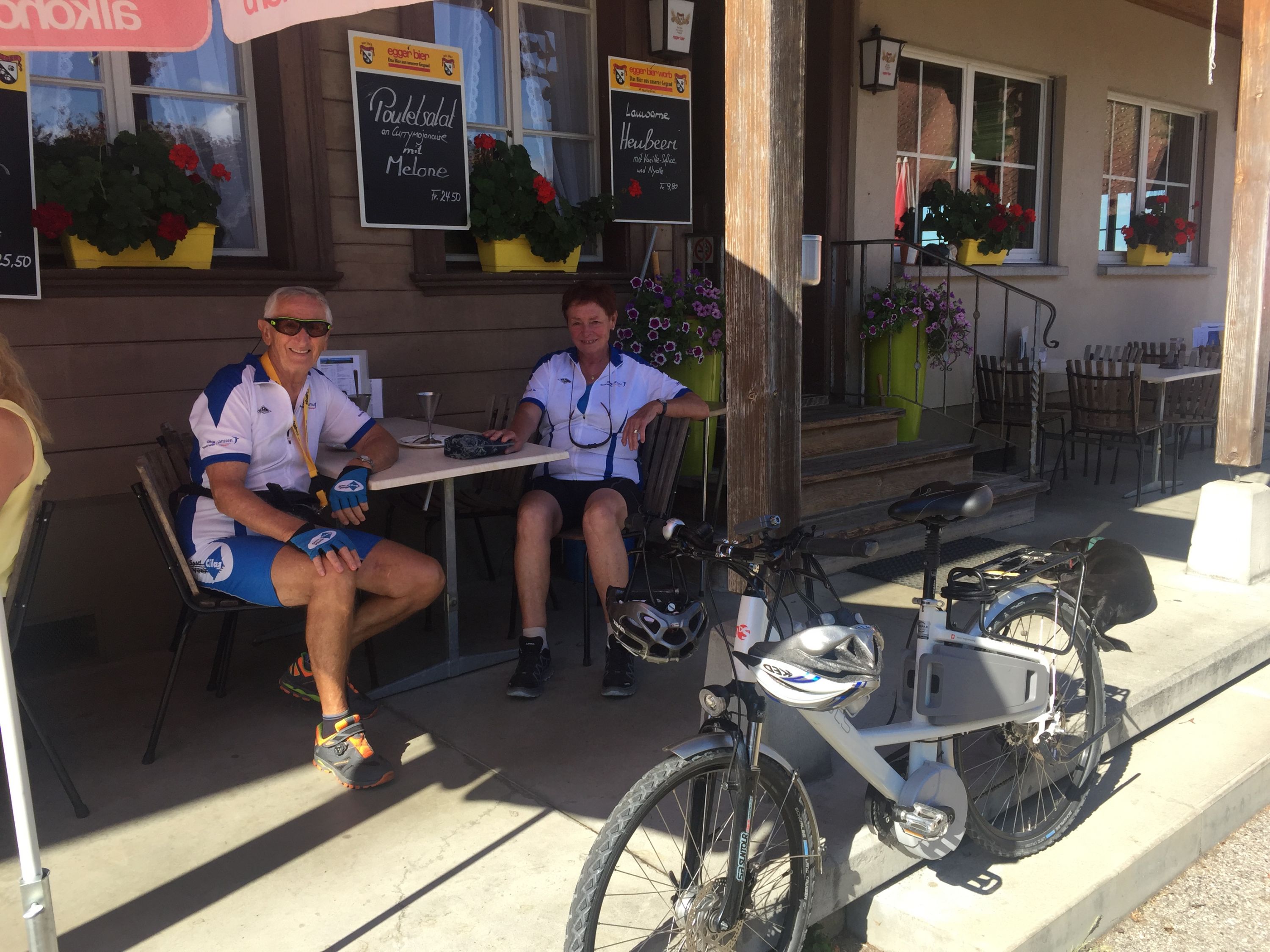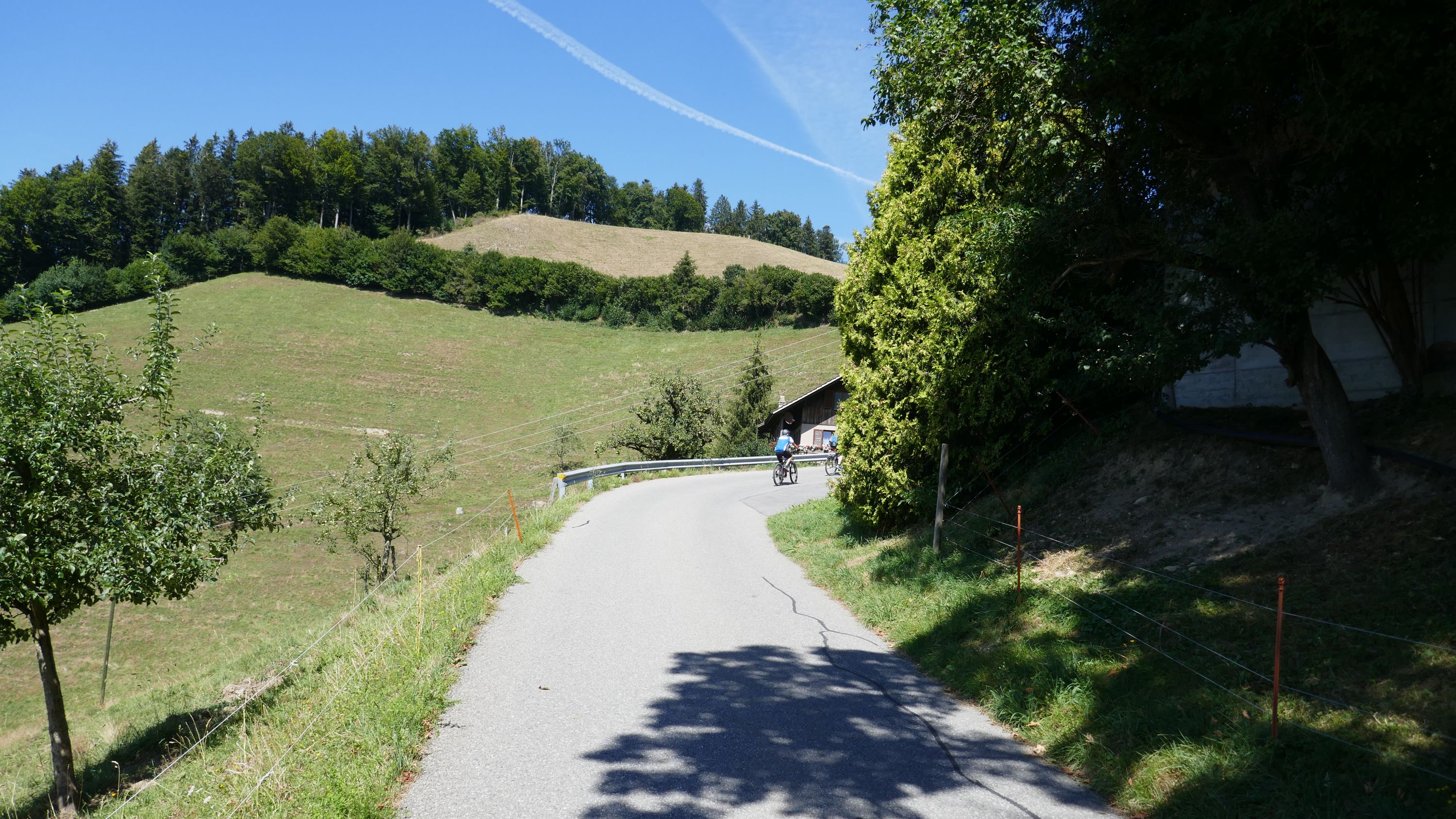 Im Hirschen Kaltacker hielten wir unsere Mittagsrast, bevor es mit einer rassigen Fahrt bergab Richtung Burgdorf weiter ging. Nachdem wir Burgdorf hinter uns gelassen hatten, fuhren wir auf dem Veloweg erst der Emme- und später für ein kurzes Stück der Landstrasse entlang bis nach Schafhausen im Emmental. Jetzt folgten wir auf einer Naturstasse der Mittelländer Hügelroute bis nach Walkringen. Steil bergauf und sehr anstrengend zog sich die Strecke durch schattige Waldstücke dem Höhenzug entlang bis auf die Moosegg. Im Ausflugsrestaurant Waldhäusern (980 m ü. M.) konnten wir uns nach dem Anstieg etwas ausruhen und die mittlerweile fast leeren Batterien der e-Bikes kurz aufladen. Mit den Wirtsleuten wurde Viktor schliesslich auch noch einig, nachdem er für die Teilladung der Akkus Fr. 2.- springen liess.