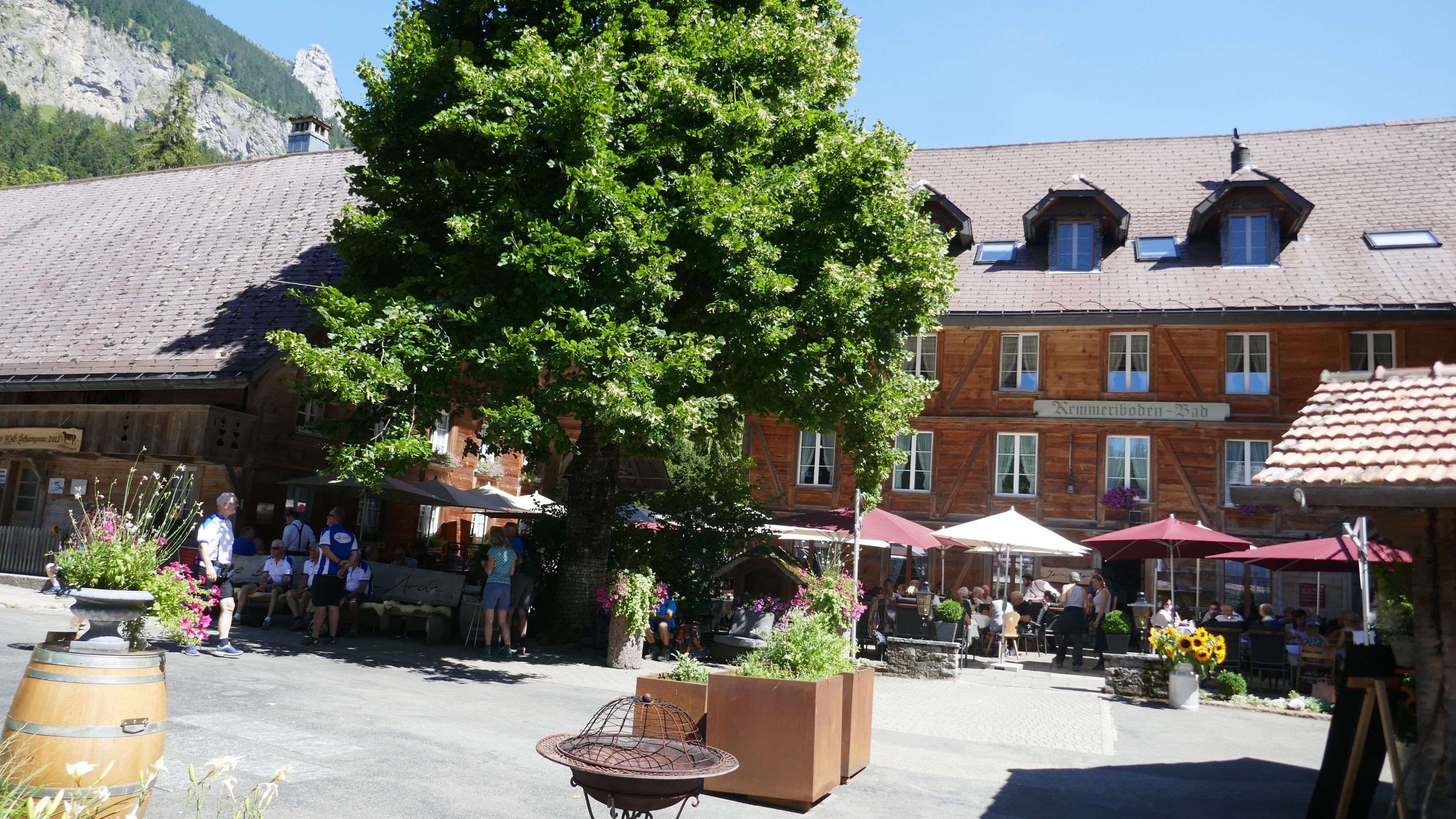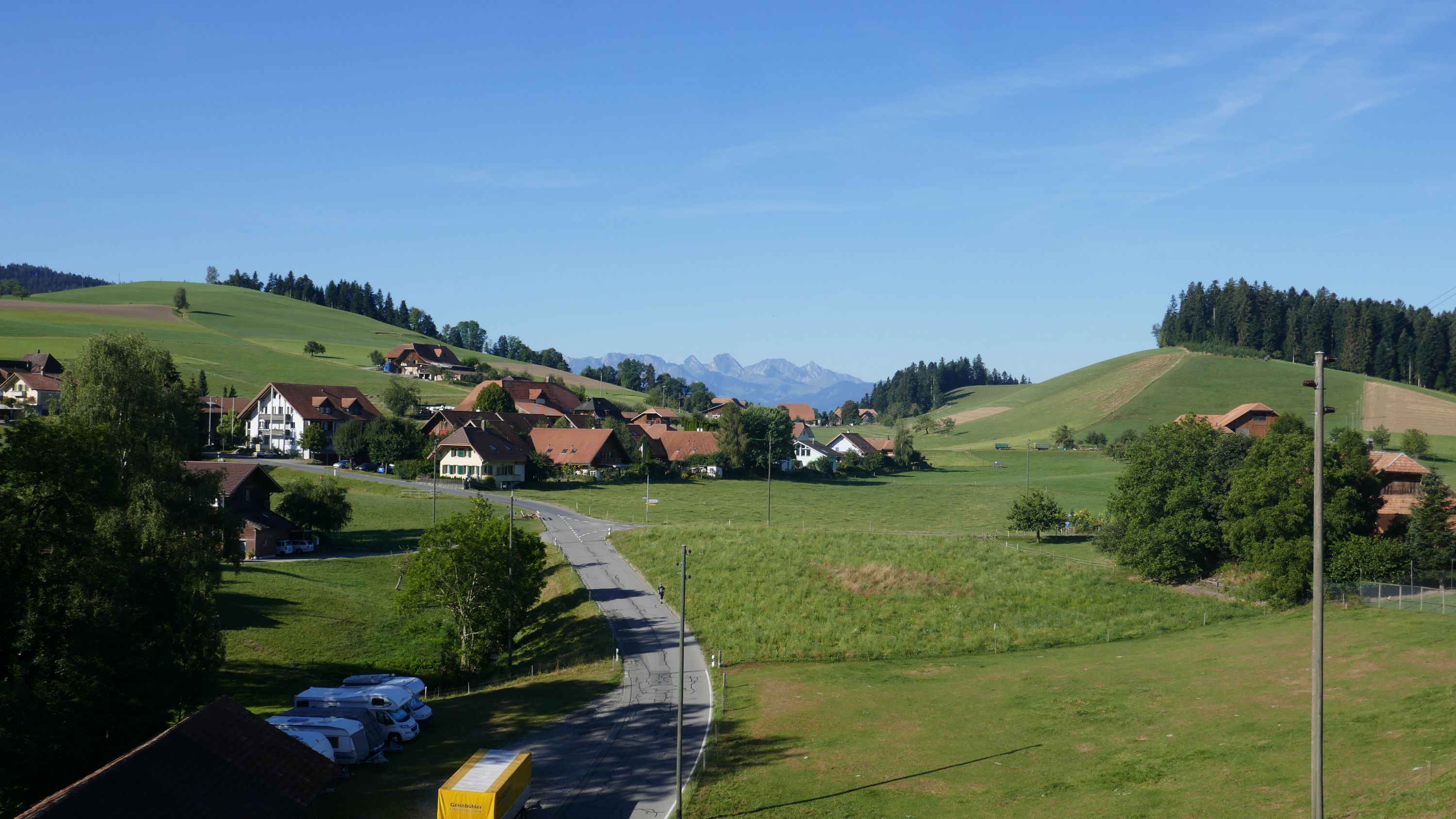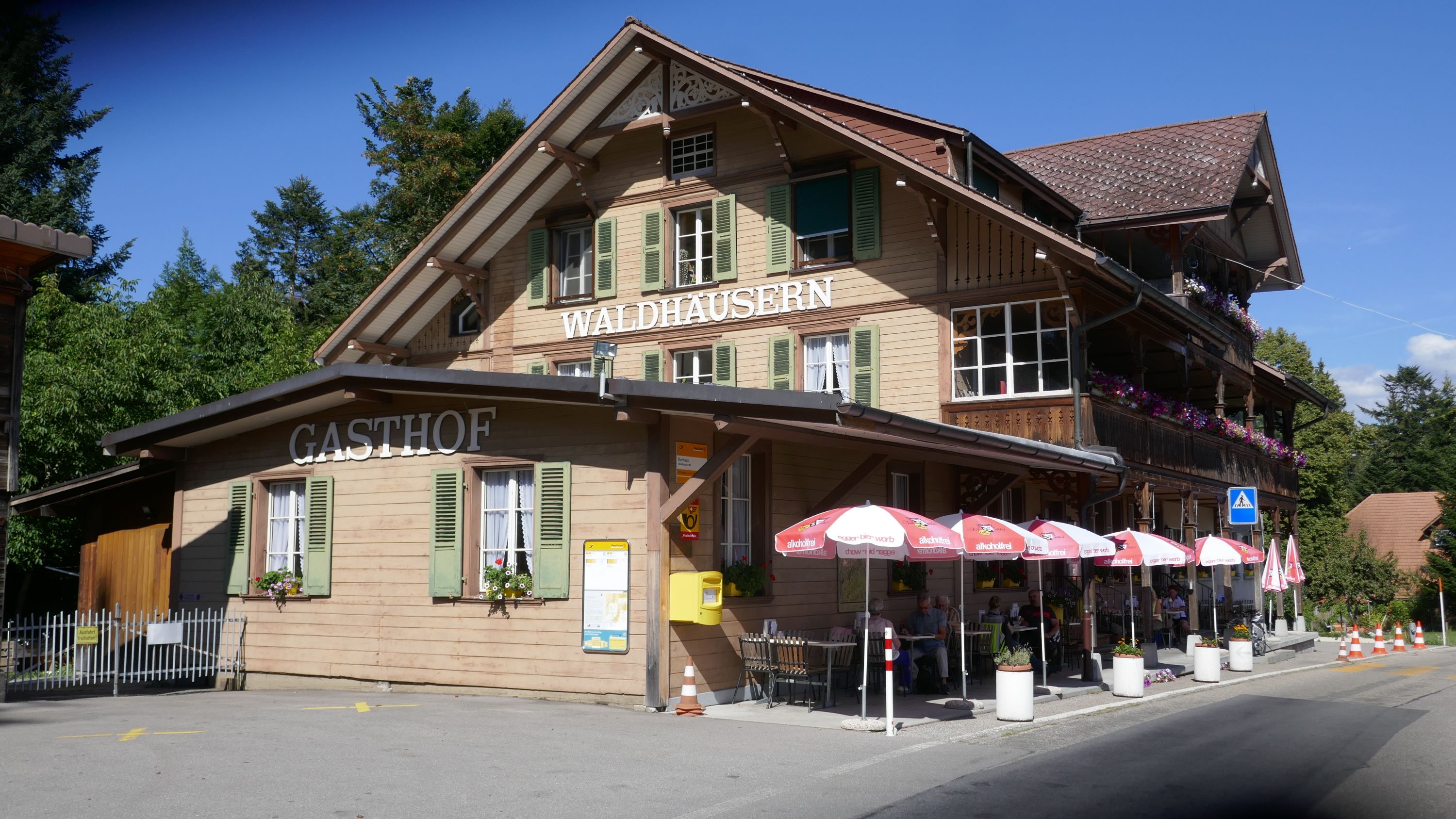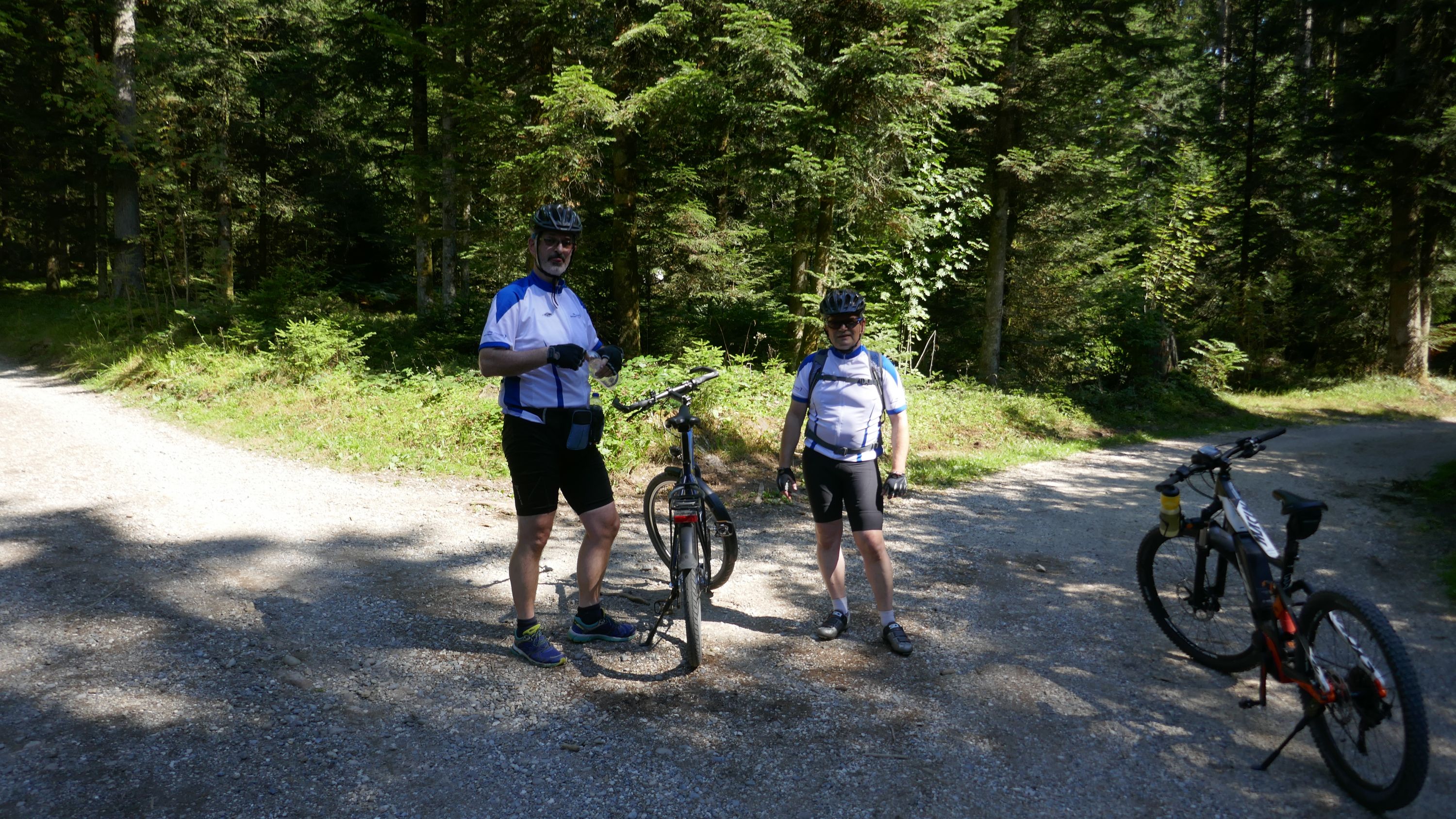 Im Hirschen Kaltacker hielten wir unsere Mittagsrast, bevor es mit einer rassigen Fahrt bergab Richtung Burgdorf weiter ging. Nachdem wir Burgdorf hinter uns gelassen hatten, fuhren wir auf dem Veloweg erst der Emme- und später für ein kurzes Stück der Landstrasse entlang bis nach Schafhausen im Emmental. Jetzt folgten wir auf einer Naturstasse der Mittelländer Hügelroute bis nach Walkringen. Steil bergauf und sehr anstrengend zog sich die Strecke durch schattige Waldstücke dem Höhenzug entlang bis auf die Moosegg. Im Ausflugsrestaurant Waldhäusern (980 m ü. M.) konnten wir uns nach dem Anstieg etwas ausruhen und die mittlerweile fast leeren Batterien der e-Bikes kurz aufladen. Mit den Wirtsleuten wurde Viktor schliesslich auch noch einig, nachdem er für die Teilladung der Akkus Fr. 2.- springen liess.