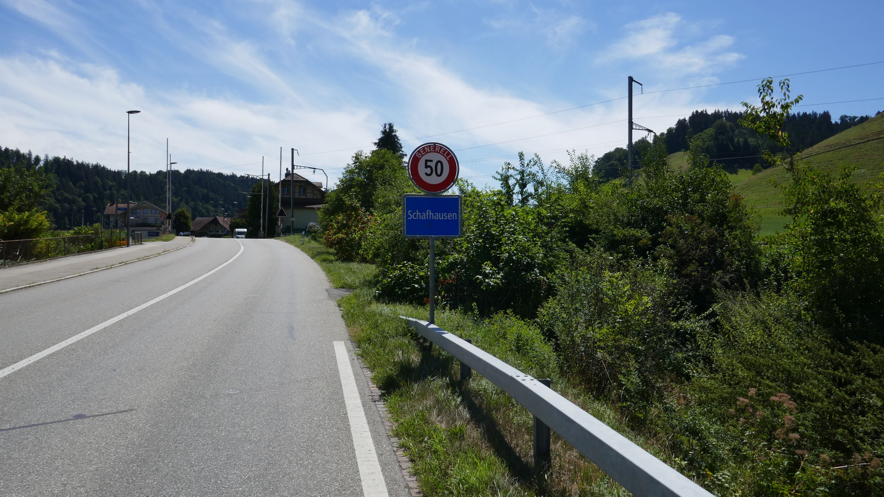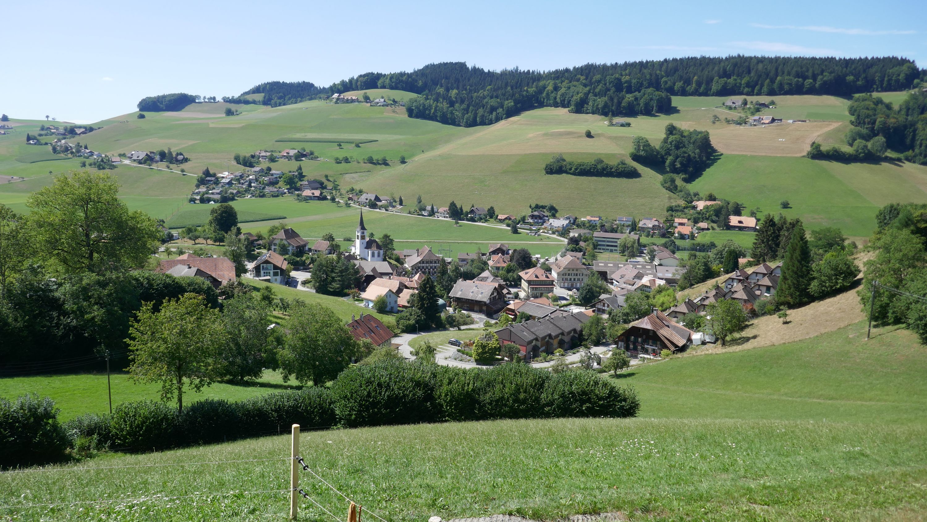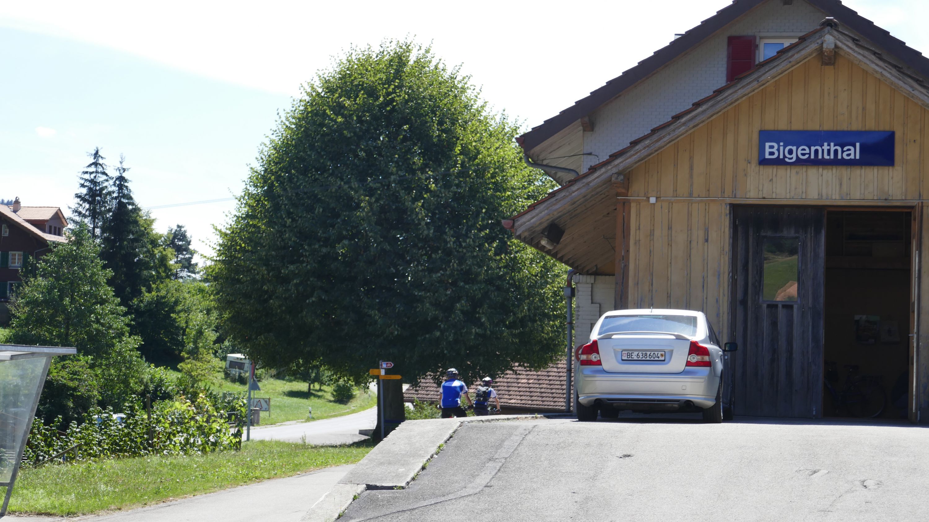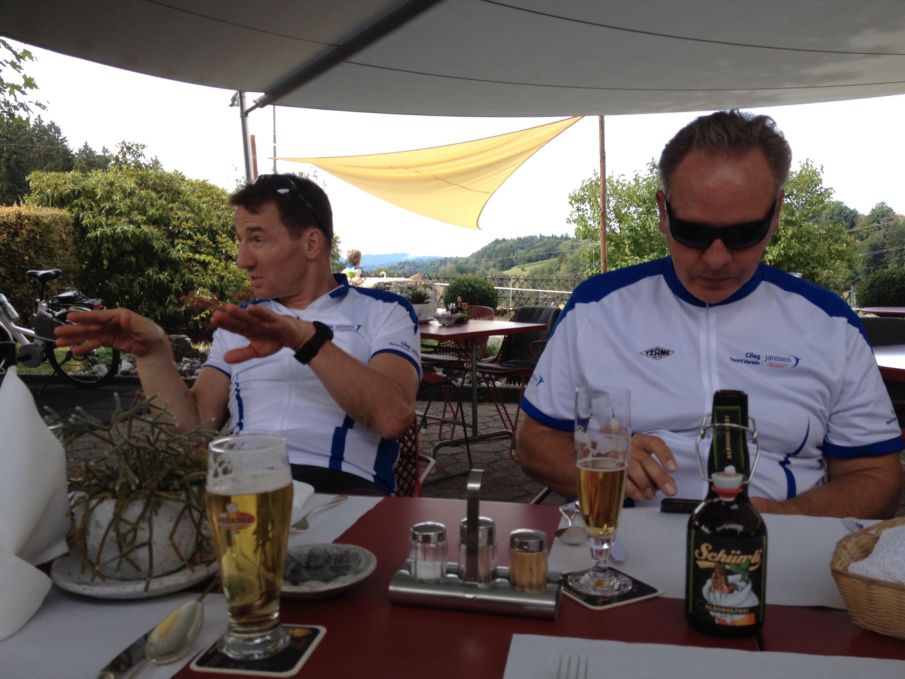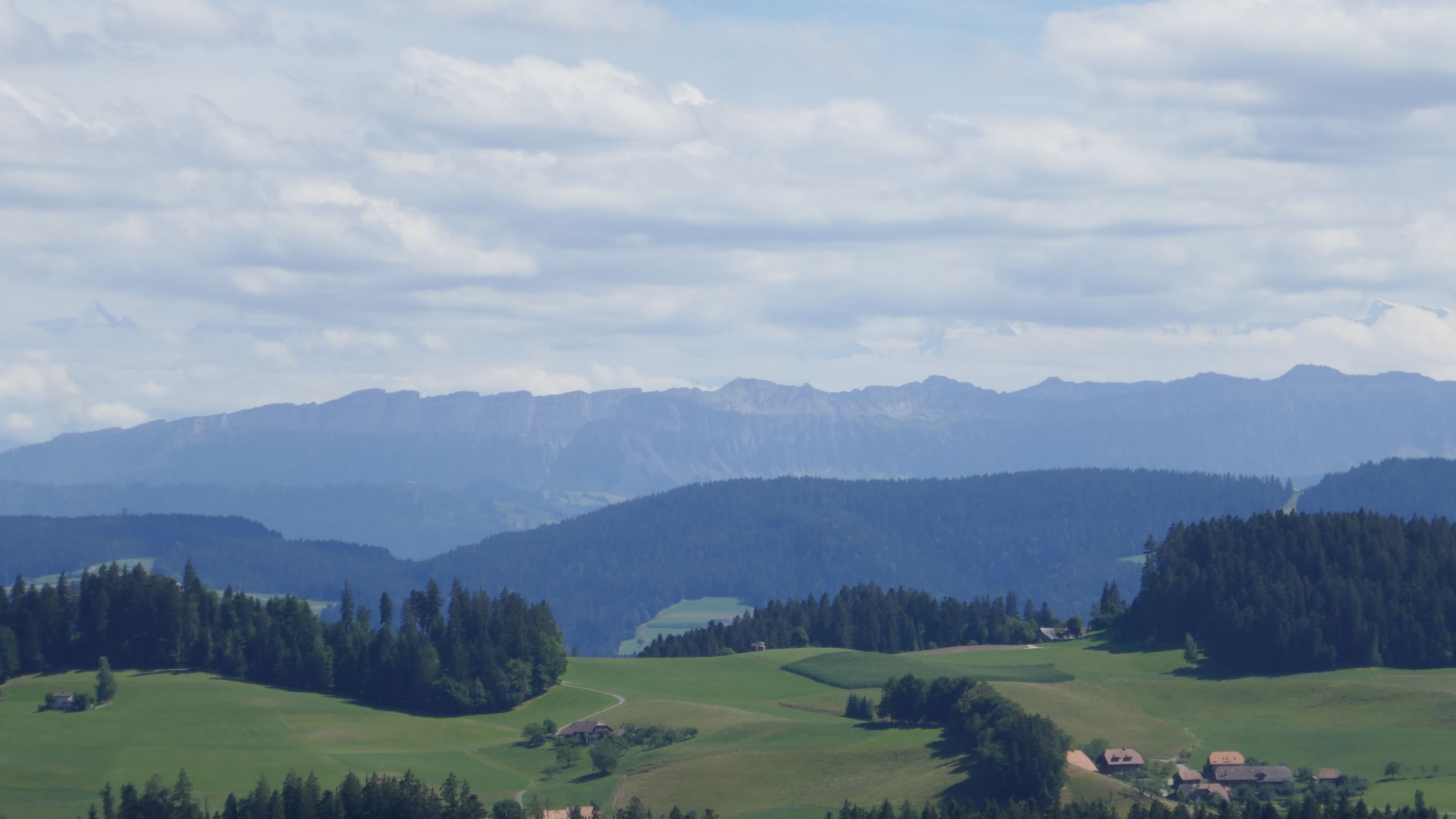 Im Hirschen Kaltacker hielten wir unsere Mittagsrast, bevor es mit einer rassigen Fahrt bergab Richtung Burgdorf weiter ging. Nachdem wir Burgdorf hinter uns gelassen hatten, fuhren wir auf dem Veloweg erst der Emme- und später für ein kurzes Stück der Landstrasse entlang bis nach Schafhausen im Emmental. Jetzt folgten wir auf einer Naturstasse der Mittelländer Hügelroute bis nach Walkringen. Steil bergauf und sehr anstrengend zog sich die Strecke durch schattige Waldstücke dem Höhenzug entlang bis auf die Moosegg. Im Ausflugsrestaurant Waldhäusern (980 m ü. M.) konnten wir uns nach dem Anstieg etwas ausruhen und die mittlerweile fast leeren Batterien der e-Bikes kurz aufladen. Mit den Wirtsleuten wurde Viktor schliesslich auch noch einig, nachdem er für die Teilladung der Akkus Fr. 2.- springen liess.