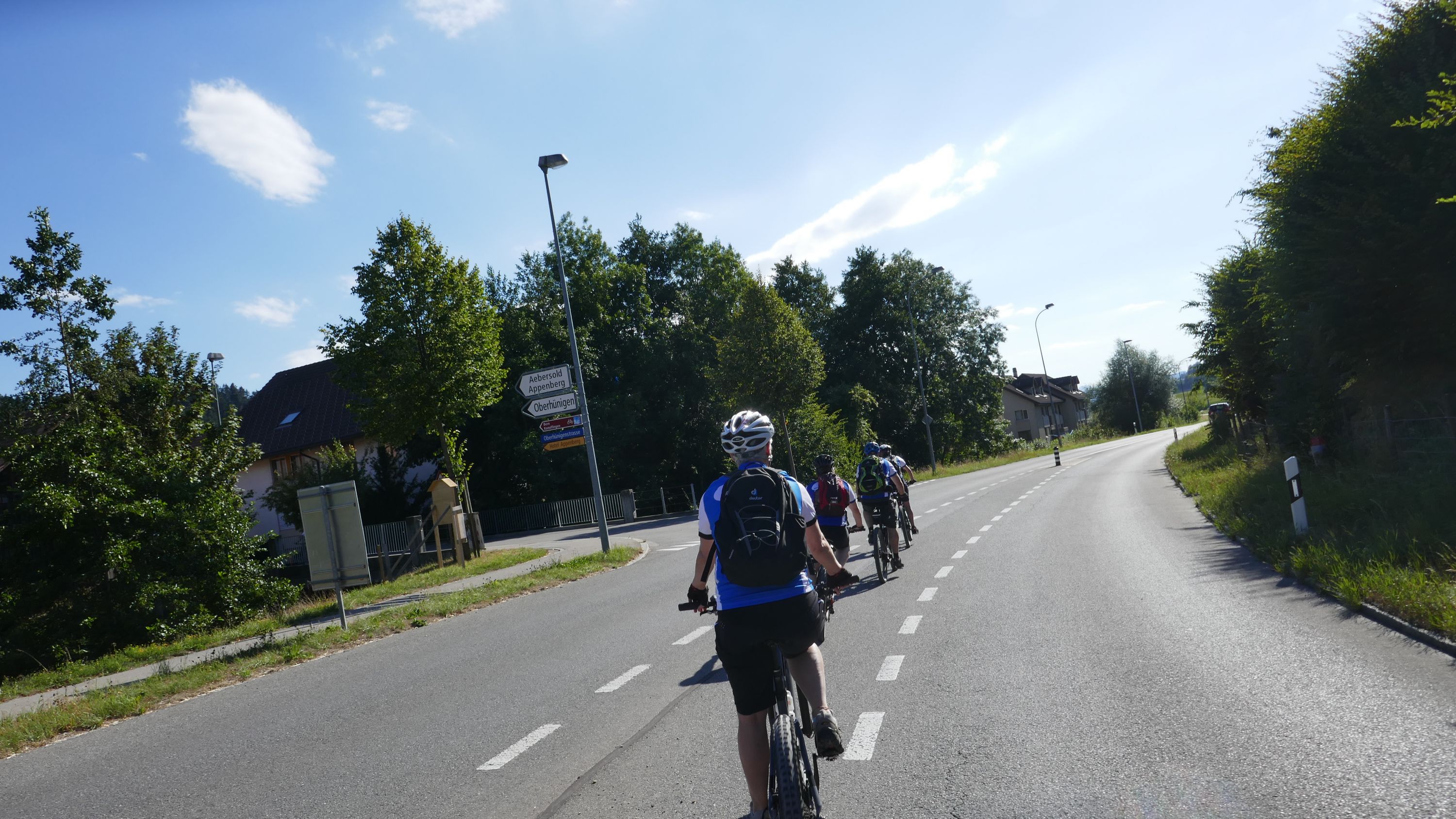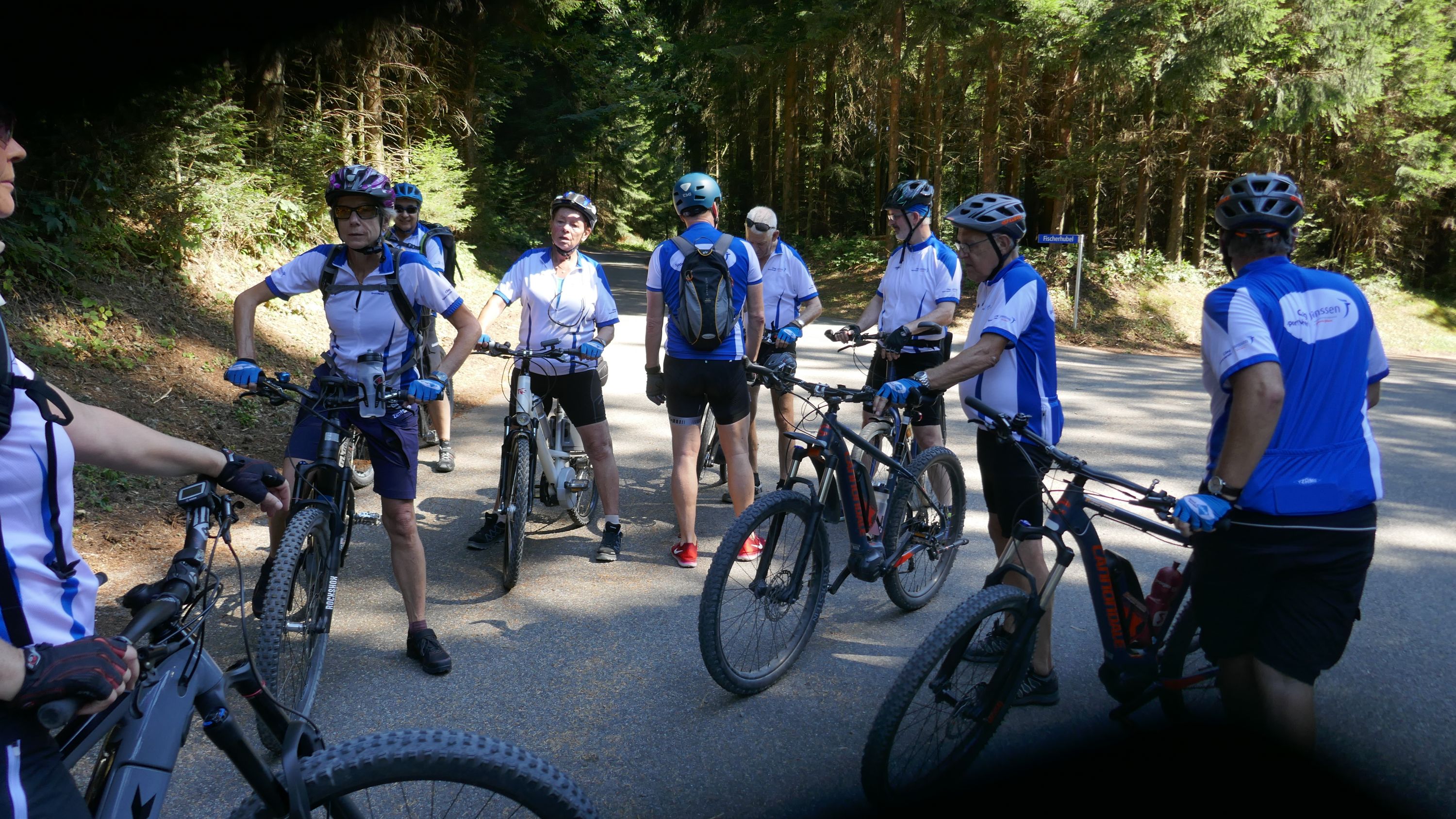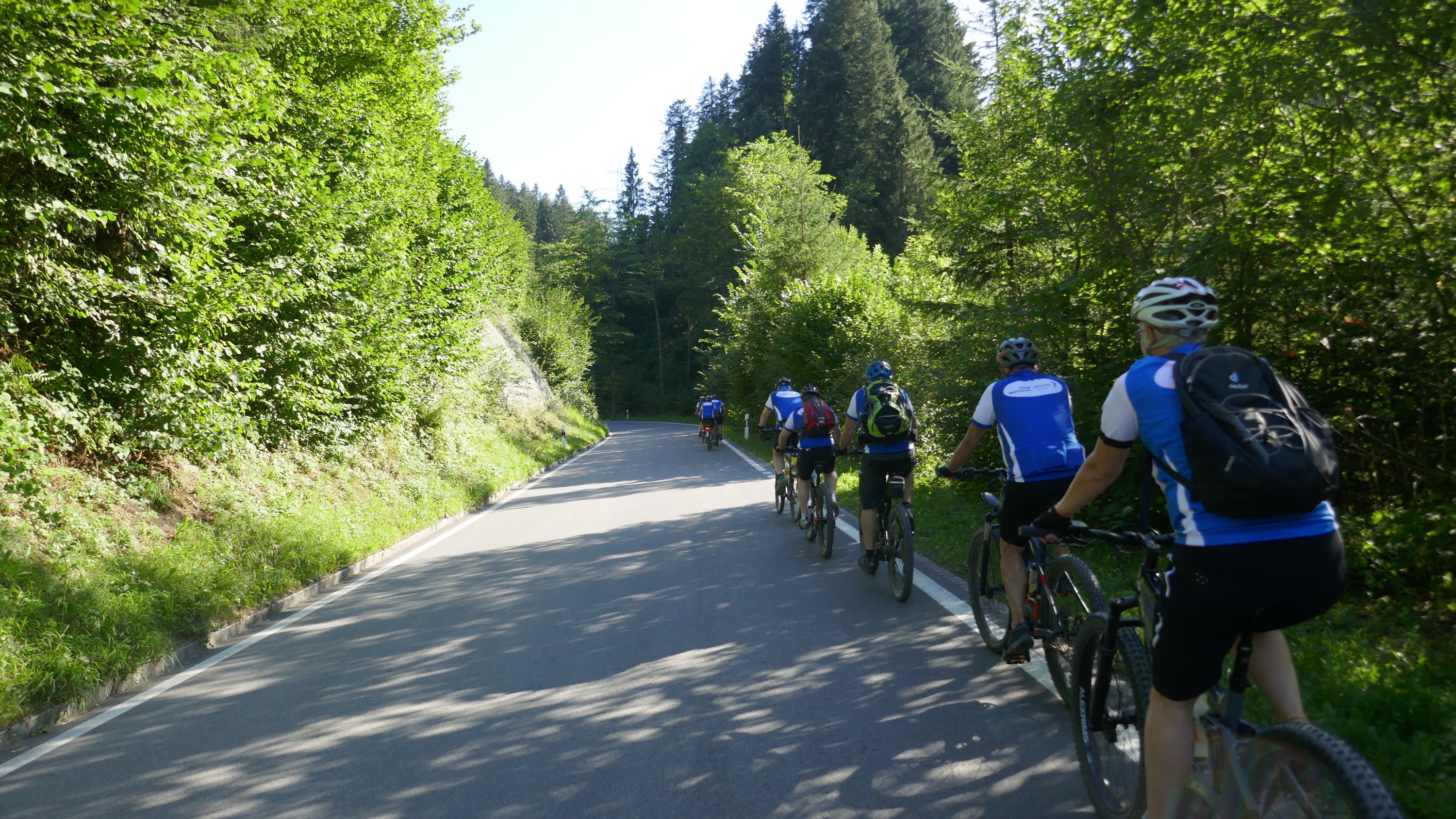 Nach einem guten und reichhaltigen Frühstück starteten wir am Sonntagmorgen um 9:30 Uhr zur zweiten Etappe. Da die von Stefan bevorzugte Strecke nur für Mountainbikes fahrbar war, teilte sich die Gruppe. Gleich zu Beginn wurden wir auf einem langen und steilen Anstieg gefordert. Danach konnten wir uns über die anspruchsvolle Abfahrt freuen, die wie immer viel zu kurz war.