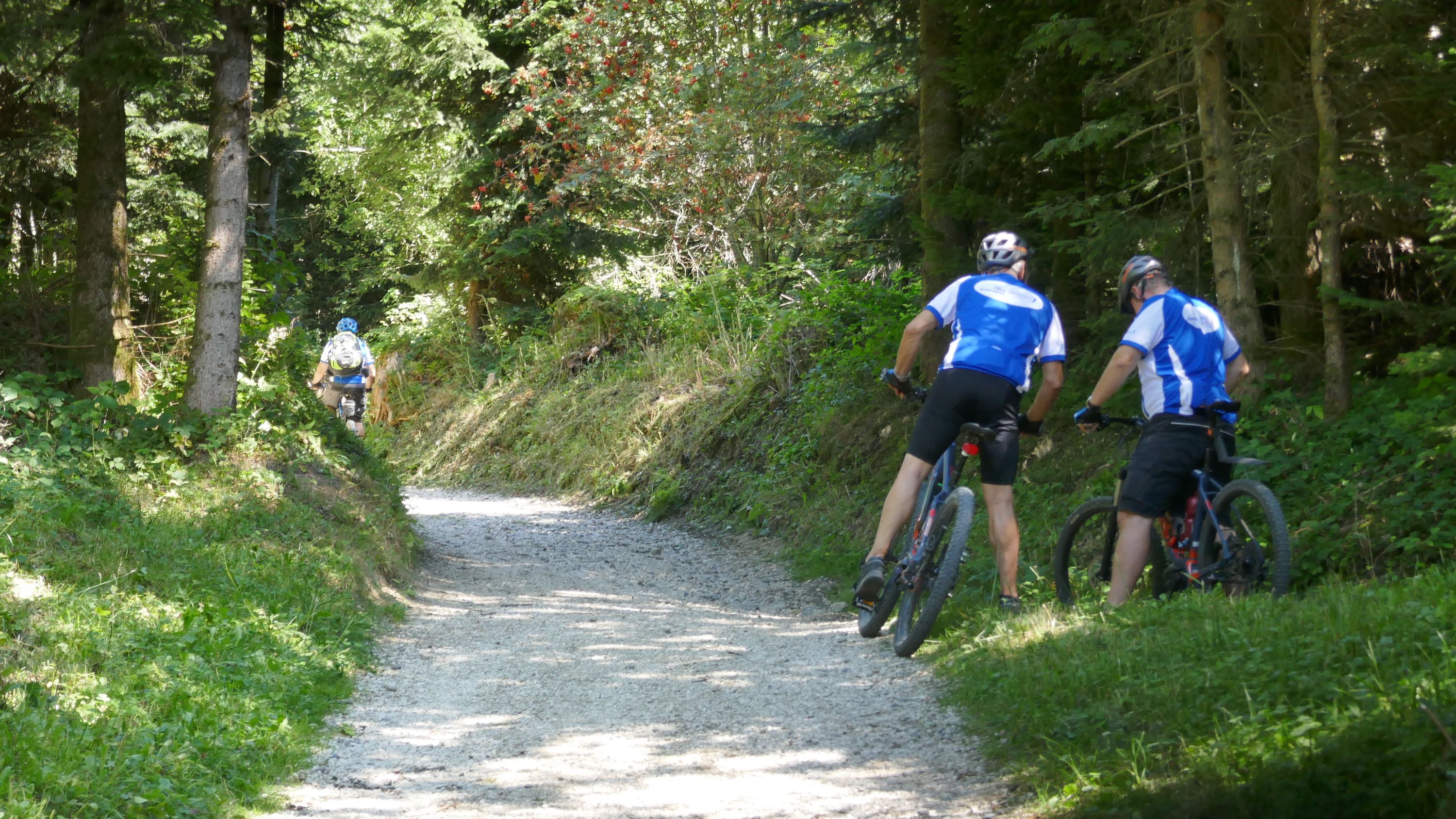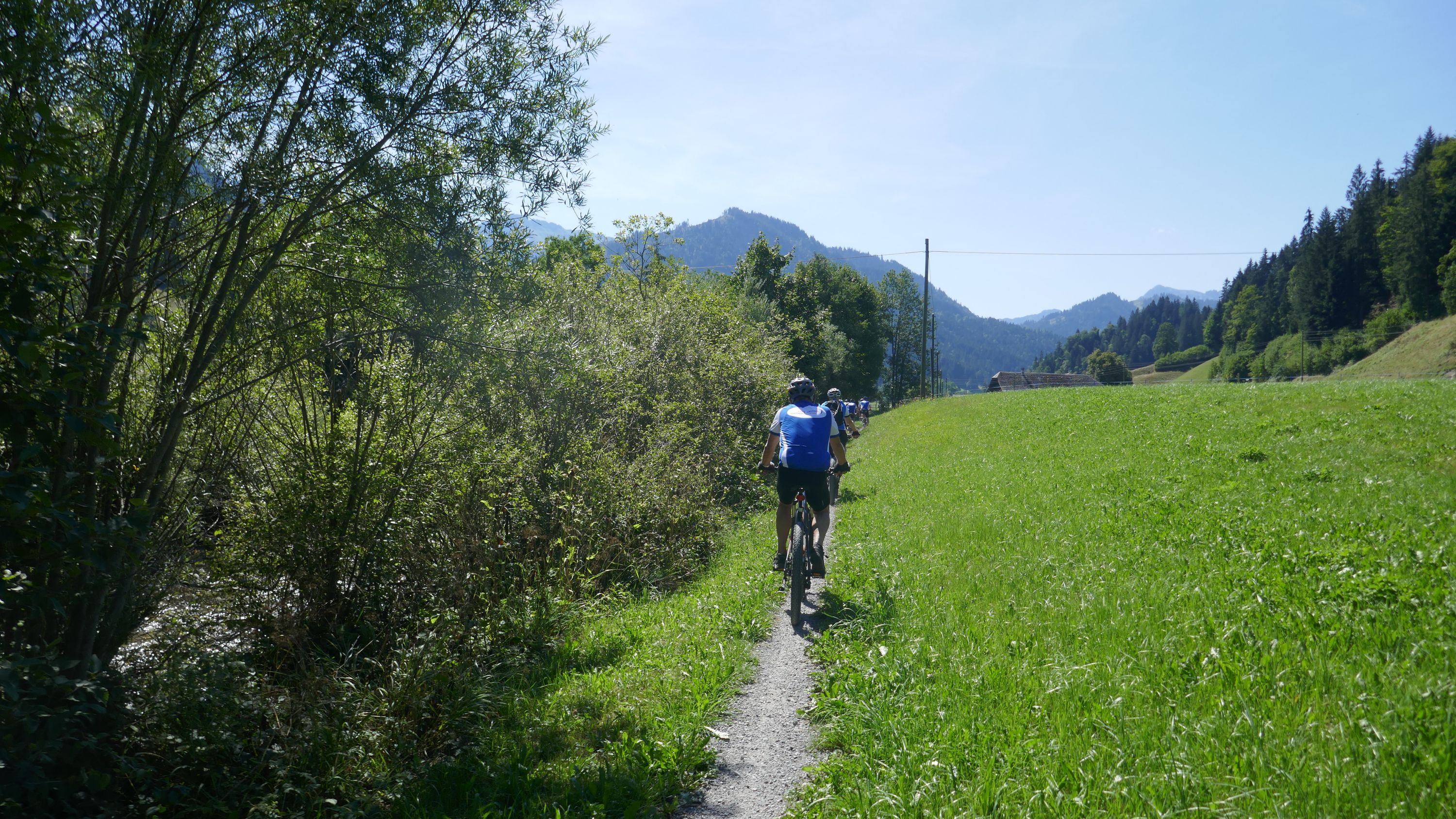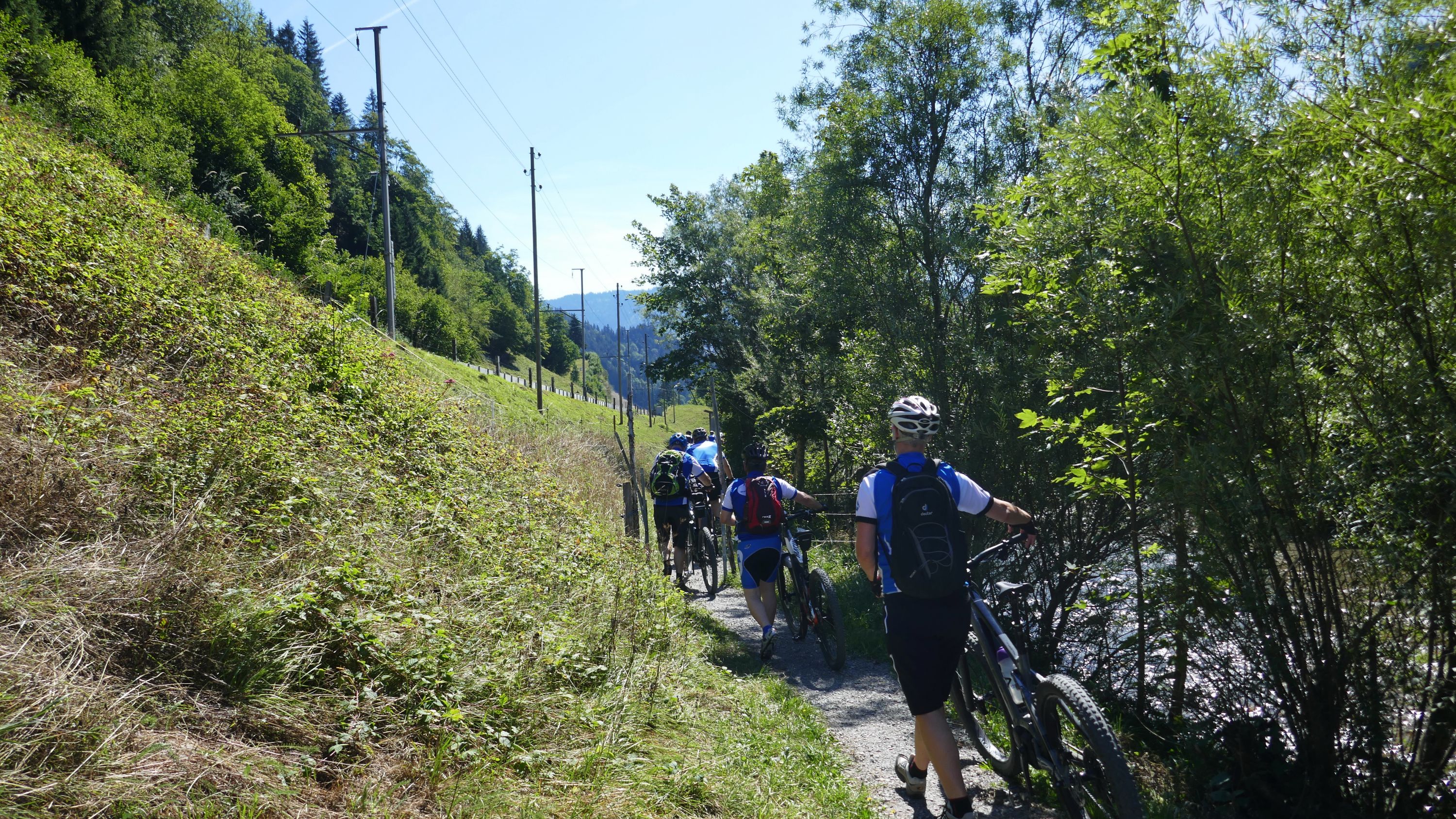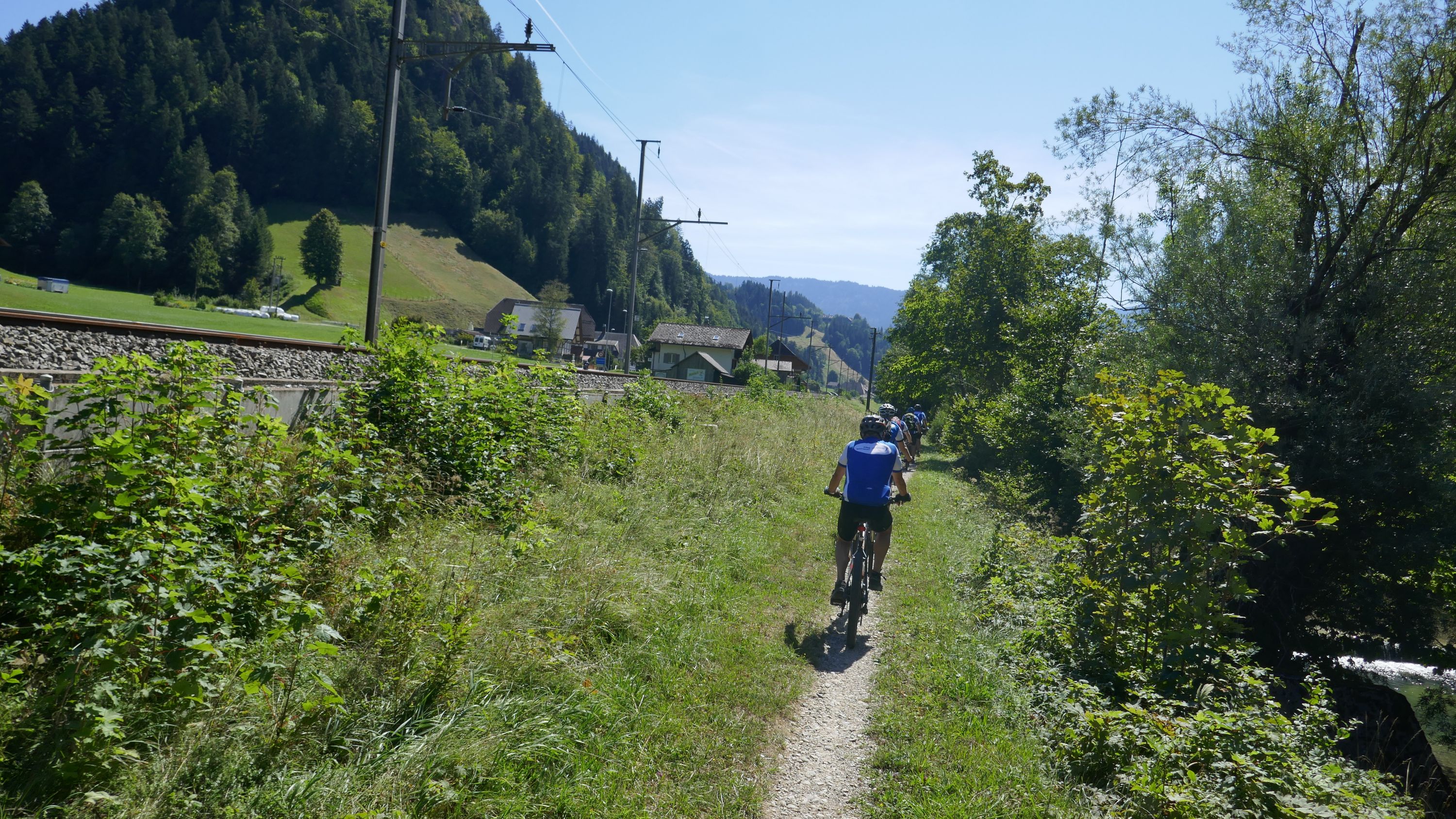 Kurz vor der Pause in der Kambly-Erlebniswelt wartete eine weitere «Challenge» auf uns. Vorbei an freilaufenden Hunden, der leicht erregten Halterin und einer übersprühten Fahrverbotstafel zog die Gruppe mit gutem Tempo einen schmalen Weg hoch. Schön war’s - vielleicht etwas grenzwertig. Jetzt freuten wir uns schon auf einen Kambly-Kaffee. Hier konnten wir die gesamte Guetzli-Palette von Kambly probieren. Es war ein Traum! Gut gestärkt setzten wir unsere Fahrt auf dem schmalen Trail direkt entlang des Ilfisbach fort. Das ging auf die Handgelenke. Das Tempo war sportlich, die Batterien noch gut. Danach verliessen wir das Emmental und setzten unsere Fahrt im Entlebuch fort.