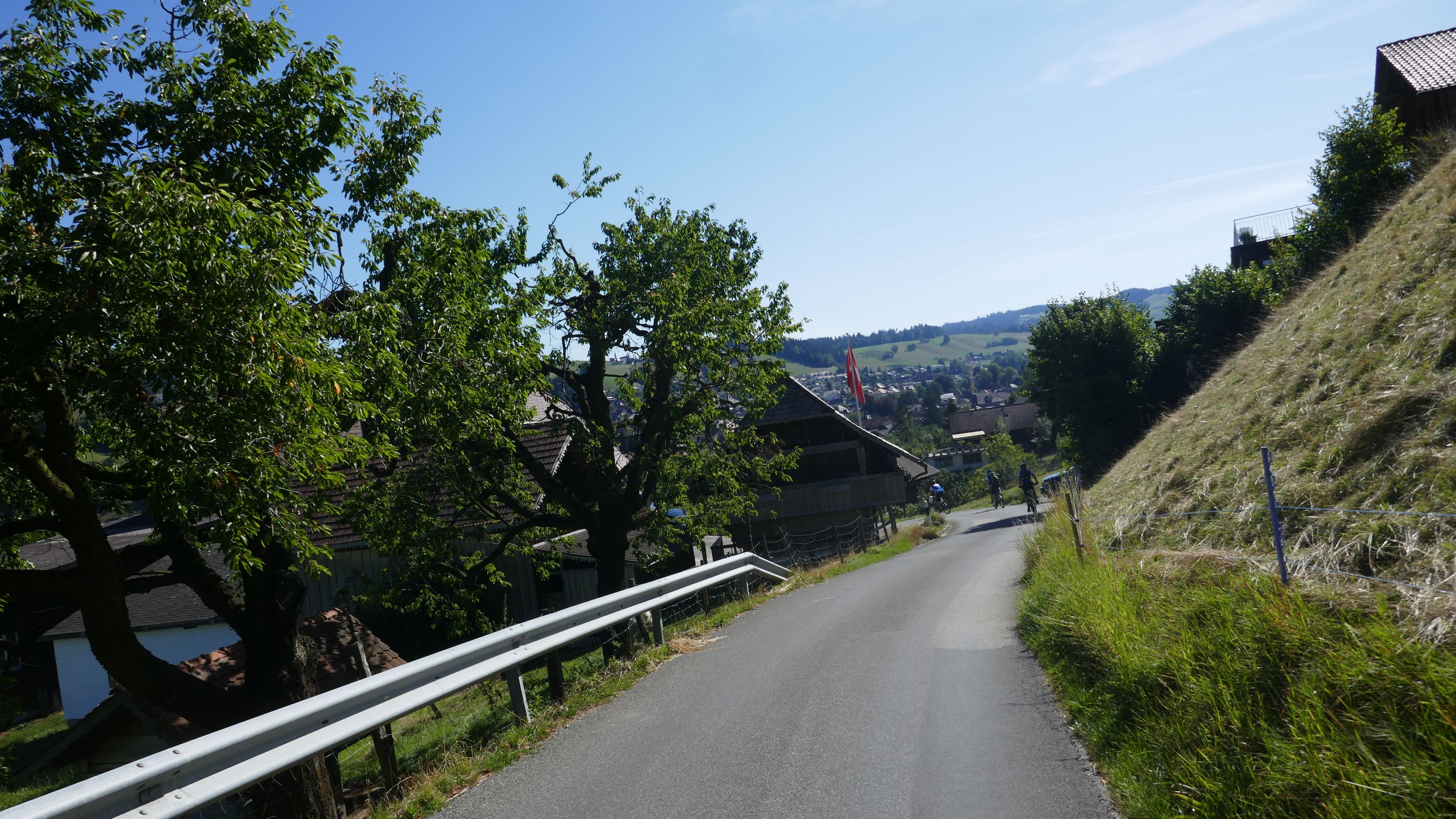 Frisch aufgeladen und durstgestillt zogen wir es wiederum vor, über die Naturstrasse Richtung Zäziwil weiter zu fahren und wurden dafür nochmals mit einer fantastischen Aussicht belohnt. Der Aufstieg zum Appenberg war happig und verlangte uns noch einiges an Kraft ab. Stefan wollte es nochmals wissen und gab Vollgas. Wo nimmt er nur diese Energie her? Nach Ankunft im Hotel-Appenberg zeigte die Handy-App seit dem Start, mittlerweile 1679 gefahrene Höhenmeter. Besonders beeindruckt haben mich Stefans und Elmars Leistungen, schliesslich waren diese beiden Fahrer ohne e-Unterstützung unterwegs und mussten alle Steigungen mit eigener Muskelkraft meistern. Wir waren alle glücklich ohne Zwischenfälle das Tagesziel erreicht zu haben. Es haben sich alle sehr diszipliniert und korrekt verhalten, waren vorsichtig und nie übermütig.