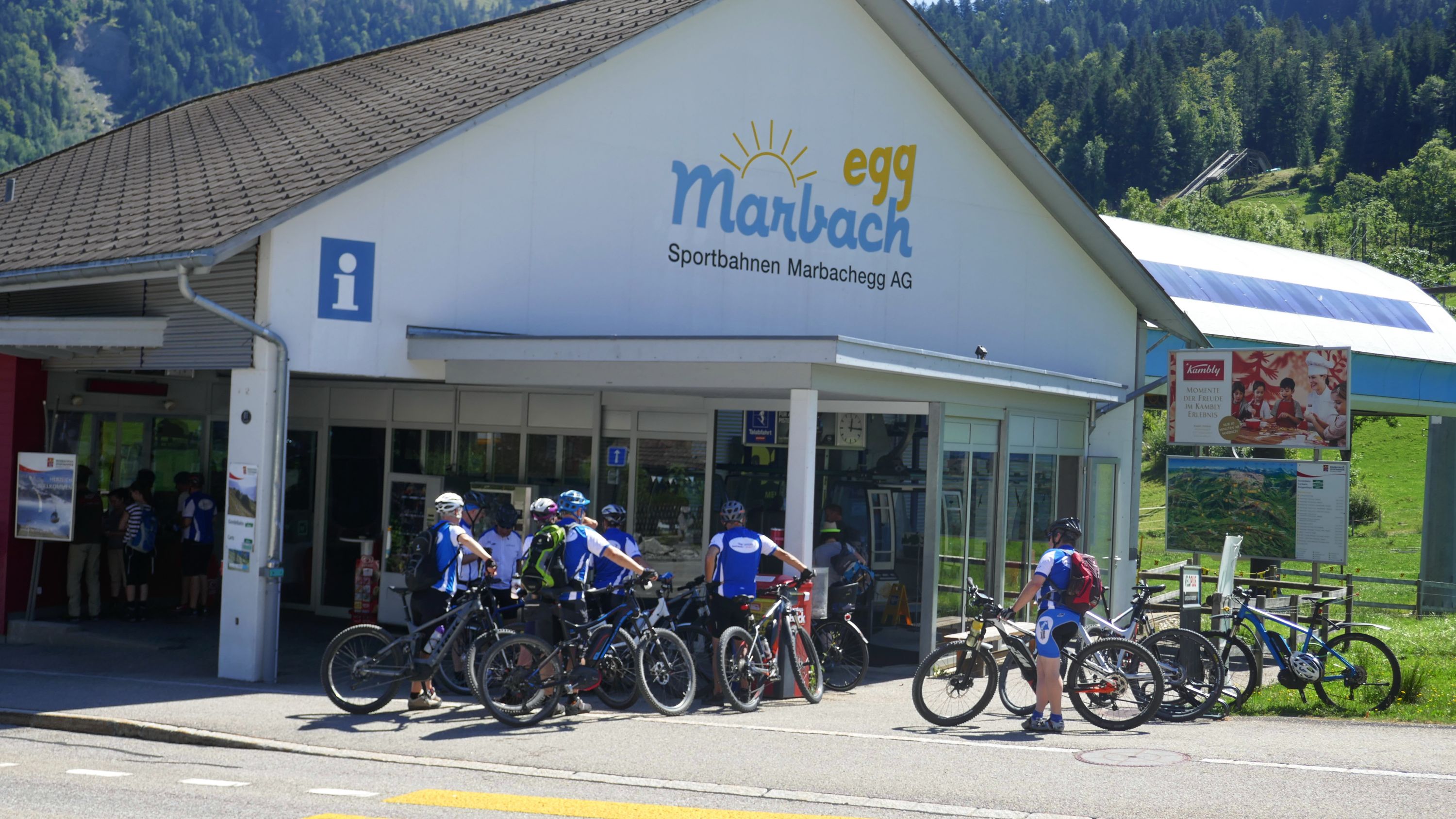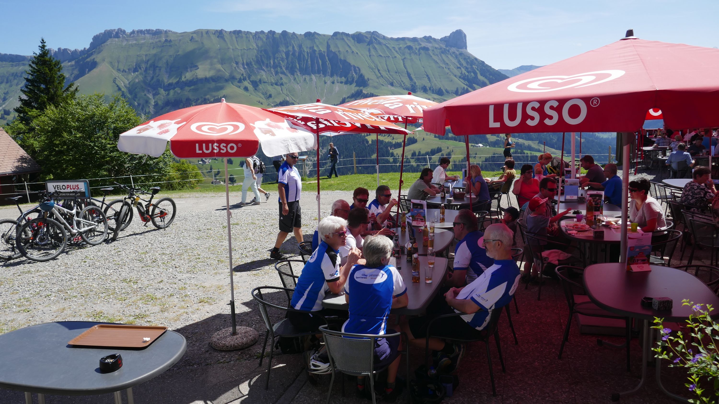In Marbach bestiegen wir die Gondelbahn zur Marbachegg, auf 1500 m.ü.M. wo ein Teil unserer Gruppe ihre Zweiräder mitverladen konnte. Auch die übrigen Fahrer liessen es sich nicht nehmen, den Panoramablick auf die imposante Schrattenfluh, den markanten Hohgant und die Berner Alpen zu geniessen. Nach einer ausgiebigen Pause und Fotos für die Homepage, schwebte die eine Gruppe wieder ins Tal zu ihren Bikes, während die Anderen auf den sehr steilen nur z.T befestigten Wegen nach Bumbach hinunter flitzten und weiter nach Kemmeriboden-Bad fuhren. Kurze Zeit später traf auch die 2. Gruppe von Marbach her kommend ein. Hier gab es zum obligaten Abschlusskaffee feine Meringue mit Rahm (Nidle), was wir uns nach diesem schönen und anstrengenden Wochenende wirklich verdient hatten.