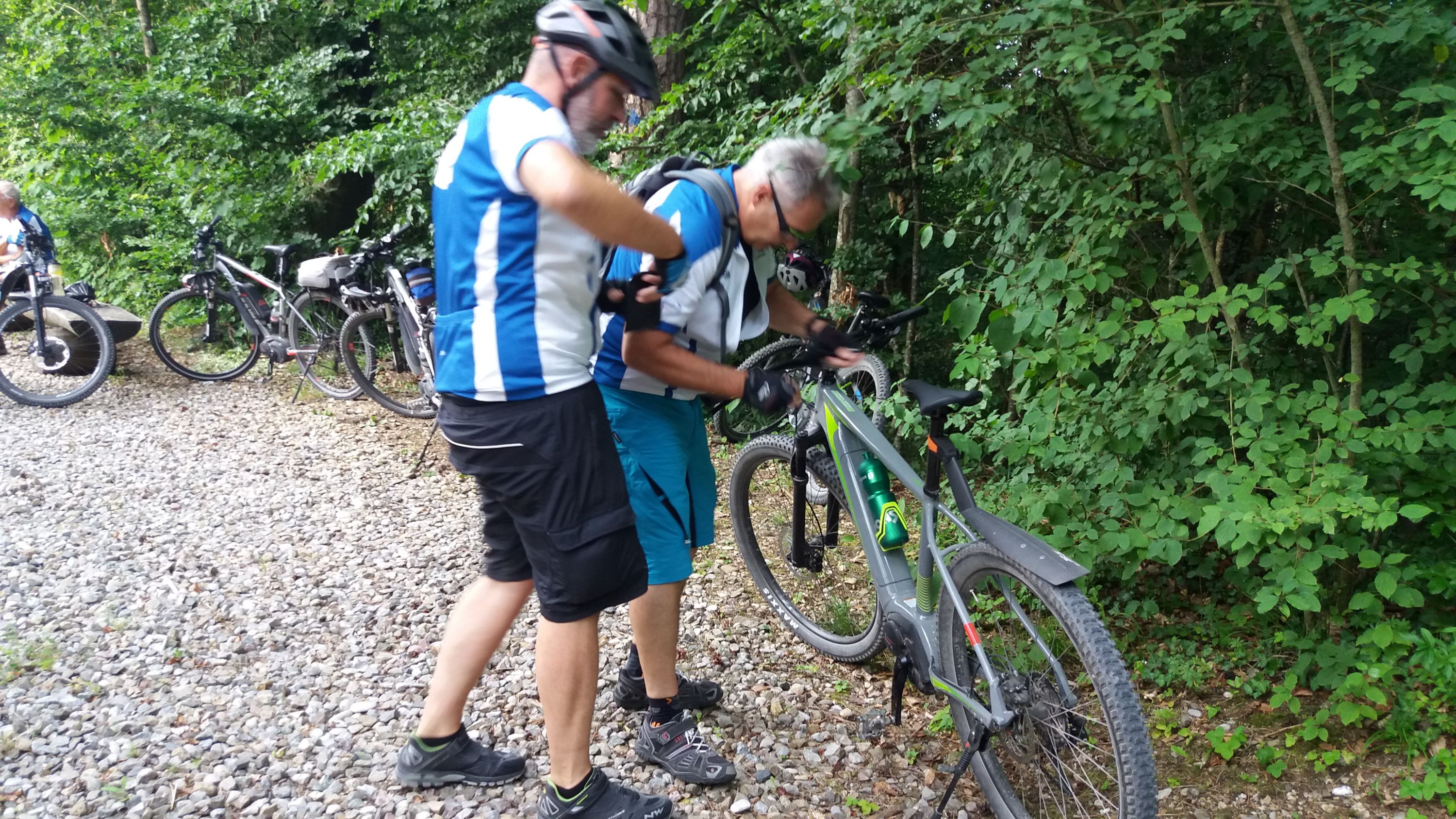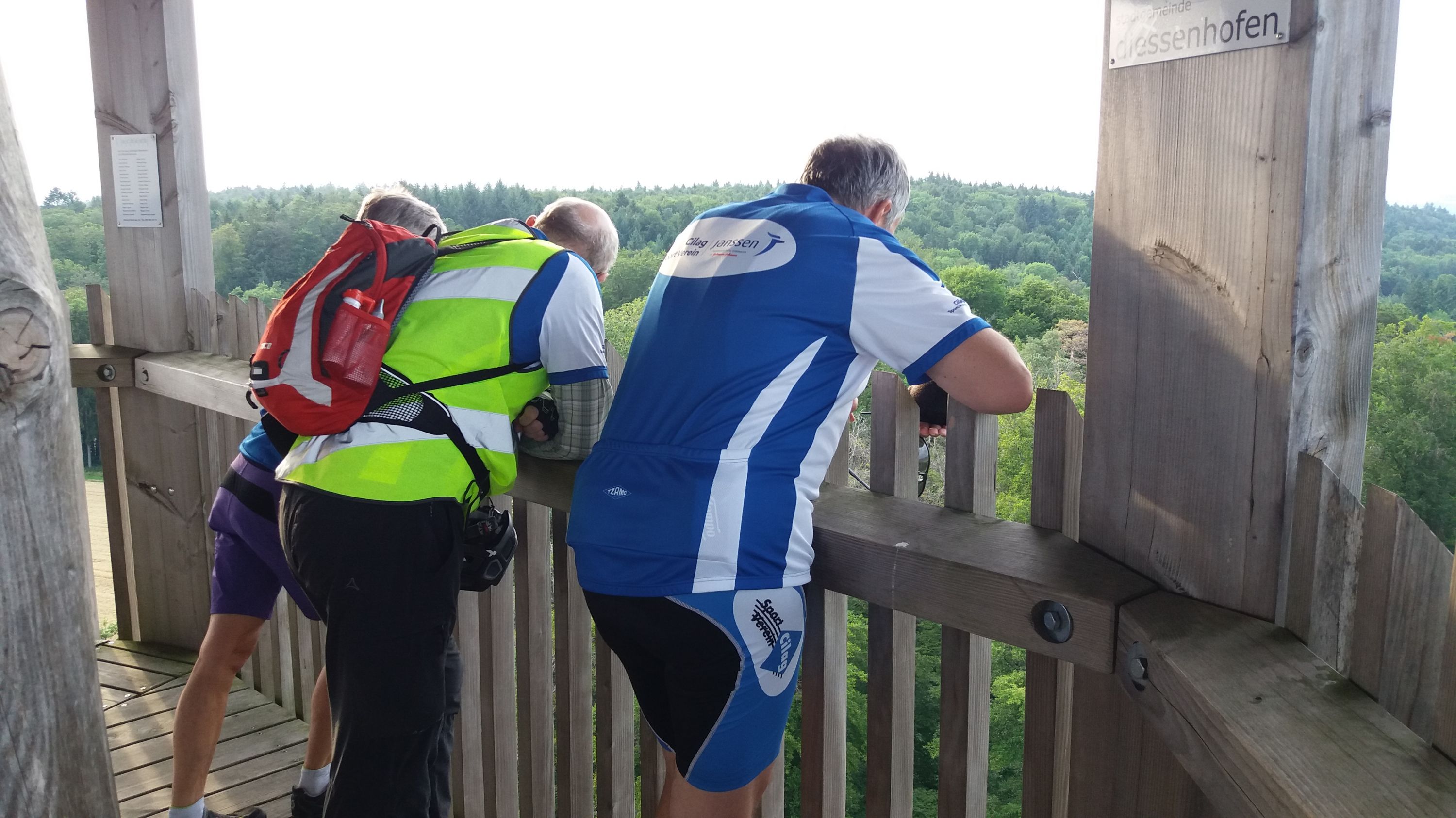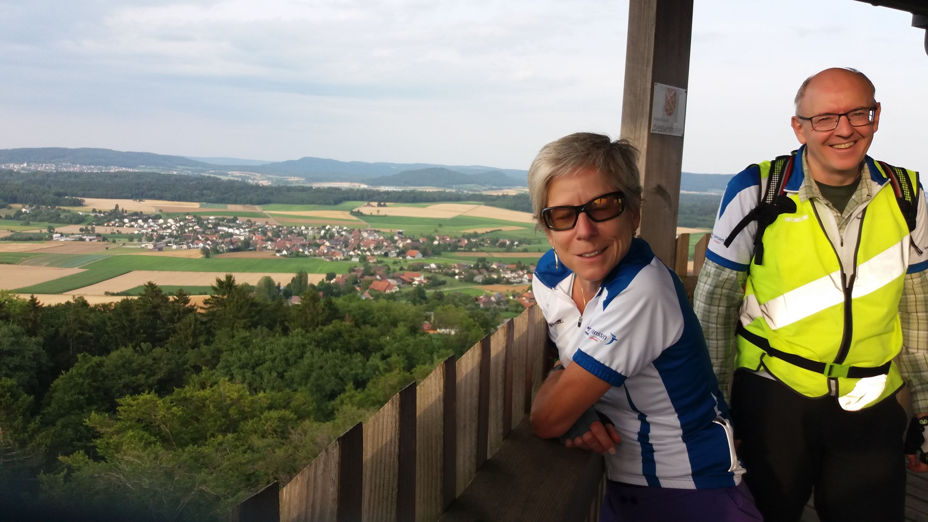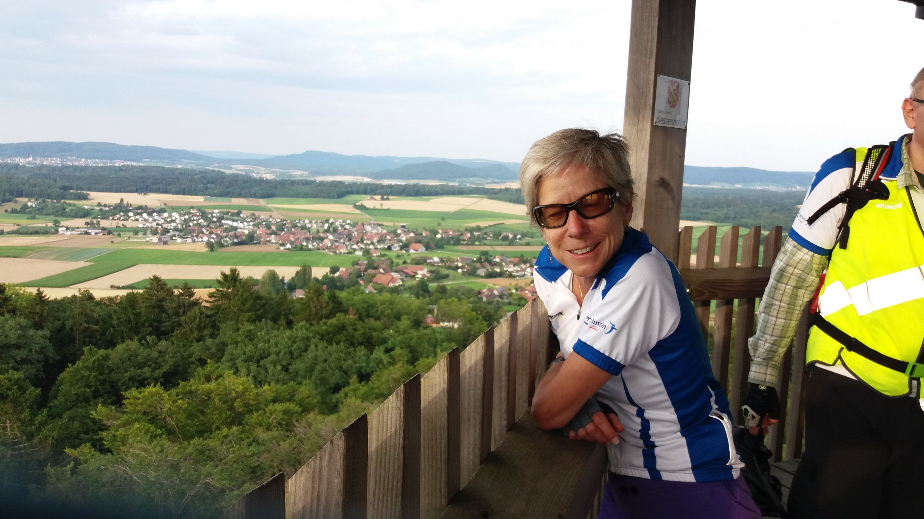 Treffpunkt war der Parkplatz beim Schulhaus Stumpenboden in Feuerthalen. An diesem Abend leitete Beat Schaber die abwechslungsreiche Bike-Tour der Gruppe A. Diese begann um 18:30 Uhr und es ging gleich auf der Naturstrasse ziemlich steil in den Wald, wo wir schon nach kurzer Zeit in einen schönen Singel-Trail einbogen. Hoch über Uhwiesen und vorbei an Wildensbuch radelte wir mal bergauf und mal bergab, abwechselnd auf Wald und Wiesenwegen. Nach ca 1 Stunde hatten wir unser Ziel, den Aussichtturm Hochwacht, erreicht. Schnell waren die Räder am Waldrand parkiert als Beat eine Tretkurbel, mit Pedal, am Fusse des Turmes liegen sah. Bald stellte sich heraus, dass sich diese von Peters Bike gelöst hatte. Die Kurbel hatte er wieder, aber jetzt mussten wir die Schraube finden, welche irgendwo im Schotter liegen musste. Nach gemeinsamer Suche fanden wir auch diese und Peter konnte die Tretkurbel wieder befestigen. Doch bevor wir den Rückweg antraten nahmen wir noch die 185 Stufen, zur obersten Plattform, unter die Füsse. Es hat sich gelohnt, denn dort oben hat man einen herrlichen Rundblick bis zu den Hegaubergen. Nach diesem Abstecher schwangen wir uns wieder aufs Rad und genossen die rassante Abfahrt Richtung Schlatt und weiter nach Feuerthalen.