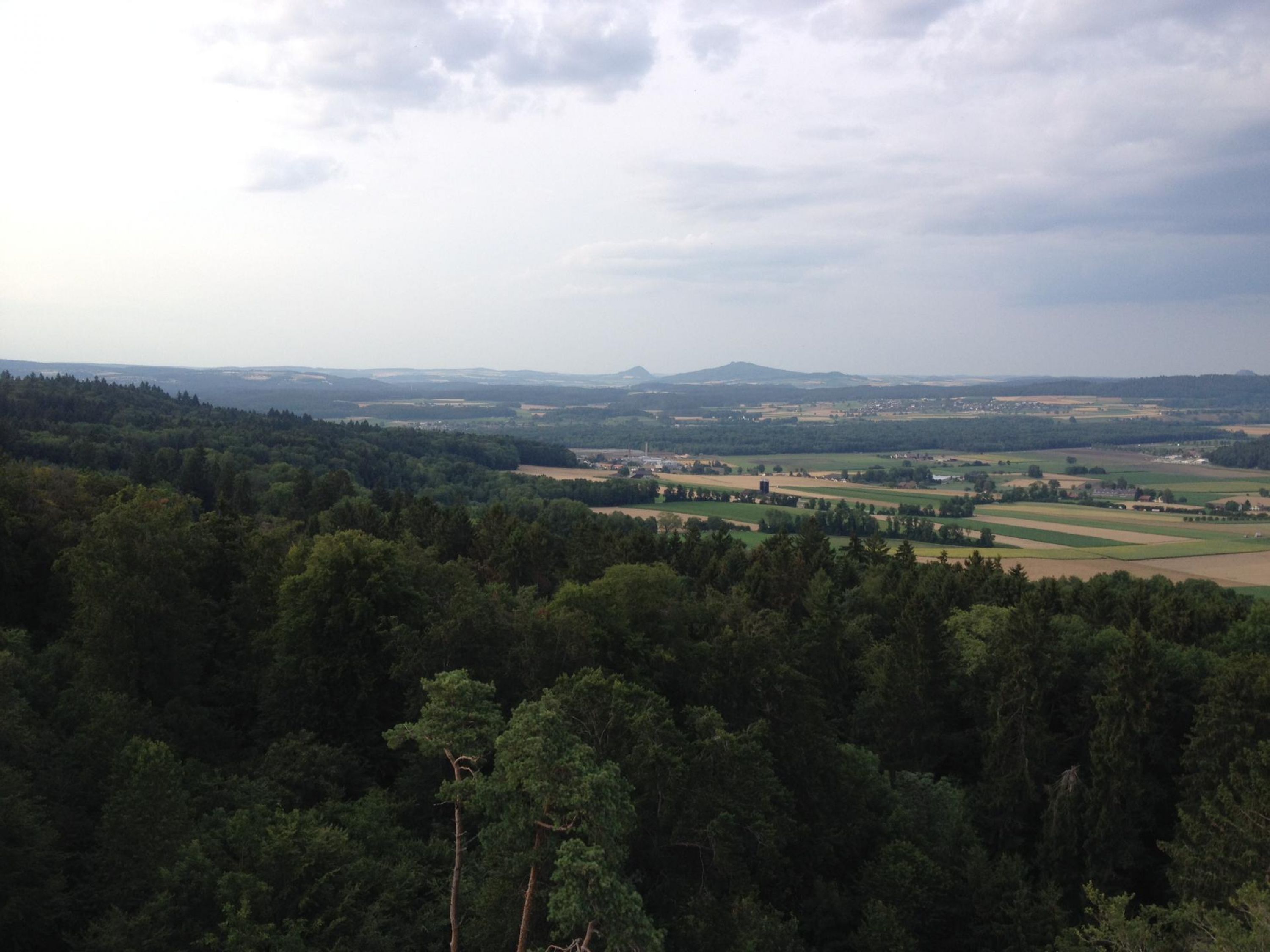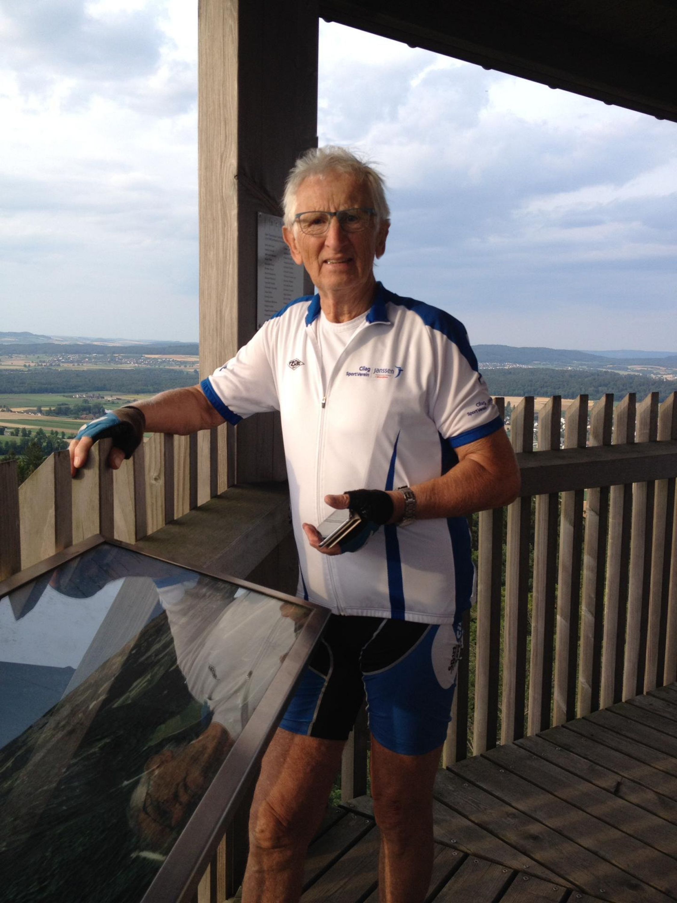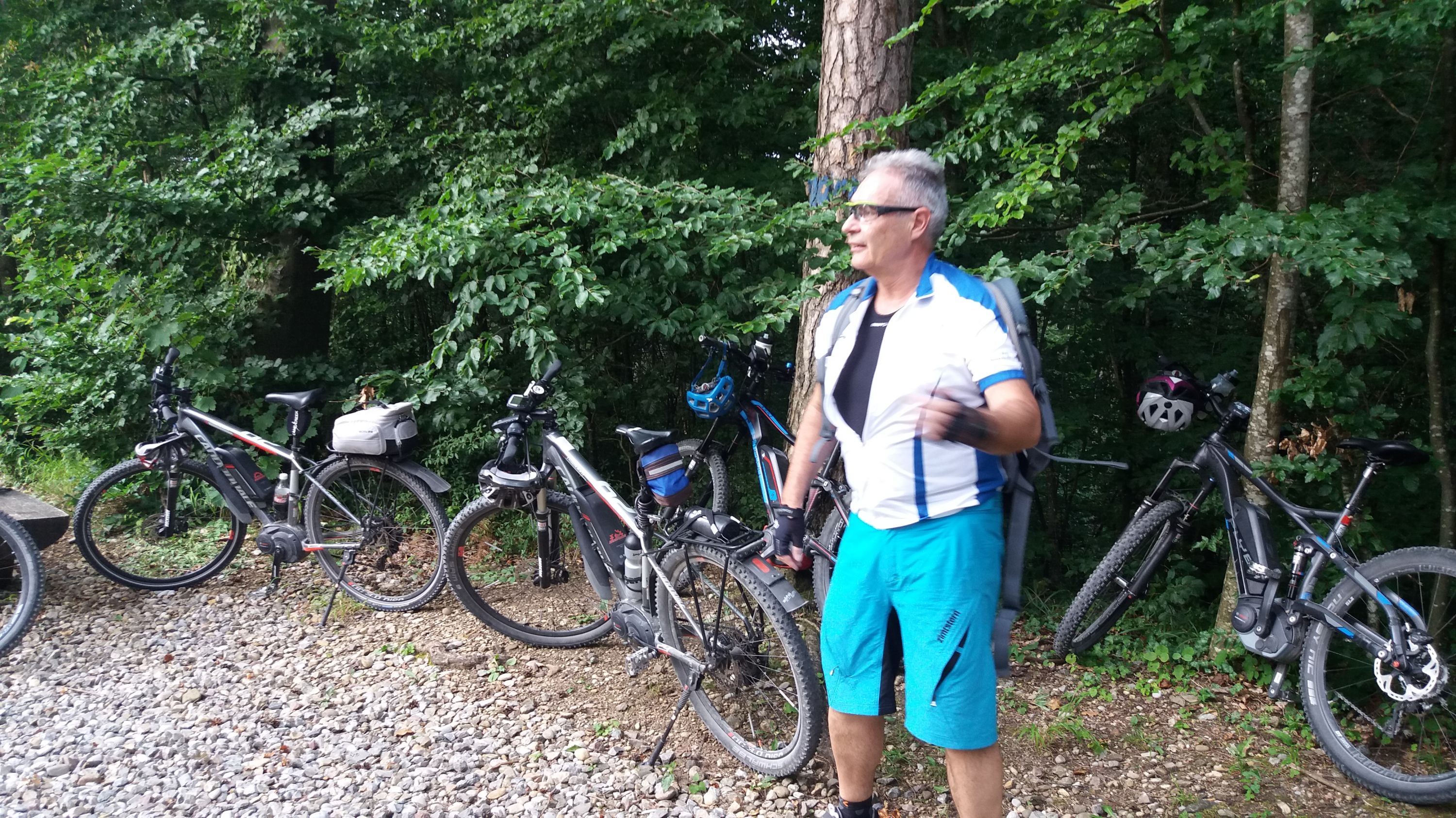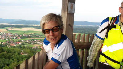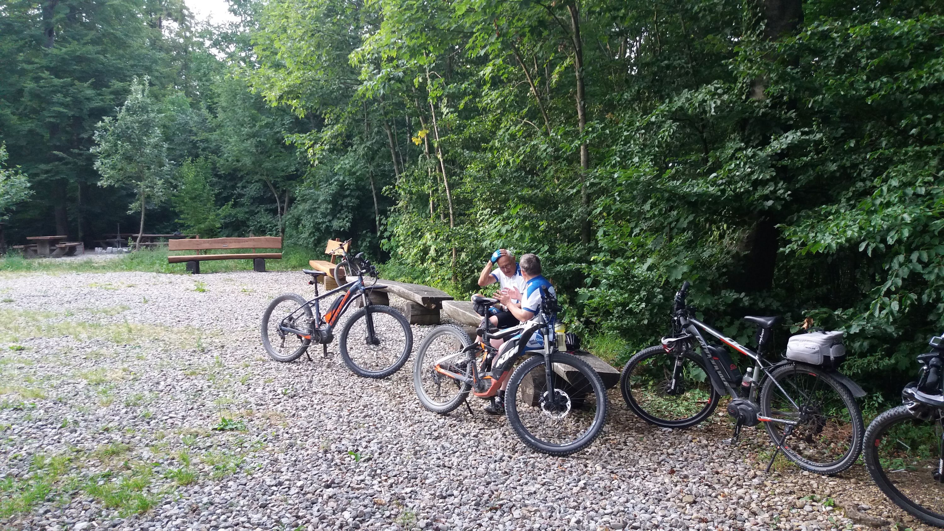 Treffpunkt war der Parkplatz beim Schulhaus Stumpenboden in Feuerthalen. An diesem Abend leitete Beat Schaber die abwechslungsreiche Bike-Tour der Gruppe A. Diese begann um 18:30 Uhr und es ging gleich auf der Naturstrasse ziemlich steil in den Wald, wo wir schon nach kurzer Zeit in einen schönen Singel-Trail einbogen. Hoch über Uhwiesen und vorbei an Wildensbuch radelte wir mal bergauf und mal bergab, abwechselnd auf Wald und Wiesenwegen. Nach ca 1 Stunde hatten wir unser Ziel, den Aussichtturm Hochwacht, erreicht. Schnell waren die Räder am Waldrand parkiert als Beat eine Tretkurbel, mit Pedal, am Fusse des Turmes liegen sah. Bald stellte sich heraus, dass sich diese von Peters Bike gelöst hatte. Die Kurbel hatte er wieder, aber jetzt mussten wir die Schraube finden, welche irgendwo im Schotter liegen musste. Nach gemeinsamer Suche fanden wir auch diese und Peter konnte die Tretkurbel wieder befestigen. Doch bevor wir den Rückweg antraten nahmen wir noch die 185 Stufen, zur obersten Plattform, unter die Füsse. Es hat sich gelohnt, denn dort oben hat man einen herrlichen Rundblick bis zu den Hegaubergen. Nach diesem Abstecher schwangen wir uns wieder aufs Rad und genossen die rassante Abfahrt Richtung Schlatt und weiter nach Feuerthalen.