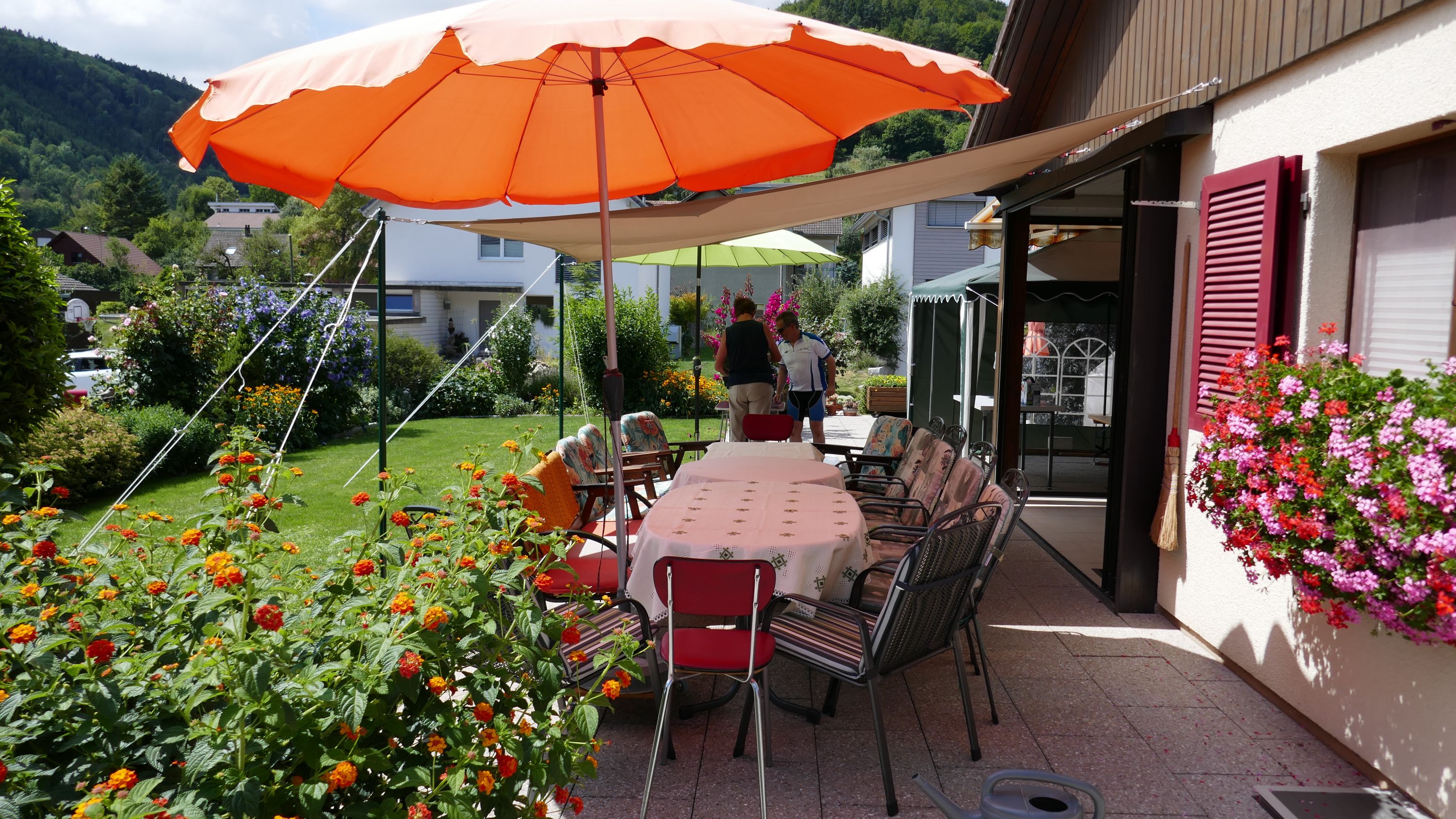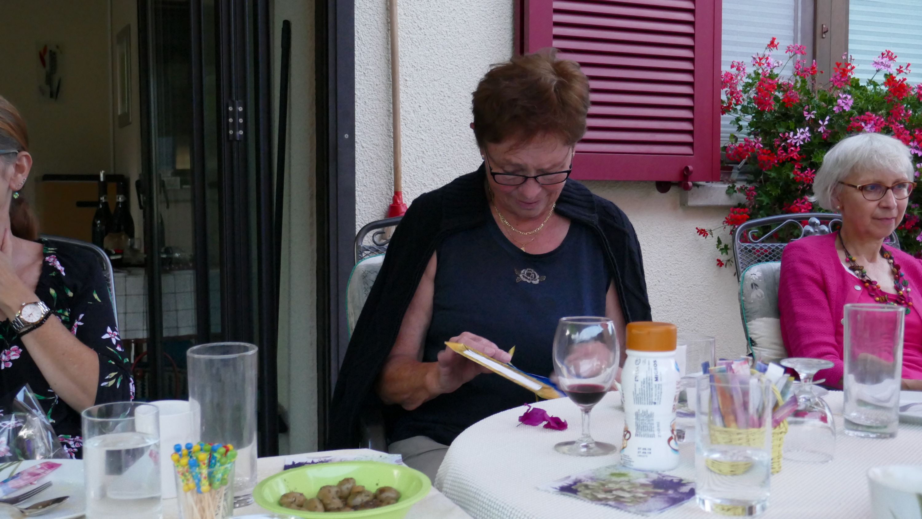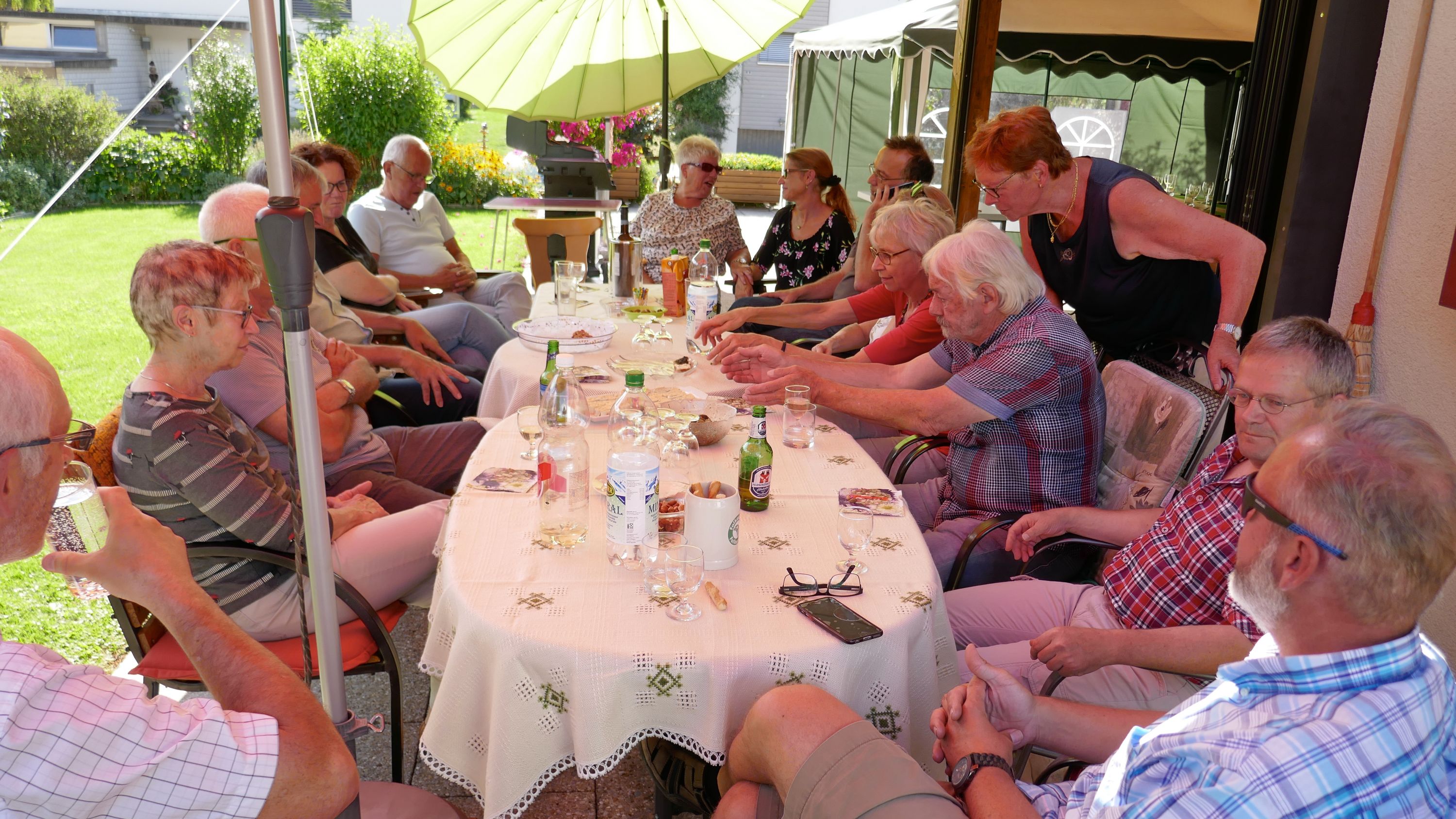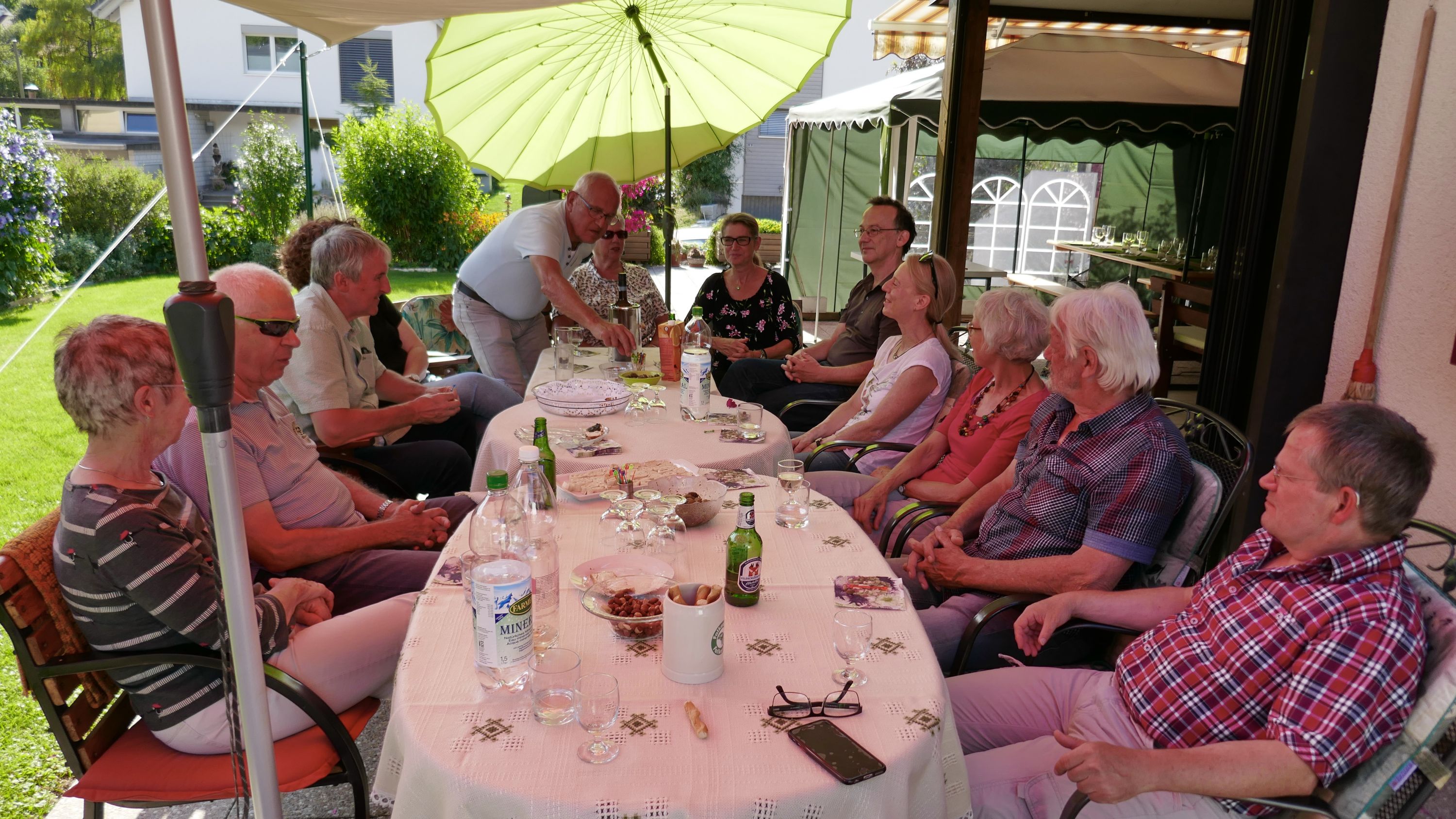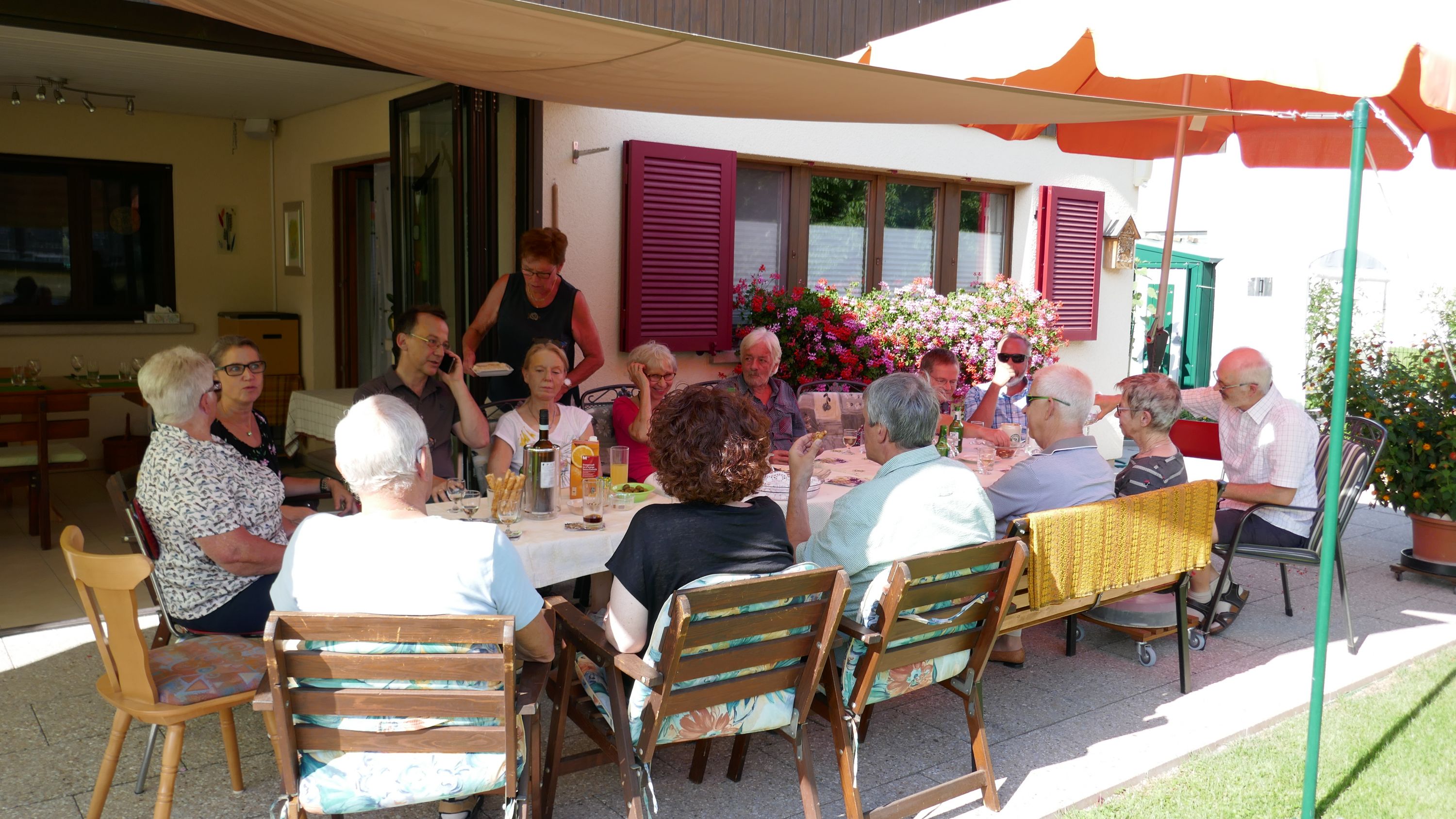 Danach war es Zeit den Rückweg anzutreten. Nach rasanter Talfahrt über das Staanerbergli und dem Osterberg, erreichten wir via Ladl Merishausen. Im Bodenwiesenweg wurden wir schon von Heidi und Jeannette empfangen. Nach dem sich die Biker erfrischt und umgezogen hatten begann der kulinarische Teil mit einem Apéro, zu dem auch dieses Mal die Gäste mit allerlei Gluschtigem beigetragen haben.