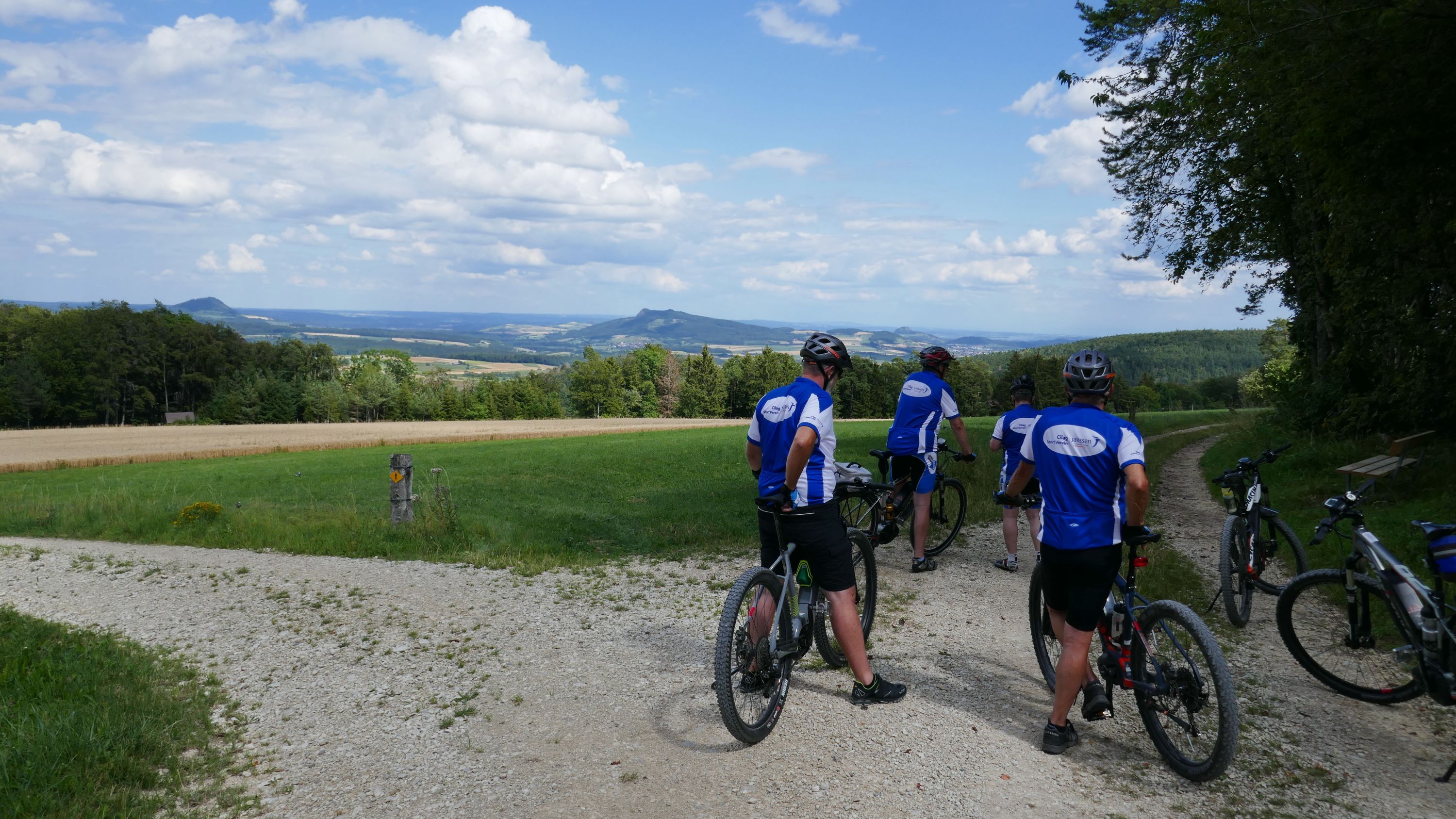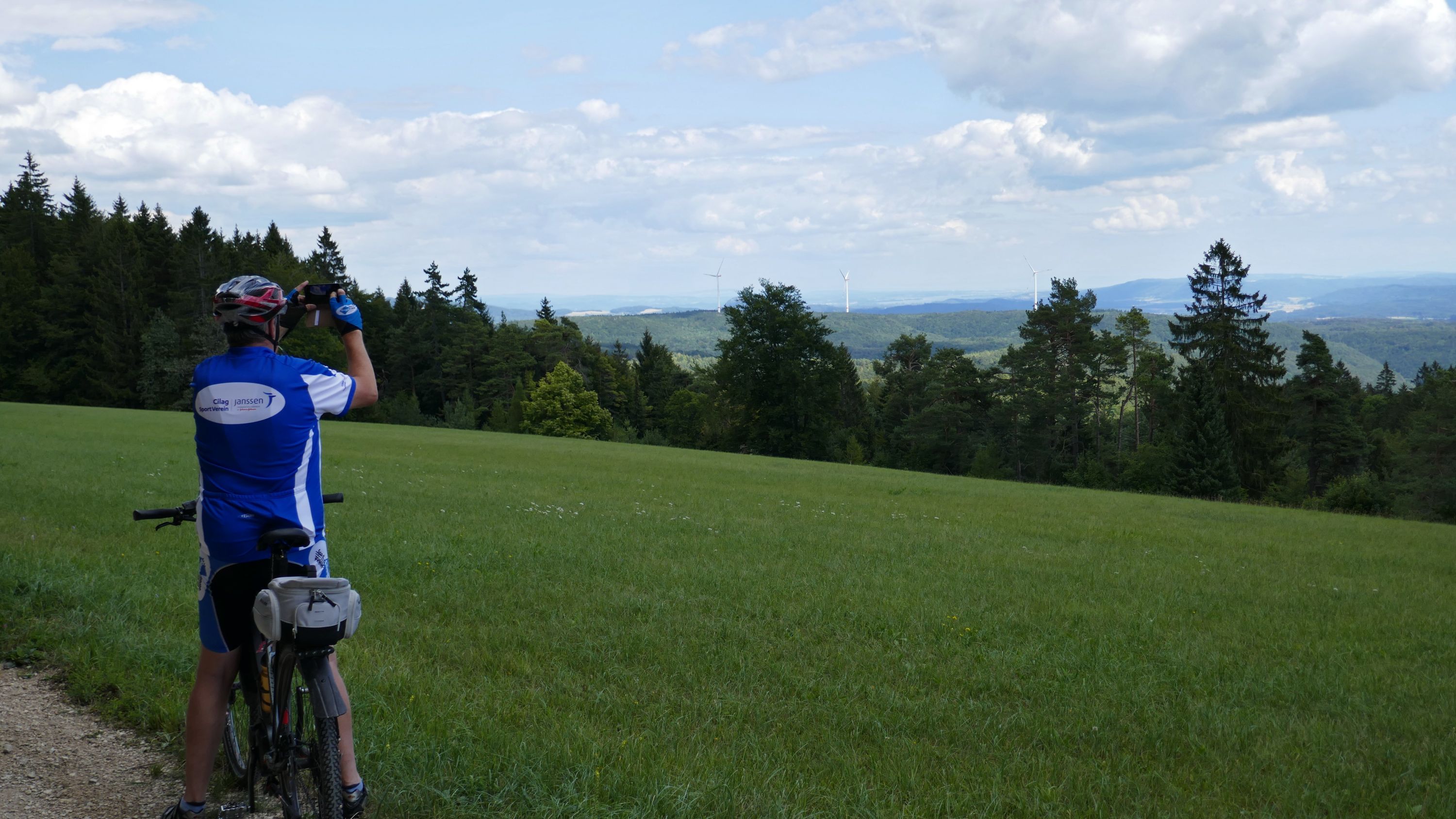 Nach dem unser Energiespeicher wieder mit der nötigen Flüssigkeit gefüllt war, schwangen wir uns in den Sattel und radelten auf einem schmalen Trail vorbei am Hagenturm zum Vorderen Randen. Auf dem schönen Aussichtspunkt oberhalb von Bargen verleitete uns die gute Sicht auf die Hegauberge zu ein paar schönen Fotos.
