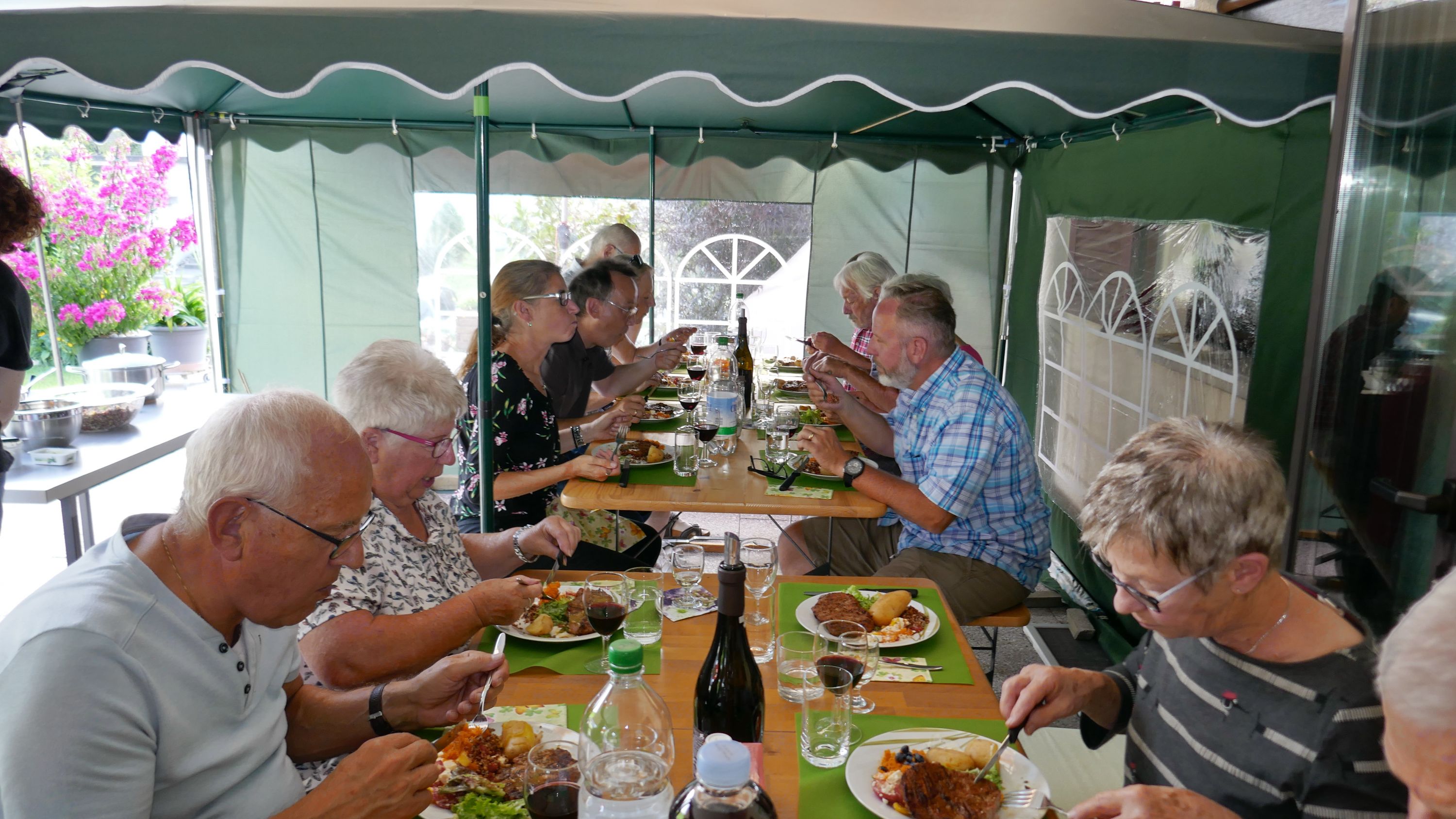 Es war zu erwarten, dass das Wetterhoch der letzten Tage auch am Wochenende noch wirksam sein wird. So waren wir uns sicher, dass wir das Partyzelt gegen die starke Sonnenbestrahlung aufstellen müssen. Zusätzlich montierten wir noch ein Sonnensegel damit unsere Gäste auch den Apéro im Schatten geniessen können.