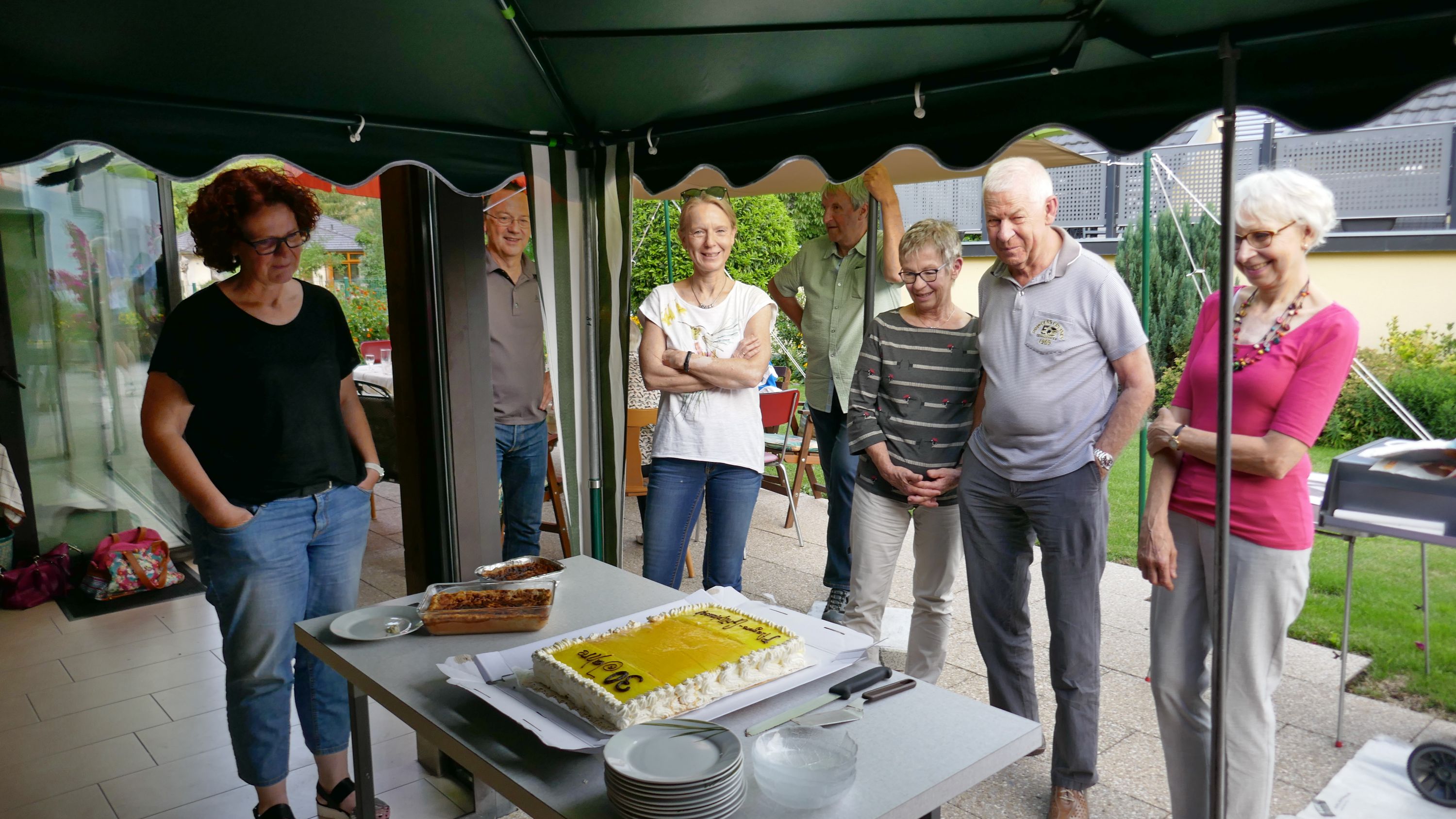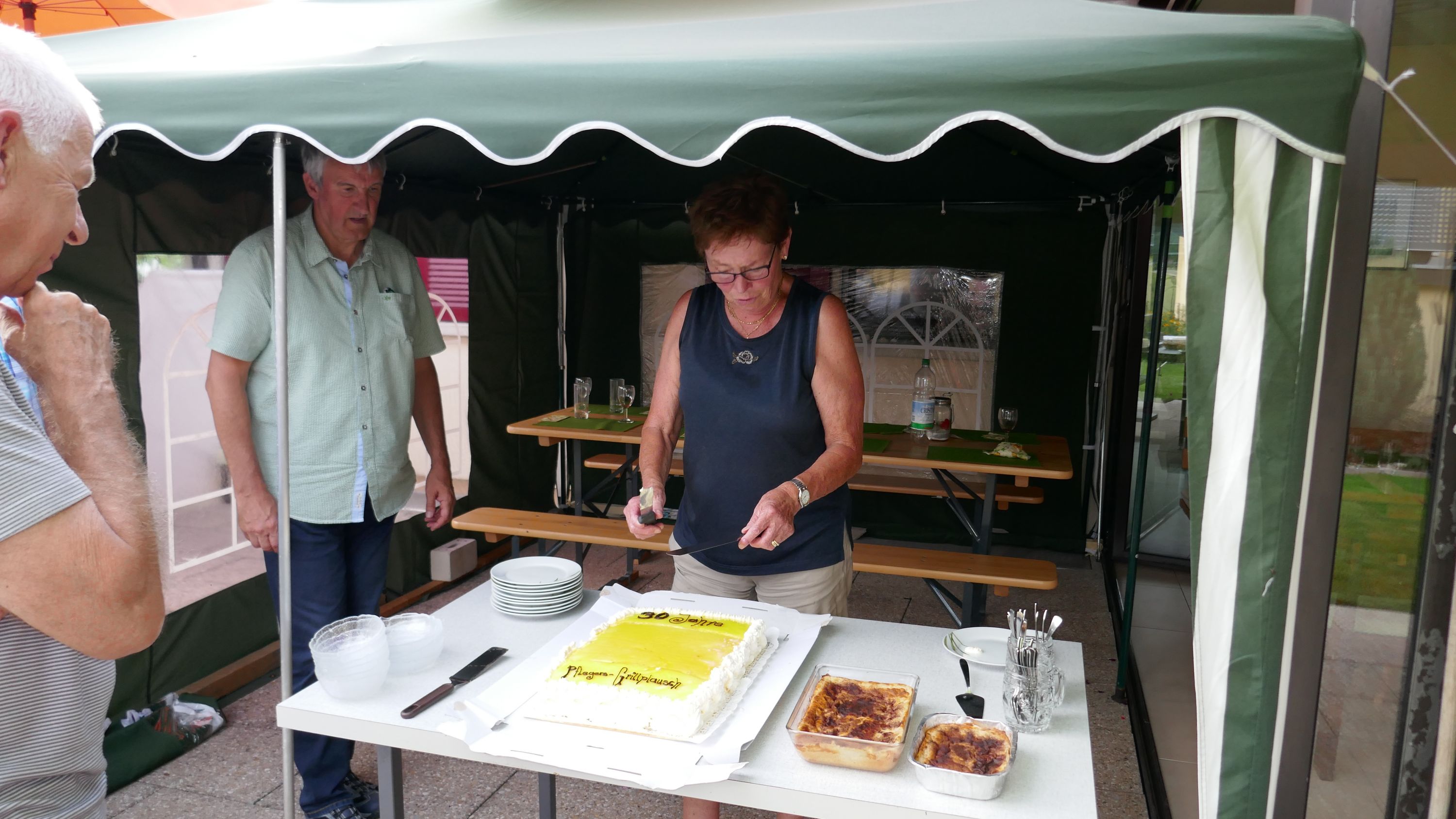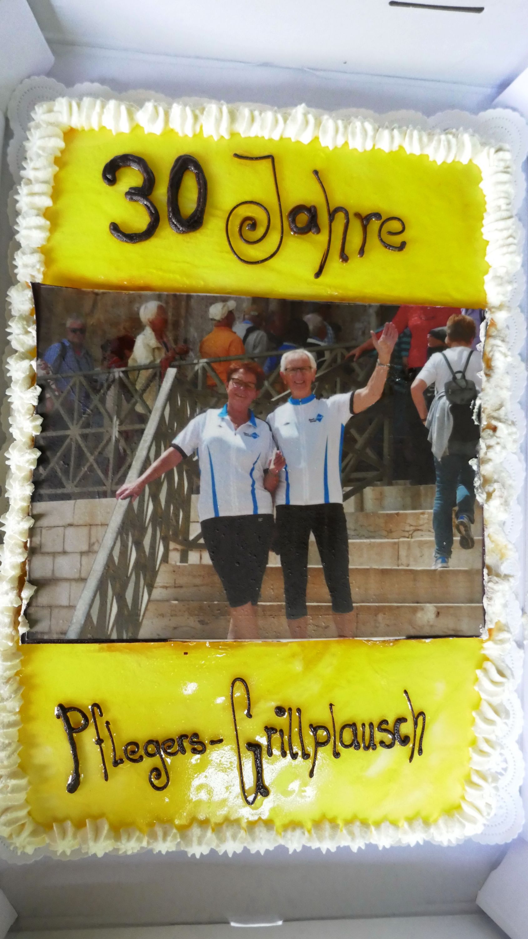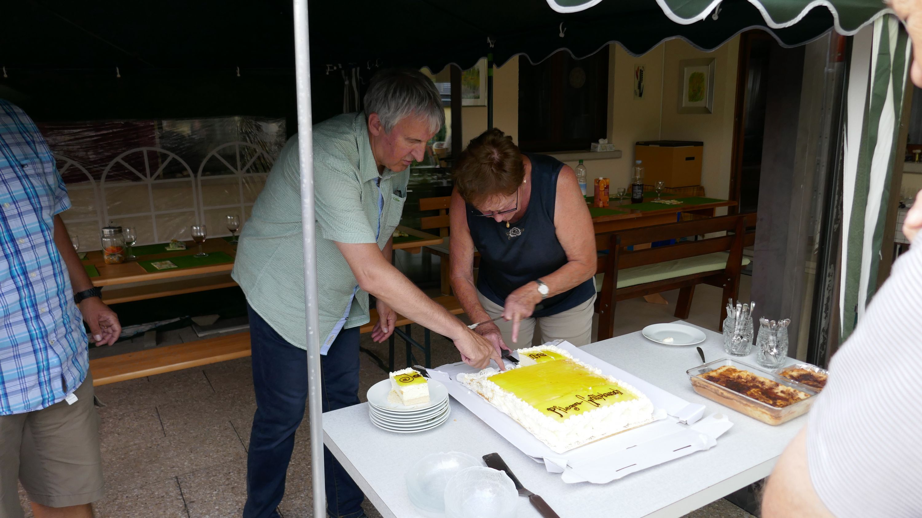 Da es dieses Jahr der 30. Grillplausch war der im Bodenwiesenweg 10 stattfand, haben sich Urs und Jeannette was Besonderes ausgedacht. Sie dankten Heidi und Viktor, im Namen des Veloclubs, mit einer originellen riesigen Torte, mit dem Konterfei der Beiden. Zusätzlich überreichte ihnen Peter je eine Tageskarte für einen schönen Ausflug.