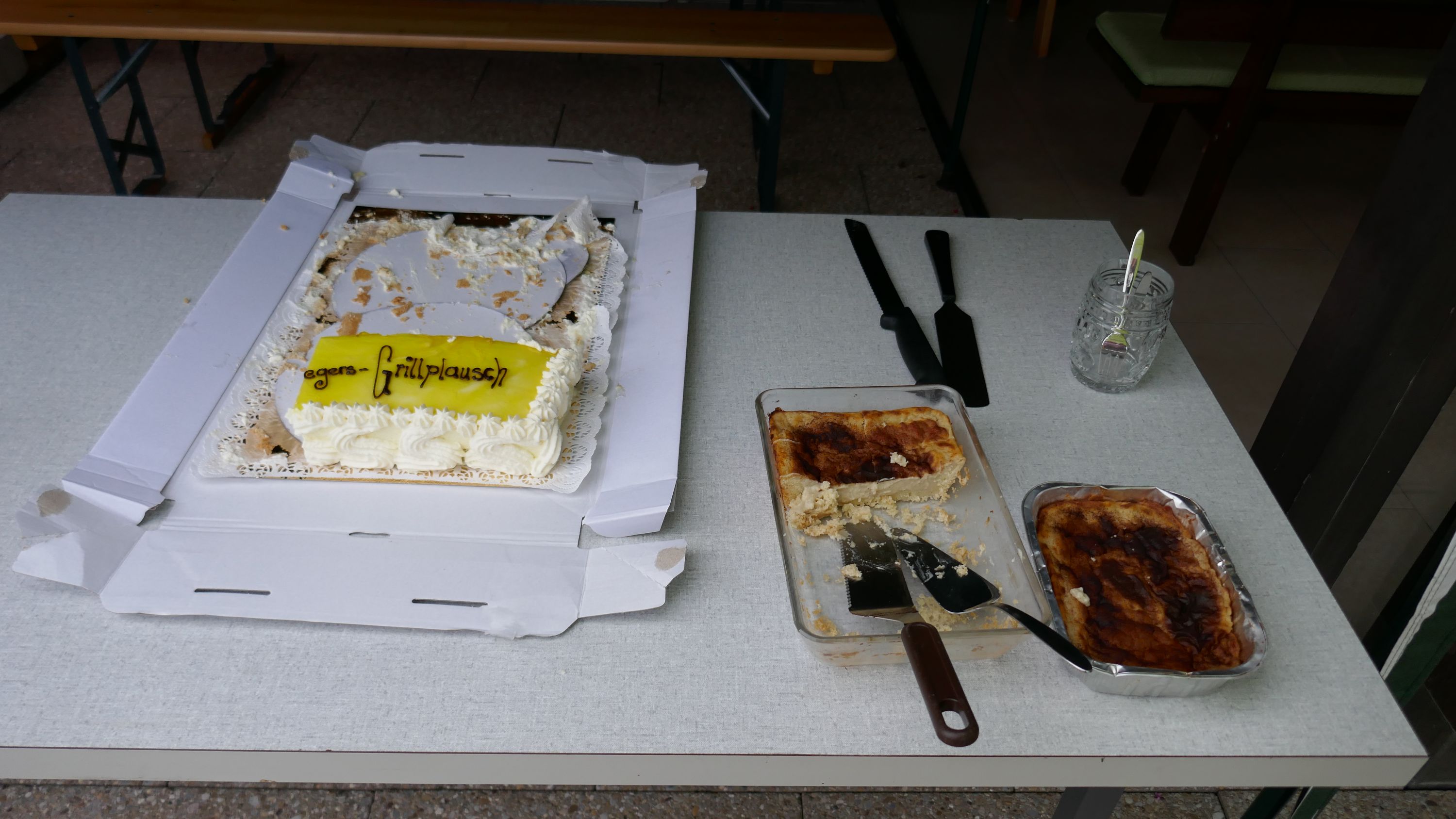 Zusammen mit den würzigen Salaten von Ruth, Bianka und Christine, und einem Glässchen Wein, ergab dies ein feines Nachtessen. Mit einem Cheesecake von Gelgia und dem Clace von Elmar war auch für den Dessert gesorgt.
