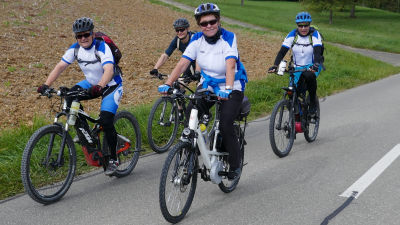 Bei etwas unsicherer Wetterlage trafen sich am Samstag den 7. September 2 Bikerinnen und 6 Biker um 10:00 h beim „Alten Schützenhaus“ auf der Breite. Wir fuhren Richtung Logierhaus –Schweizersbildstrasse – Dachsenbühl – Herblingen und via alte Thayngerstrasse – Bibern – Altdorf nach Opfertshofen. Im Reiatstübli war für uns reserviert. Nach einem guten Mittagessen schwangen wir uns wieder in den Sattel. Auf der ehemaligen Zollstrasse erreichten wir bald Wiechs am Randen, wo wir unsere Fahrt nach Neuhaus fortsetzten. Von dort ging es stetig bergauf, vorbei am Buchemer Stumpen, zum Schwarzen Stein. Für einen kurzen Trinkhalt unterbrachen wir die Tour und radelten dann weiter zum Hagenturm auf 912 m üM. Ausser 2 Teilnehmer stiegen alle die 225 Stufen hinauf zur Aussichtsplattform, um das PC-7 Team der Luftwaffe zu sehen, welches aus Anlass der Schmerlat-Flugtage ihre Flugkunst zeigte. Leider war die Sicht wegen der starken Bewölkung nicht gerade spektakulär, aber man konnte sie gut hören. Als wir uns wieder auf‘s Bike schwangen begann es leicht zu rieseln. Dies konnte uns aber nicht abhalten die Tour fort zu setzen da wir uns sicher waren, dass es nur von kurzer Dauer sein wird. Auf einem schönen Singletrail ging es hinunter zur Forststrasse die zur „Ob Lucken“ führt. Beim Absprungpunkt für die Gleitschirmflieger machten wir einen kurzen Halt und waren uns einig, wir bleiben lieber auf dem Boden.