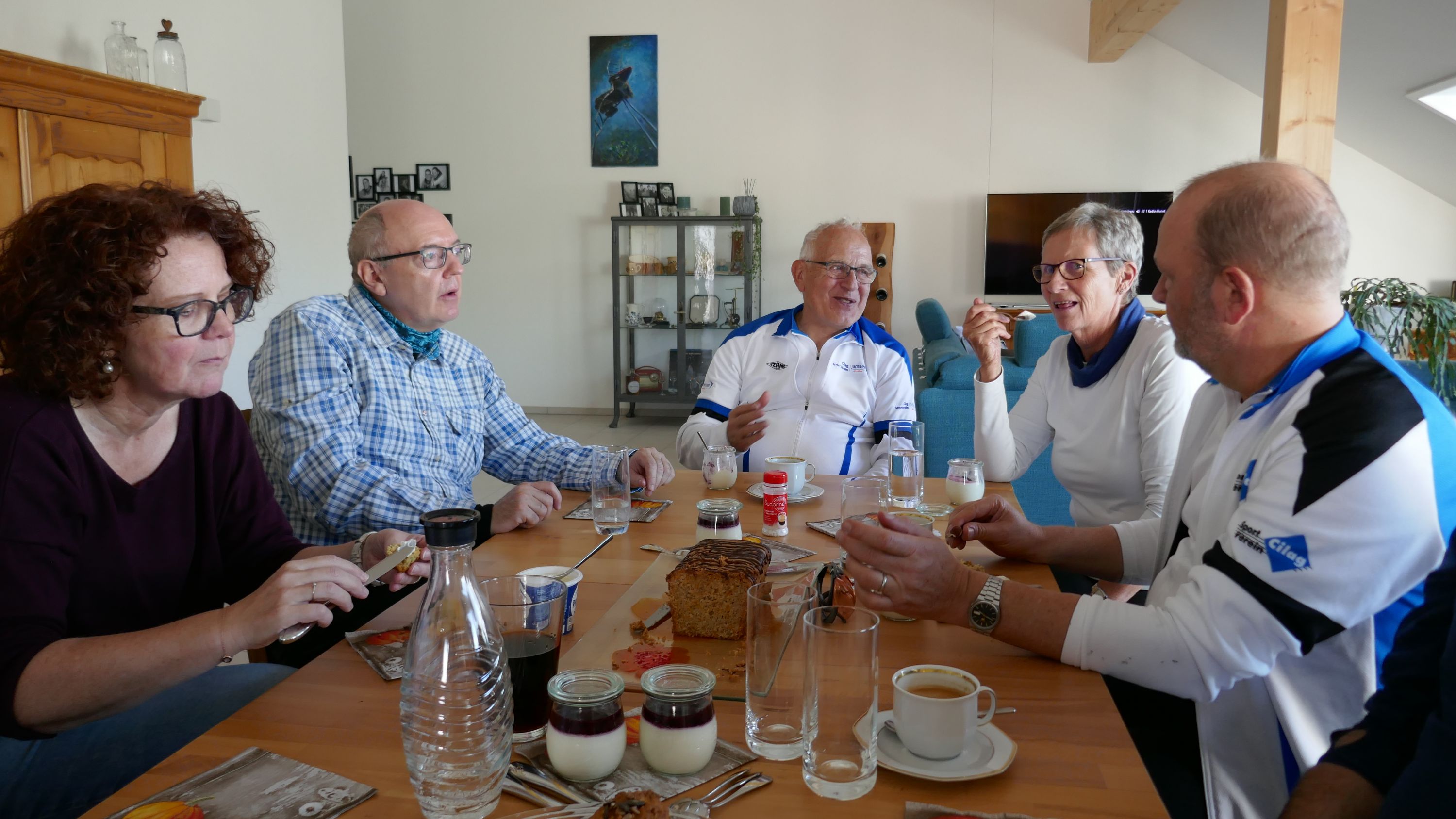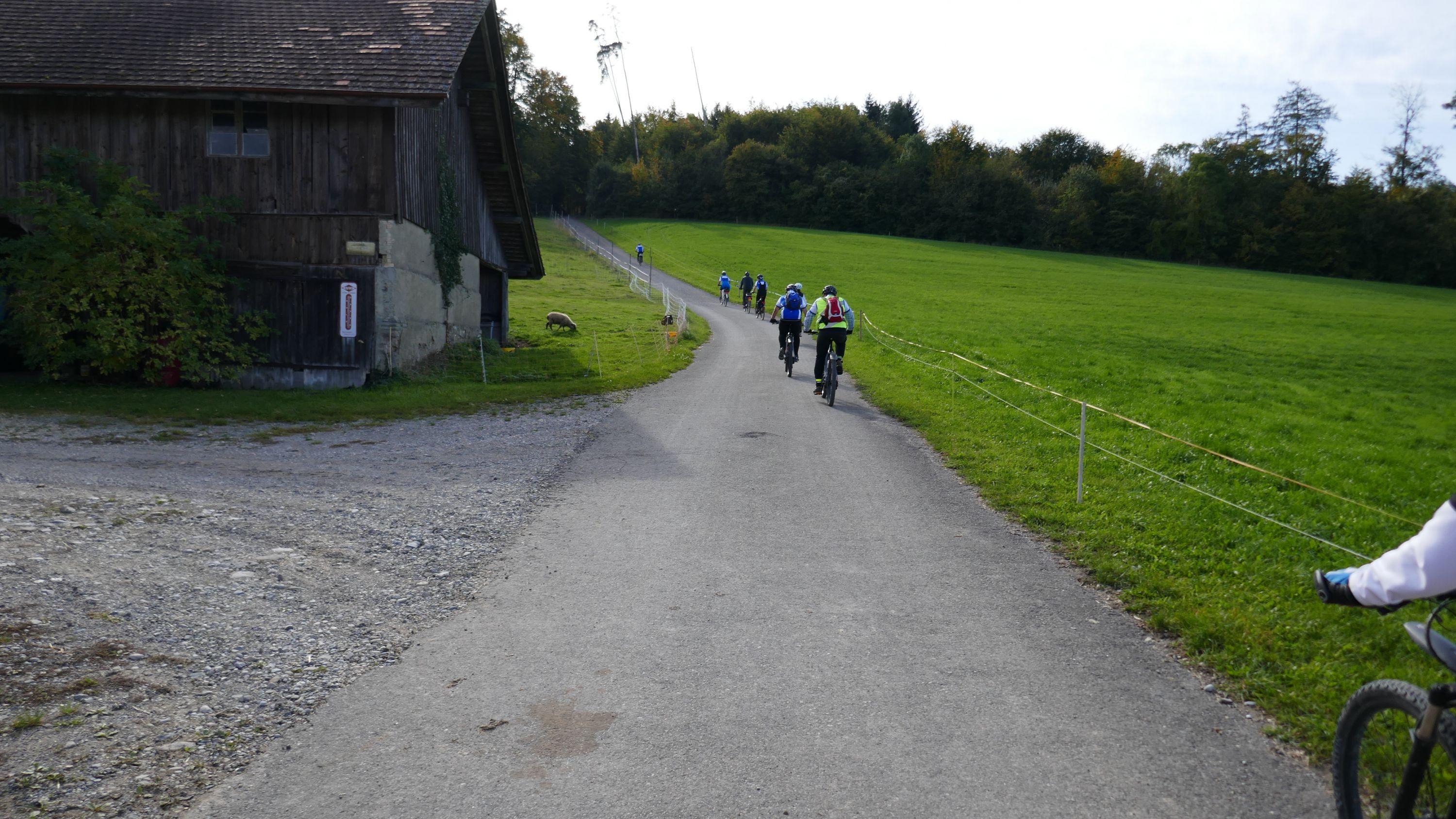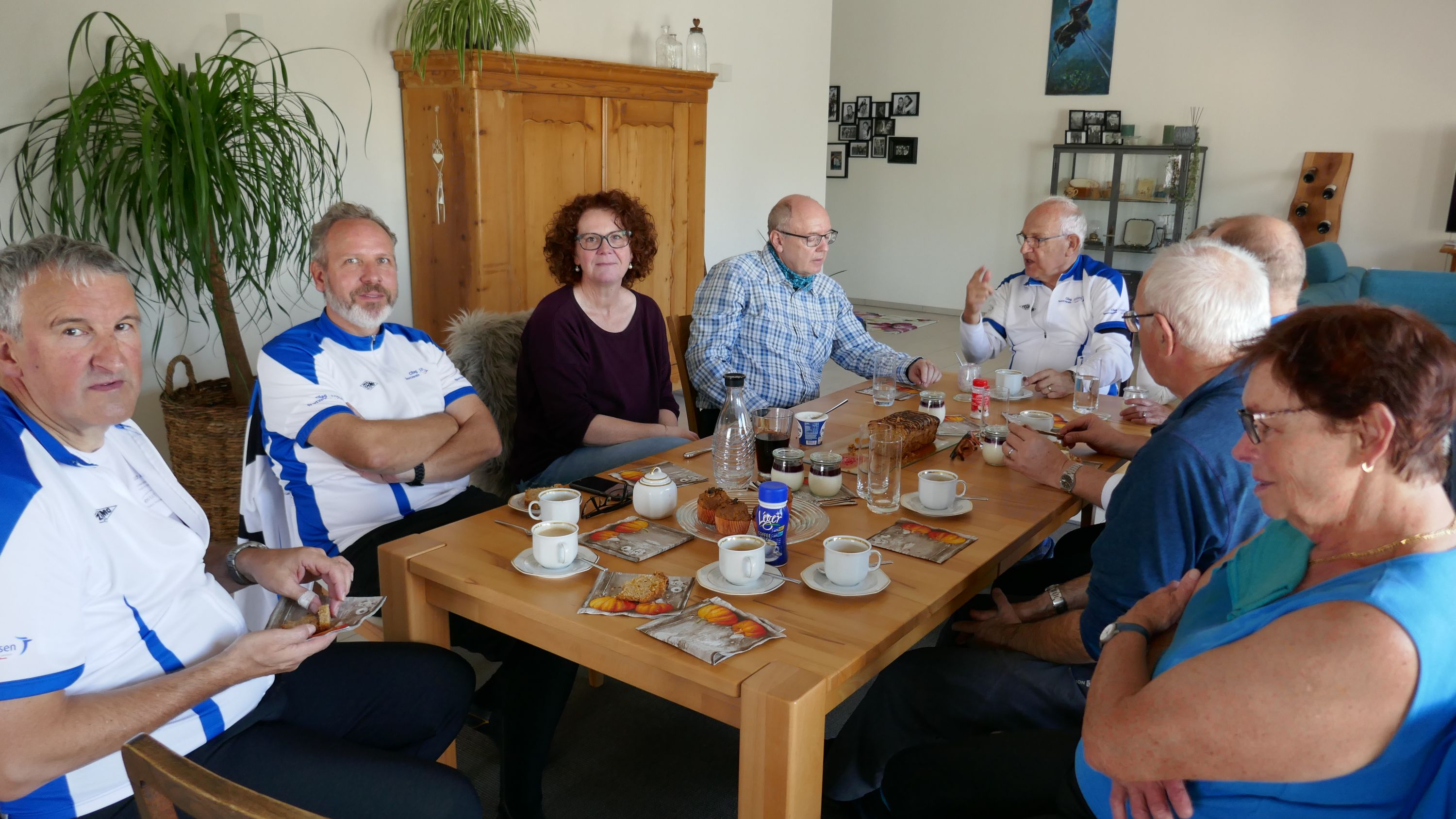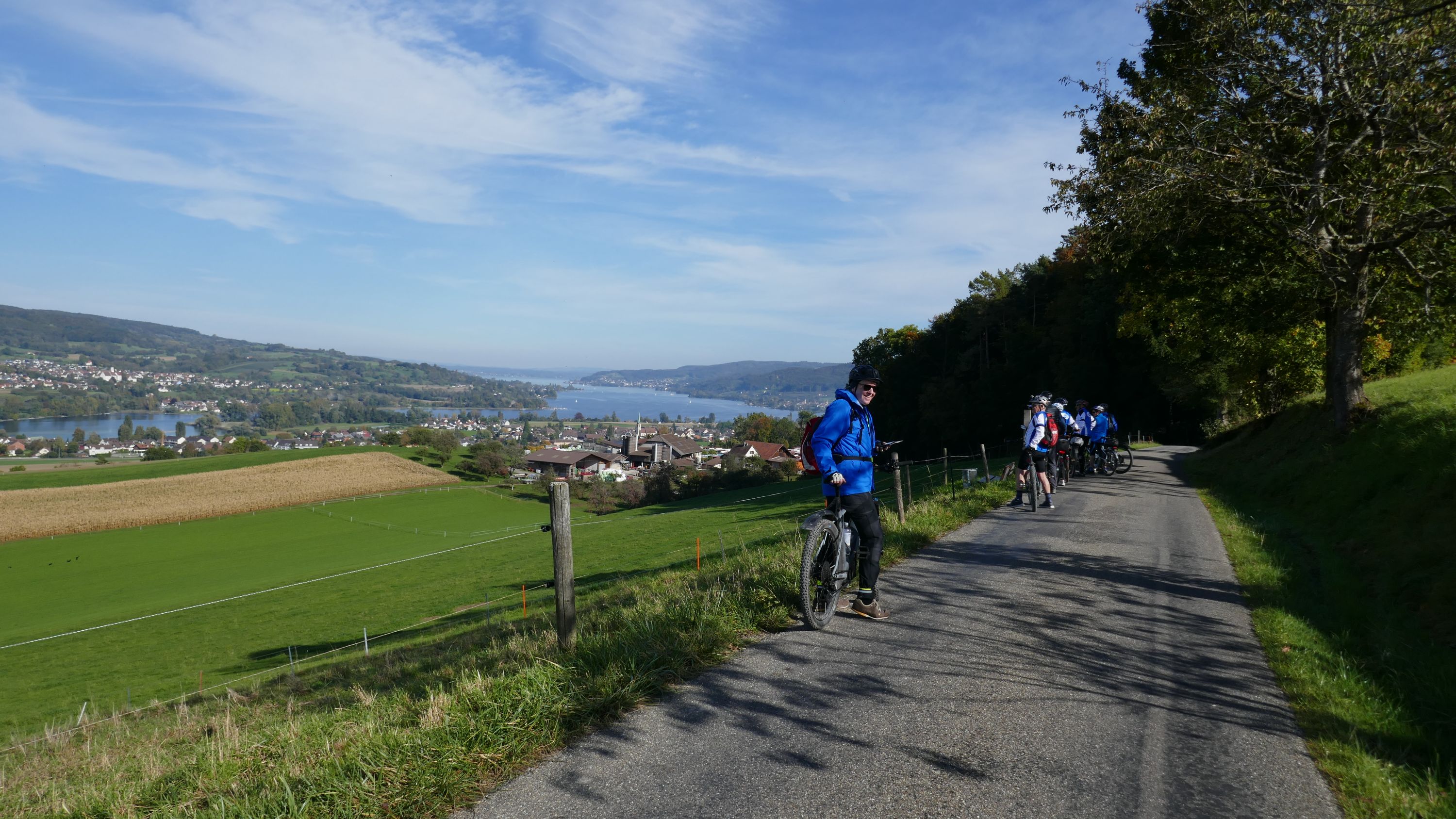 Im Restaurant Alpenblick machten wir Mittagspause und wurden von den Wirtsleuten freundlich empfangen. Nach dem wir uns mit einen feinen Essen für die nächste Etappe gestärkt hatten traten wir wieder in die Pedale. Die Strecke führte über schmale geteerte Wege und gut fahrbare Naturstrassen nach Pfyn. Hier hatten wir wieder einen schönen Ausblick auf die herbstliche Landschaft bis hinüber zum Ottenberg. Über Bethlehem (TG) - Ober-Hörstetten – Reckenwil schwenkten wir auf den Veloweg Nr 82 Richtung Gündelhart/Diessenhofen ein. Nach Ammenhausen hatten wir die letzte Gelegenheit für einen Blick auf die Alpenkette, denn dann kam der steilste Aufstieg dieser Tour auf den Seerücken. Oben angelangt legten wir wieder einen kurzen Halt ein und zogen uns die Windjacken über, denn jetzt ging es auf rassigen Abfahrten Richtung Eschenz. Doch vorher zwang uns die wunderbare Aussicht auf den Untersee abermals zu einem kurzen Halt für ein schönes Foto. Nach 52 km endete die interessante Rundfahrt in Stein am Rhein und hier kam die schönste Überraschung. Wir wurden von Jeannette und Urs zu Kaffe und Kuchen eingeladen. Entspannt liessen wir diesen sportlichen Tag ausklingen, in der einhelligen Meinung, dass es ein wunderbarer Saisonabschluss war, bei dem uns Urs ein weiteres Mal auf einem landschaftlich schönen und abwechslungsreichen Rundkurs, sicher vom Start zum Ziel geführt hat und dafür möchte ich ihm im Namen aller Teilnehmer ganz herzlich danken.