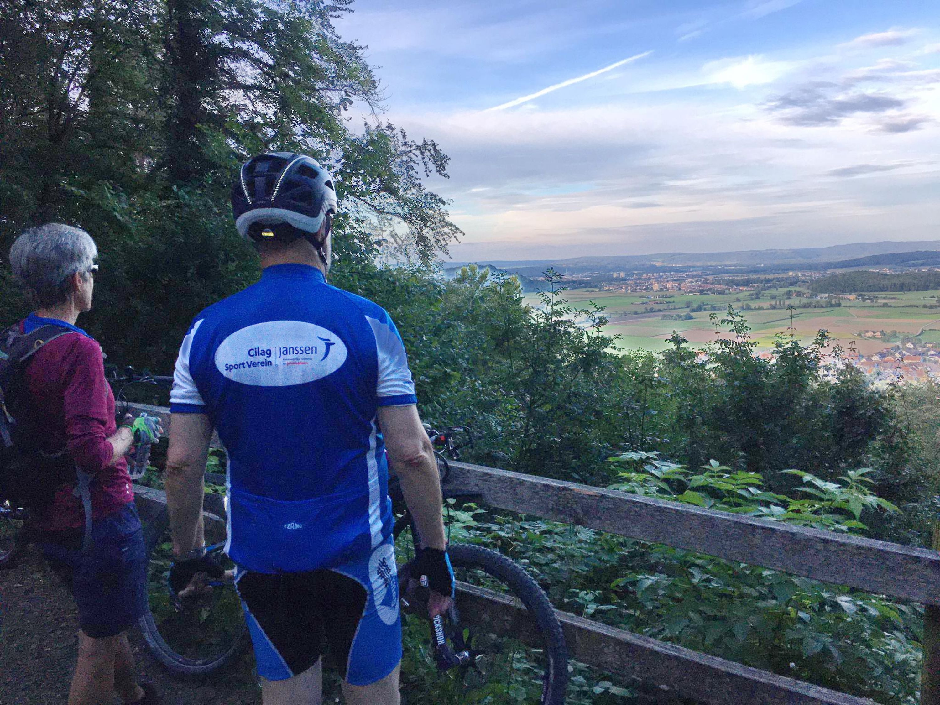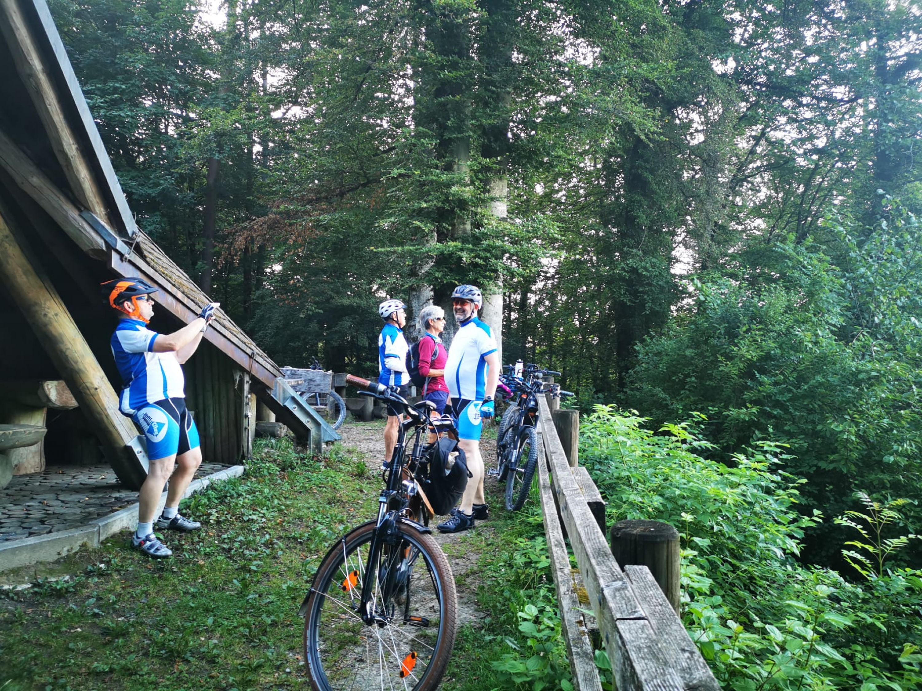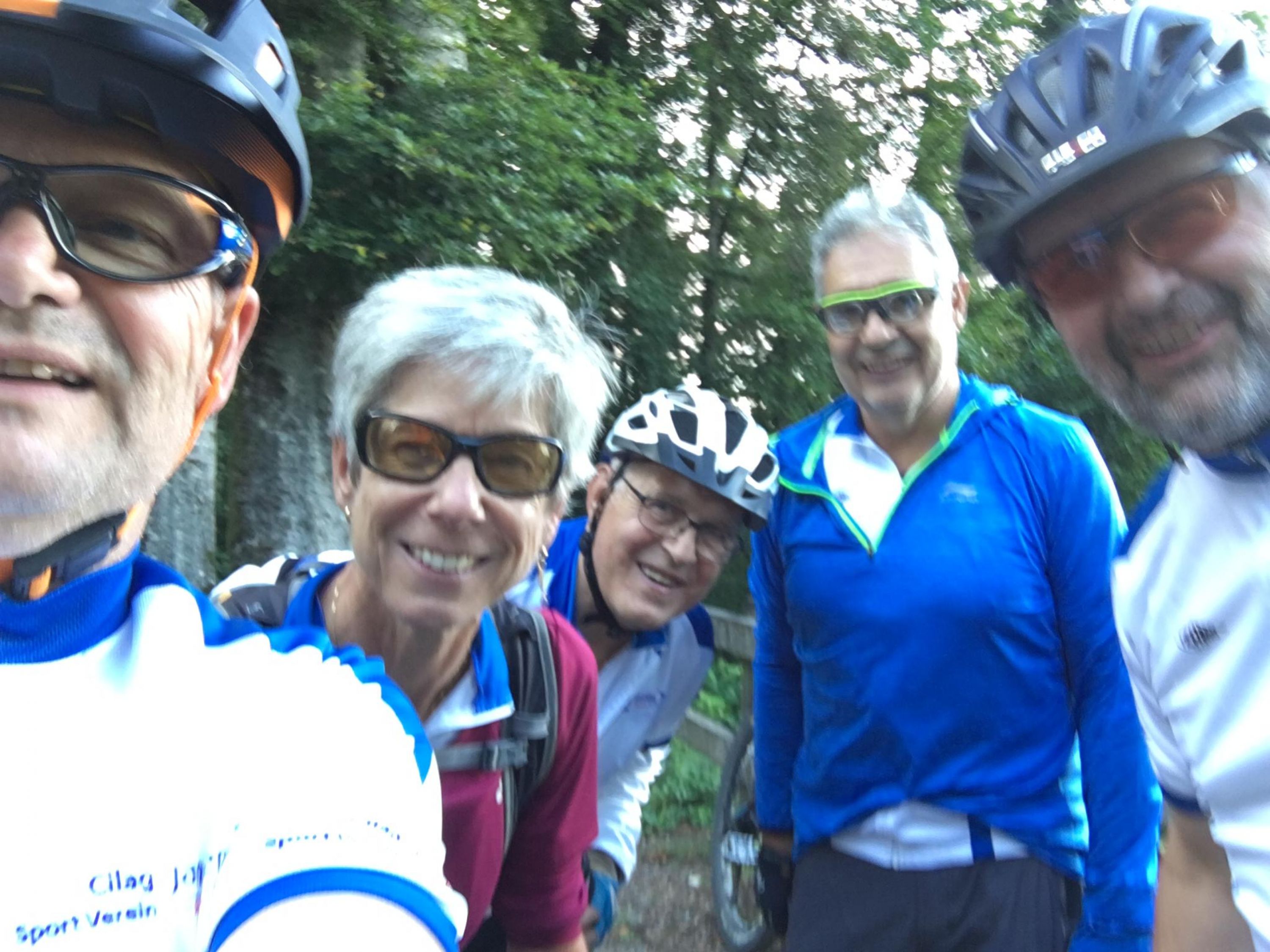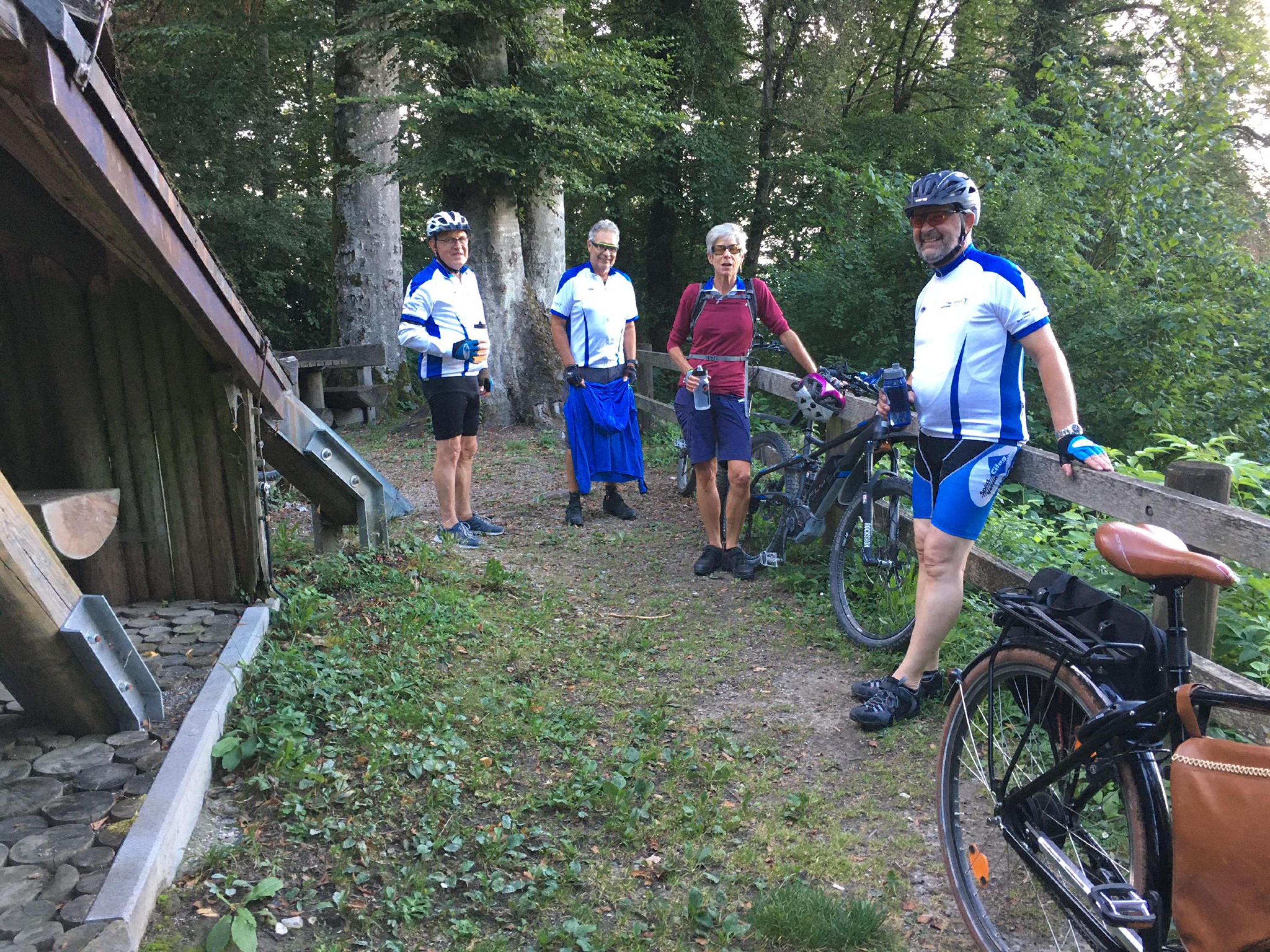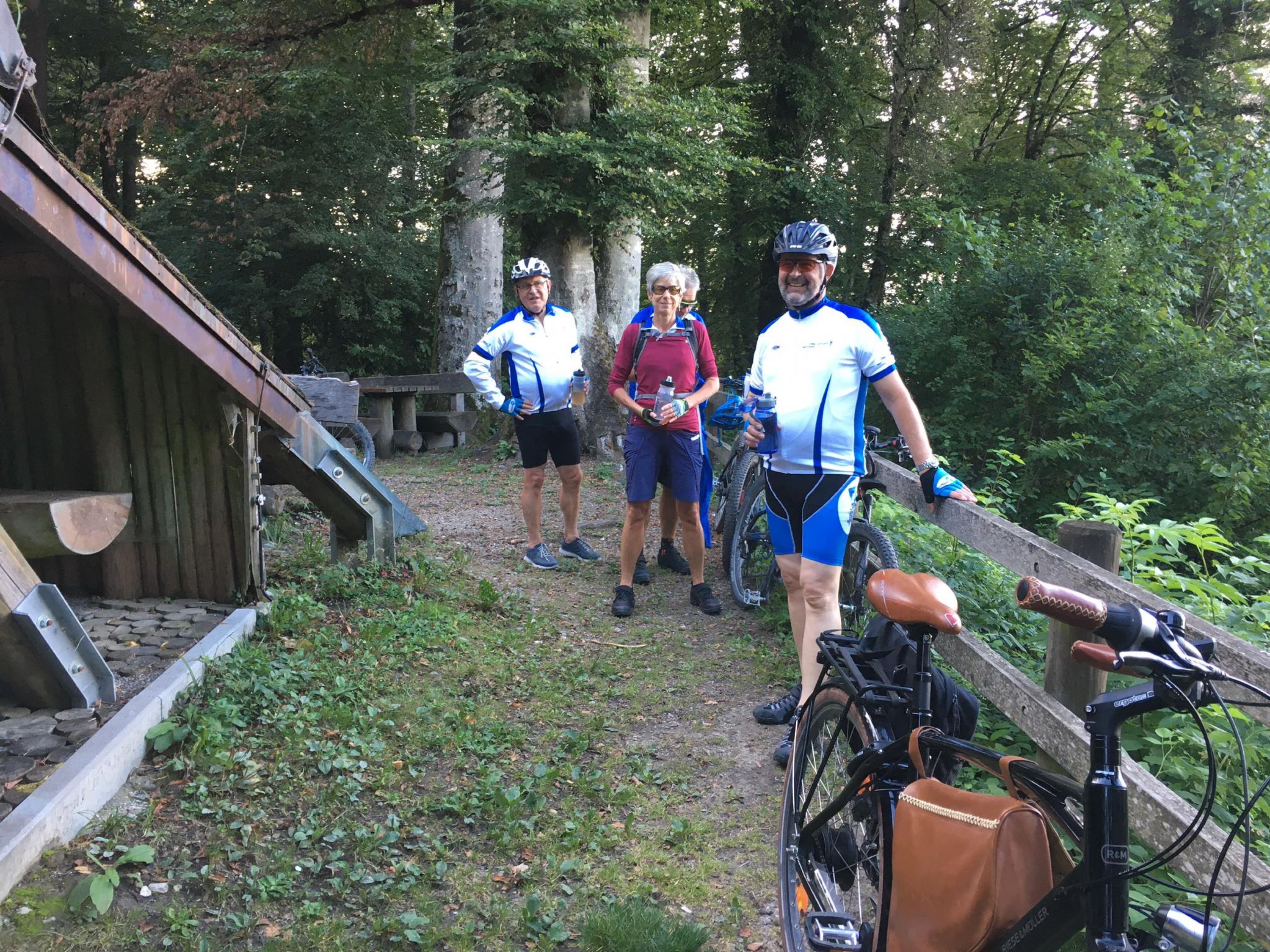 Marianne führte uns ins Herblingertal, vorbei am Forsthaus nach Gailingen, dann hoch zum Ramsemer-Blick, wo Martin Bliestle das erste Mal war. Retour über die Laag nach Büsingen, wo sich Schabers von uns verabschiedeten. Wir 3 radelten via Robinson Spielplatz hinunter ins Herblingertal und von dort direkt zum Restaurant Adler, wo wir bei Bier und Brezel diesen sportlichen Abend beendeten. Allgemeiner Tenor : Schöön war‘s
