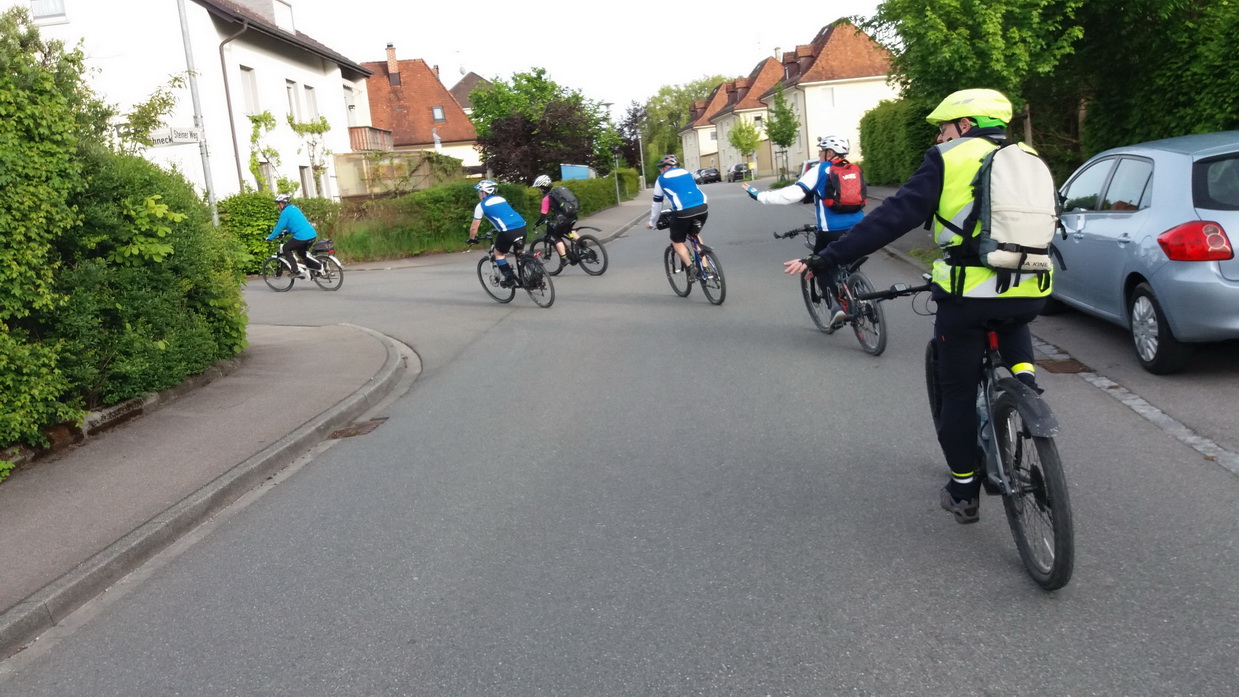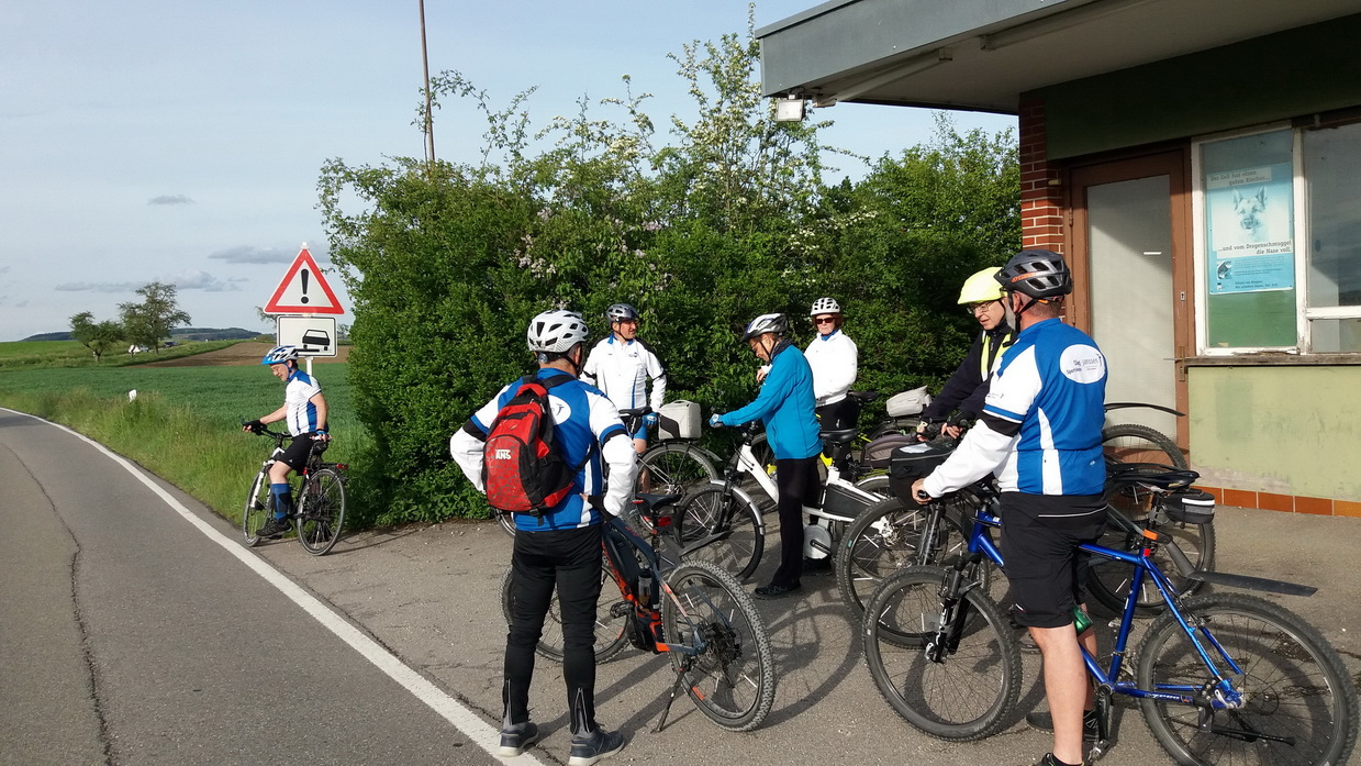 Bei kühlen ( 17 ° C ) aber trockenem Wetter trafen sich 3 Bikerinnen und 6 Biker zur Abendtour bei der Post Herblingen. Nachdem Peter, Nadja, die einmal bei uns schnuppern wollte, begrüsst und vorgestellt hatte starteten wir. Da wir wegen schlechten Wetter erst das 2. Mal eine Abendtour durchführen konnten, war die Runde von der Länge und Steigung her gerade richtig. Sie führte über Thayngen - Gottmadingen - Hofacker - Schüppeleiche - Ramsen - Buch - Bietingen - Thayngen - Post Herblingen ( 36 km )