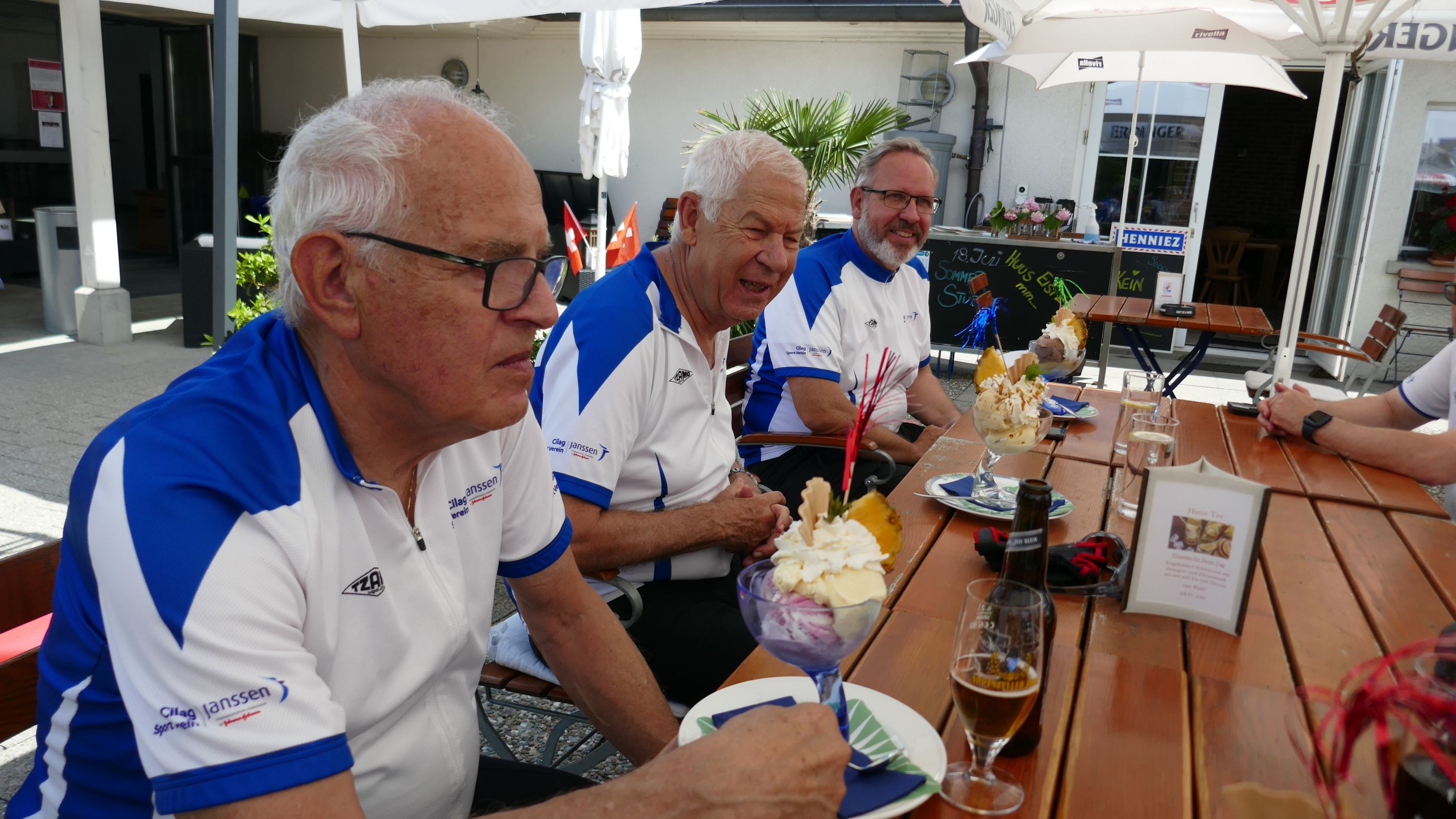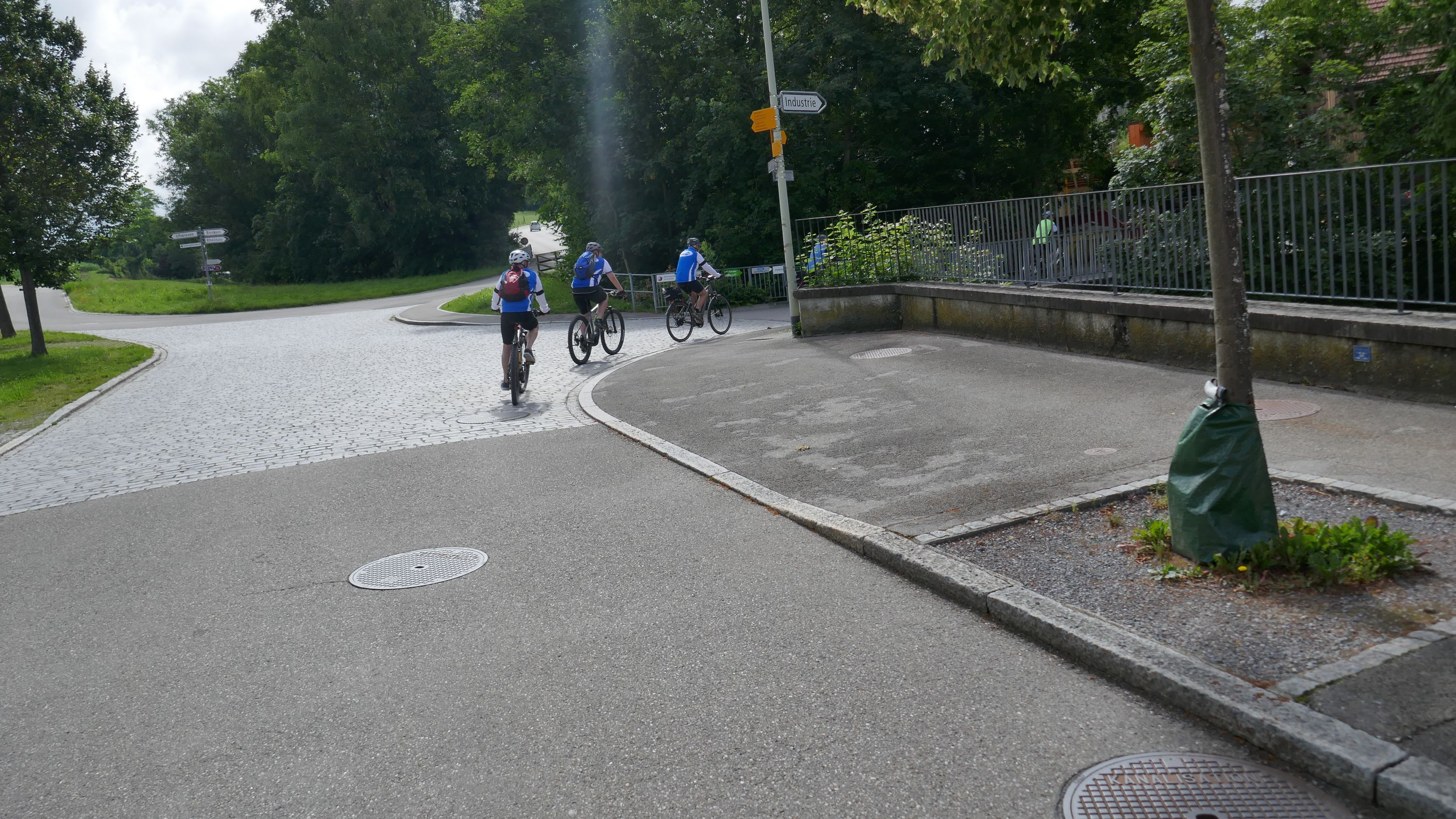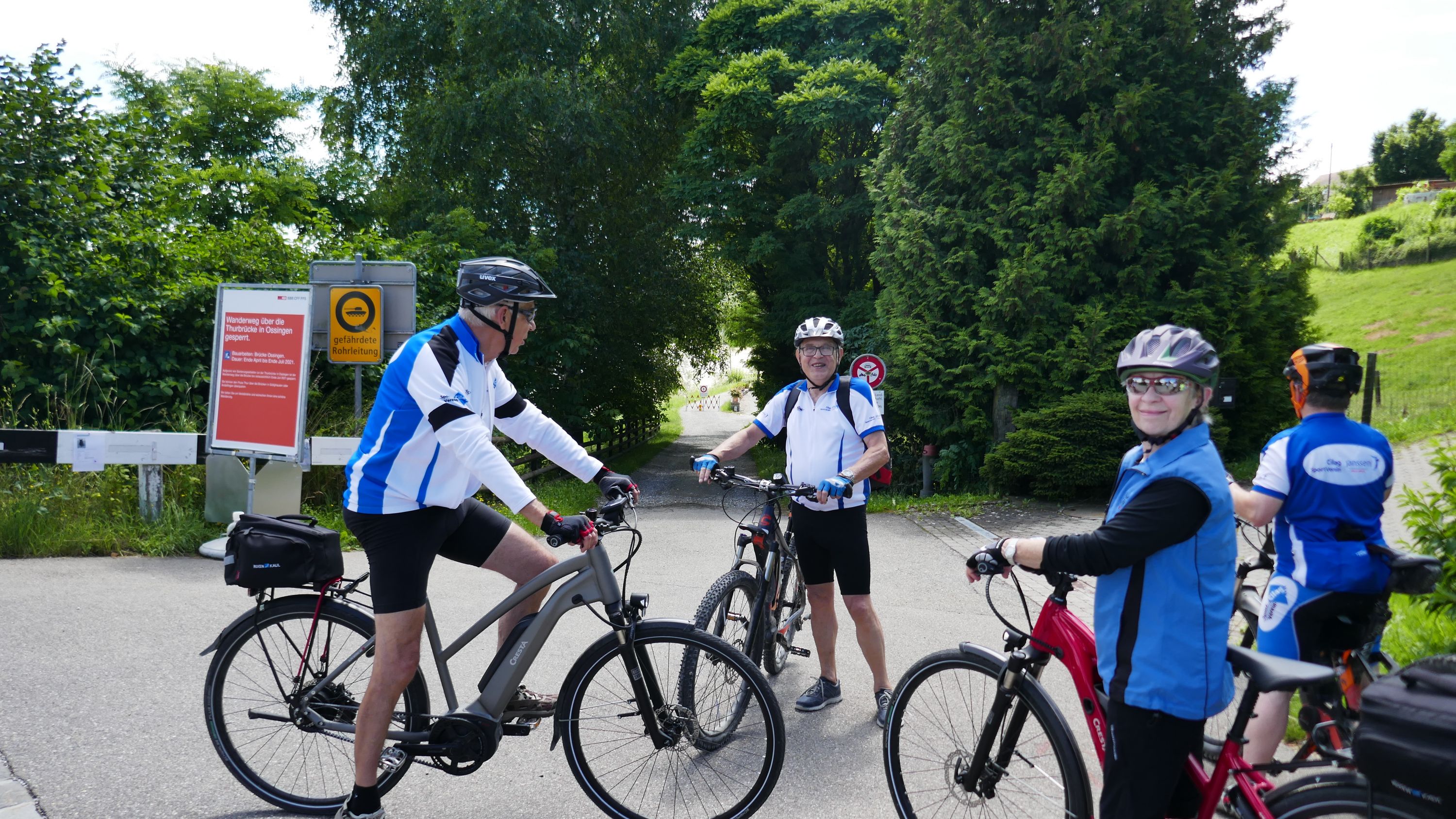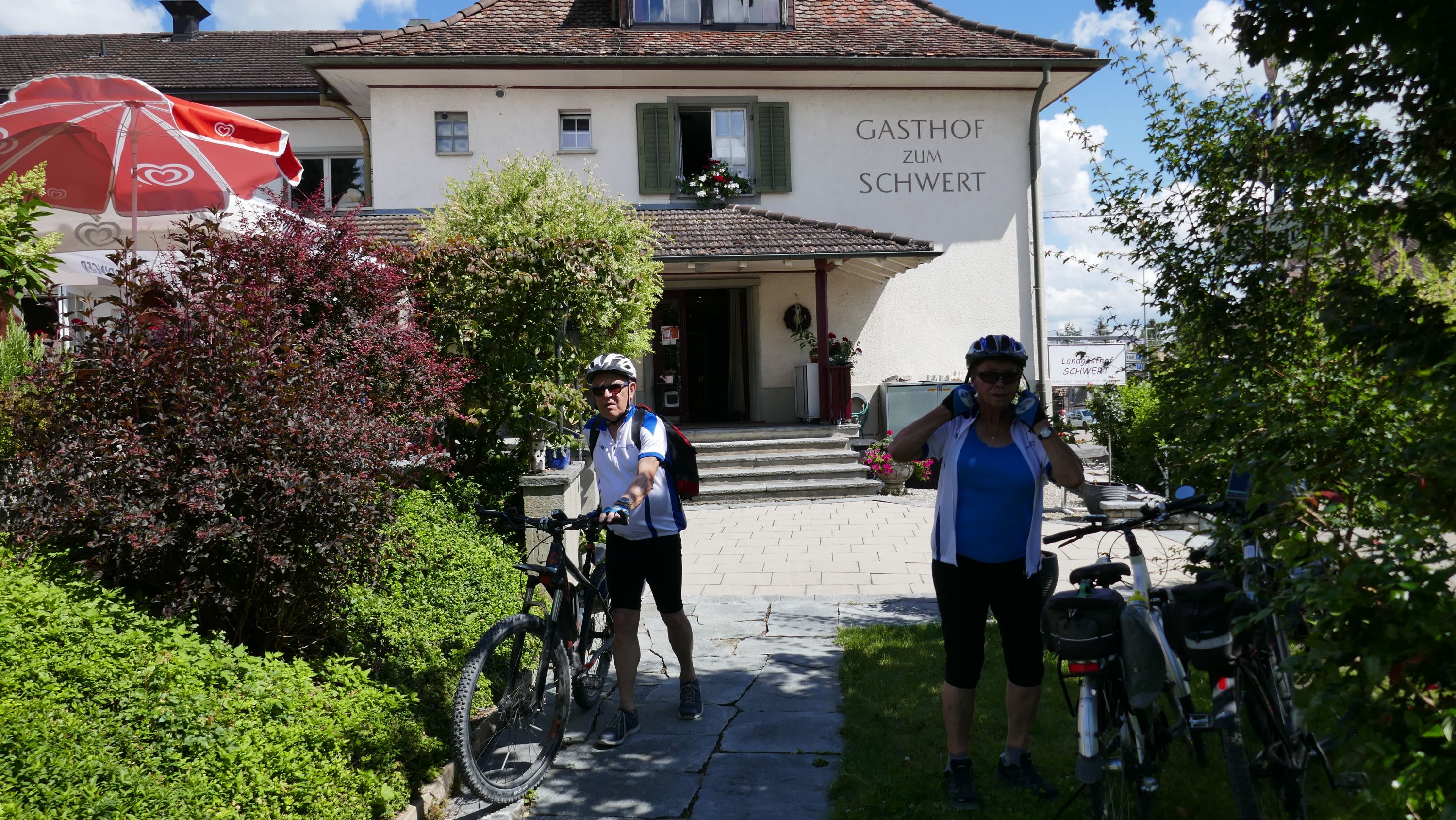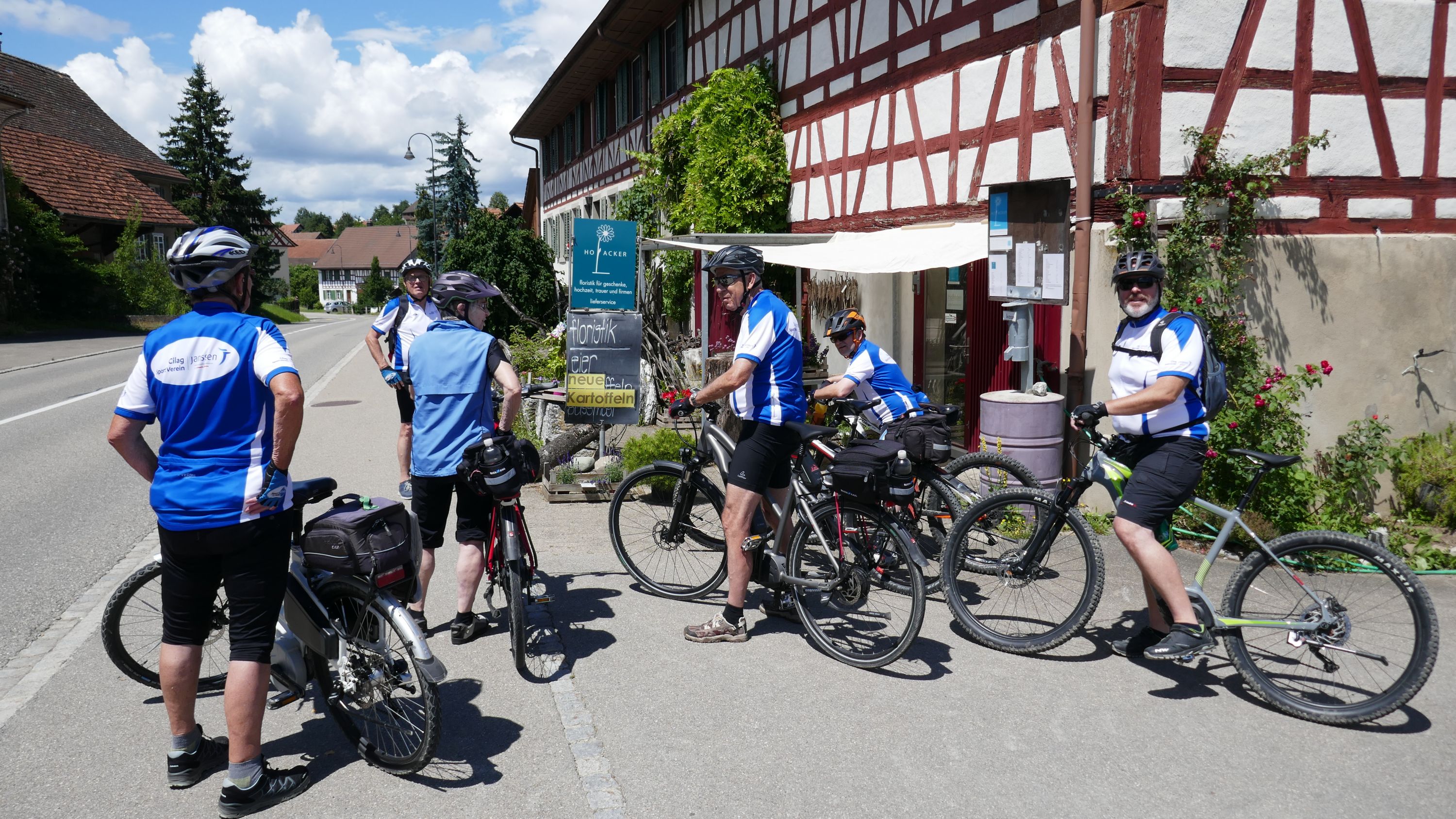 Gestärkt und ausgeruht starteten wir zur nächsten Etappe, Thur aufwärts. Da der Veloweg auf dem Damm, wegen Hochwasser gesperrt war, fuhren wir aussen herum. Auch diese Strecke war offiziell gesperrt, doch wir riskierten es. Aber schon nach kurzer Fahrt kamen wir an eine Stelle auf der das Wasser ca. 15 cm hoch über die Strasse lief, was uns aber nicht hinderte und den Vorteil hatte, dass unsere Reifen wieder sauber waren. Bei Altikon überquerten wir die Thur und radelten auf einer leichten Steigung über Niederneunform – Oberneunform nach Oberstammheim, wo wir uns im Gasthof Schwert einen feine Cup genehmigten. Zur Überraschung wurde unsere Konsumation von der Clubkasse offeriert, was hier nochmals herzlich verdankt sei.