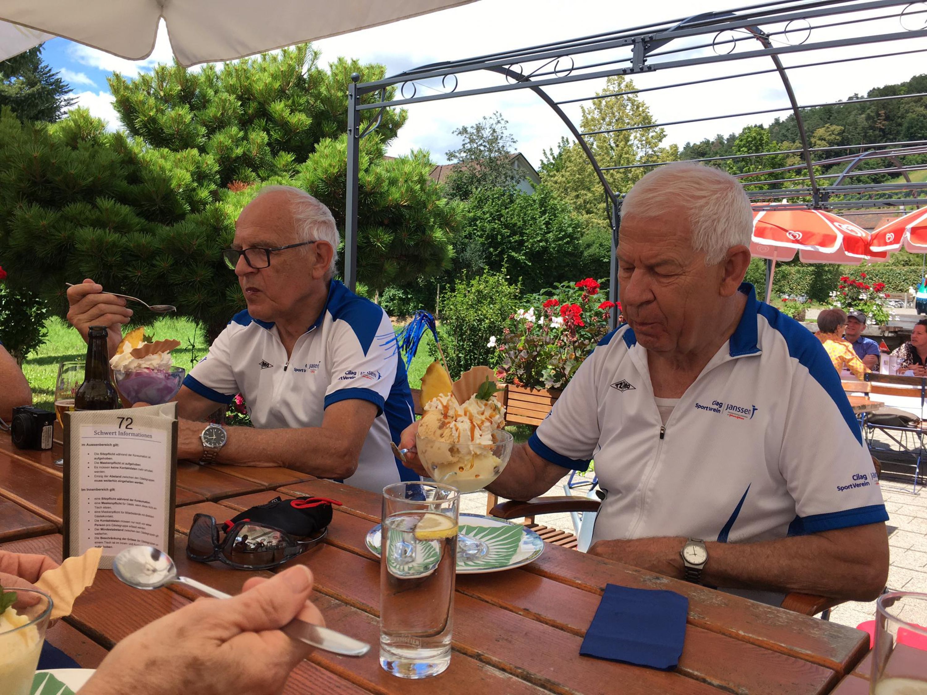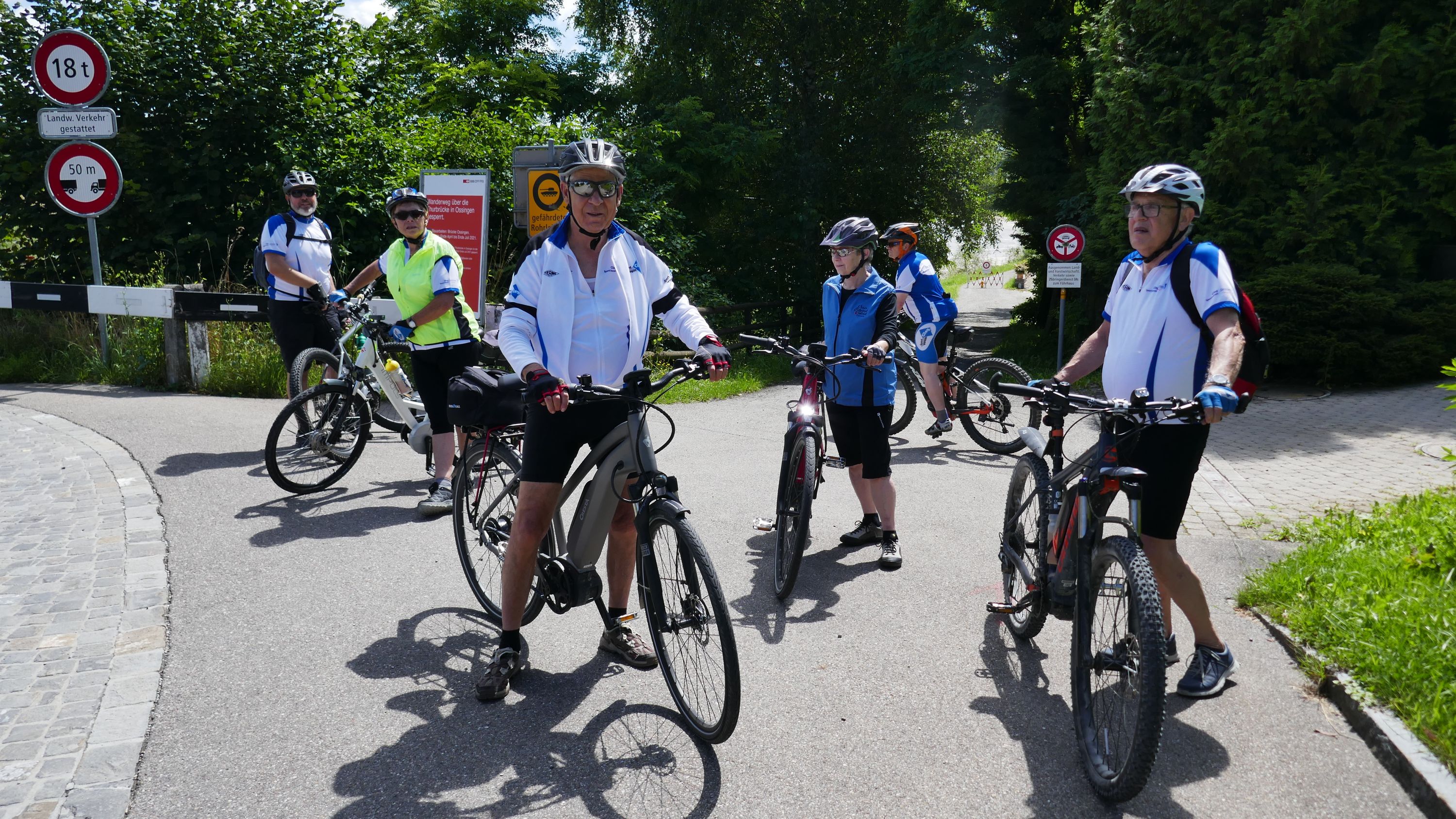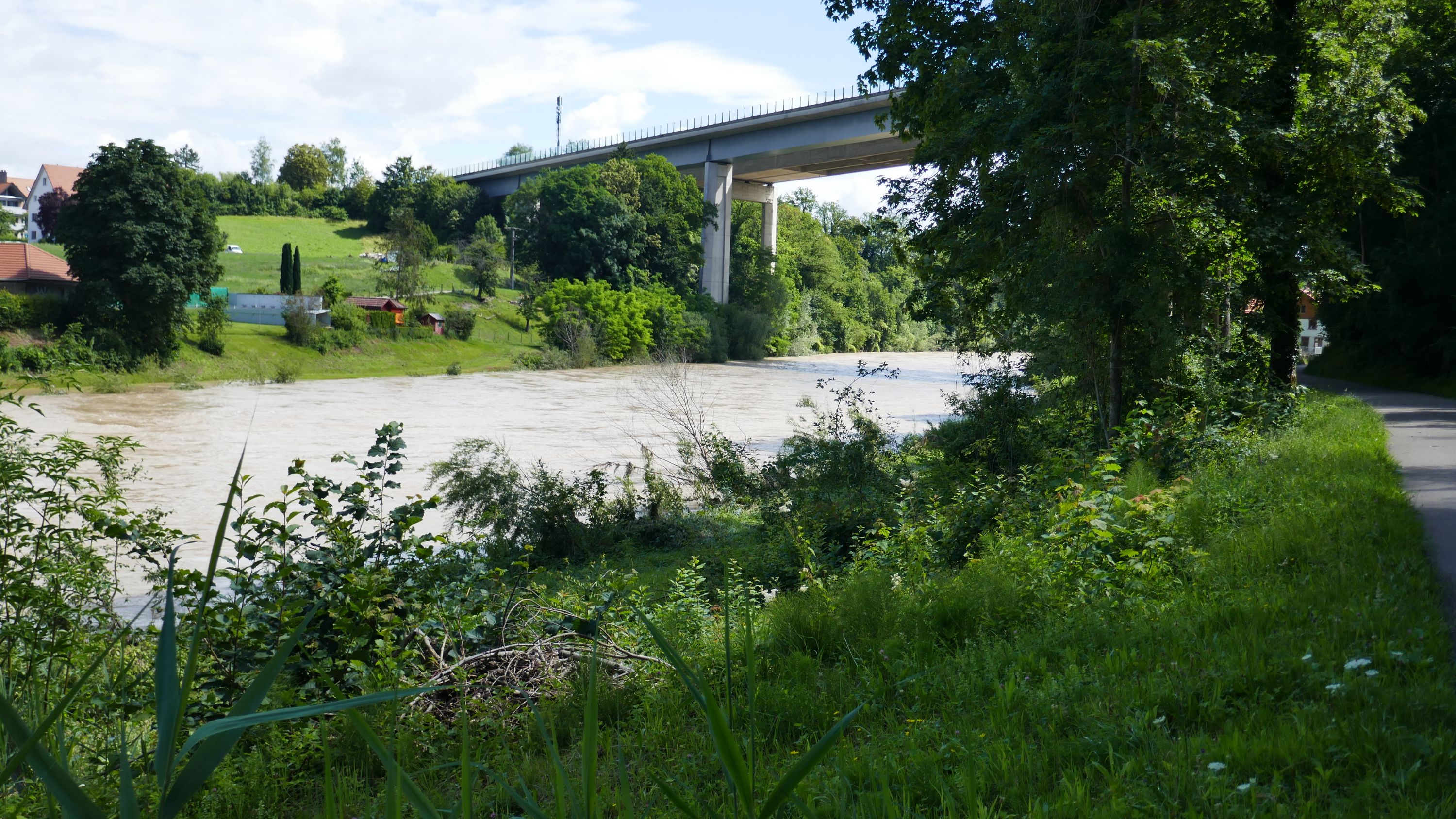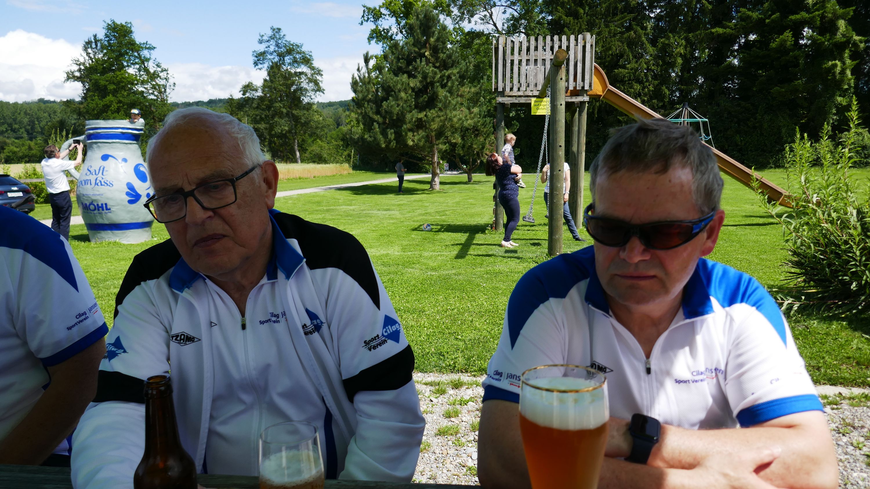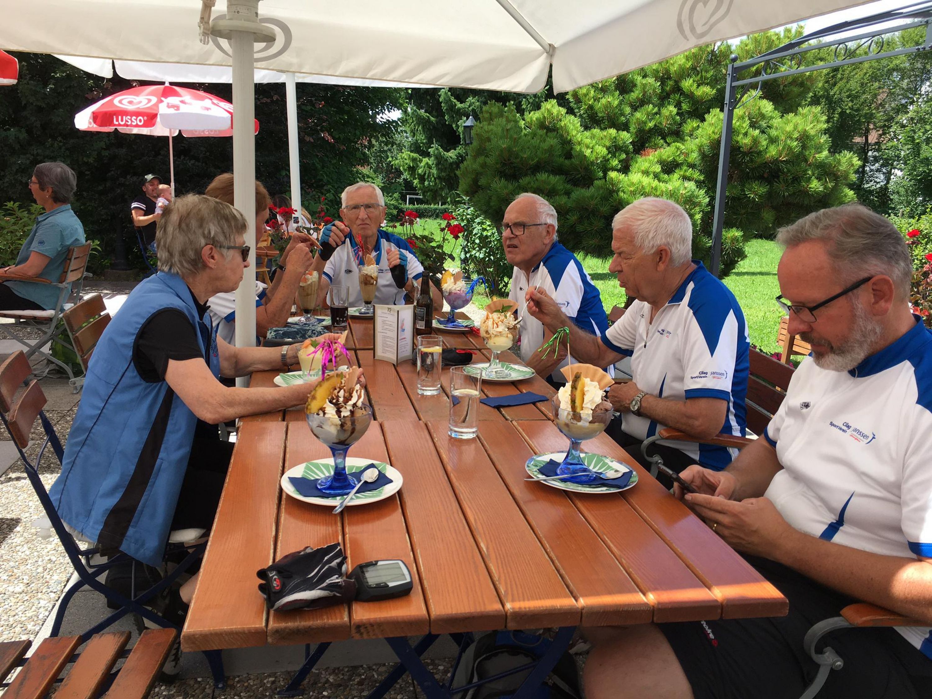Gestärkt und ausgeruht starteten wir zur nächsten Etappe, Thur aufwärts. Da der Veloweg auf dem Damm, wegen Hochwasser gesperrt war, fuhren wir aussen herum. Auch diese Strecke war offiziell gesperrt, doch wir riskierten es. Aber schon nach kurzer Fahrt kamen wir an eine Stelle auf der das Wasser ca. 15 cm hoch über die Strasse lief, was uns aber nicht hinderte und den Vorteil hatte, dass unsere Reifen wieder sauber waren. Bei Altikon überquerten wir die Thur und radelten auf einer leichten Steigung über Niederneunform – Oberneunform nach Oberstammheim, wo wir uns im Gasthof Schwert einen feine Cup genehmigten. Zur Überraschung wurde unsere Konsumation von der Clubkasse offeriert, was hier nochmals herzlich verdankt sei.