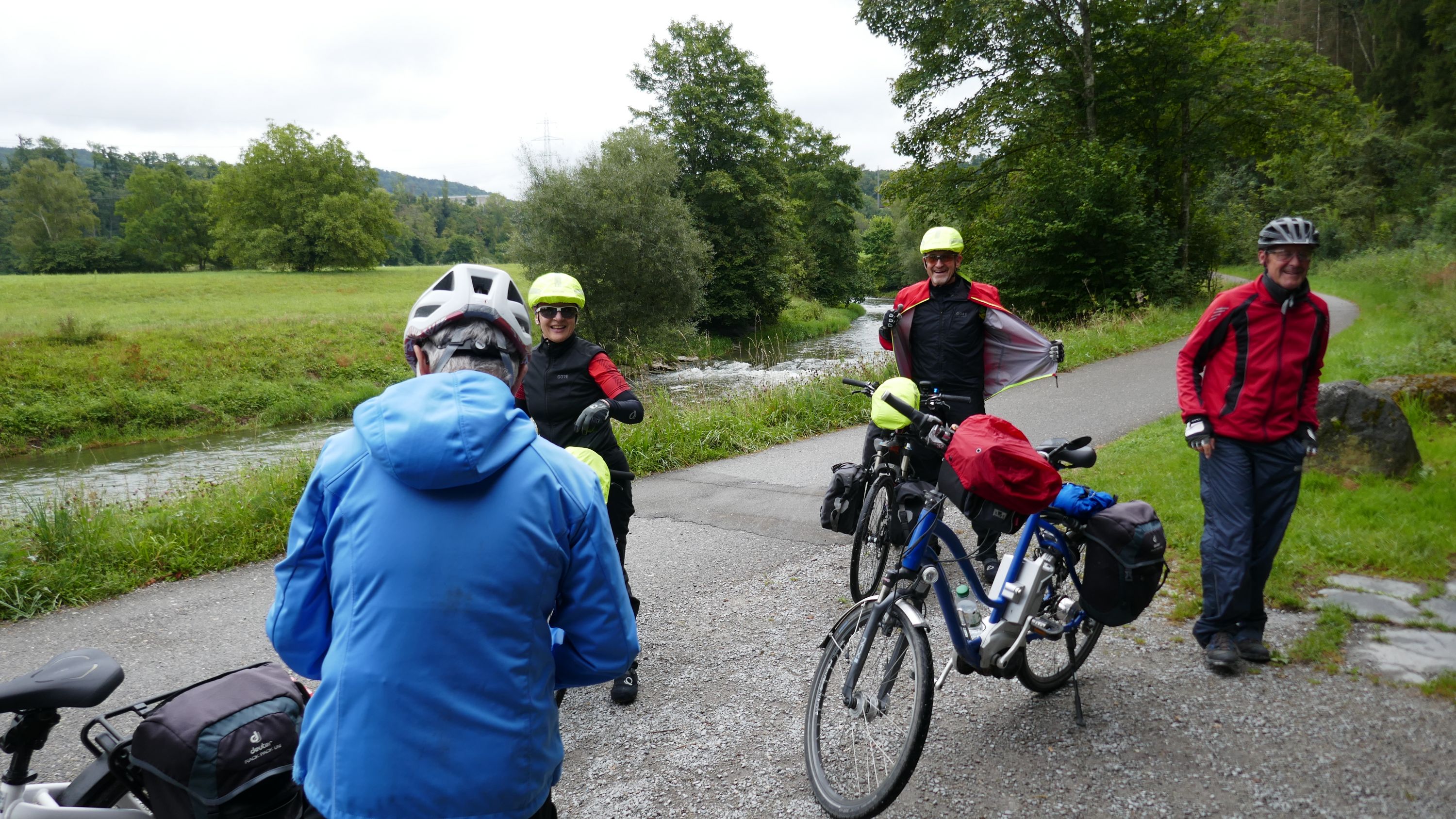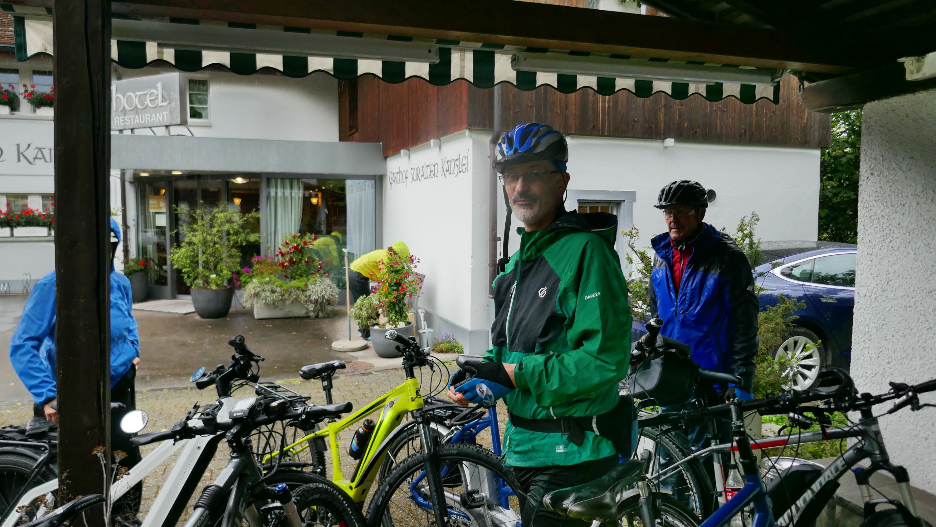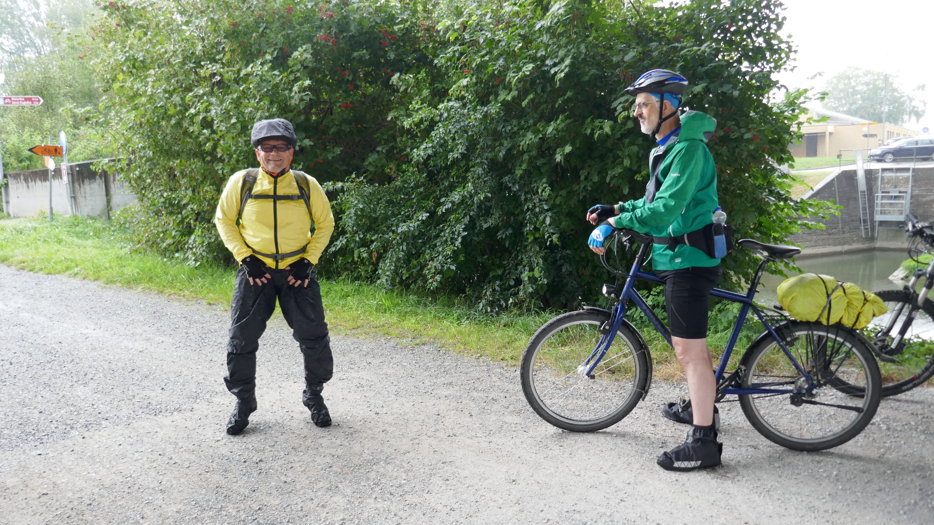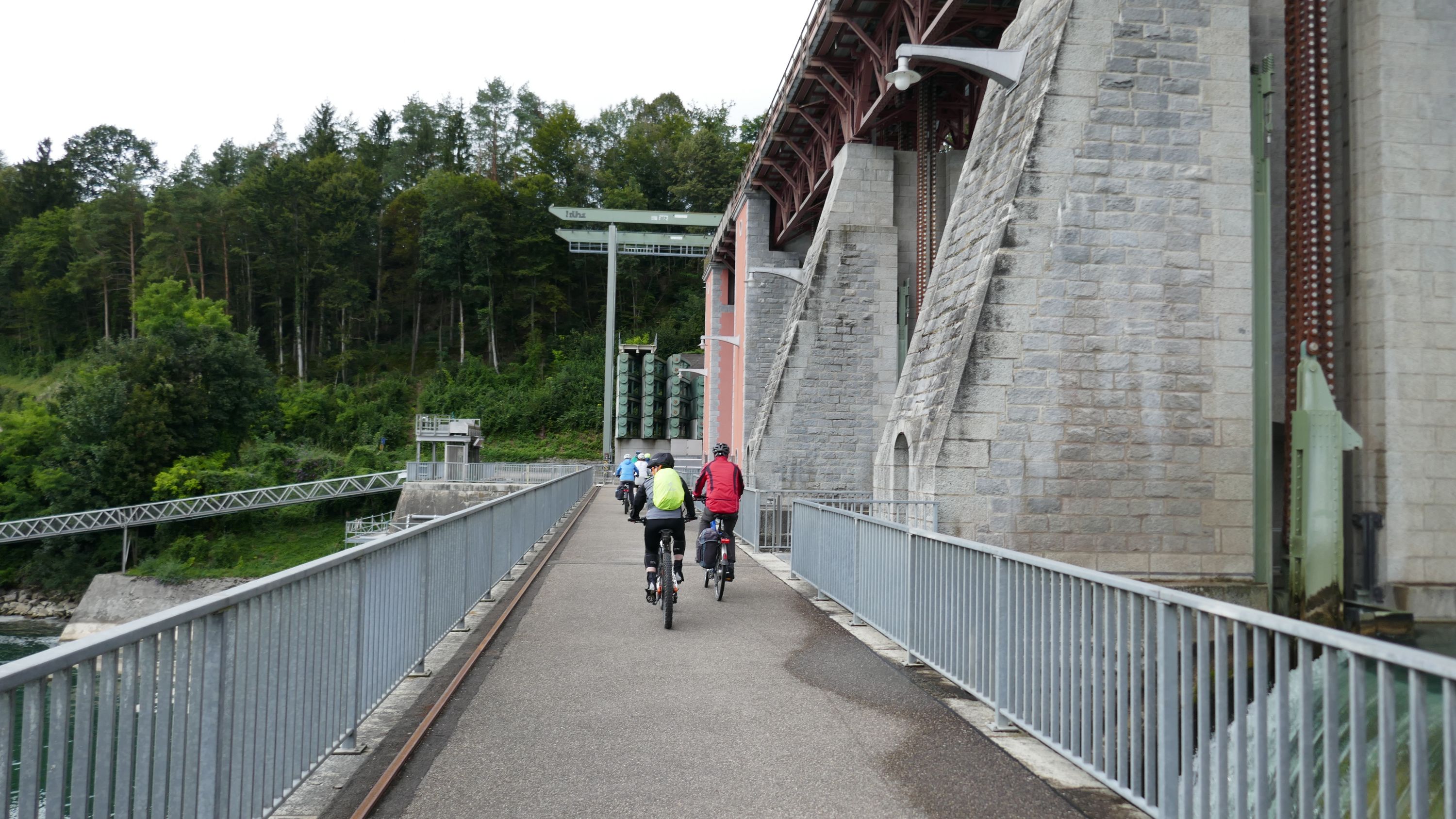 Beim Morgenessen am Sonntag wurden erst einmal alle Wetter Apps konsultiert und heiss diskutiert. Warten oder gleich losfahren? Einstimmig einigten wir uns eine halbe Stunde zu warten. Um halb 10 hiess es aufsitzen zur 2. Etappe durch leichten Nieselregen. Der Glatt entlang über Dübendorf, vorbei am Flughafen Zürich mit einigen Zwischenstopps im trockenen für Verpflegung und Tenuwechsel, erreichten wir pünktlich unser Mittagsziel in Rheinsfelden. Die Auswahl im Restaurant zur Fähre war riesig, so fand jeder etwas Passendes. Ganz speziell war nach dem Essen die Fahrt über das Kraftwerk. Später waren nicht nur die Schleusen des Kraftwerks offen, auch Petrus öffnete seine. So wurden wir kurz vor Jestetten nochmals kräftig begossen und waren froh, dass alle gesund und unfallfrei wieder in Schaffhausen angekommen sind.