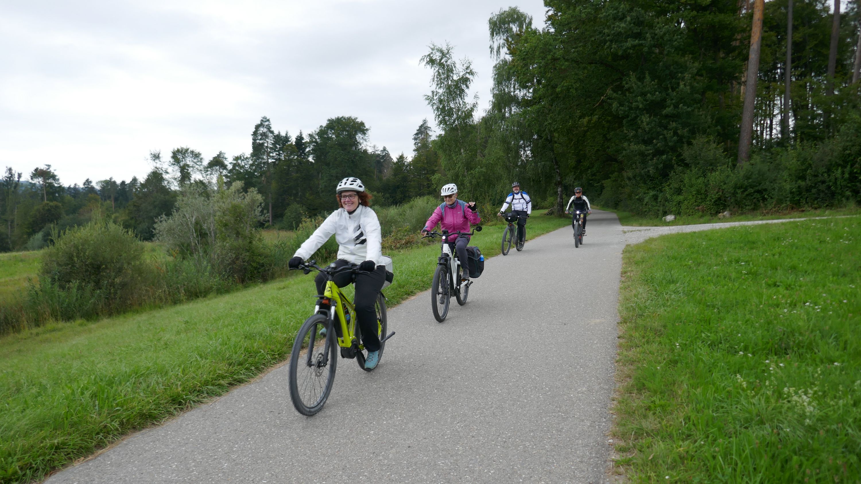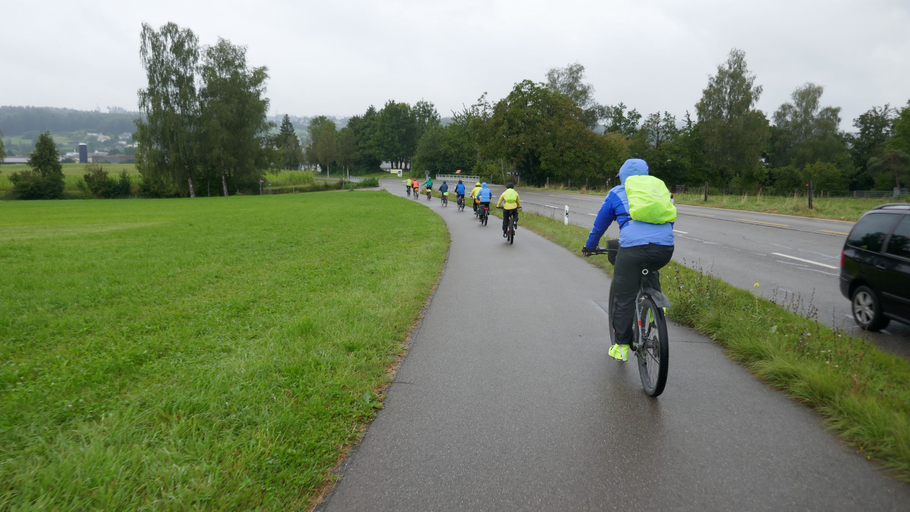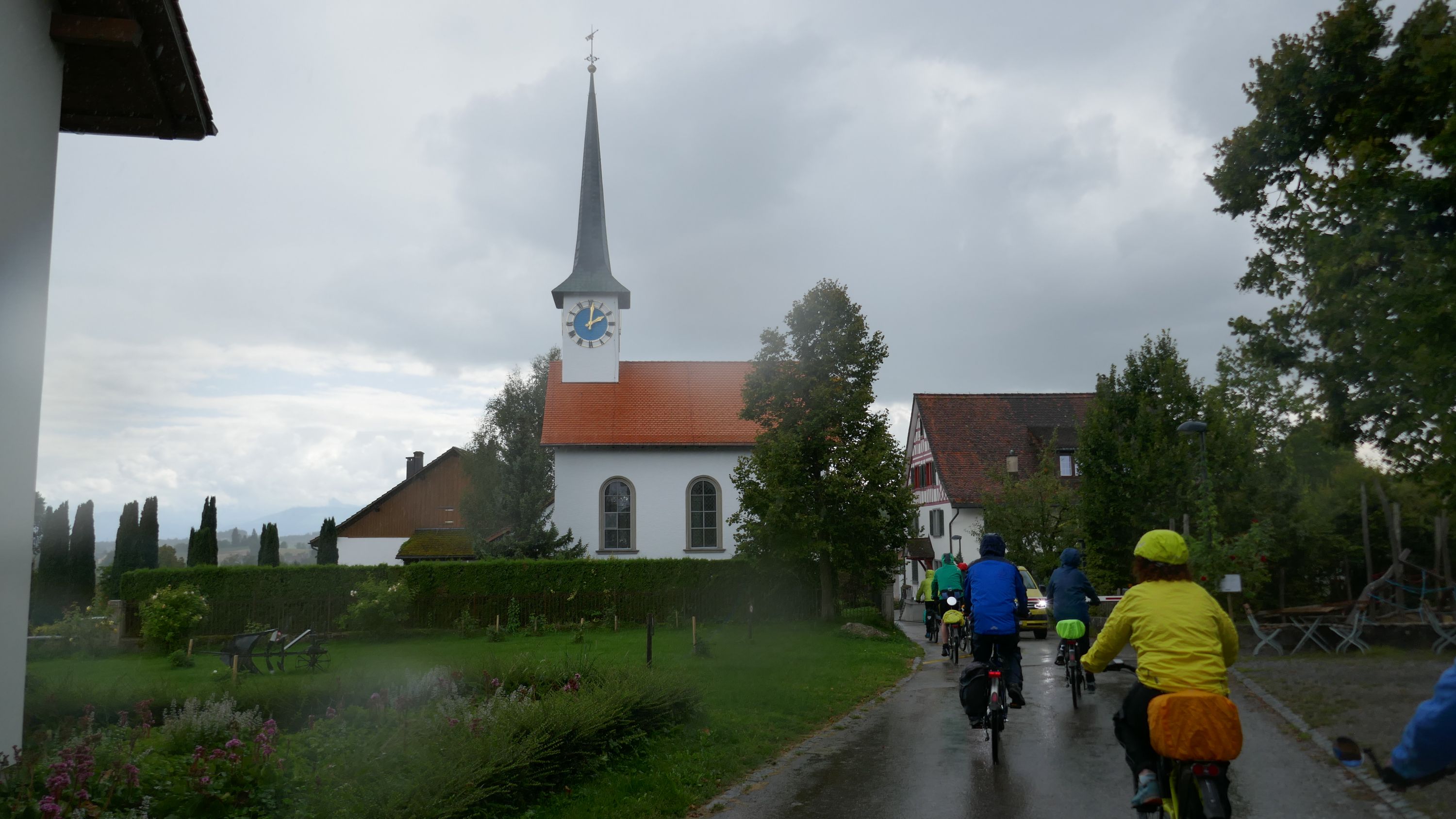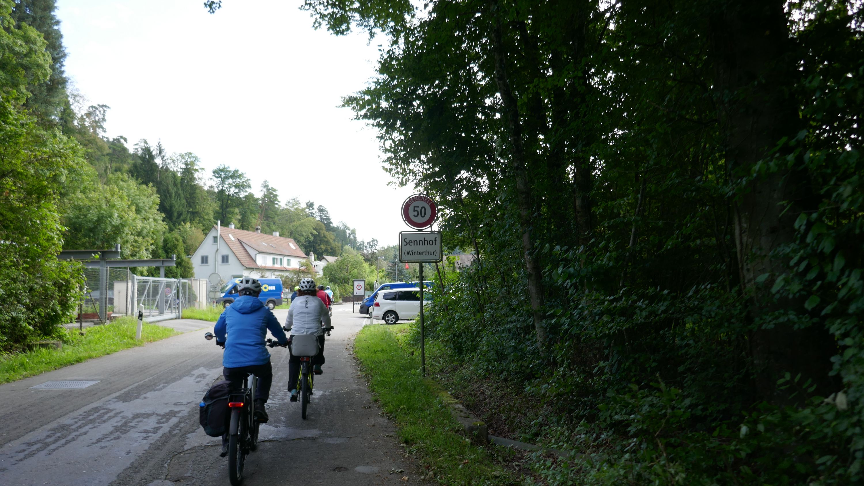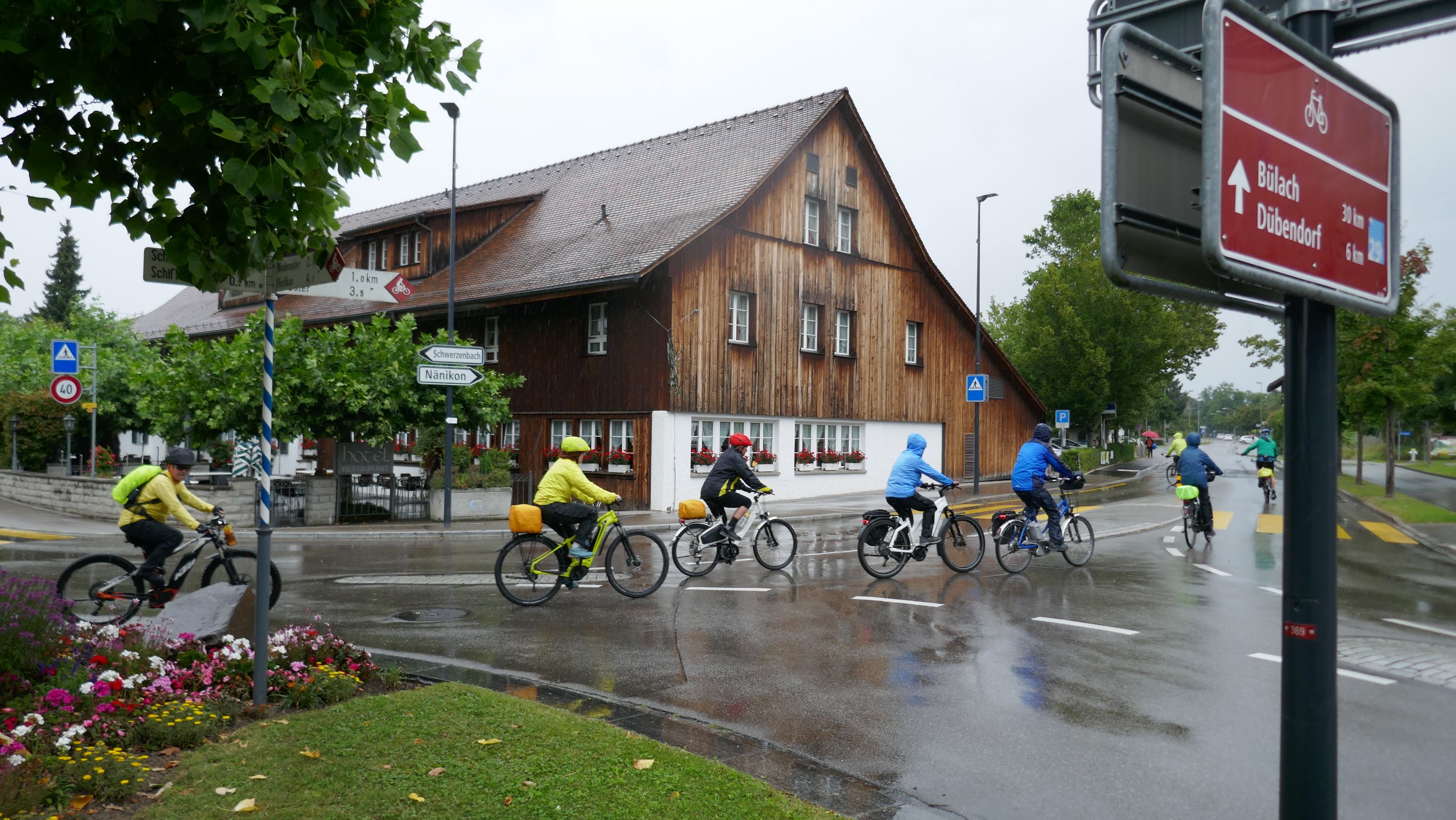 Nach langem Warten, durften wir endlich wieder eine Wochenend-Tour durchführen. Nachdem im Juni der Tourenleiter mit Begleitung eine Tour vorgefahren hatte war ich gespannt, wohin die Reise gehen würde. Bei bedecktem Himmel starteten 9 Veloclüpler im Schneckenacker morgens um 8 Uhr in Richtung Greifensee. Beim Schloss Laufen wartete schon Silvia auf uns und so radelten wir gleich weiter über Marthalen, Andelfingen nach Winterthur. Bei der kühlen Witterung kam uns ein Kaffeehalt im Sporrer gerade recht. Gekonnt führte uns der Tourenleiter Urs an Winterthur vorbei der Töss entlang nach Kollbrunn. Ein längerer Aufstieg wartete nun auf uns, bevor das erste Ziel Russikon erreicht wurde. Im Landgasthof zur Krone stärkten wir uns für den Rest des ersten Tages. Das Essen war sehr gut und Preiswert, der Sputnik Service der Chefin ebenfalls. Bevor es weiter ging hiess es Regenkleider montieren den es begann leicht zu nieseln. Vorbei am Pfäffikersee durch Wetzikon gings dem Tagesziel Greifensee entgegen. In der Schlussviertel Stunde wurden wir aber dann so richtig geduscht. Zum Glück war unser Gepäck mit den trockenen Kleidern schon im Hotel zur Alten Kanzlei eingetroffen. Vielen Dank Kurt für Deinen Service. Dank dem freundlichen Hotelpersonal konnten wir unsere Velos in einer Tiefgarage einstellen. Nach einer kurzen Runde durchs Altstädtli durften wir ein gutes Nachtessen geniessen.