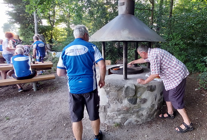 Bei der Ankunft der ersten Biker loderte schon ein kräftiges Feuer. Nach und nach trafen auch jene ein, die beim Tierheim starteten und von Beat sicher geführt wurden. Kurz darauf begrüsste Urs die Anwesenden und man prostete sich mit einem kühlen Getränk zu, welches an diesem heissen Tag besonders erfrischend war.