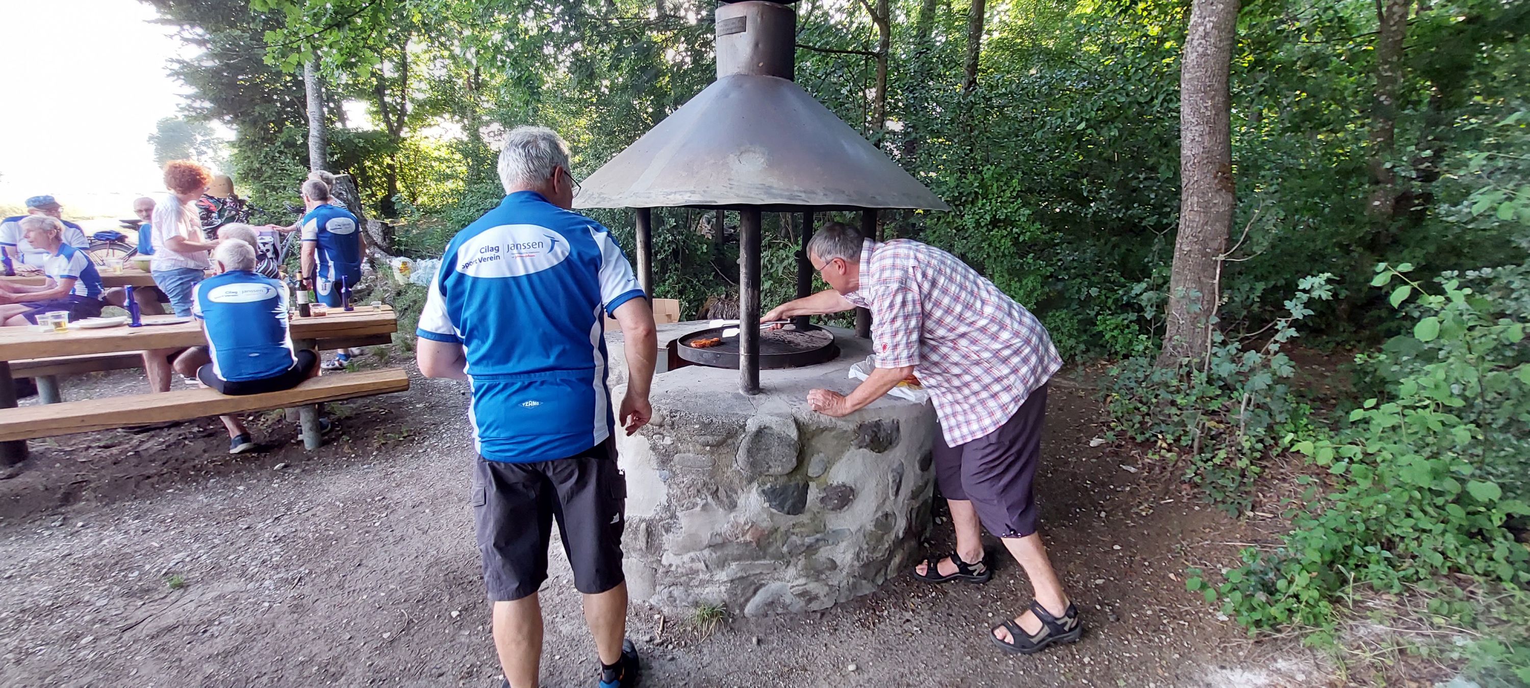 In der Zwischenzeit hat sich in der Feuerstelle eine schöne Glut gebildet. Genau richtig die Grilladen auf den Roost zu legen, um die sich Urs, unterstützt von Beat kümmerte.