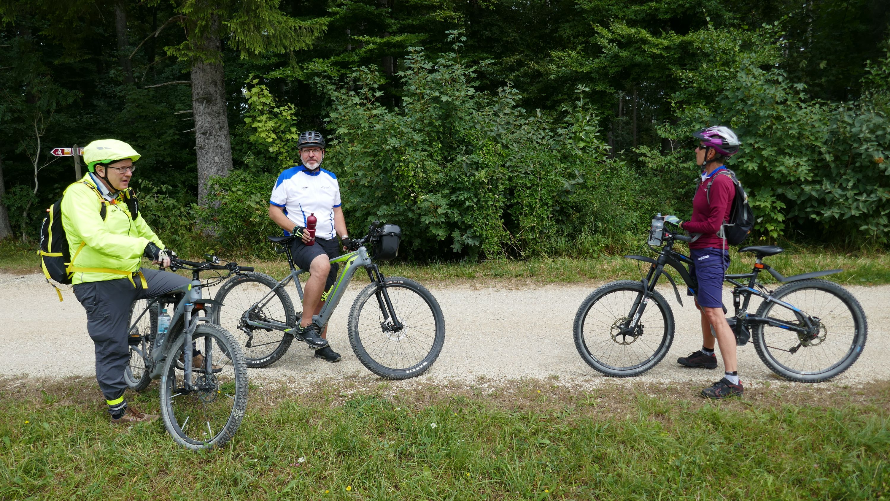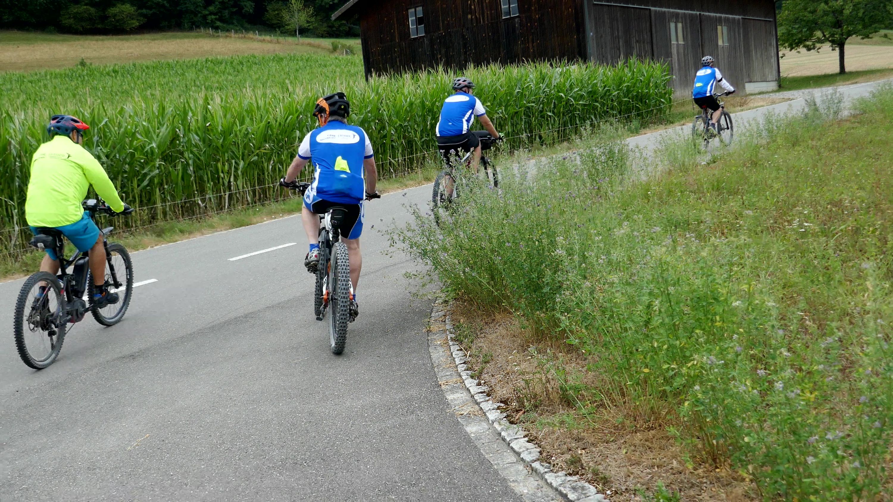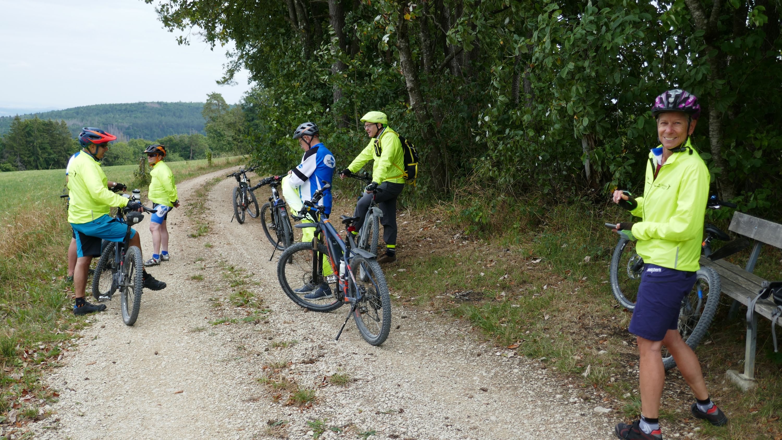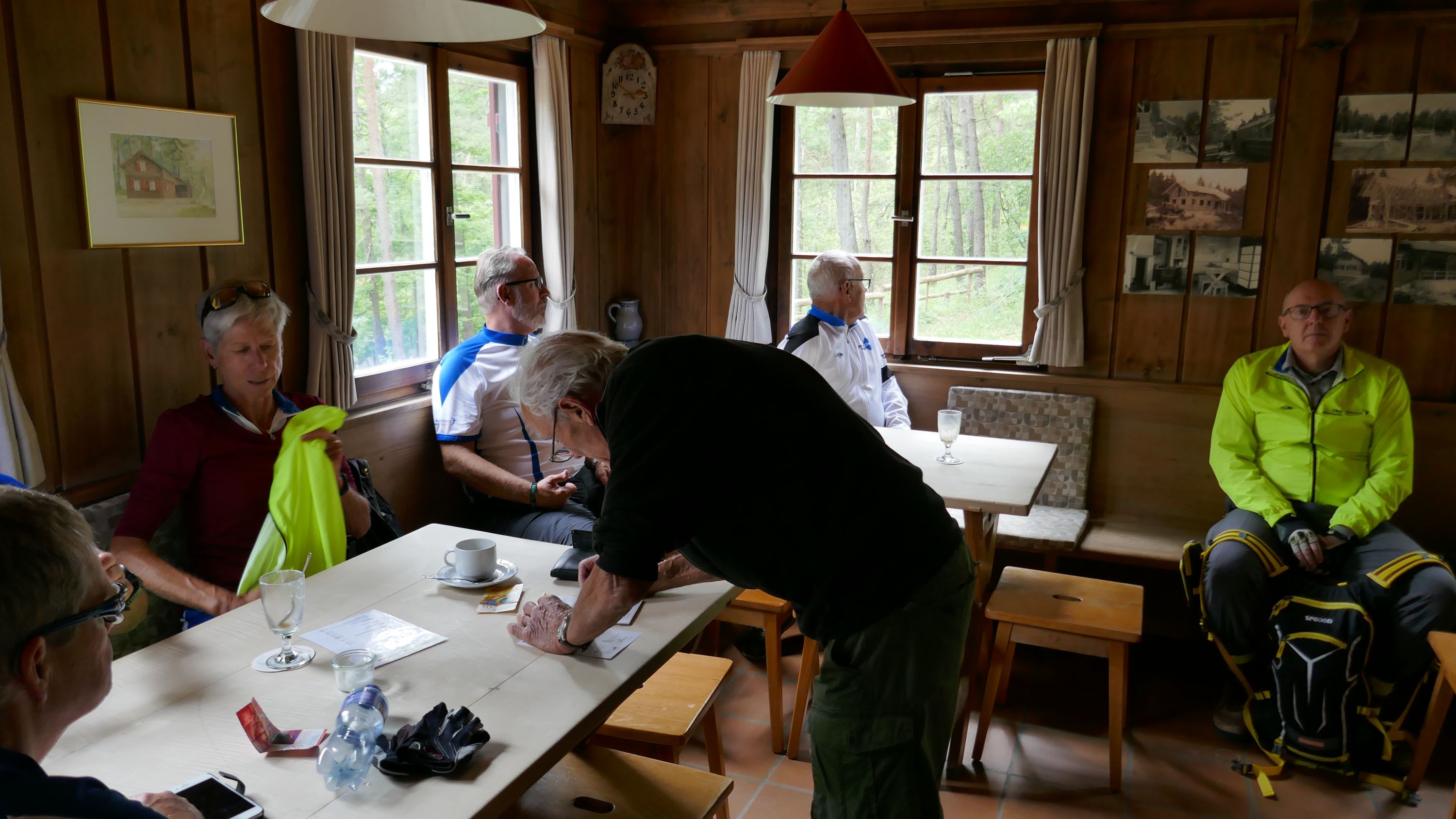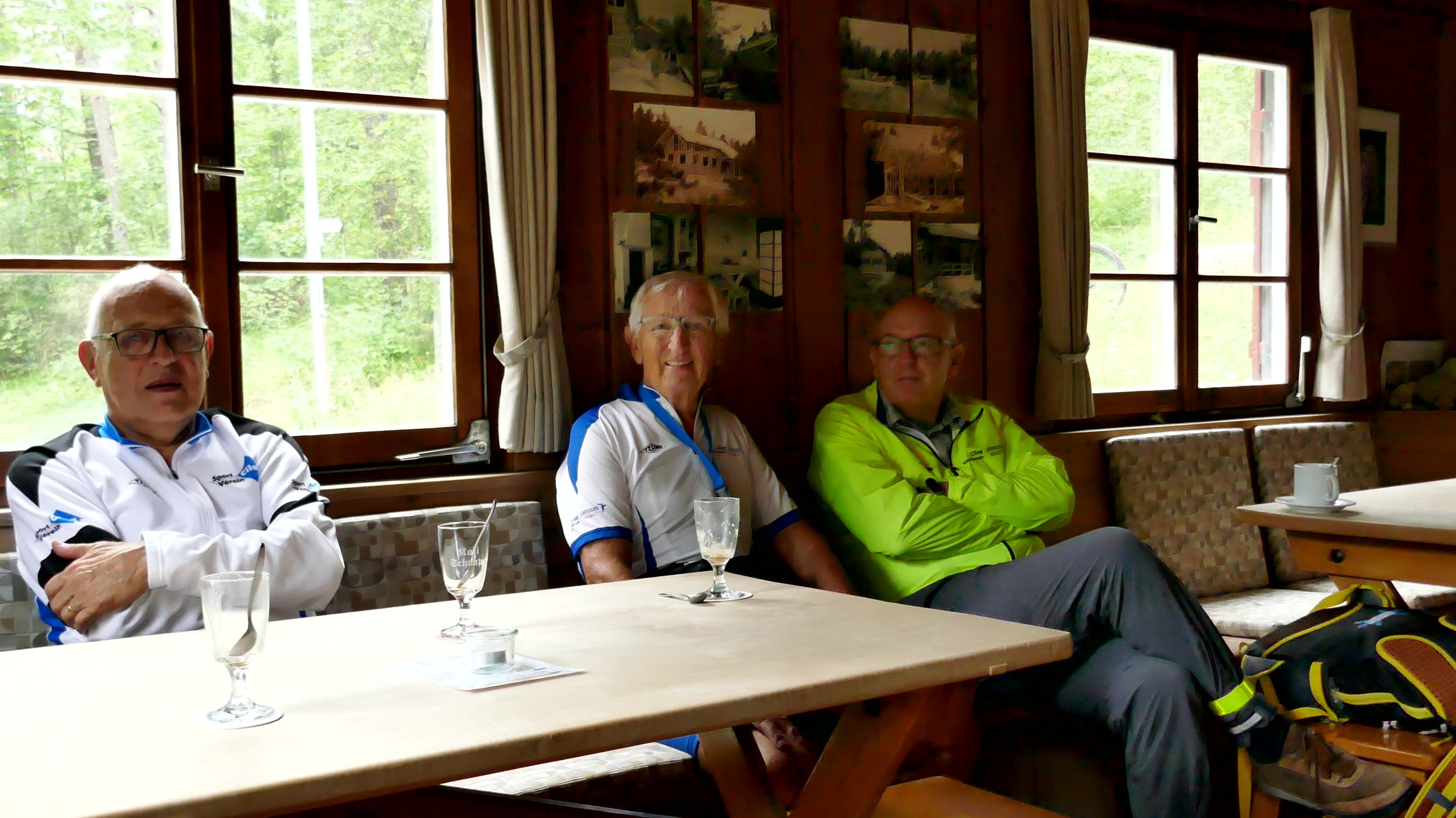 Bei ungewohnter kühler Temperatur trafen um 13:30 h die Radler ein und wir fuhren Richtung Buchberghaus zur Hasenbuckhütte. In der heimeligen Stube wärmten wir uns bei feinen Getränken auf und setzten anschliessend unsere Fahrt fort. Vorbei an der Pfadihütte am Haagen ging es über Soohölzli zum Hintere-Rande wo wir einen weiteren Halt einlegten und die Aussicht, über die Hegauberge bis zum Radolfzellersee, genossen. Von nun an ging`s bergab. Vorbei am Gfell – Osterberg den Chatzestiig hinunter bis zur Spitzkehre oberhalb der Badi Merishuuse, wo der Weg zur Mehrzweckhalle führt. Von dort waren es nur noch ein paar Kurven und wir landeten nasch 21 km, über Wiesen und Wurzelwege, wieder im Bodenwiesenweg, wo wir von Heidi und Verena empfangen wurden.